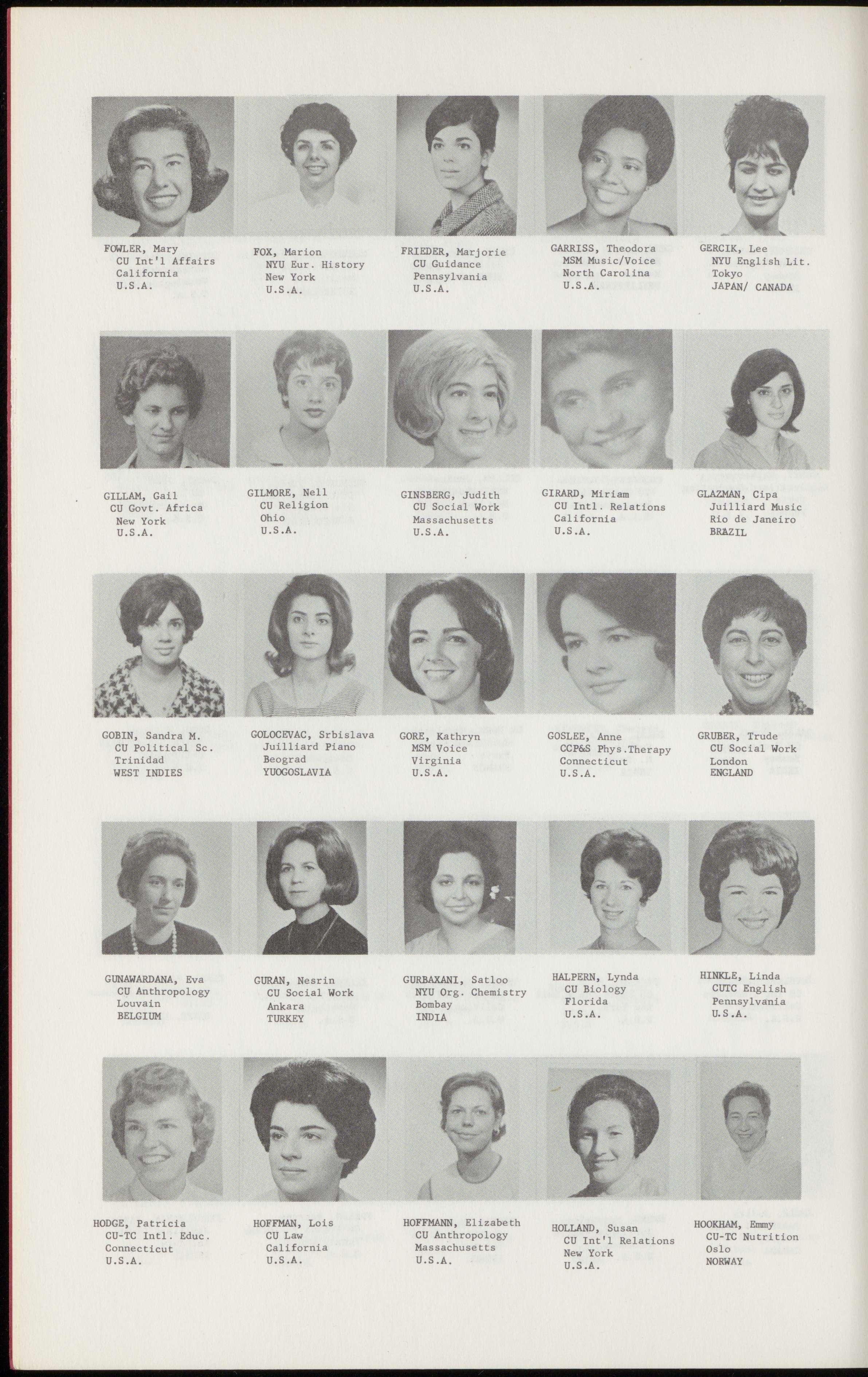 GILLAM, Gail GILMORE, Nell GINSBERG, Judith GIRARD, Miriam