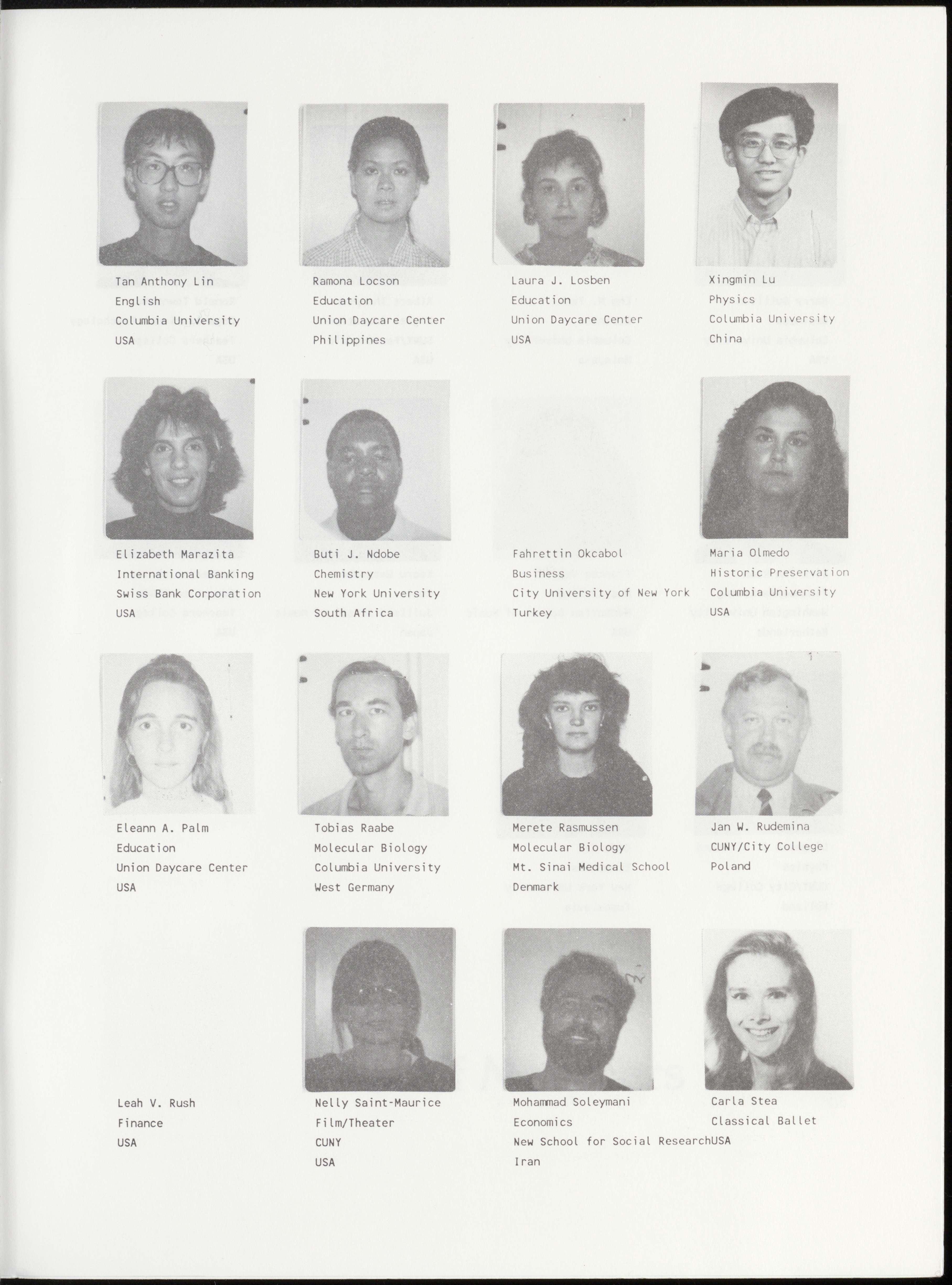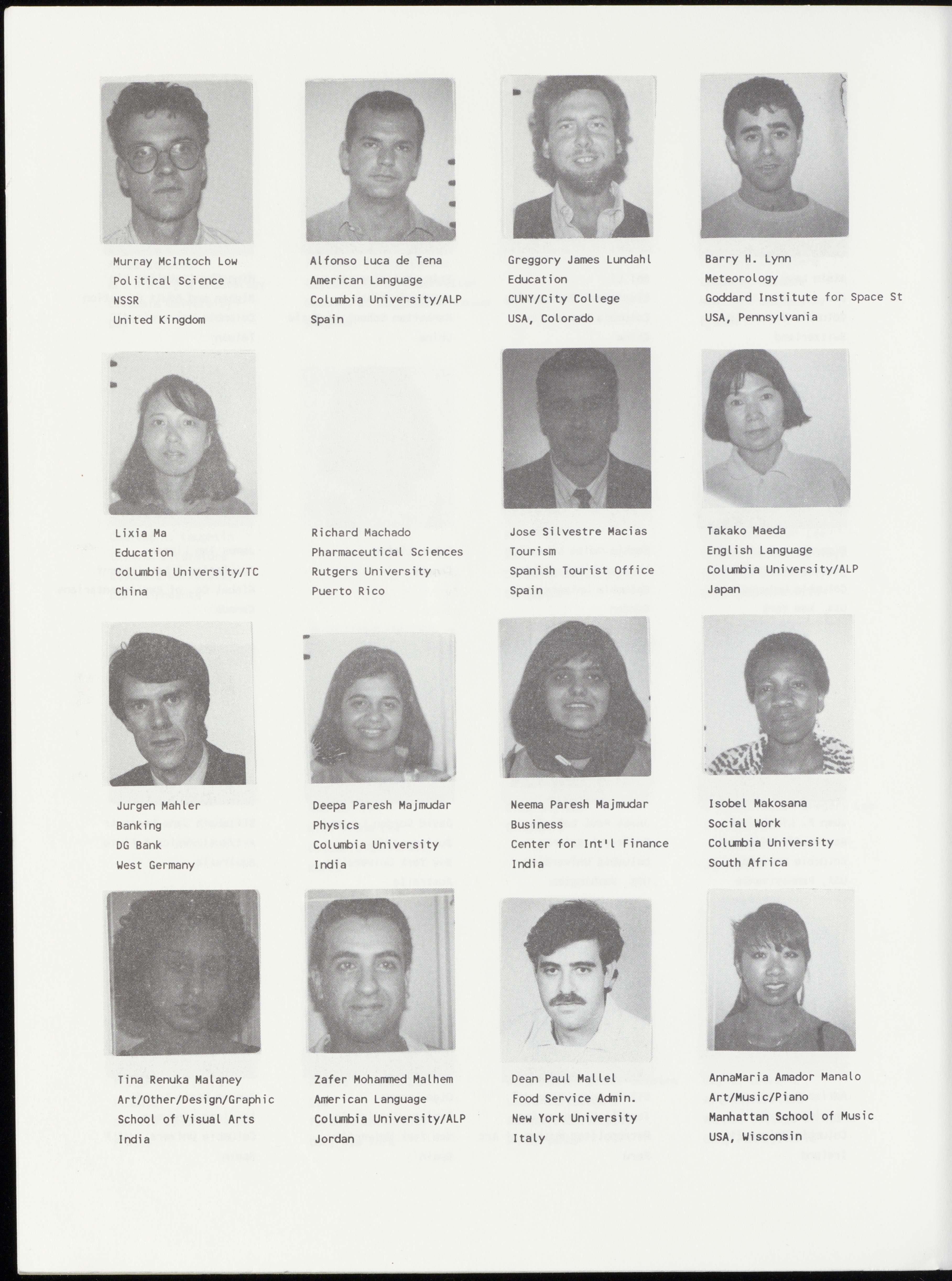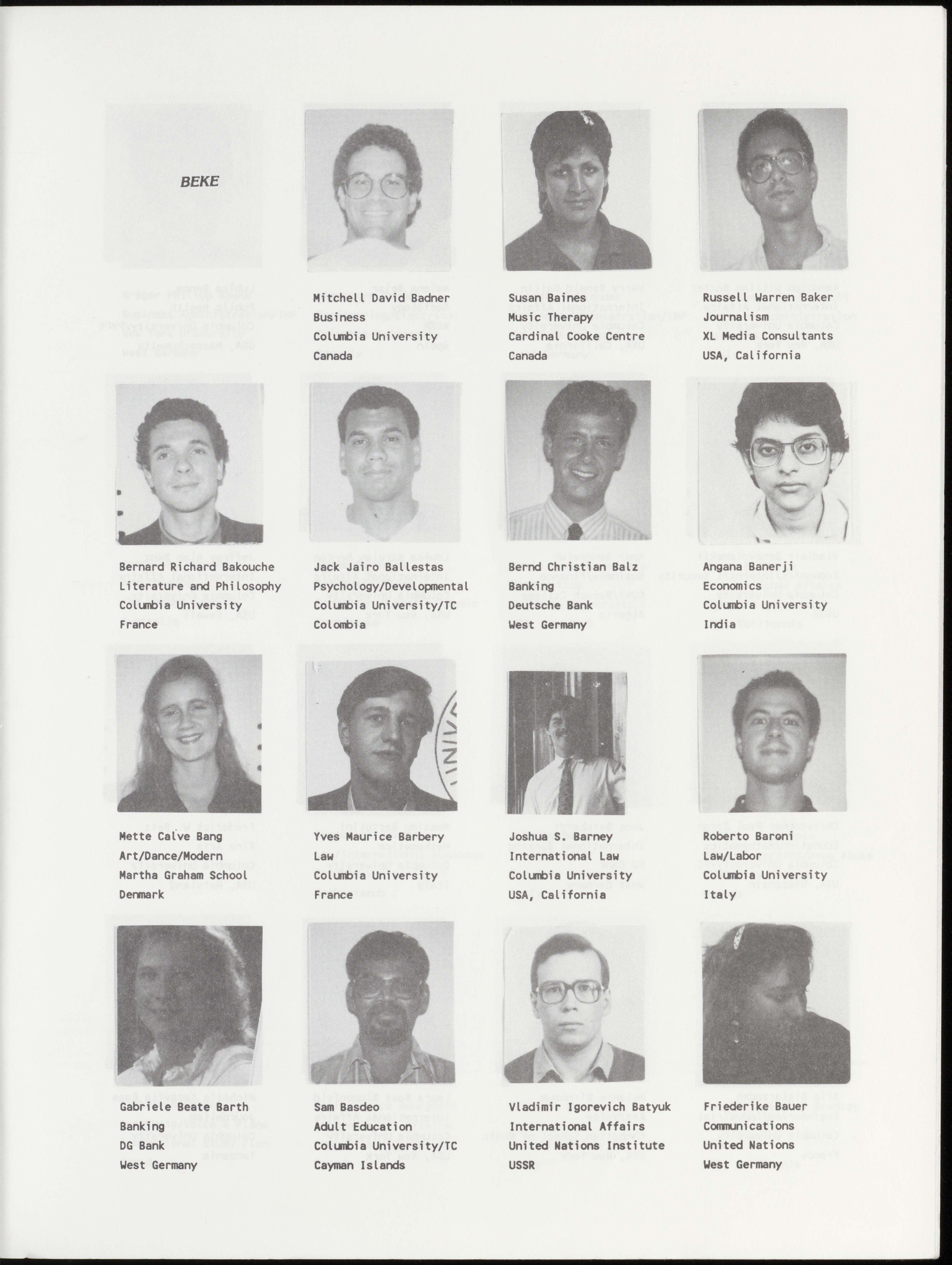 Bernard Richard Bakouche Jack Jairo Ballestas Bernd Christian Balz Angana Banerji Literature and Philosophy Psychology/Developmental Banking Economics Columbia University Columbia University/TC Deutsche Bank Columbia University France Colombia West Germany India