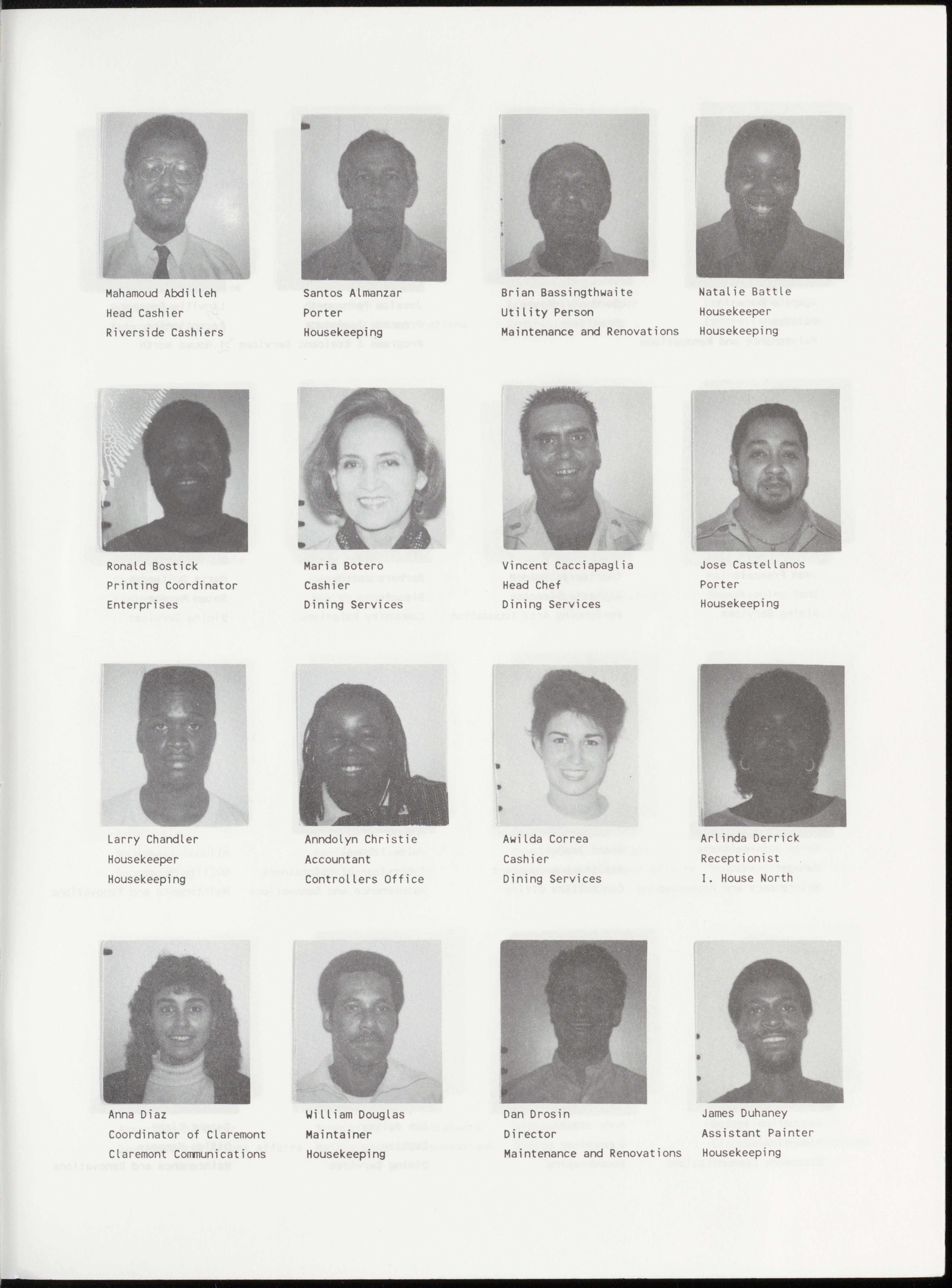 DanDrosin JamesDuhaney Coordinator of Claremont Maintainer Director Assistant Painter ClaremontCommunications Housekeeping MaintenanceandRenovations Housekeeping