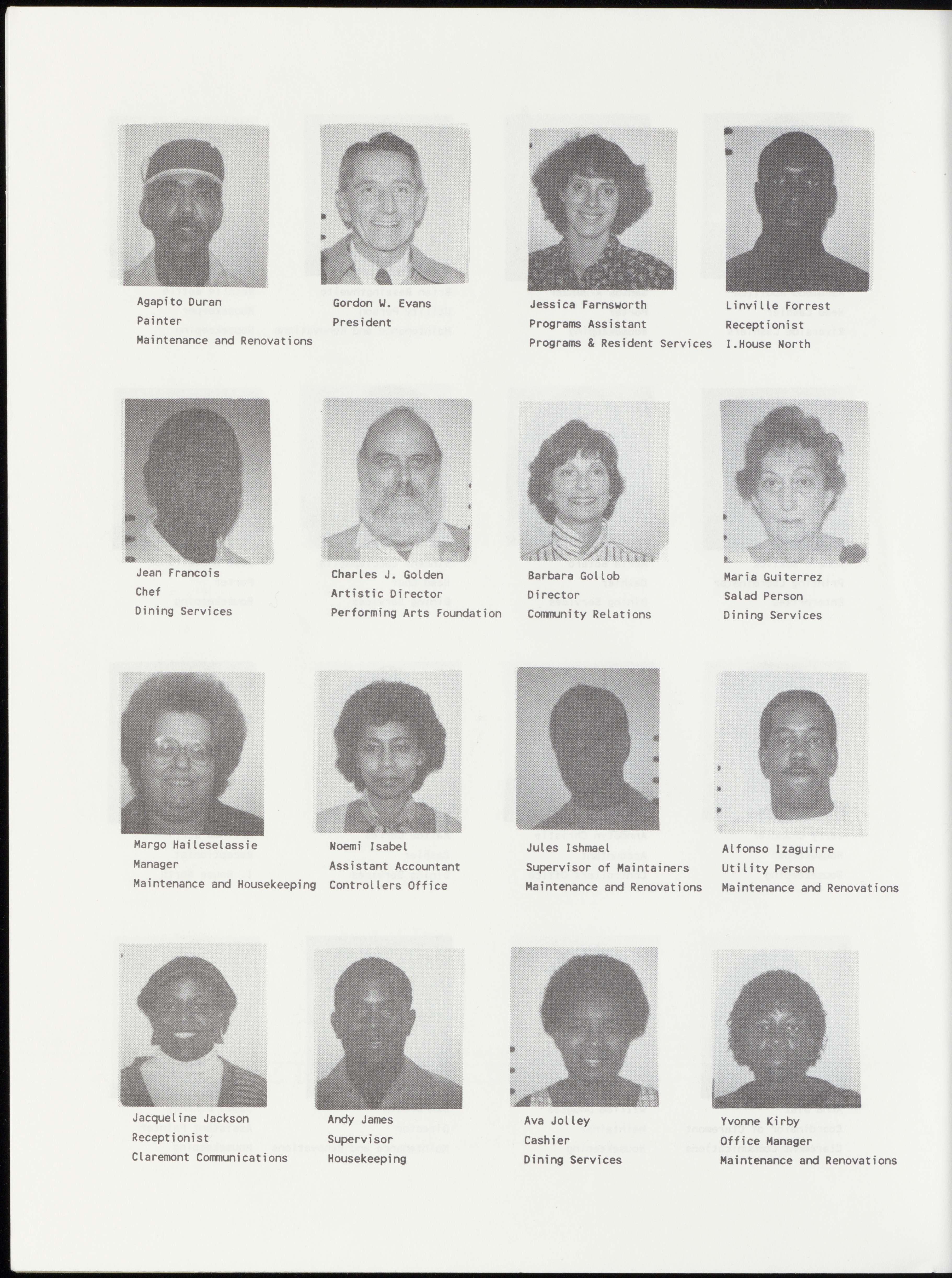 Herbert Williams Porter Assistant to the President Supervisor of Maintainers Assistant Manager Housekeeping Director of Public Relations Maintenance and Renovations Dining Services
