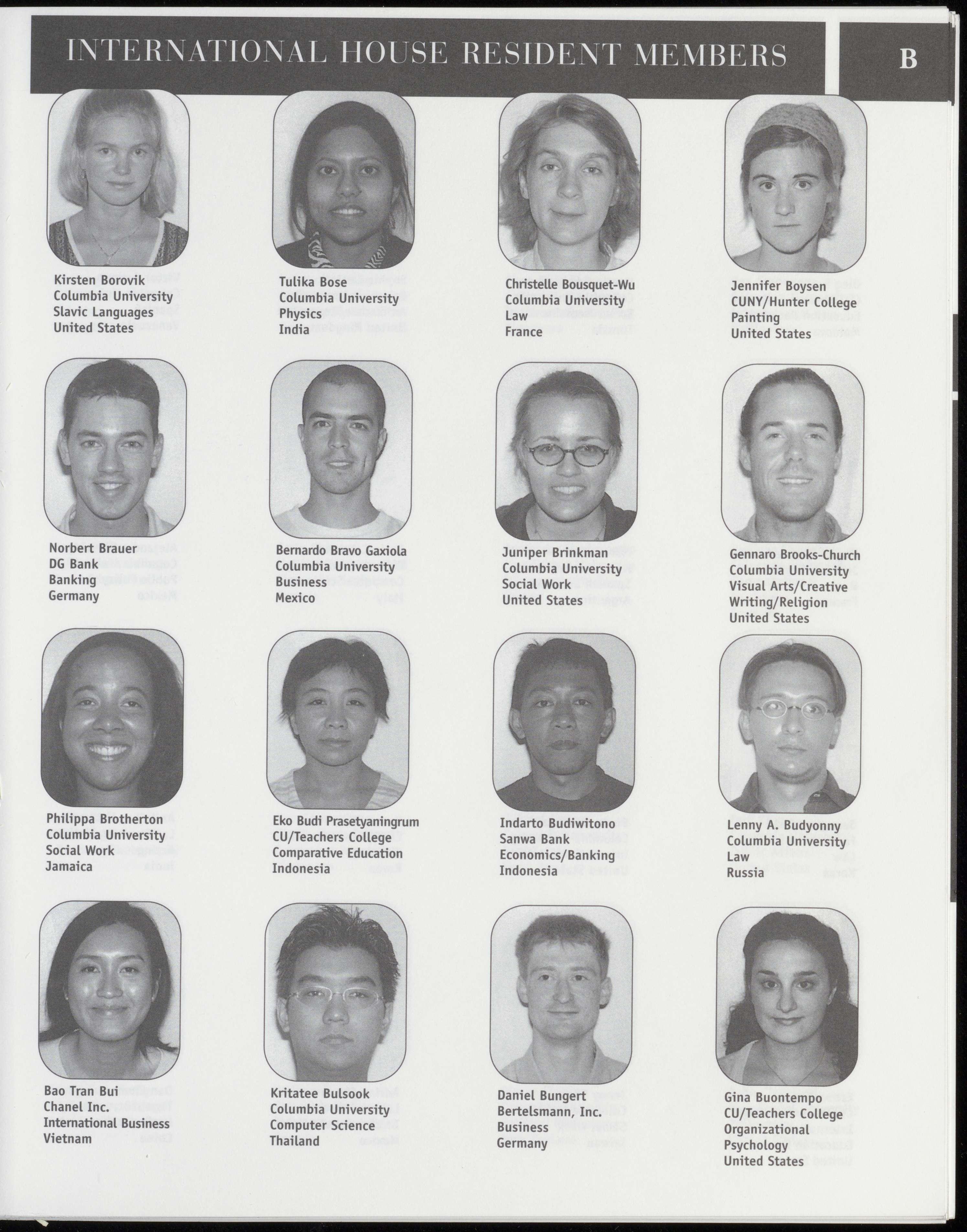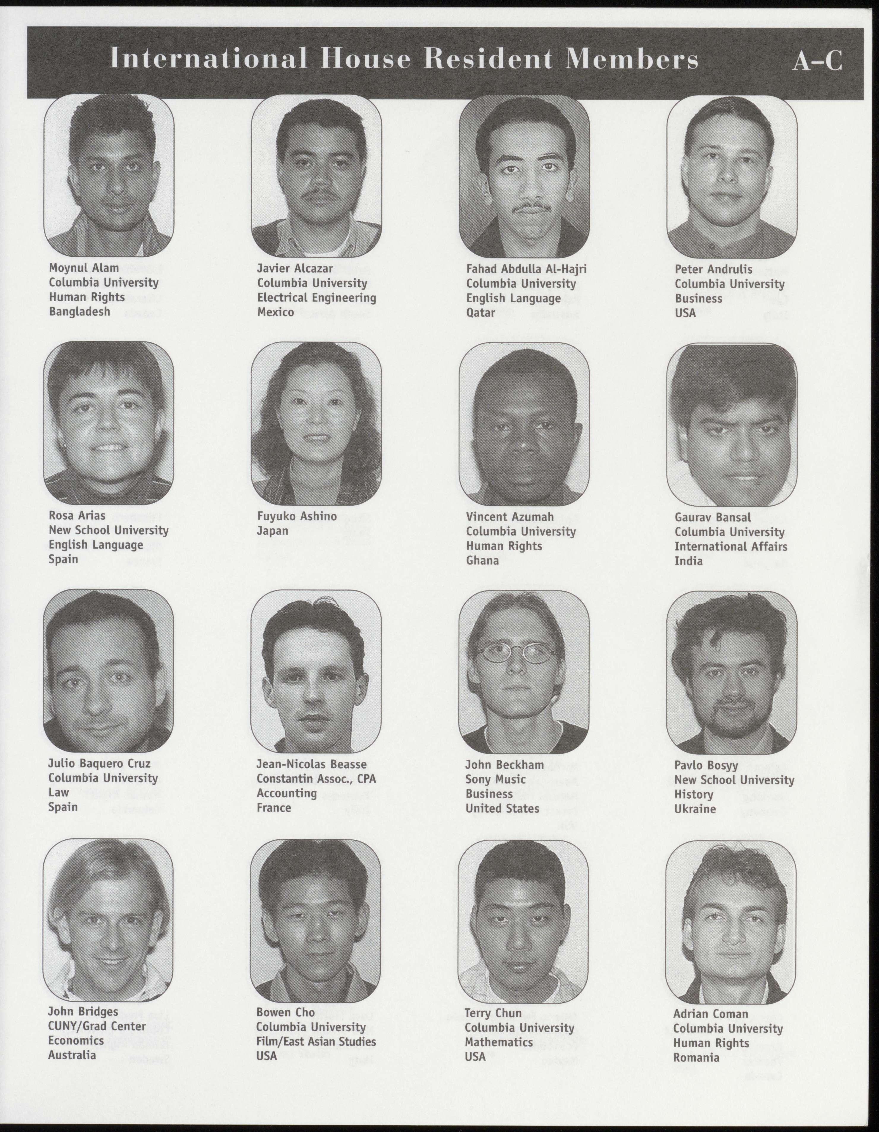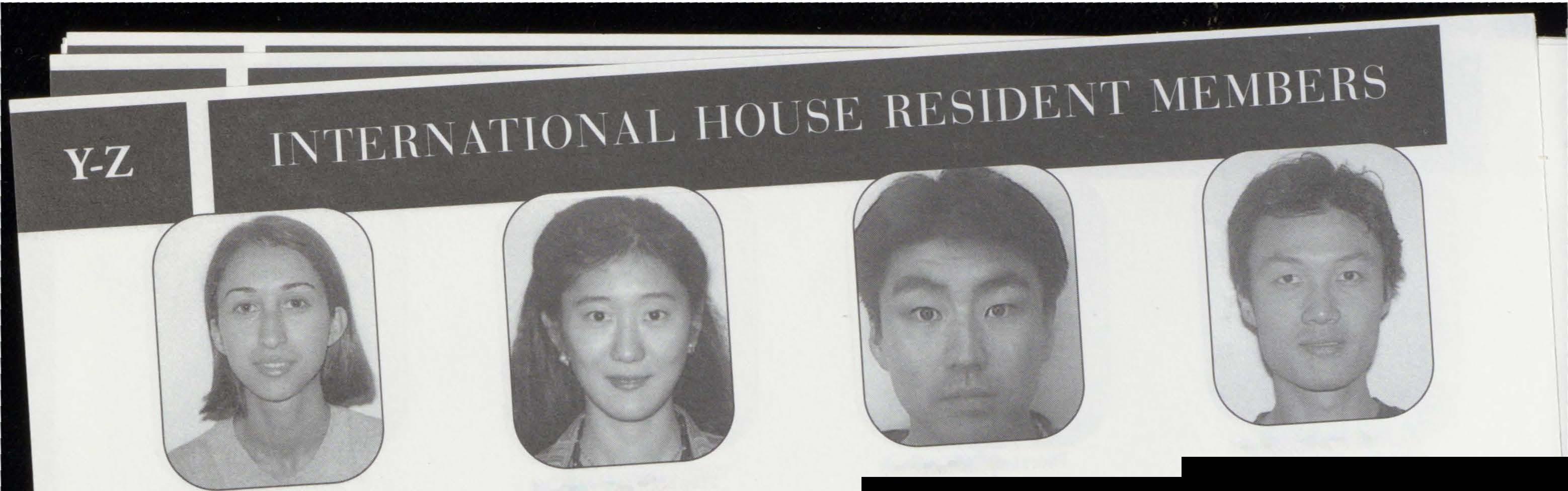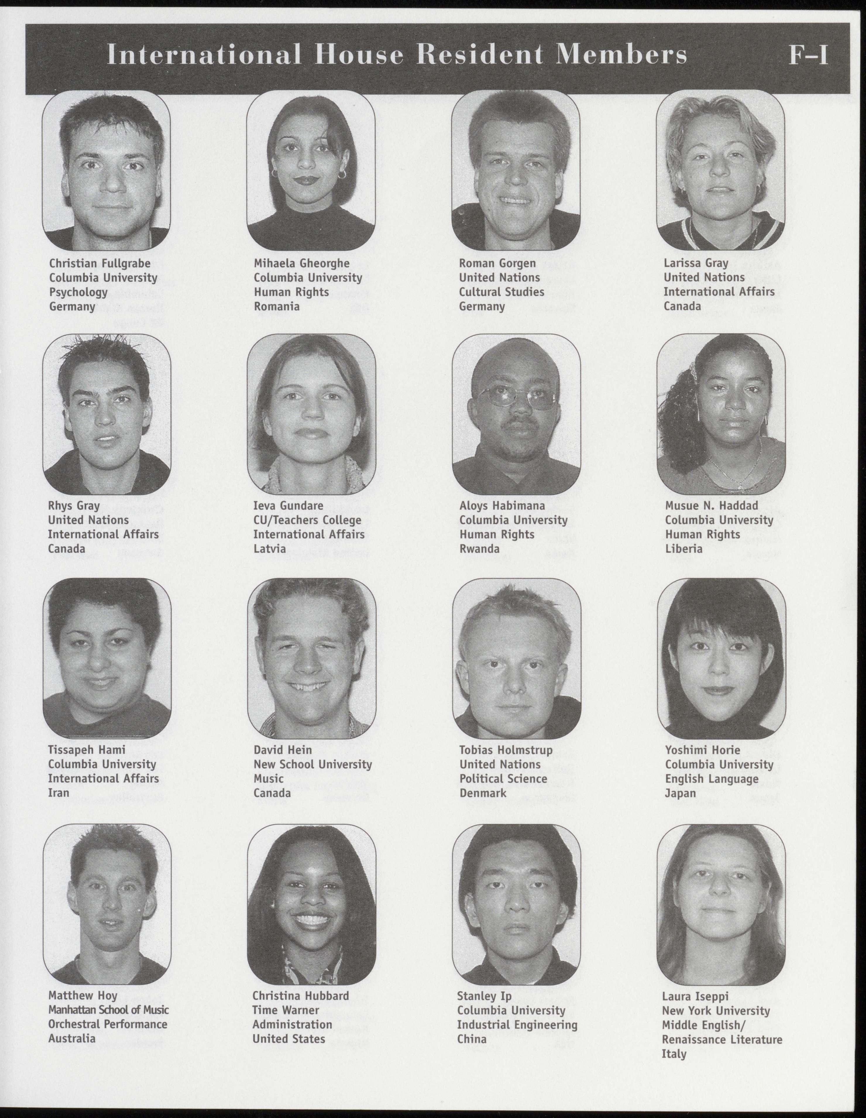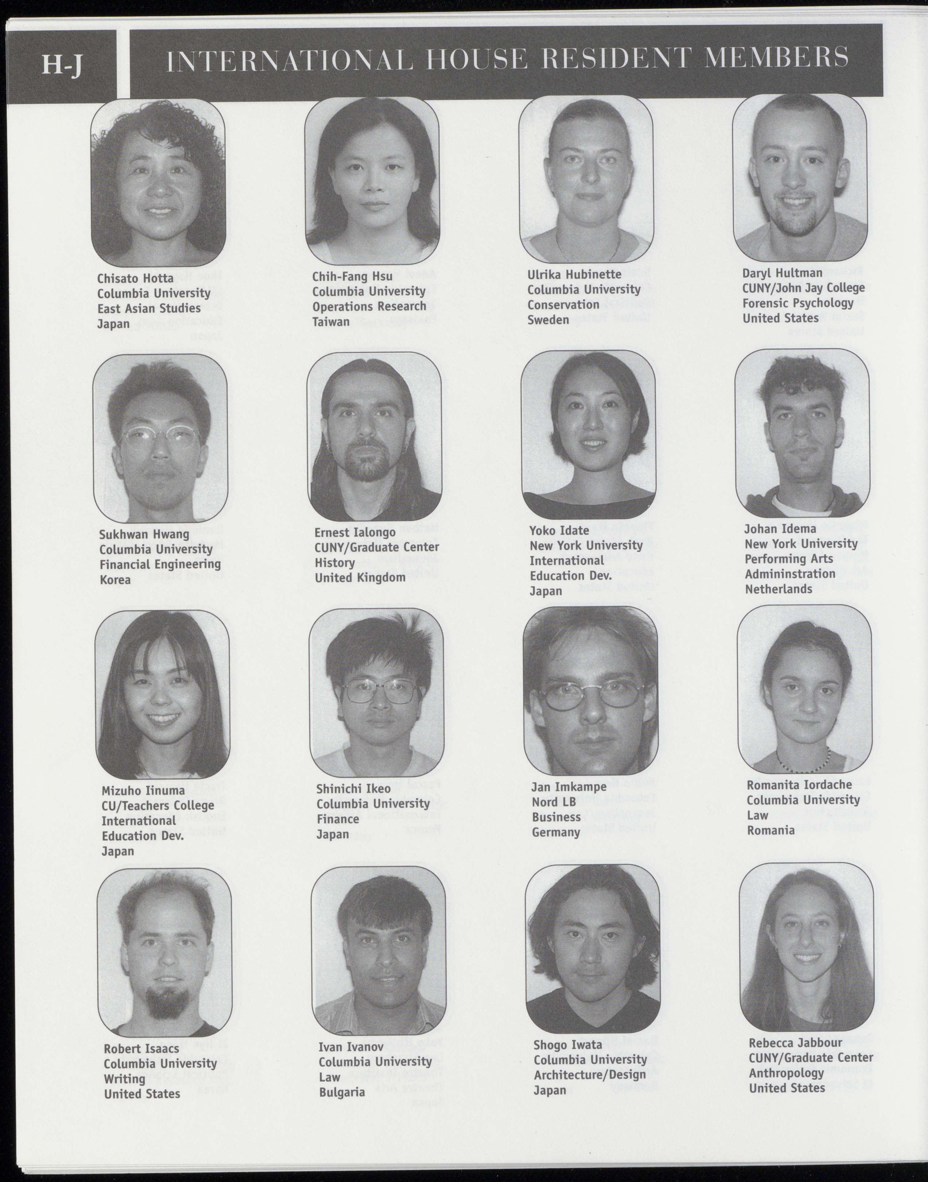 This Directory is not a “year book” nor, since it is published each fall, a reflection of a year gone by. Rather it anticipates a year to come and, significantly, your future lives as I. House alumni and world citizens. We hope that you will find it useful throughout your stay to help knit our community together, and that in the coming years as you peruse its pages you will remember with fondness your stay here, and be prompted to contact an old friend or acquaintance as well as support the House. Lifelong friendships are at the heart of the I. House experience, and this visual record—a “snap shot” of our community in 1999—forever preserves a time and a place in your lives.