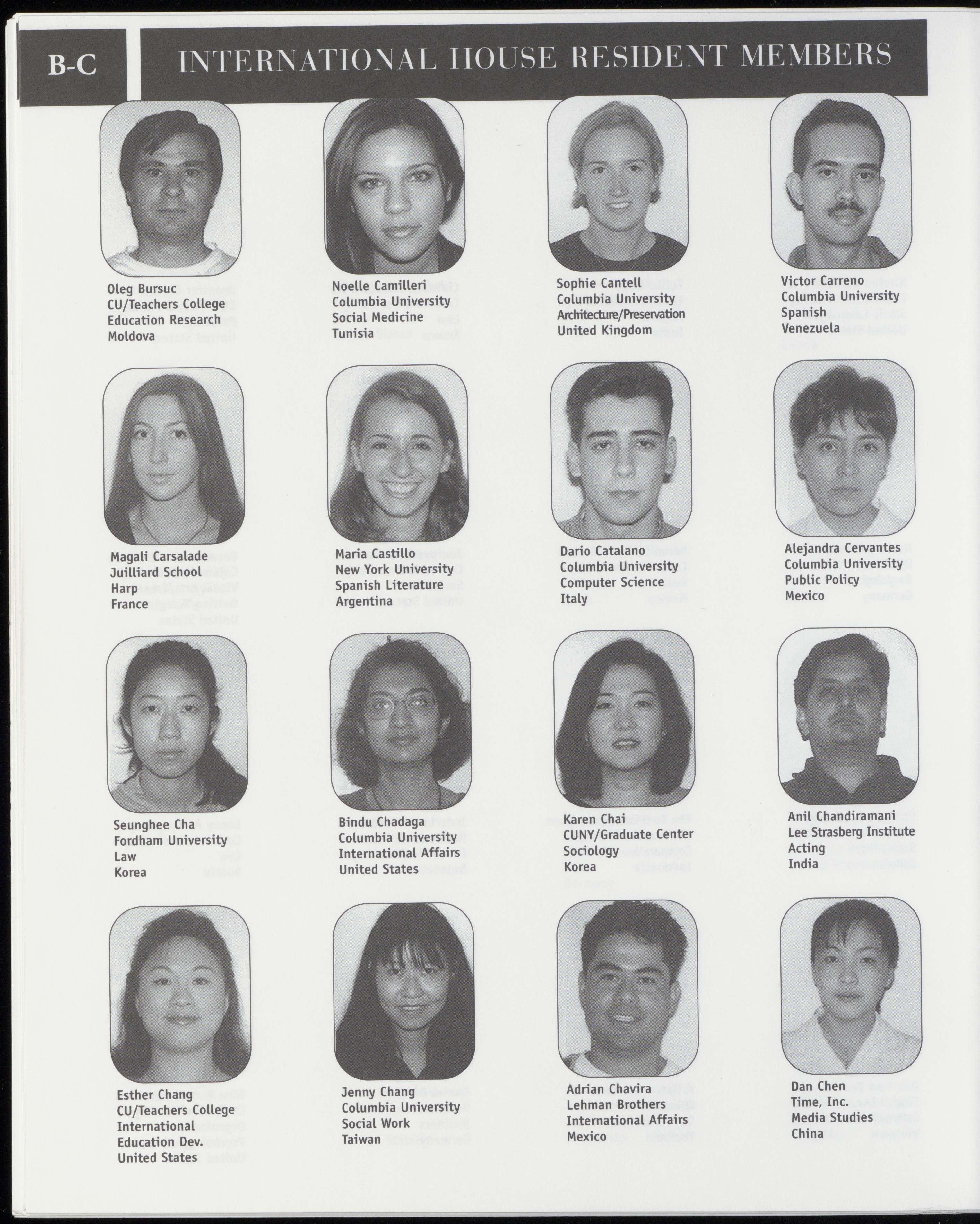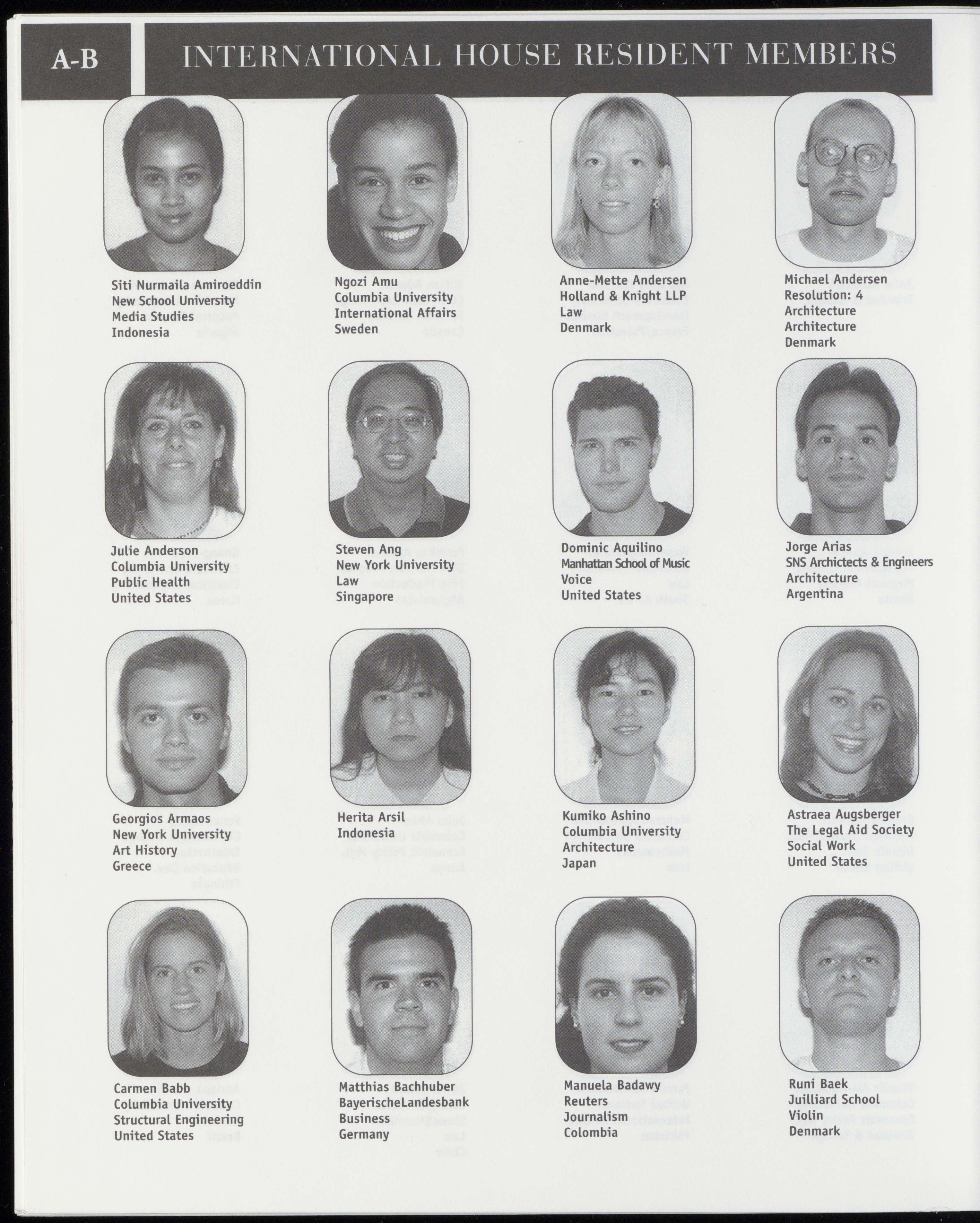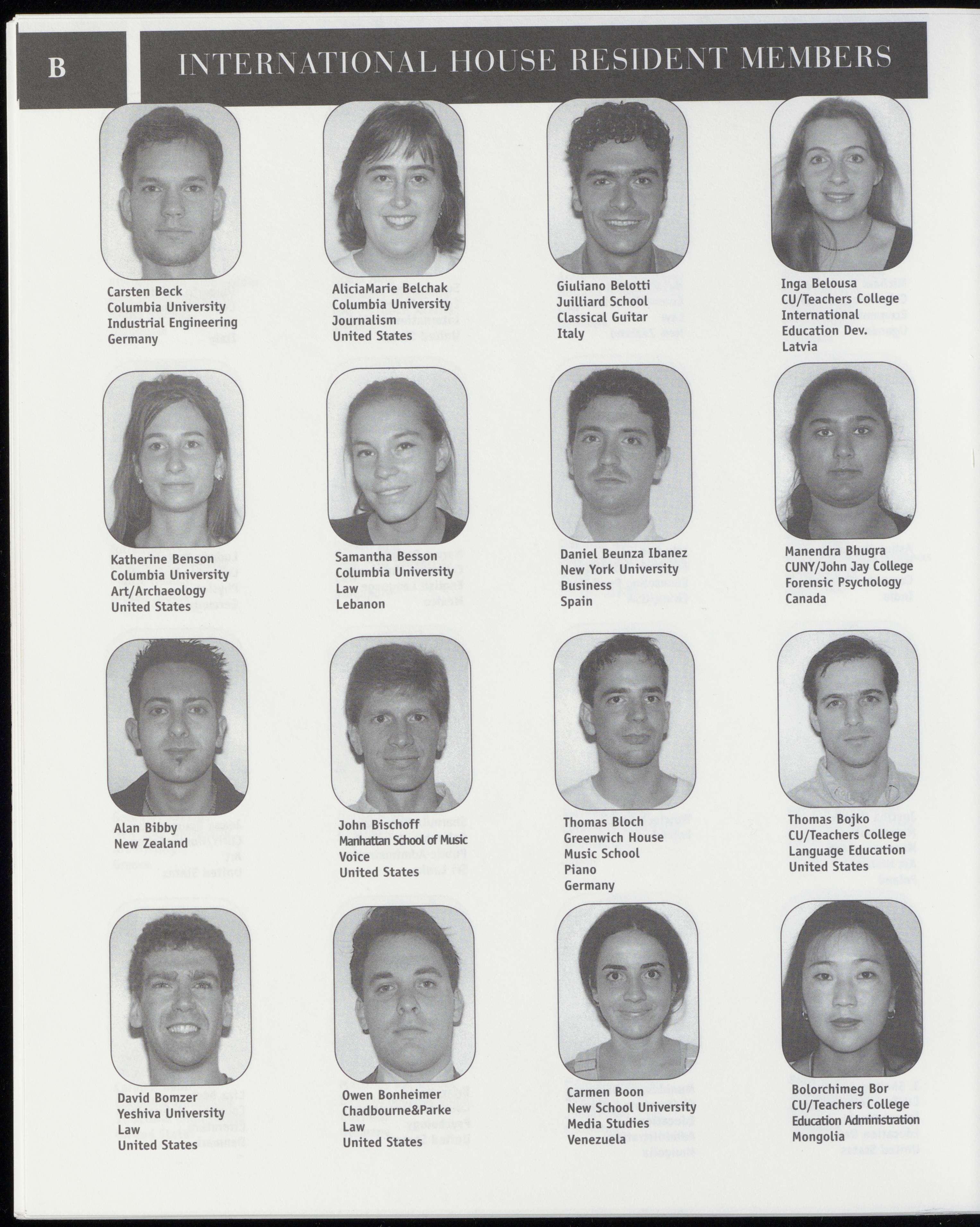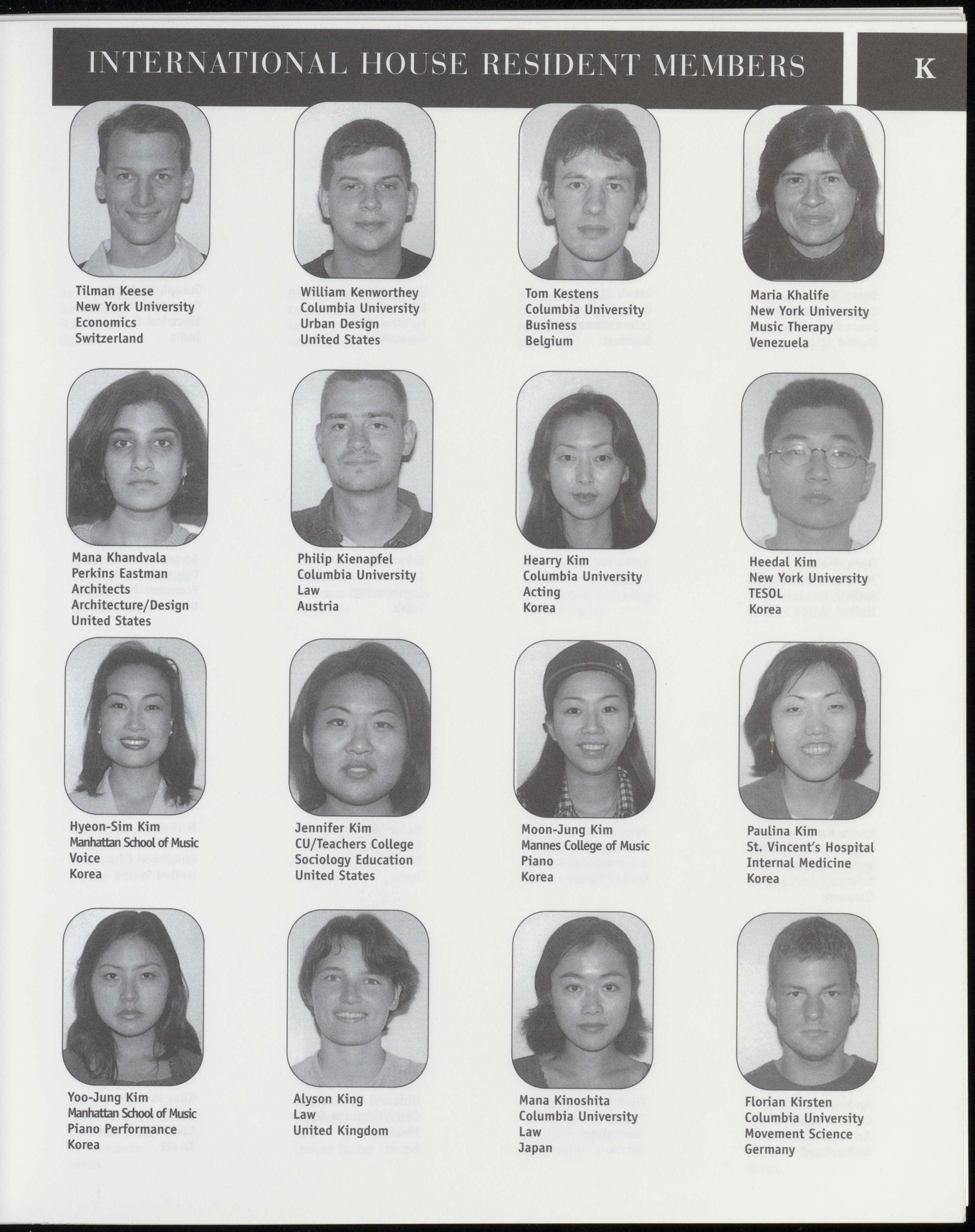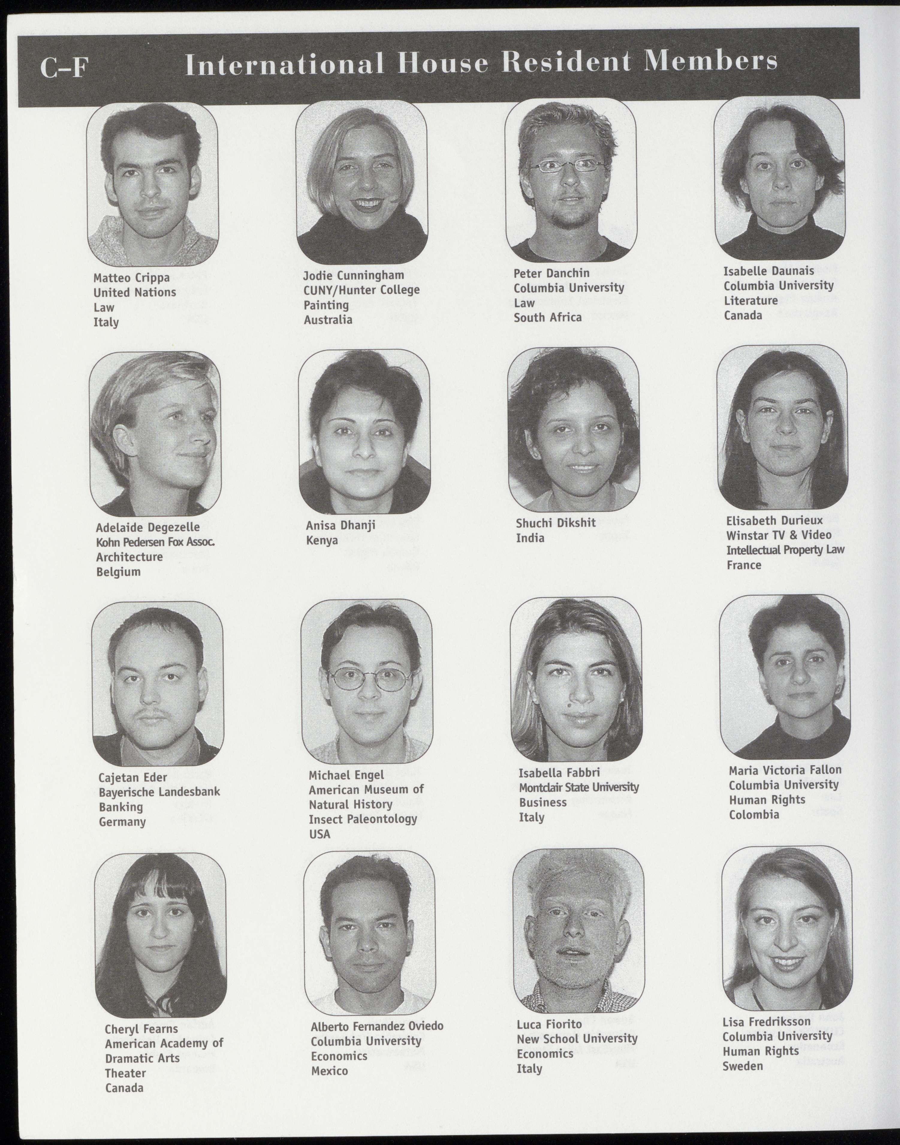 This Directory is not a “year book” nor, since it is published each fall, a reflection of a year gone by. Rather it anticipates a year to come and, significantly, your future lives as I. House alumni and world citizens. We hope that you will find it useful throughout your stay to help knit our community together, and that in the coming years as you peruse its pages you will remember with fondness your stay here, and be prompted to contact an old friend or acquaintance as well as support the House. Lifelong friendships are at the heart of the I. House experience, and this visual record—a “snap shot” of our community in 1999—forever preserves a time and a place in your lives.