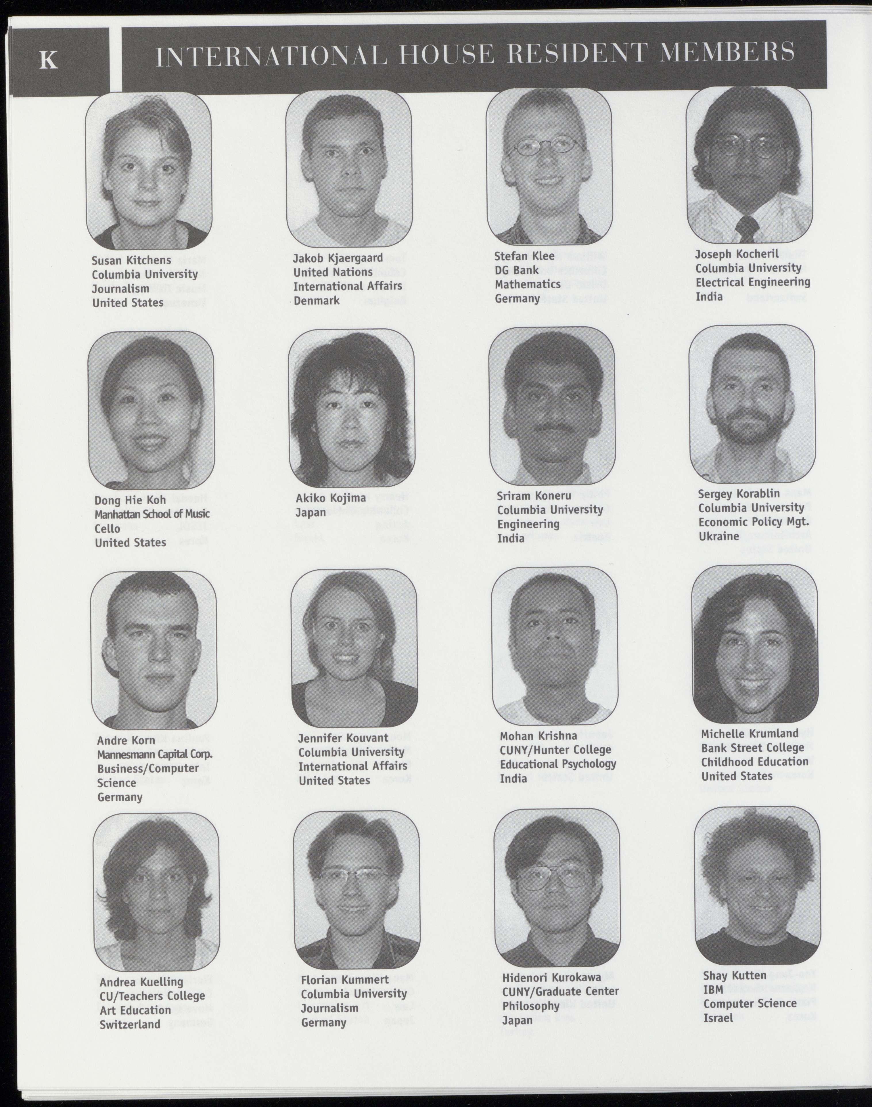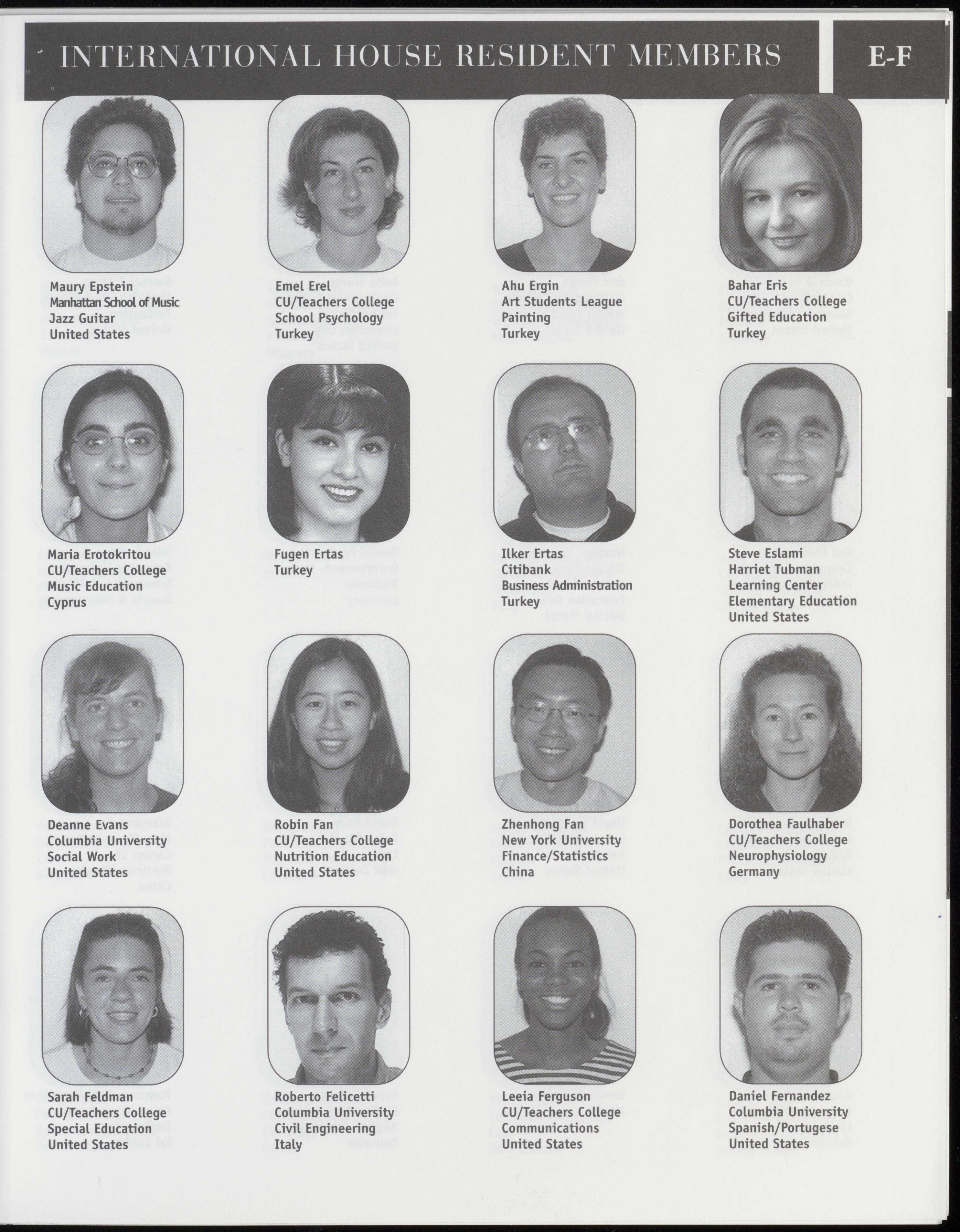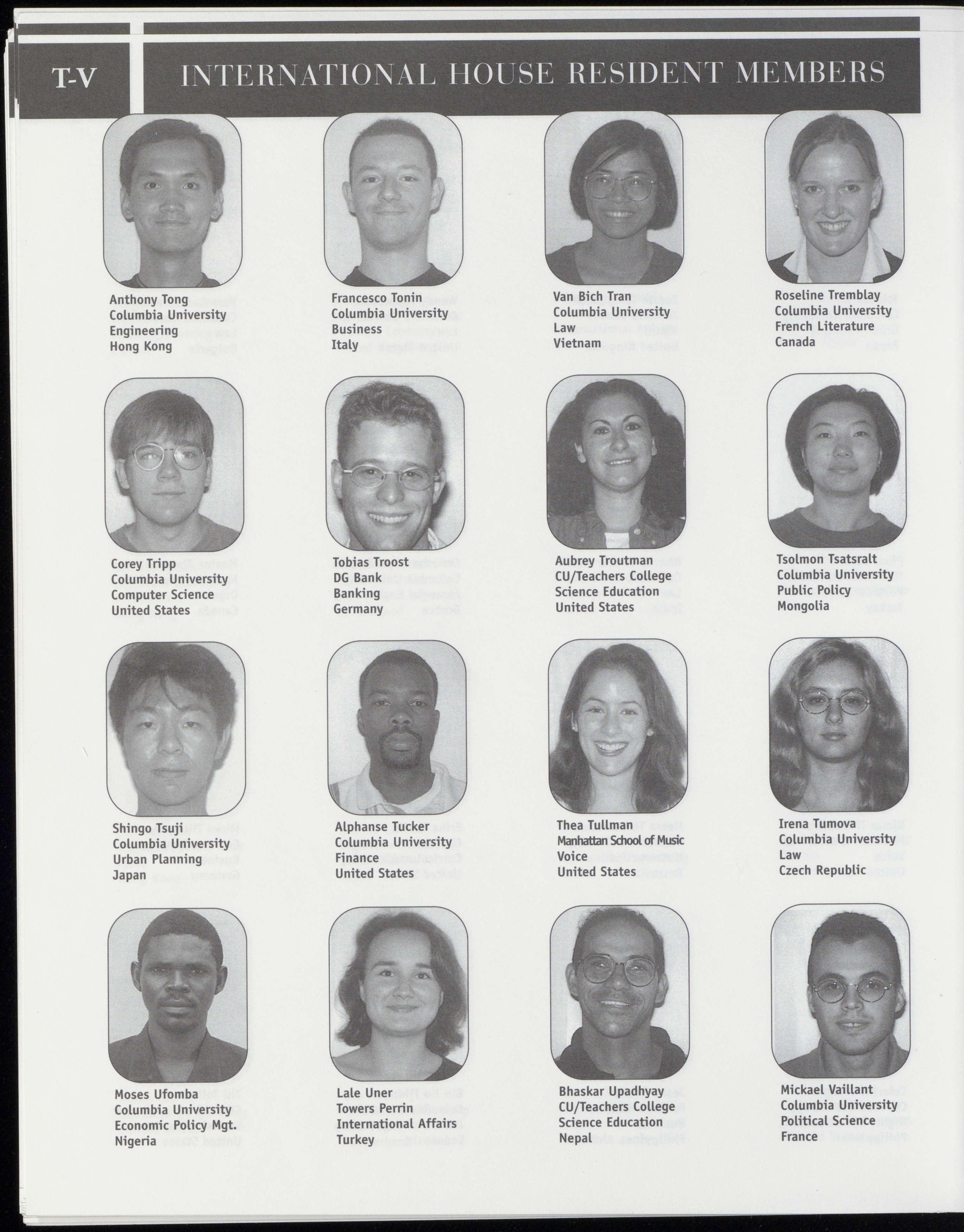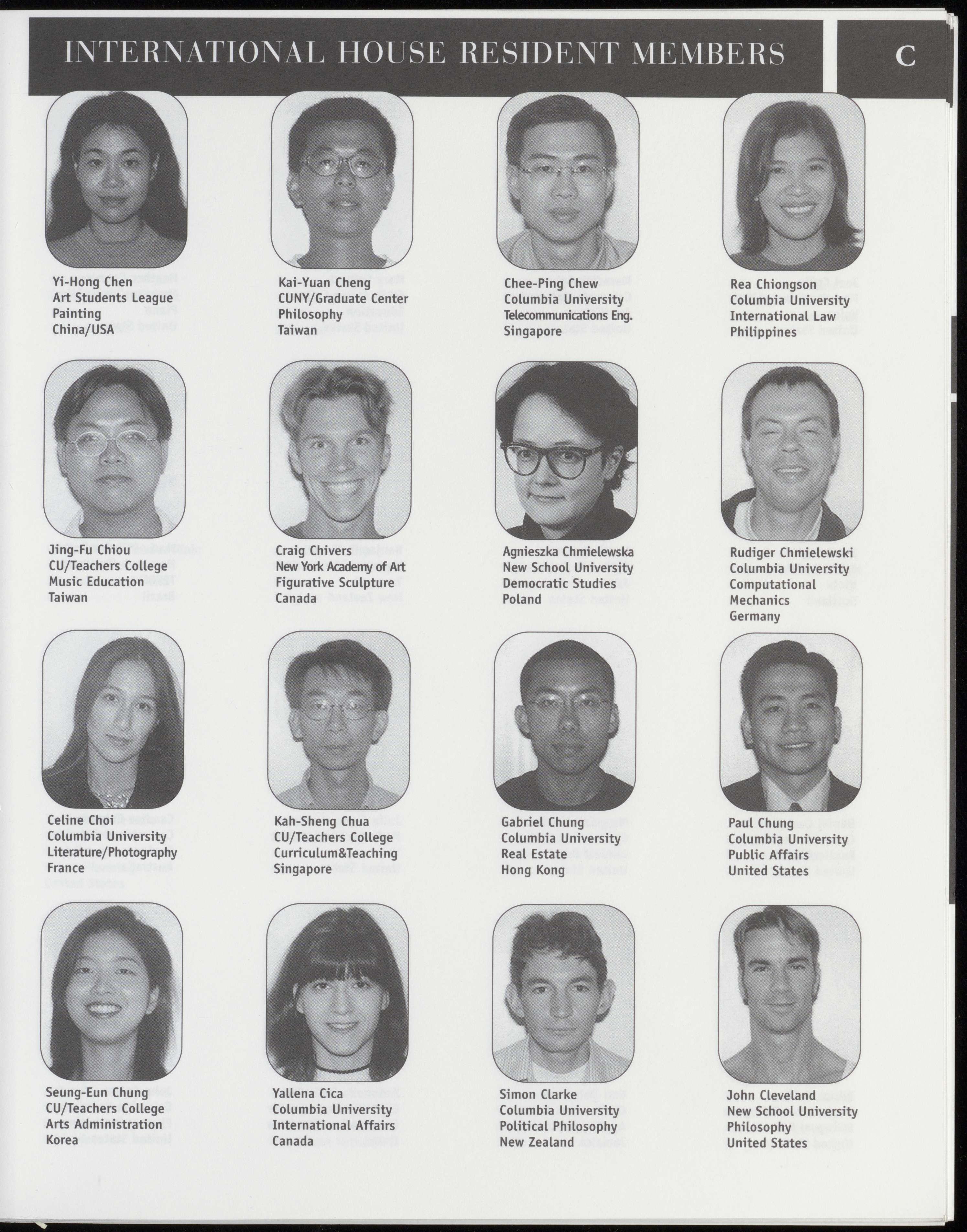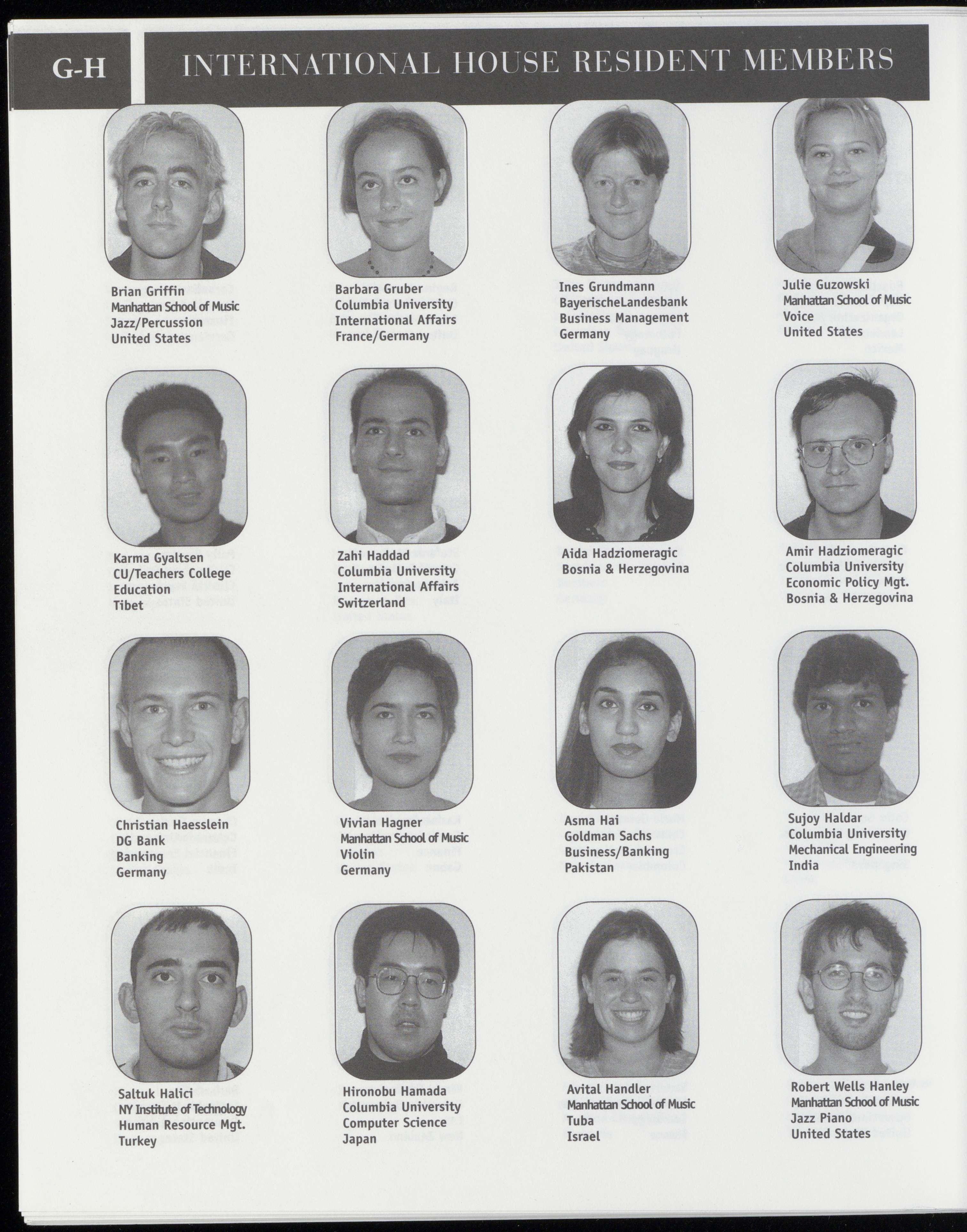 This Directory is not a “year book” nor, since it is published each fall, a reflection of a year gone by. Rather it anticipates a year to come and, significantly, your future lives as I. House alumni and world citizens. We hope that you will find it useful throughout your stay to help knit our community together, and that in the coming years as you peruse its pages you will remember with fondness your stay here, and be prompted to contact an old friend or acquaintance as well as support the House. Lifelong friendships are at the heart of the I. House experience, and this visual record—a “snap shot” of our community in 1999—forever preserves a time and a place in your lives.
