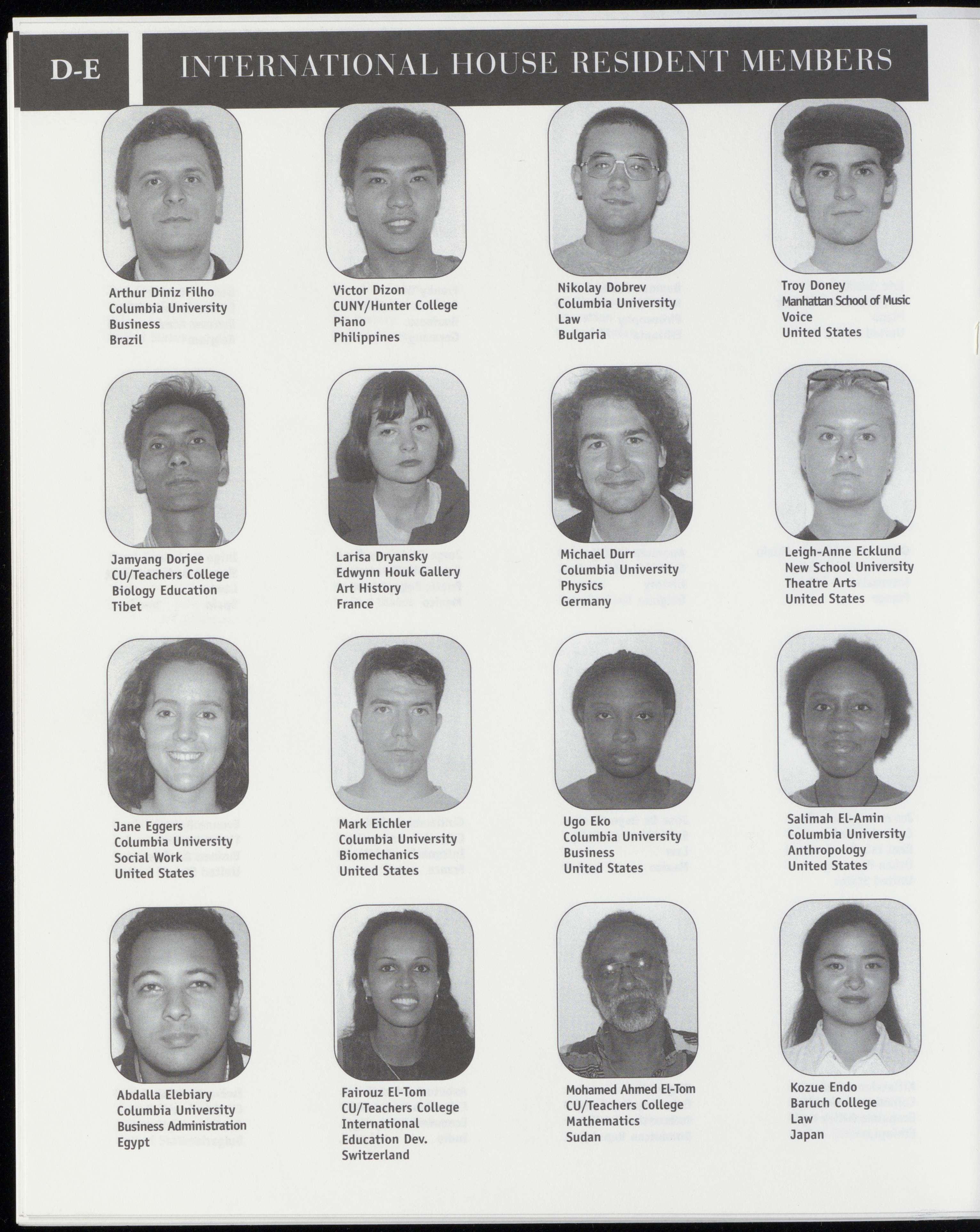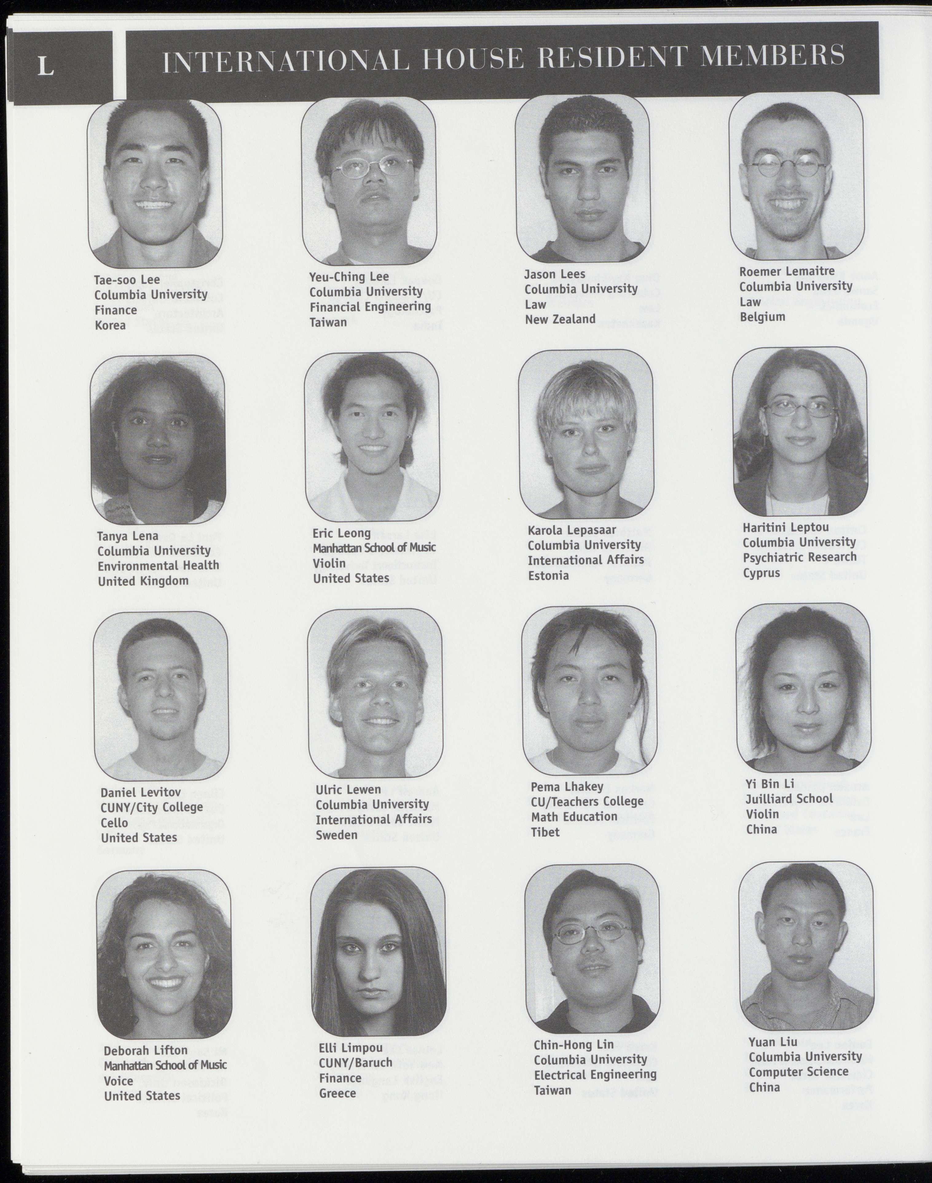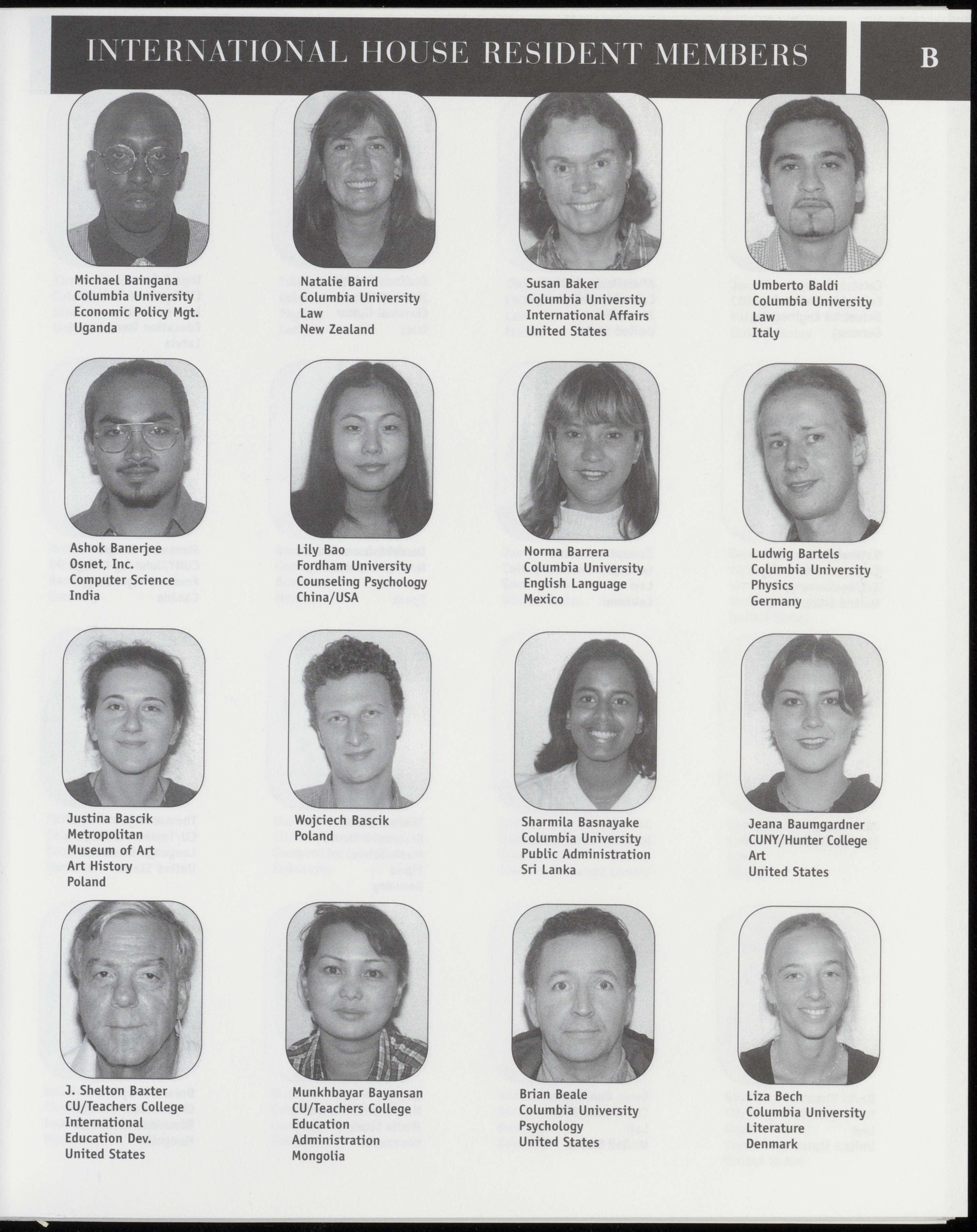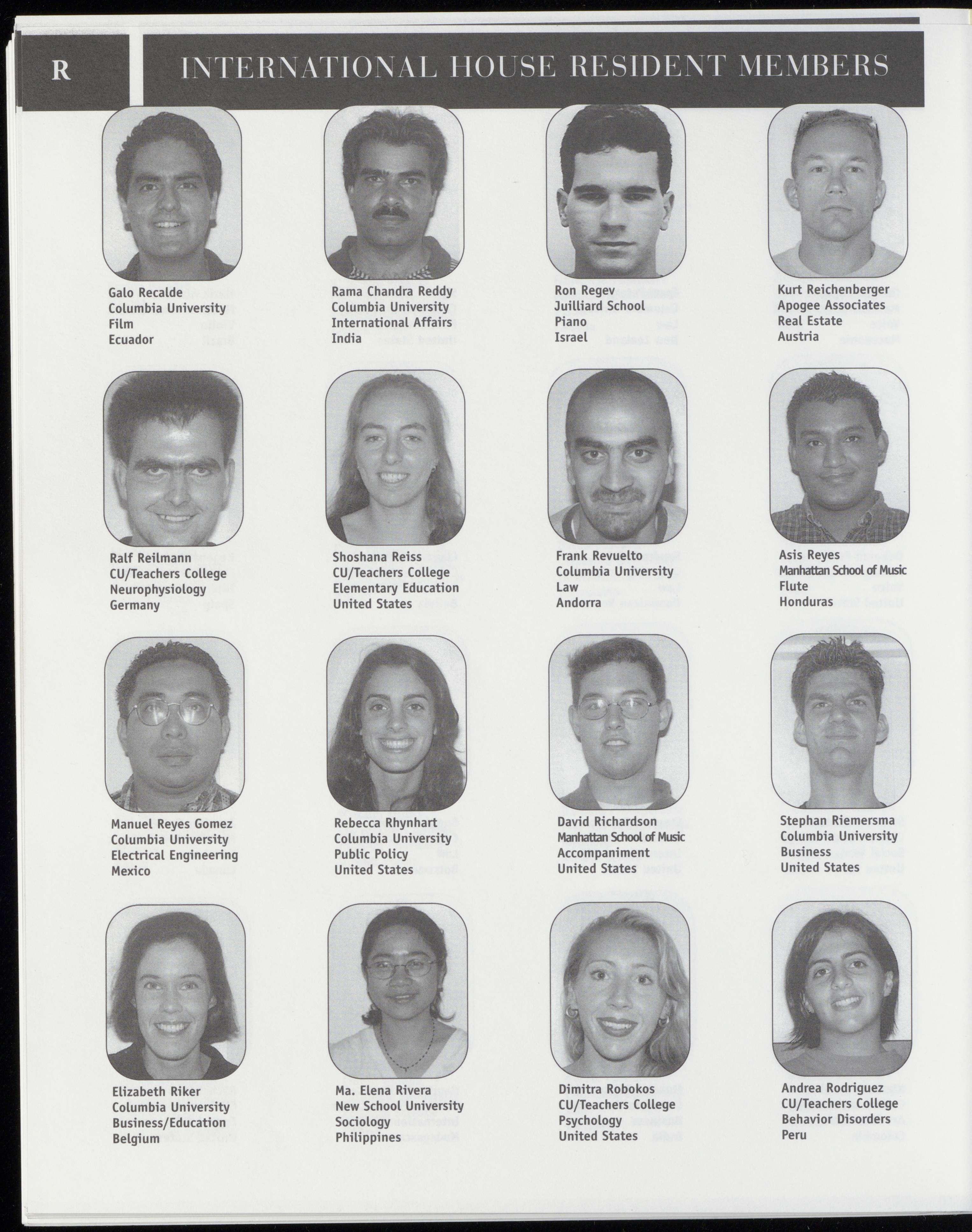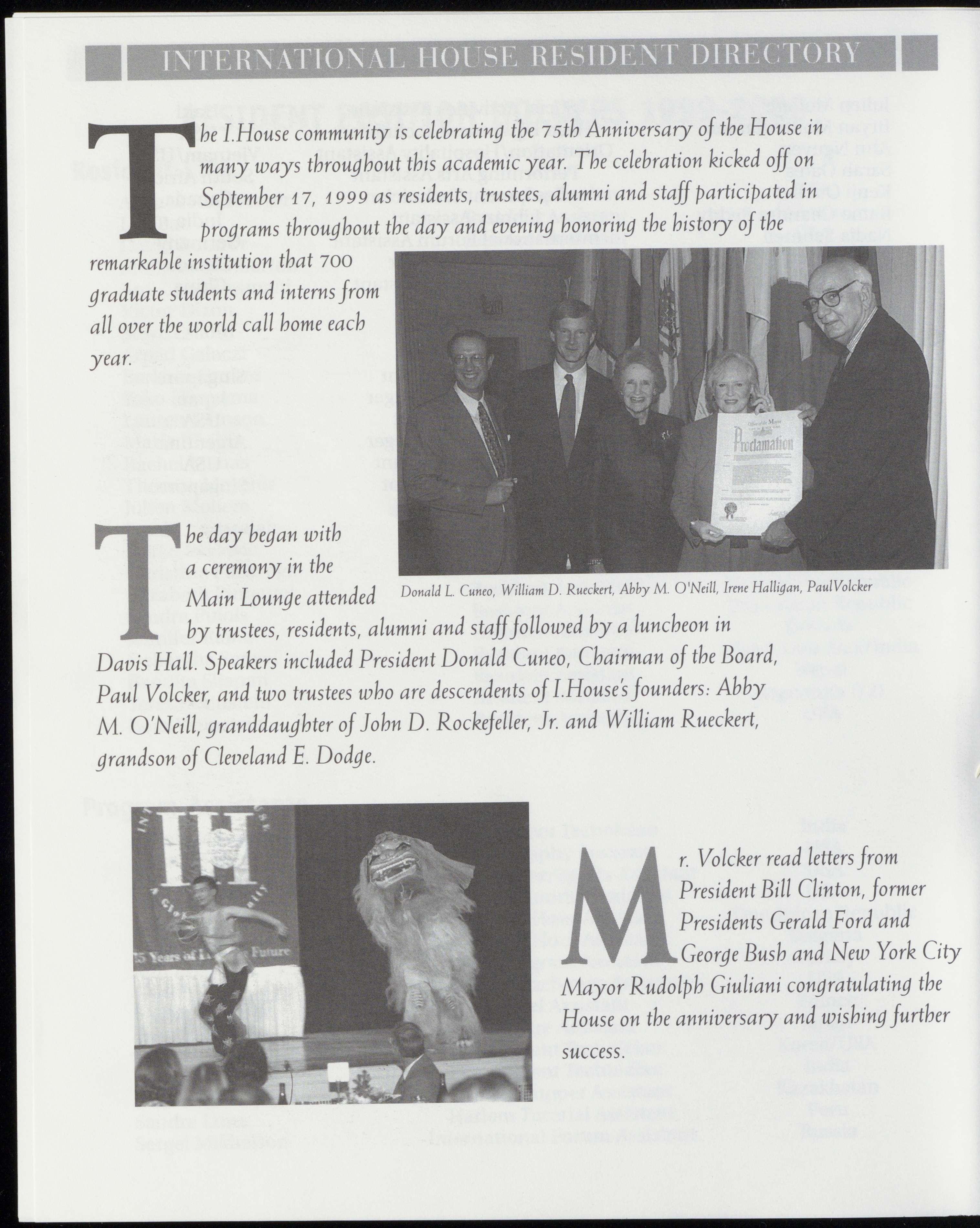 This Directory is not a “year book” nor, since it is published each fall, a reflection of a year gone by. Rather it anticipates a year to come and, significantly, your future lives as I. House alumni and world citizens. We hope that you will find it useful throughout your stay to help knit our community together, and that in the coming years as you peruse its pages you will remember with fondness your stay here, and be prompted to contact an old friend or acquaintance as well as support the House. Lifelong friendships are at the heart of the I. House experience, and this visual record—a “snap shot” of our community in 1999—forever preserves a time and a place in your lives.