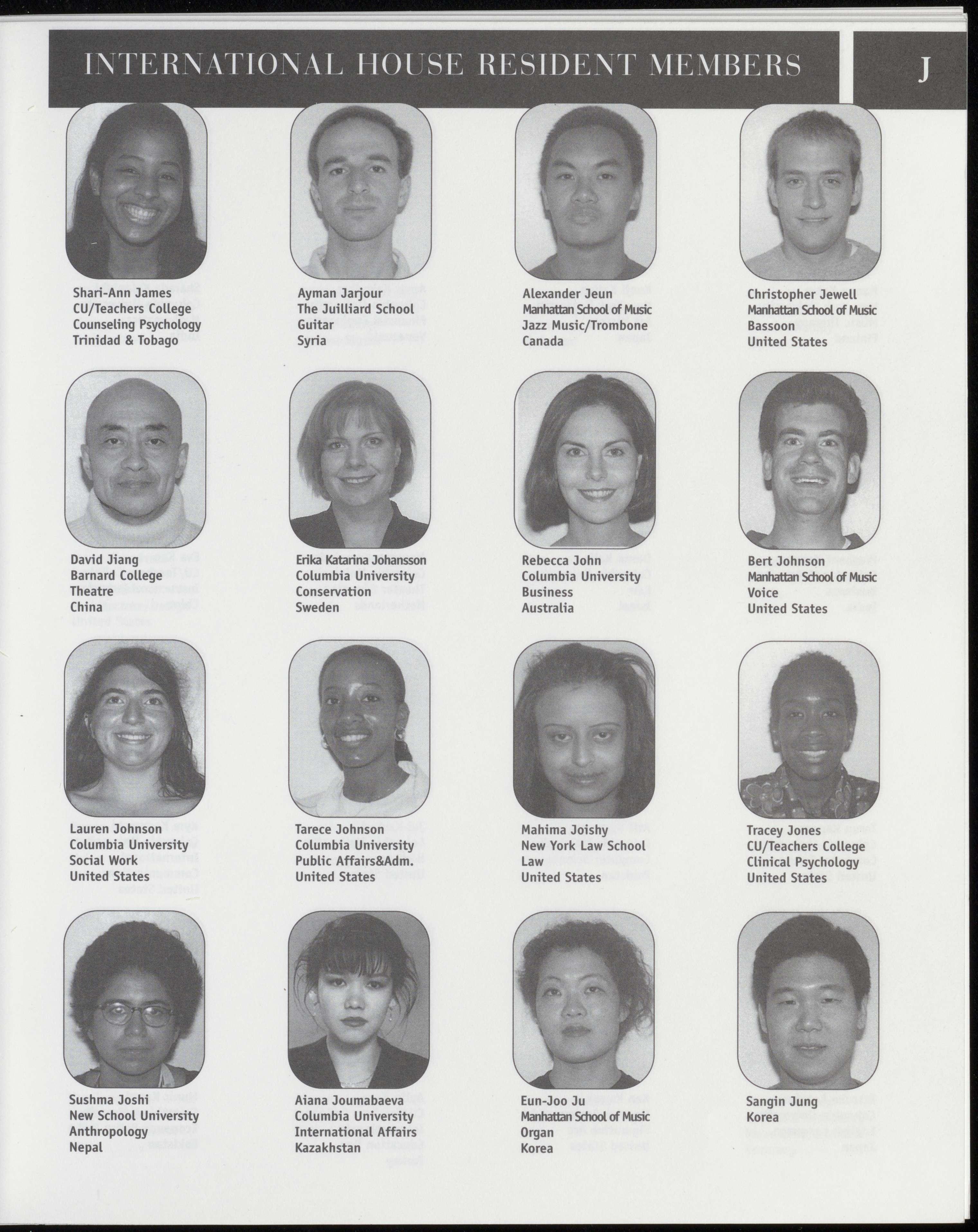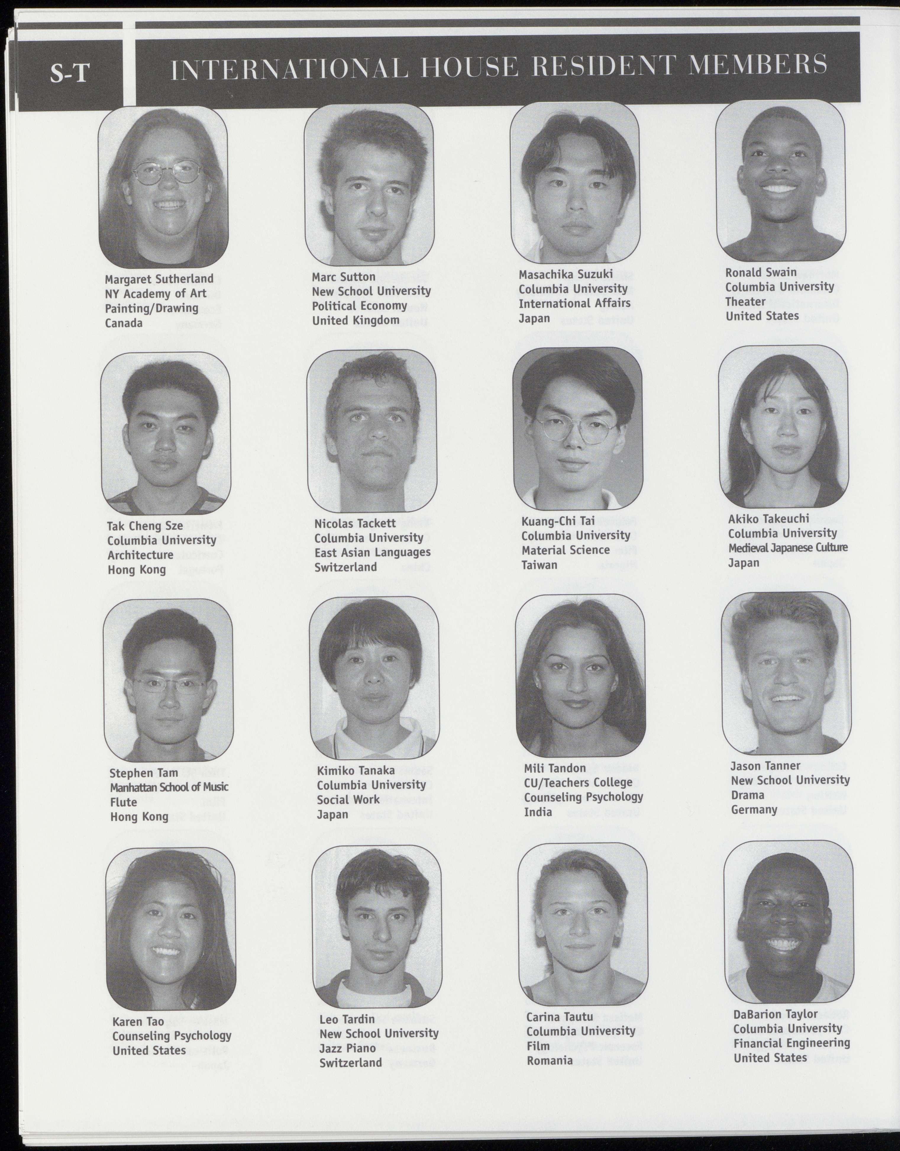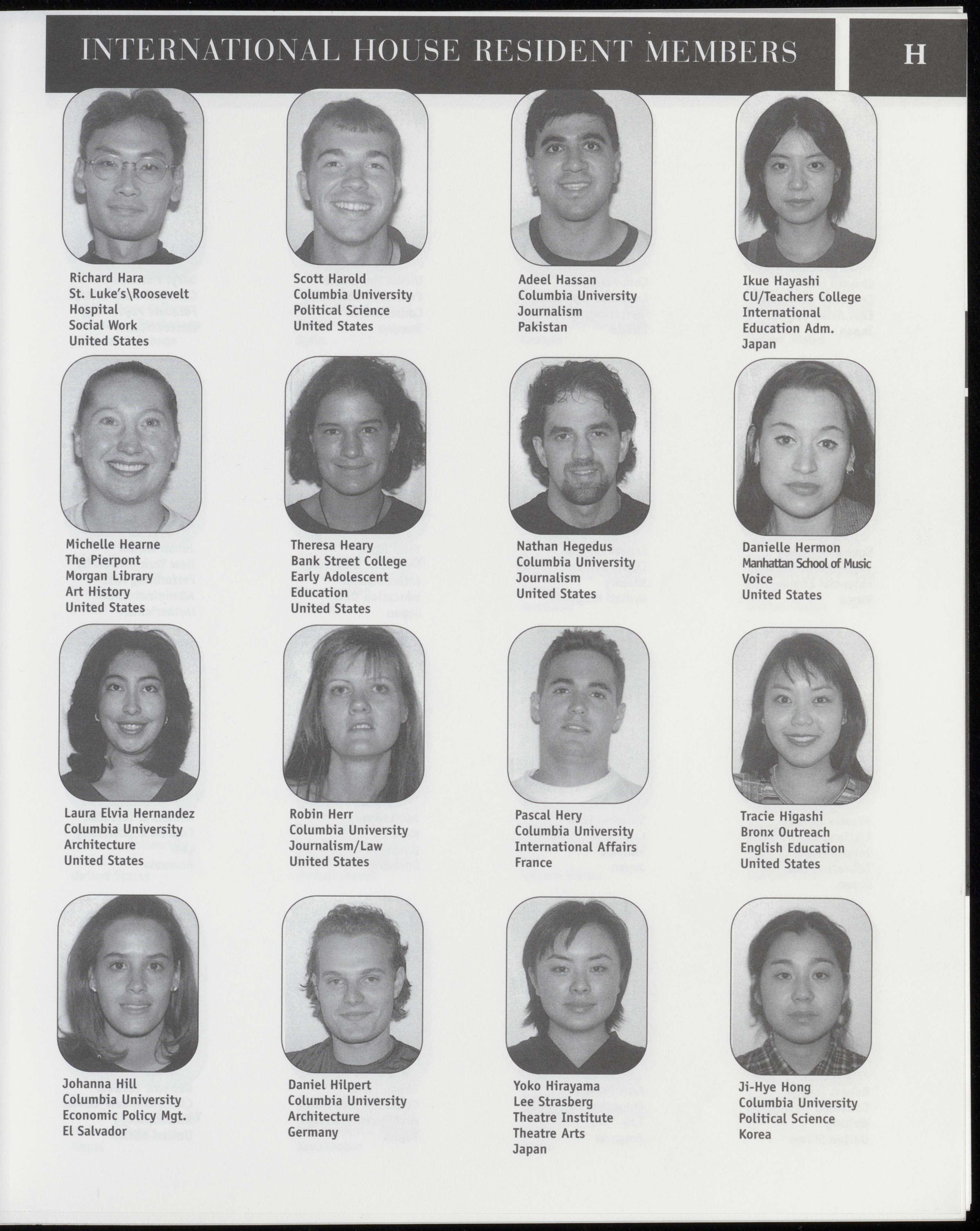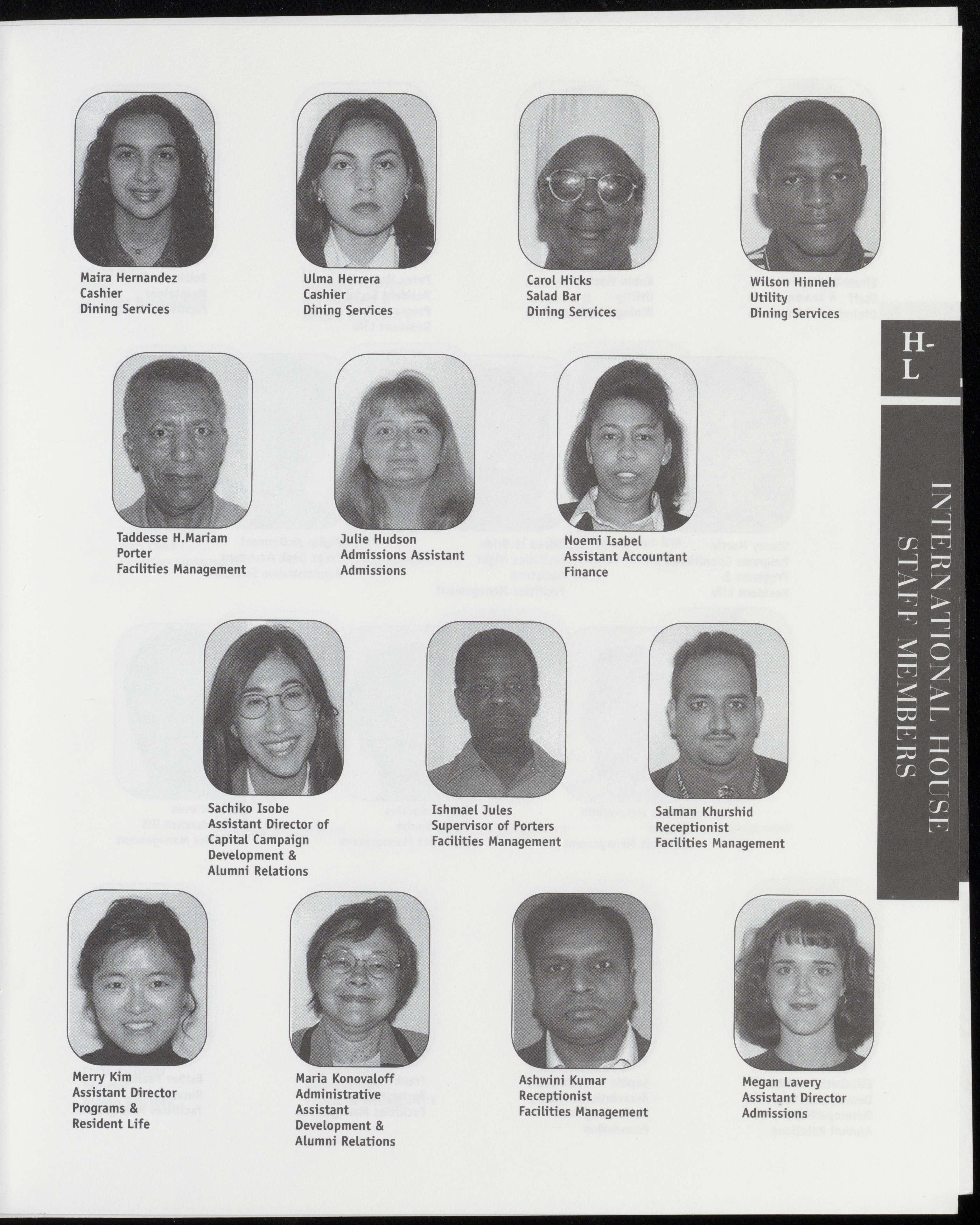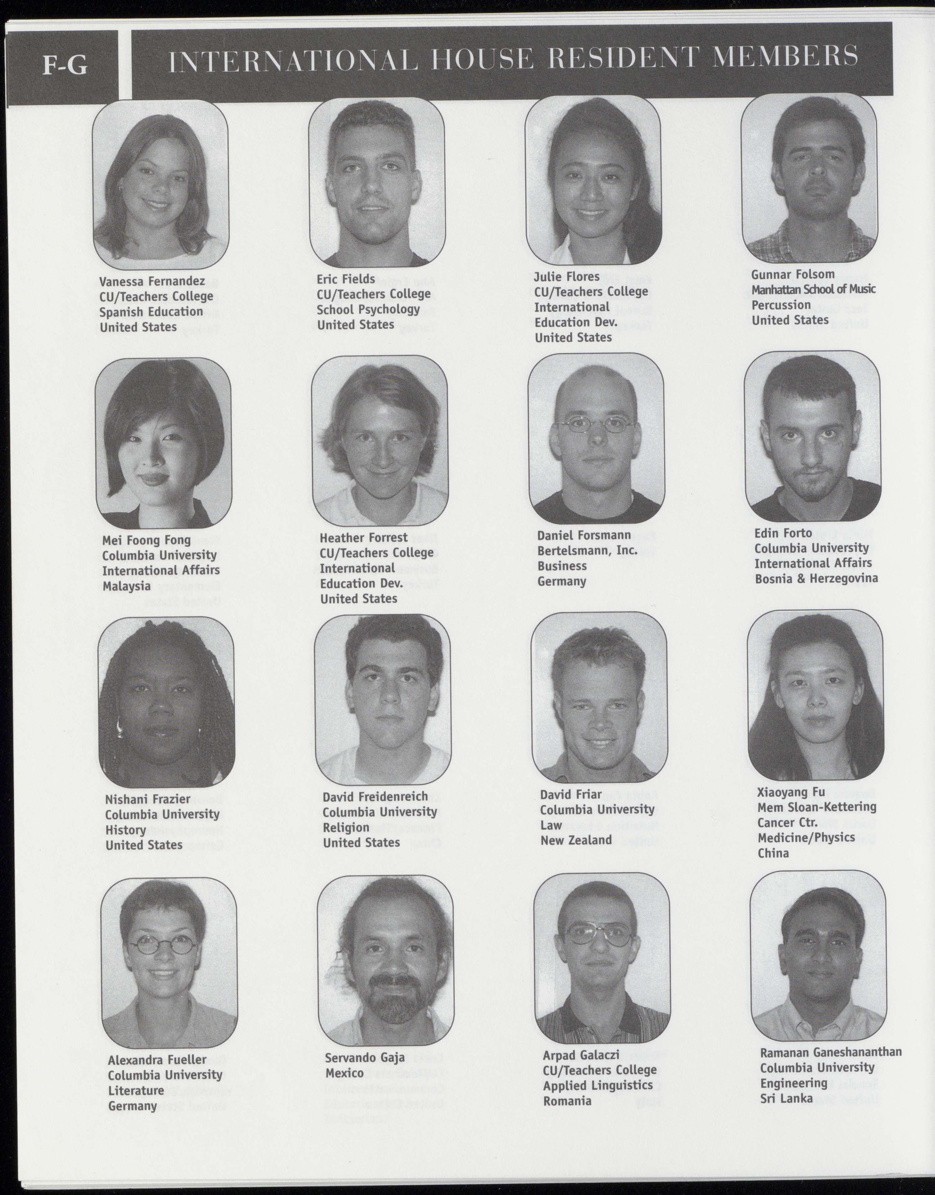 This Directory is not a “year book” nor, since it is published each fall, a reflection of a year gone by. Rather it anticipates a year to come and, significantly, your future lives as I. House alumni and world citizens. We hope that you will find it useful throughout your stay to help knit our community together, and that in the coming years as you peruse its pages you will remember with fondness your stay here, and be prompted to contact an old friend or acquaintance as well as support the House. Lifelong friendships are at the heart of the I. House experience, and this visual record—a “snap shot” of our community in 1999—forever preserves a time and a place in your lives.