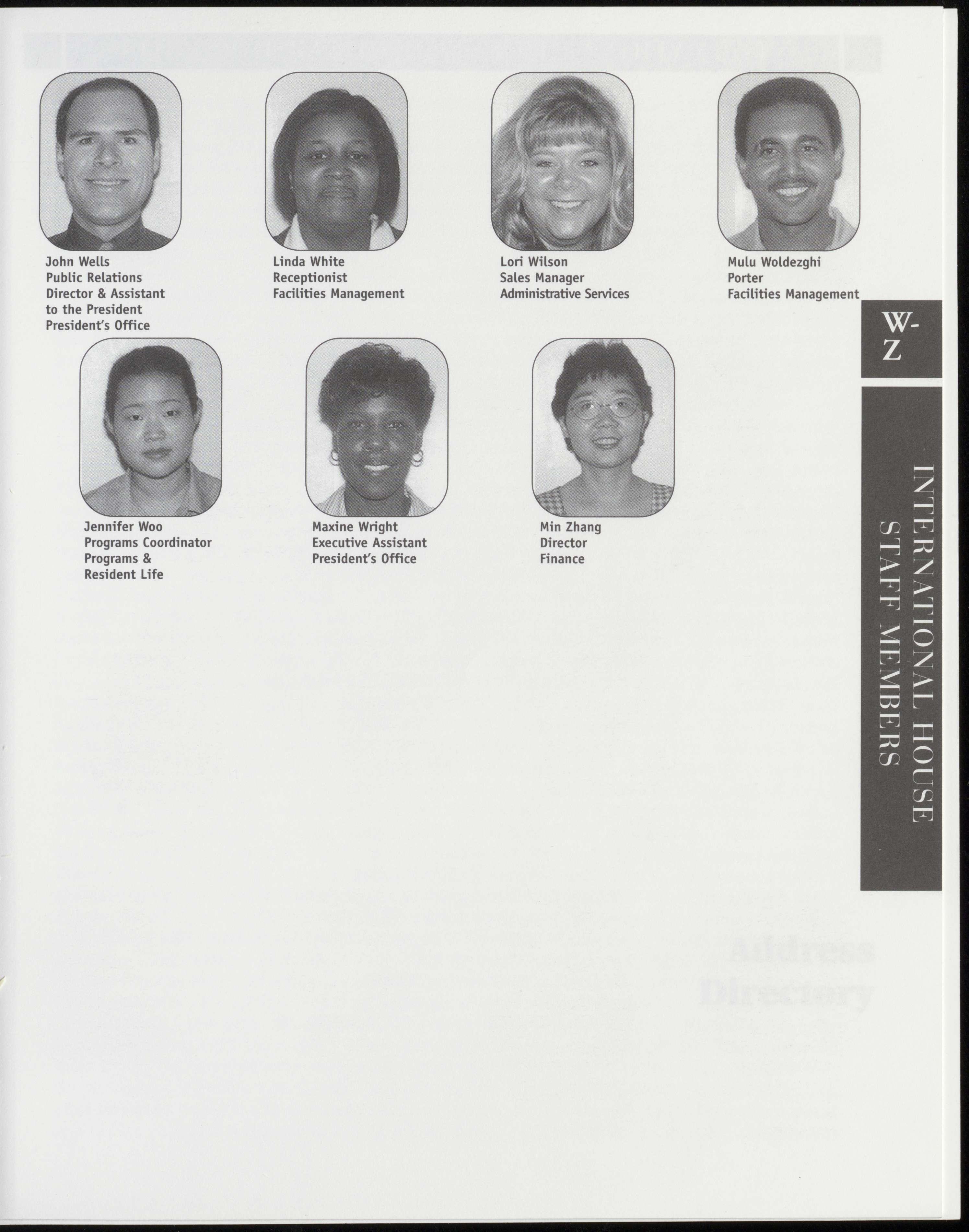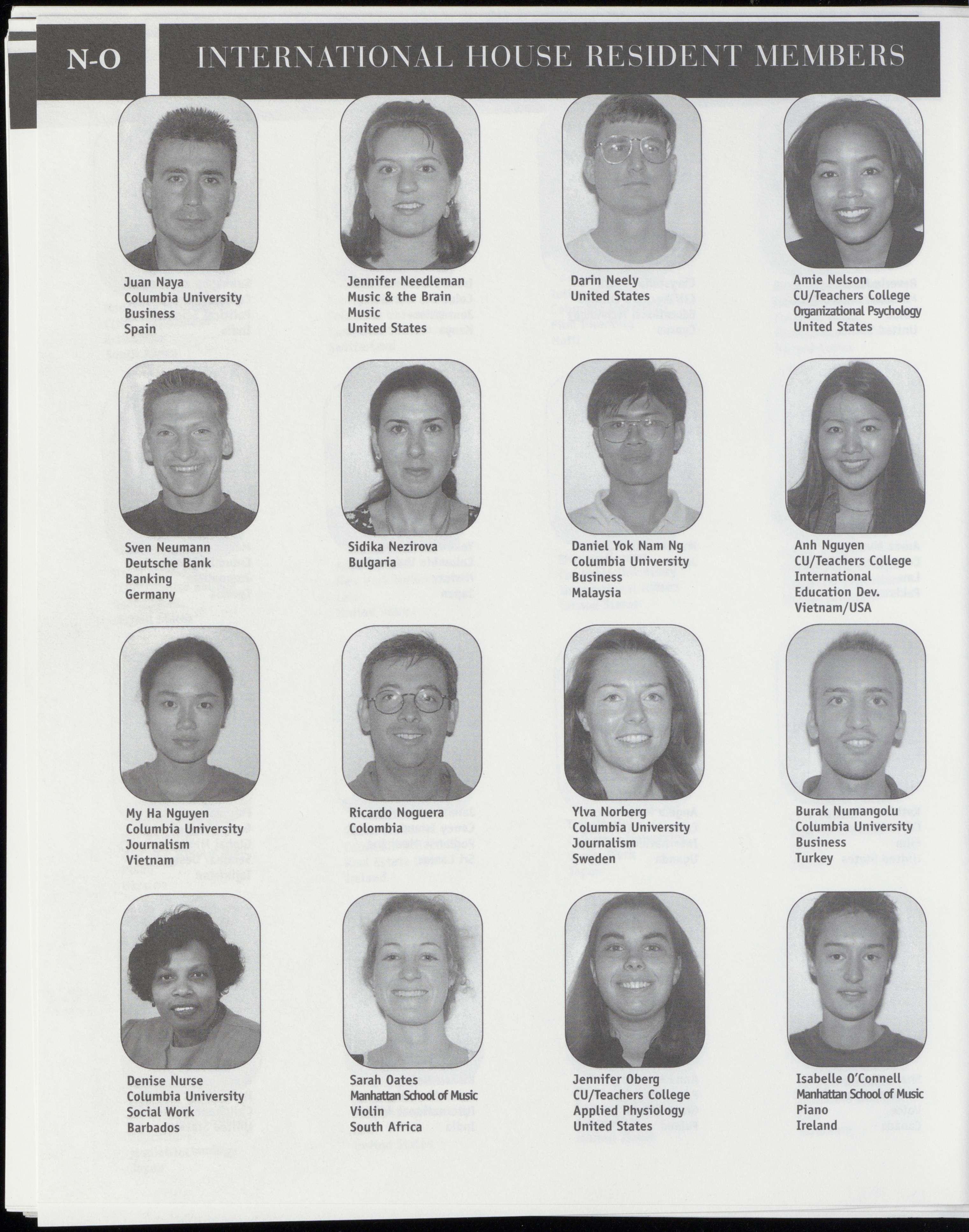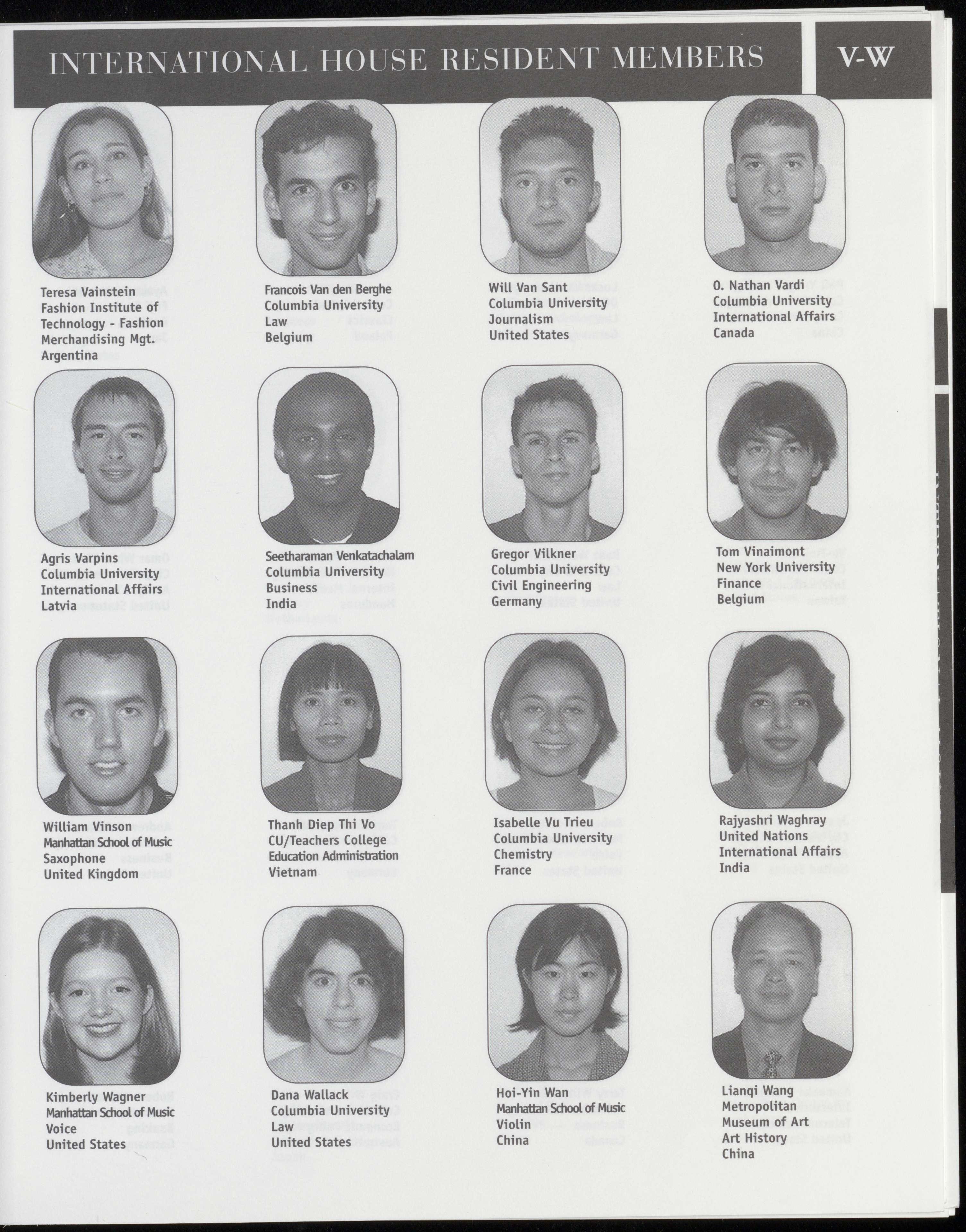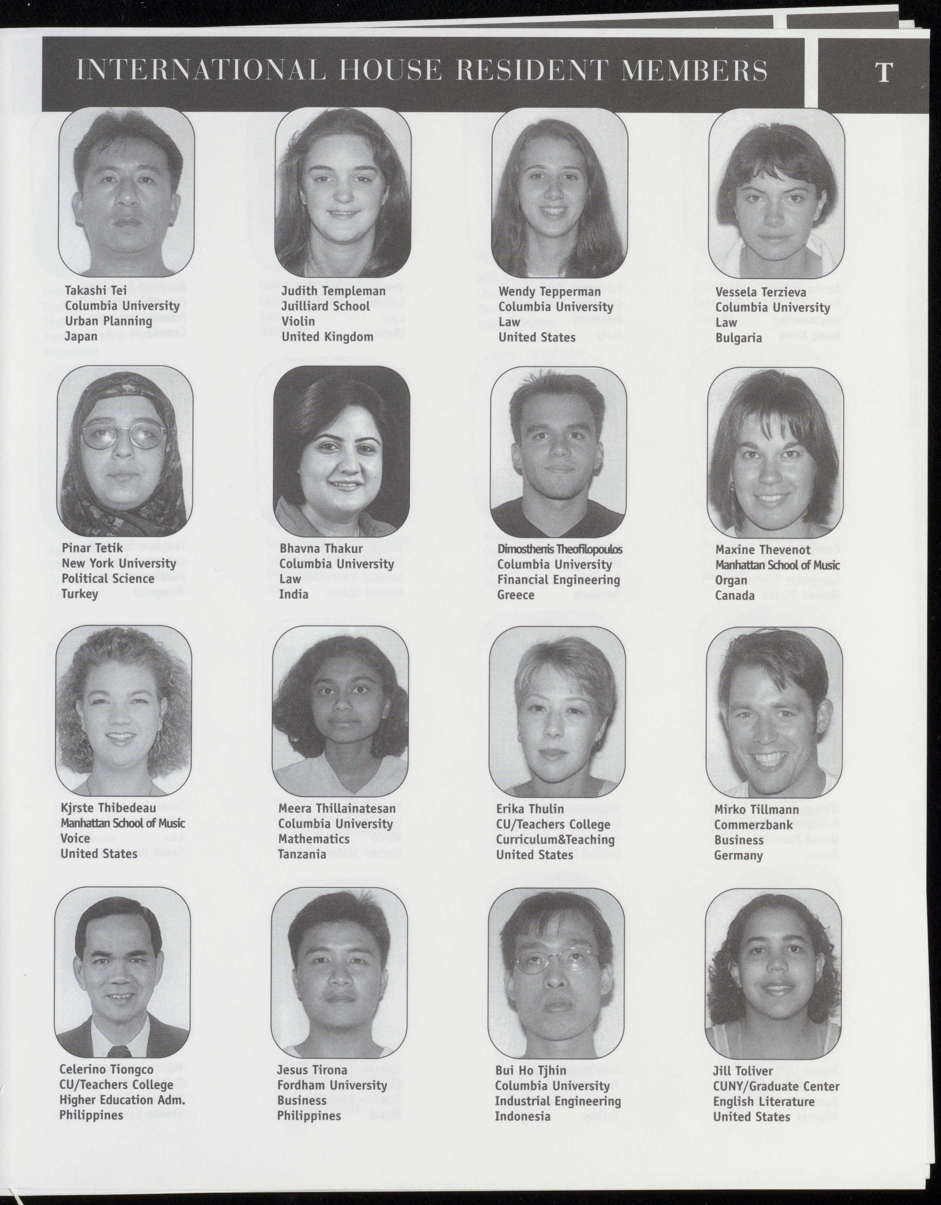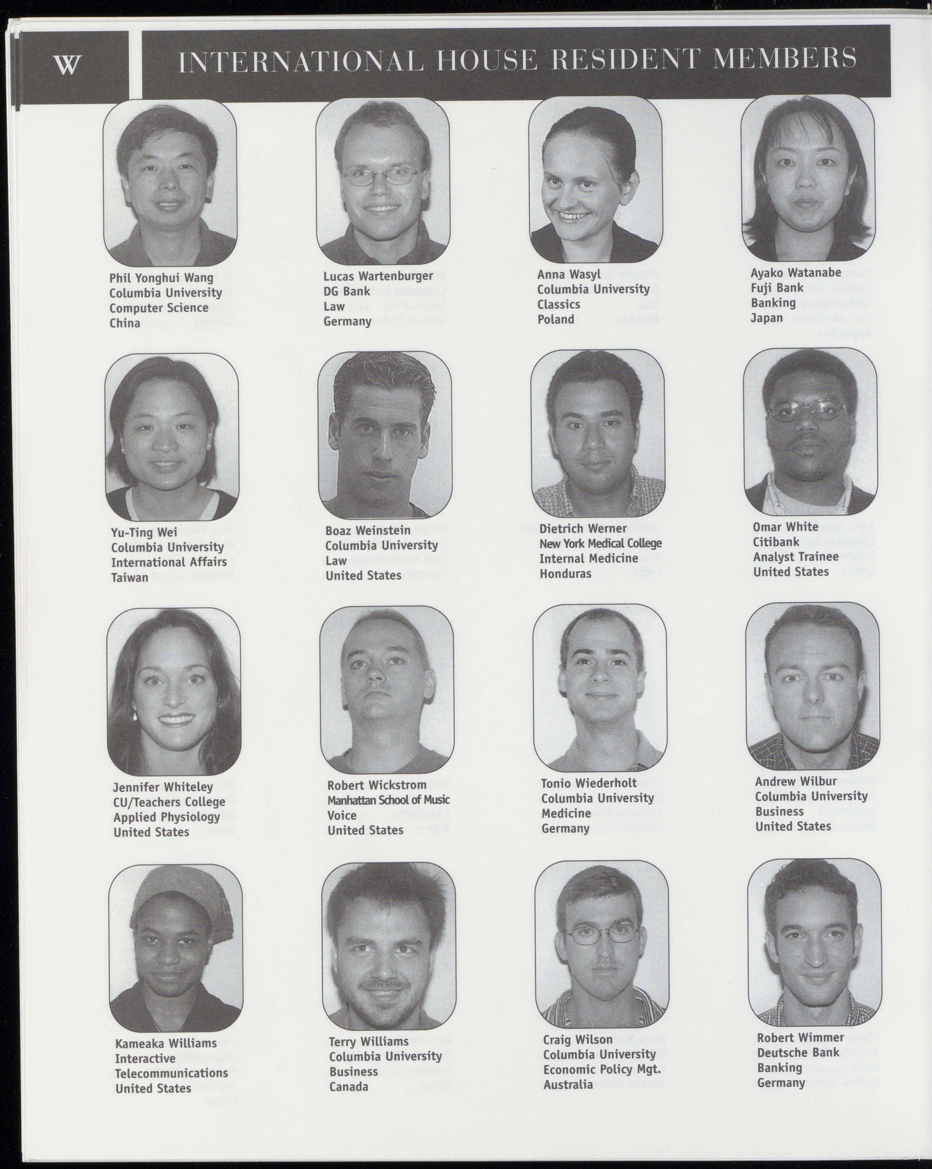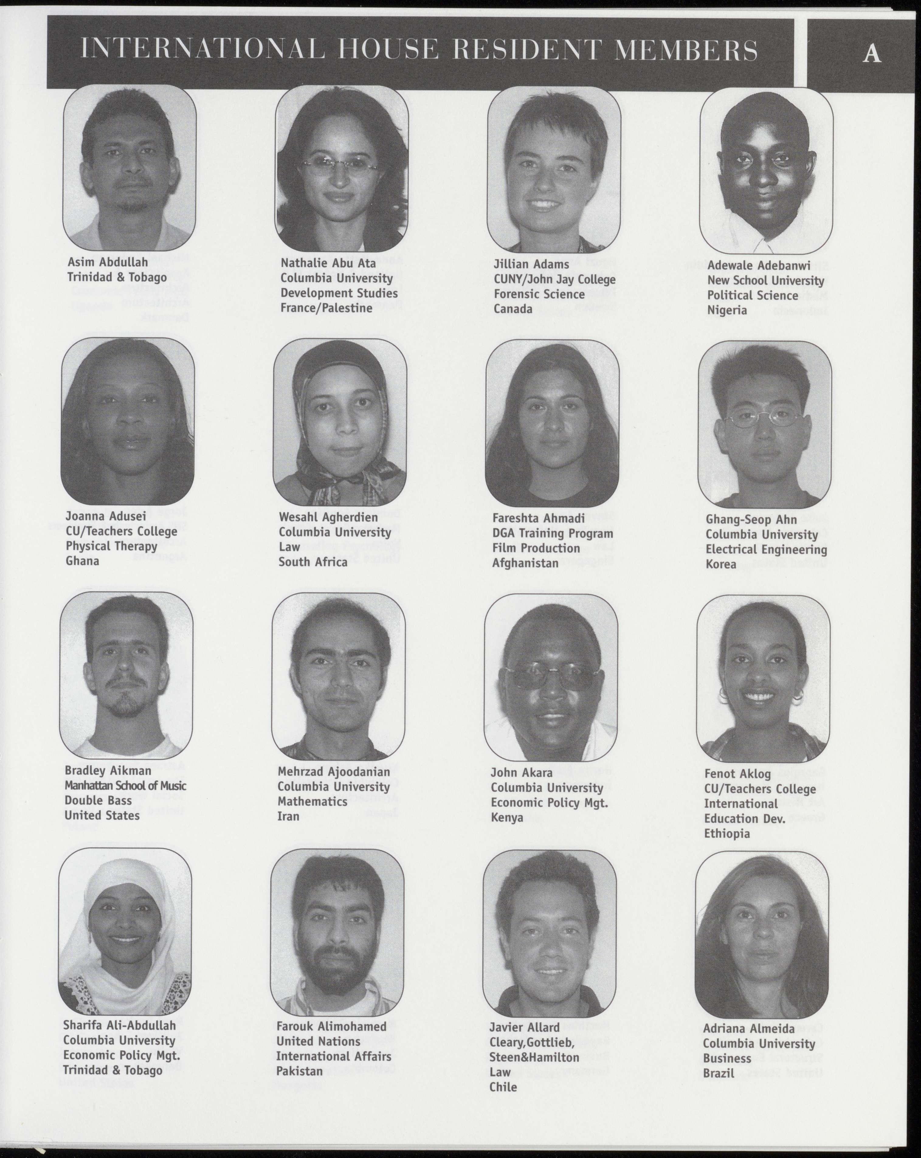 This Directory is not a “year book” nor, since it is published each fall, a reflection of a year gone by. Rather it anticipates a year to come and, significantly, your future lives as I. House alumni and world citizens. We hope that you will find it useful throughout your stay to help knit our community together, and that in the coming years as you peruse its pages you will remember with fondness your stay here, and be prompted to contact an old friend or acquaintance as well as support the House. Lifelong friendships are at the heart of the I. House experience, and this visual record—a “snap shot” of our community in 1999—forever preserves a time and a place in your lives.