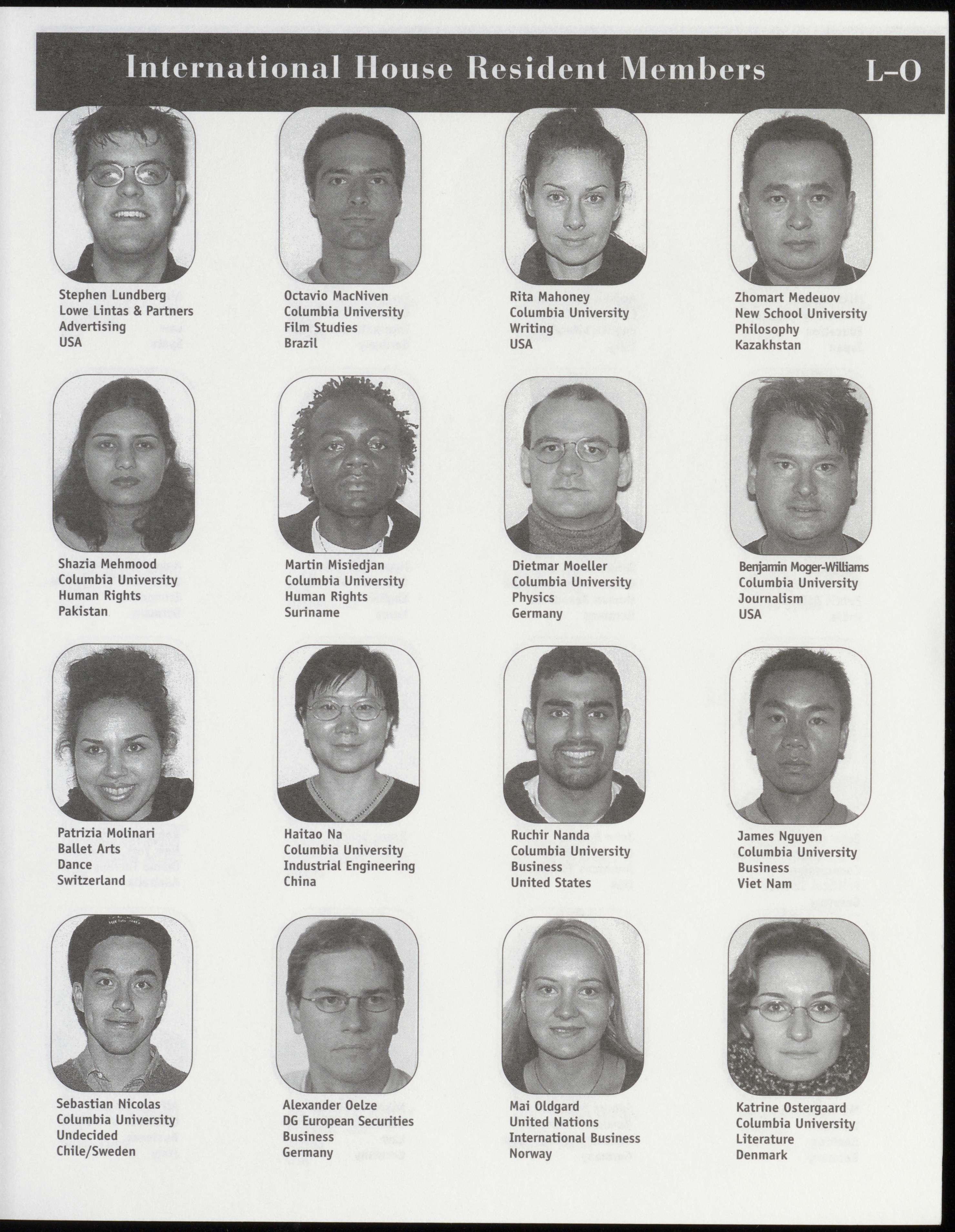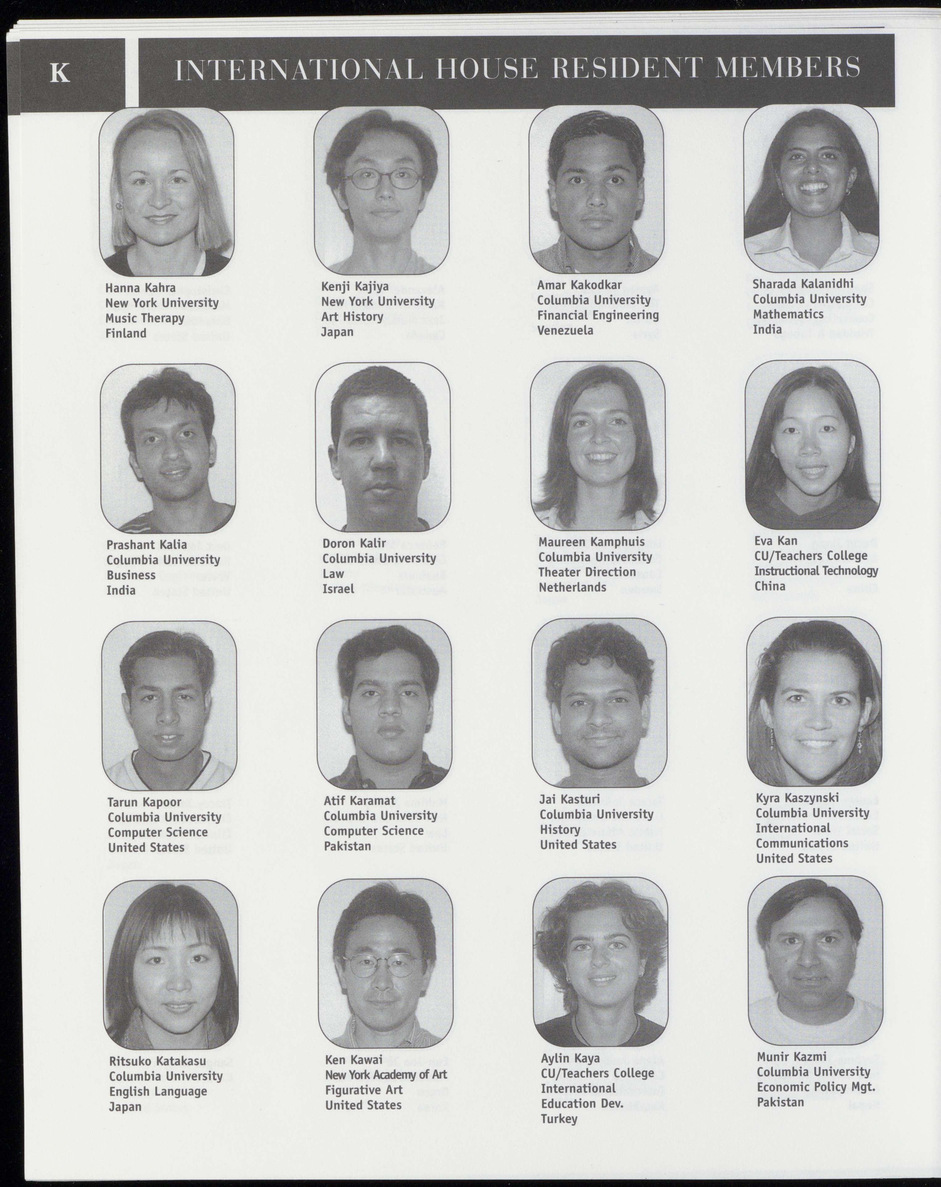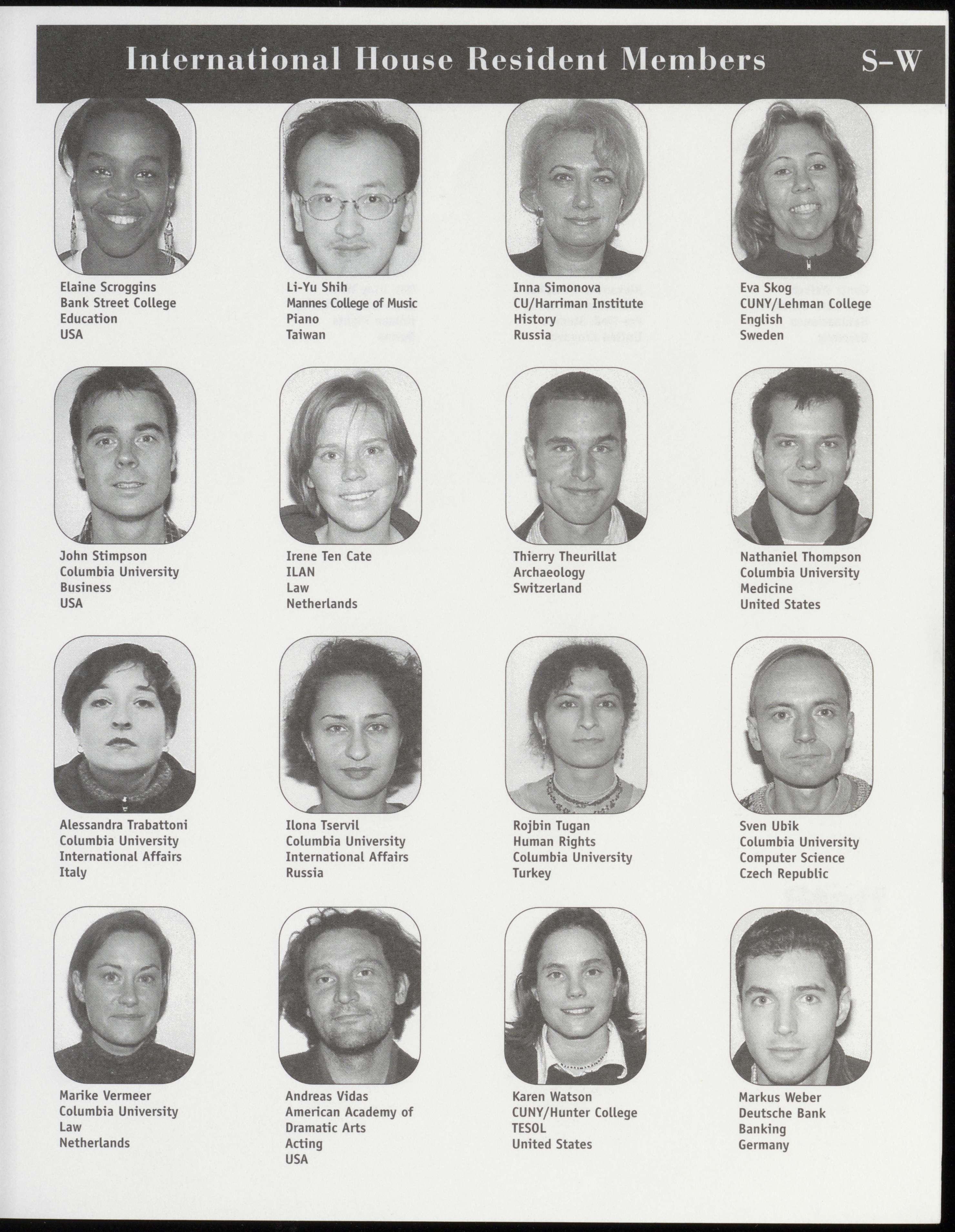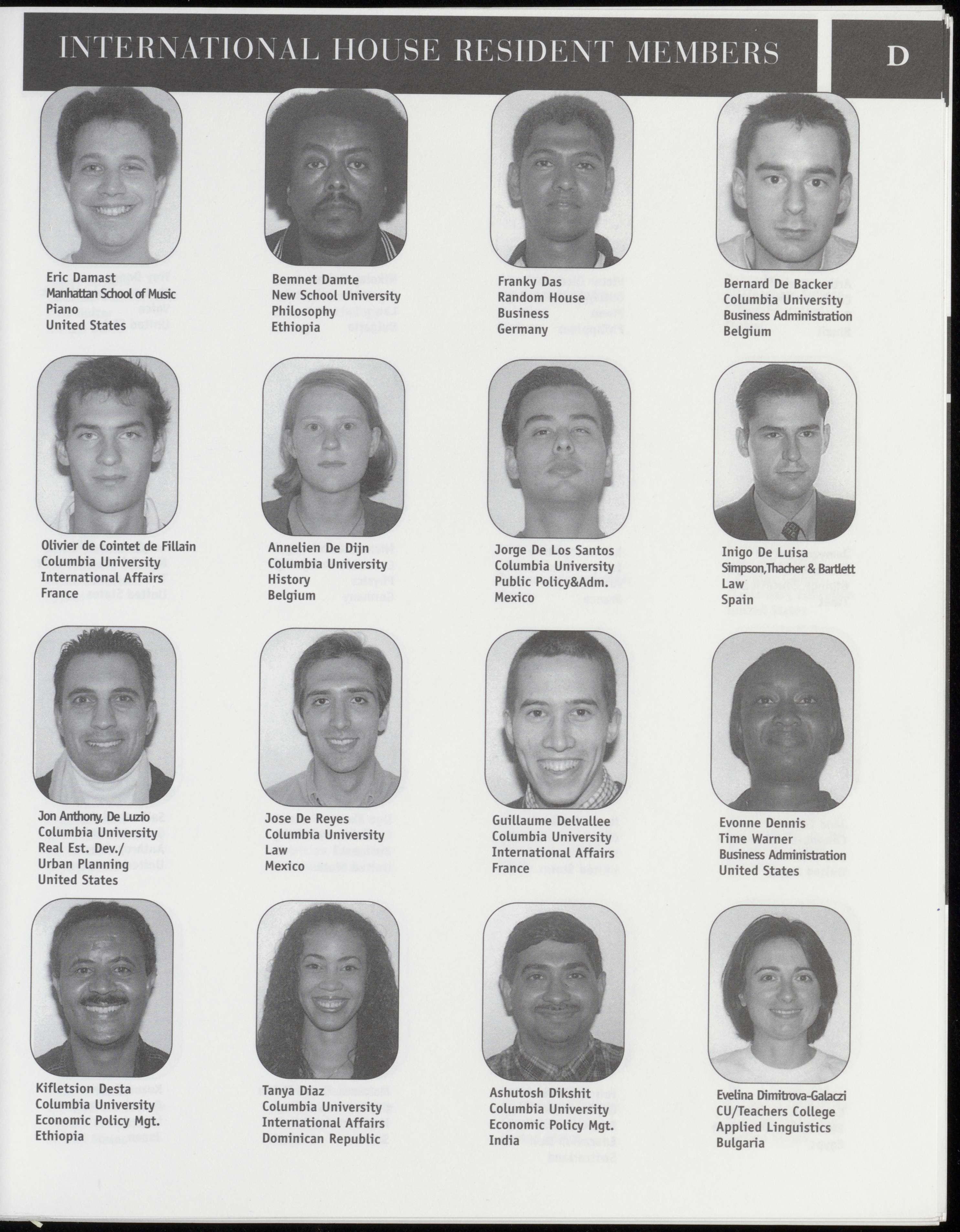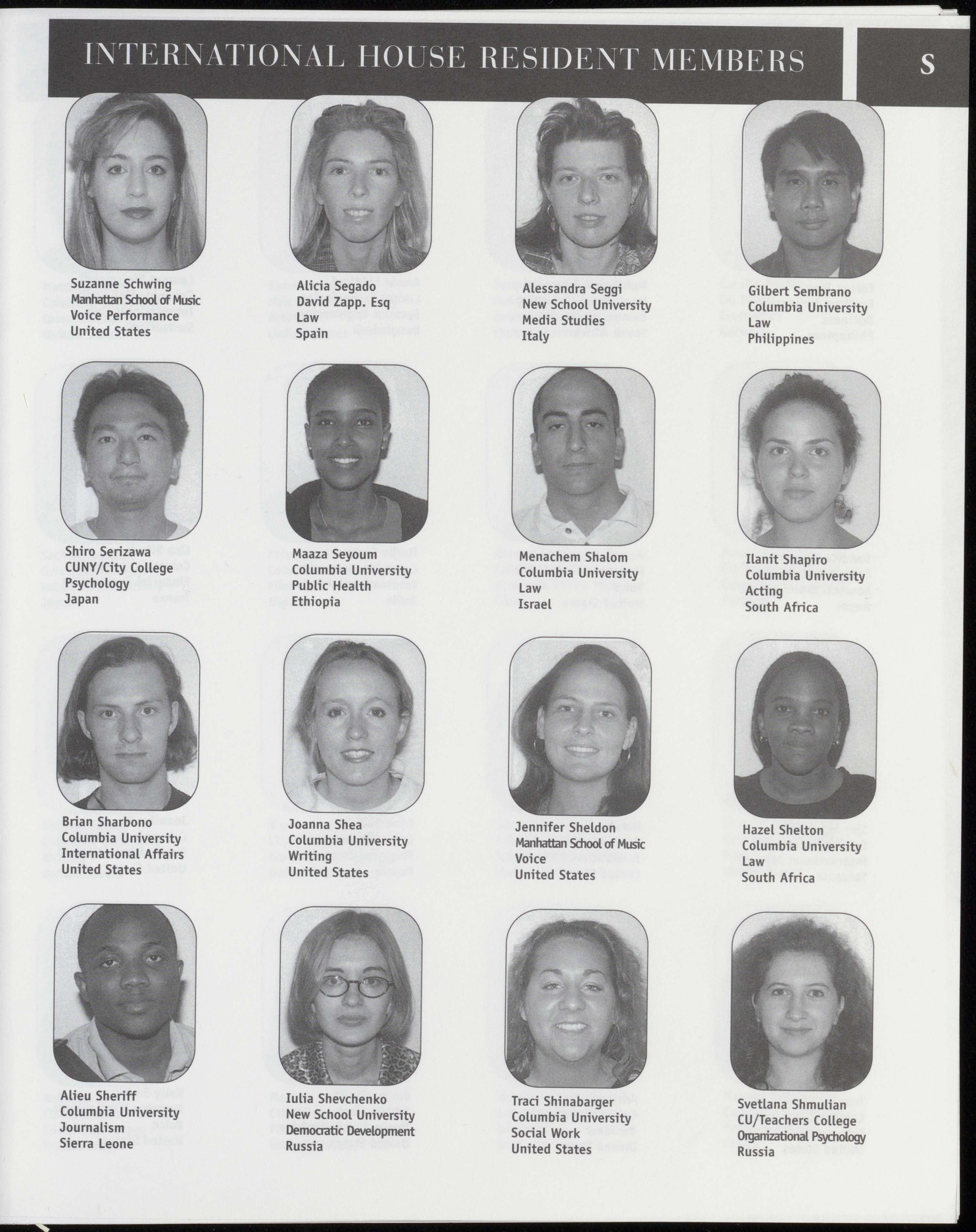 This Directory is not a “year book” nor, since it is published each fall, a reflection of a year gone by. Rather it anticipates a year to come and, significantly, your future lives as I. House alumni and world citizens. We hope that you will find it useful throughout your stay to help knit our community together, and that in the coming years as you peruse its pages you will remember with fondness your stay here, and be prompted to contact an old friend or acquaintance as well as support the House. Lifelong friendships are at the heart of the I. House experience, and this visual record—a “snap shot” of our community in 1999—forever preserves a time and a place in your lives.