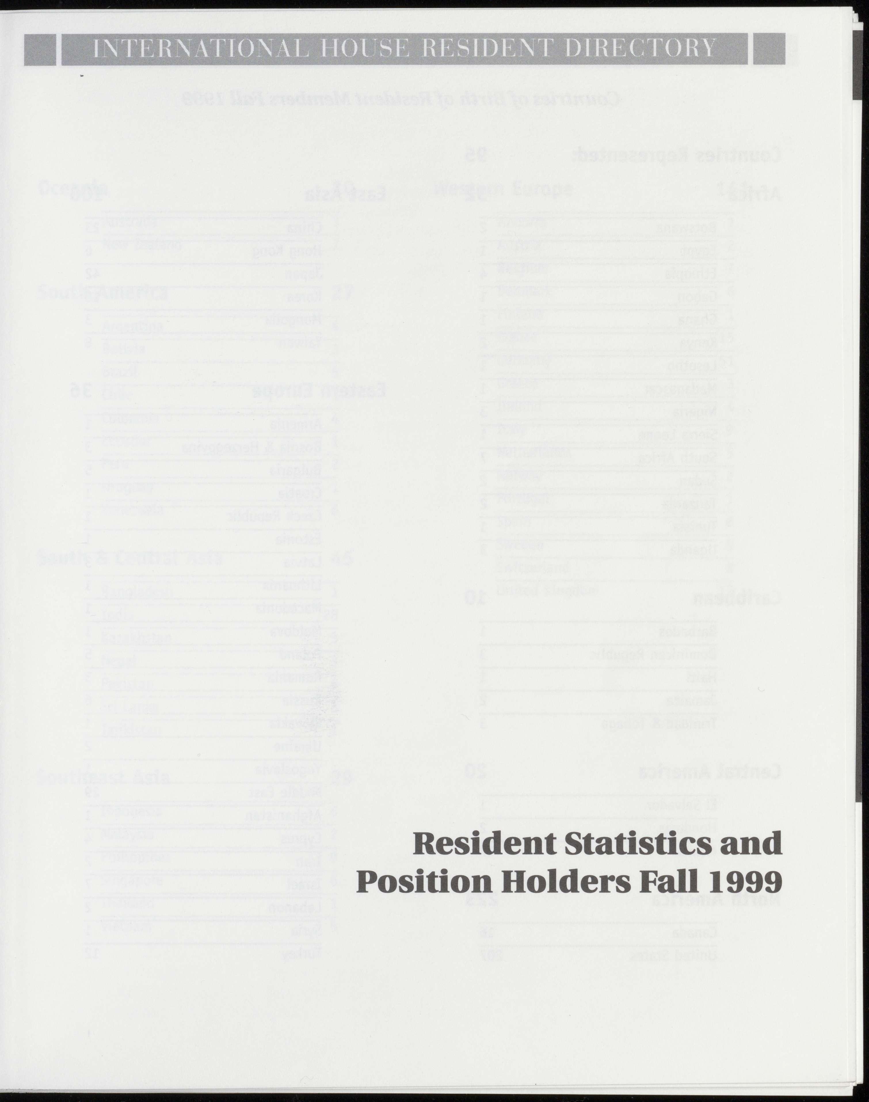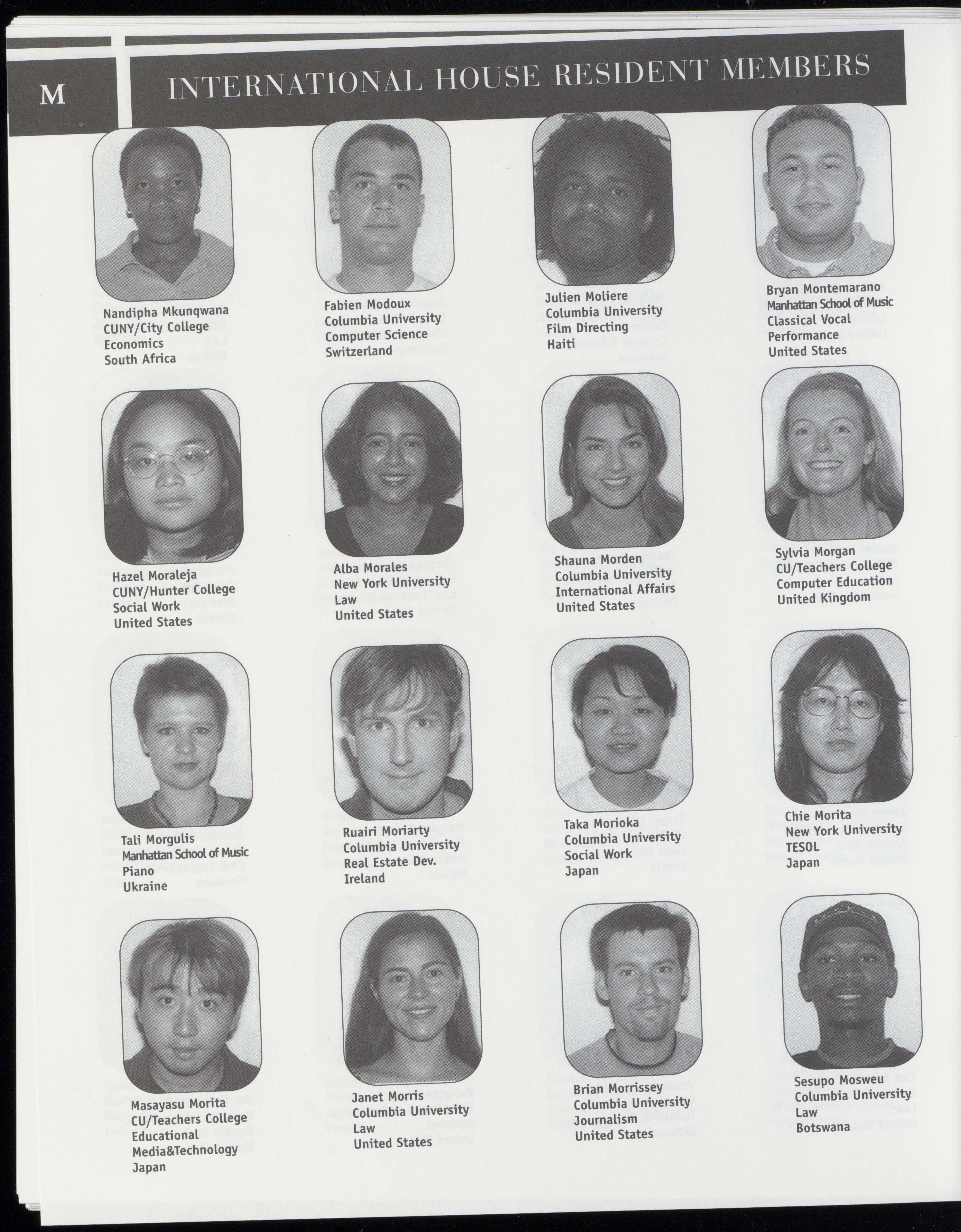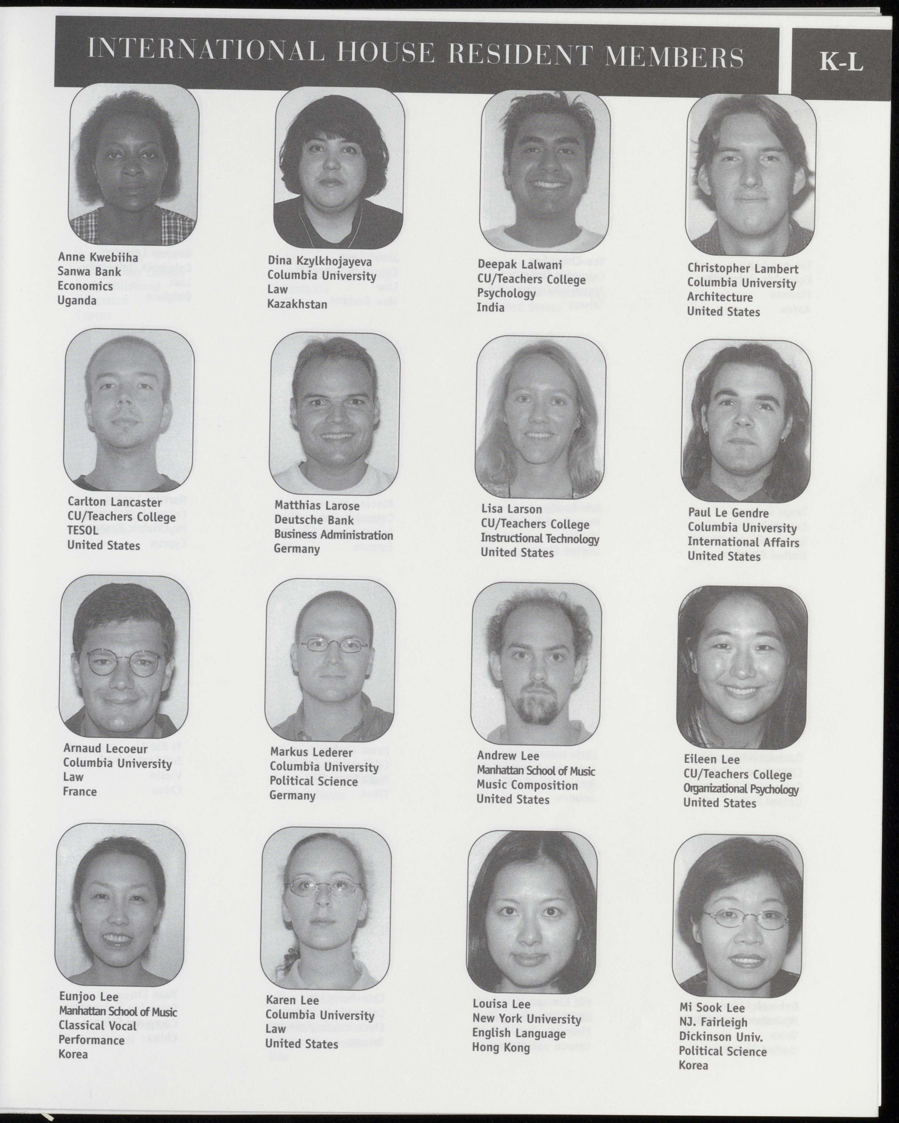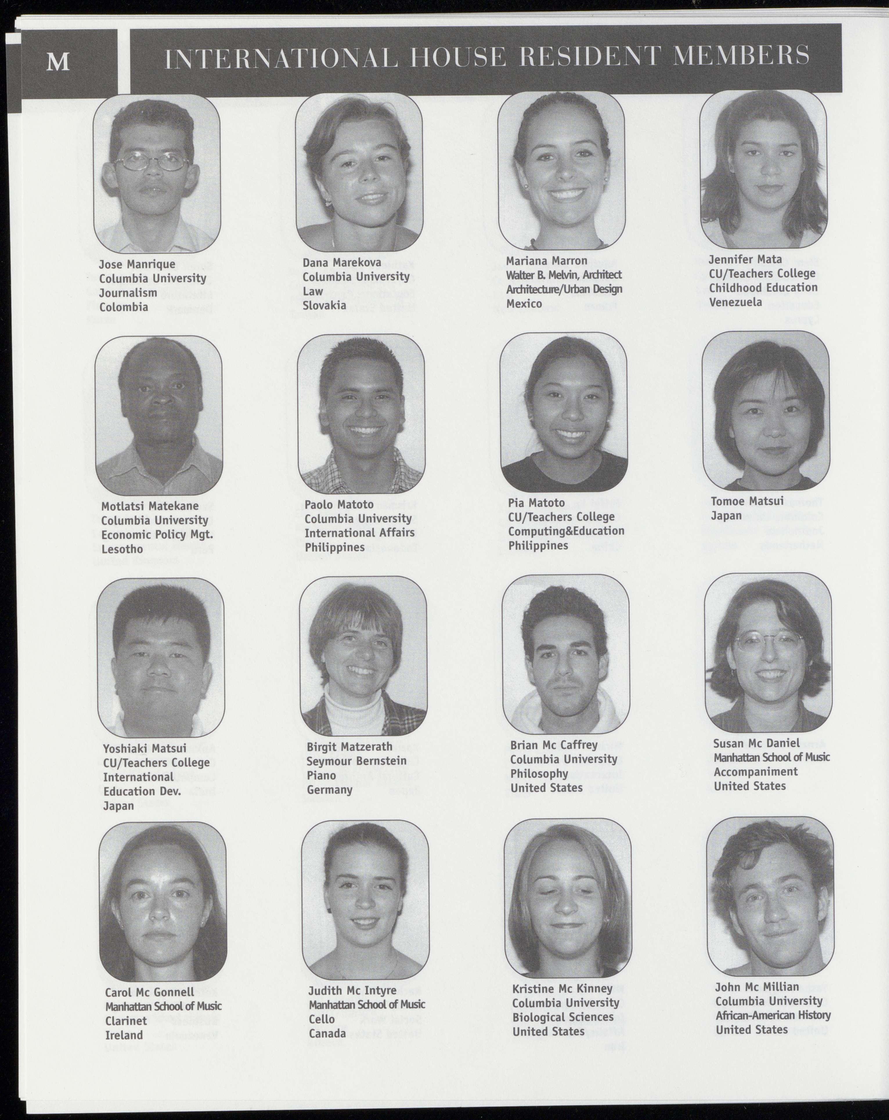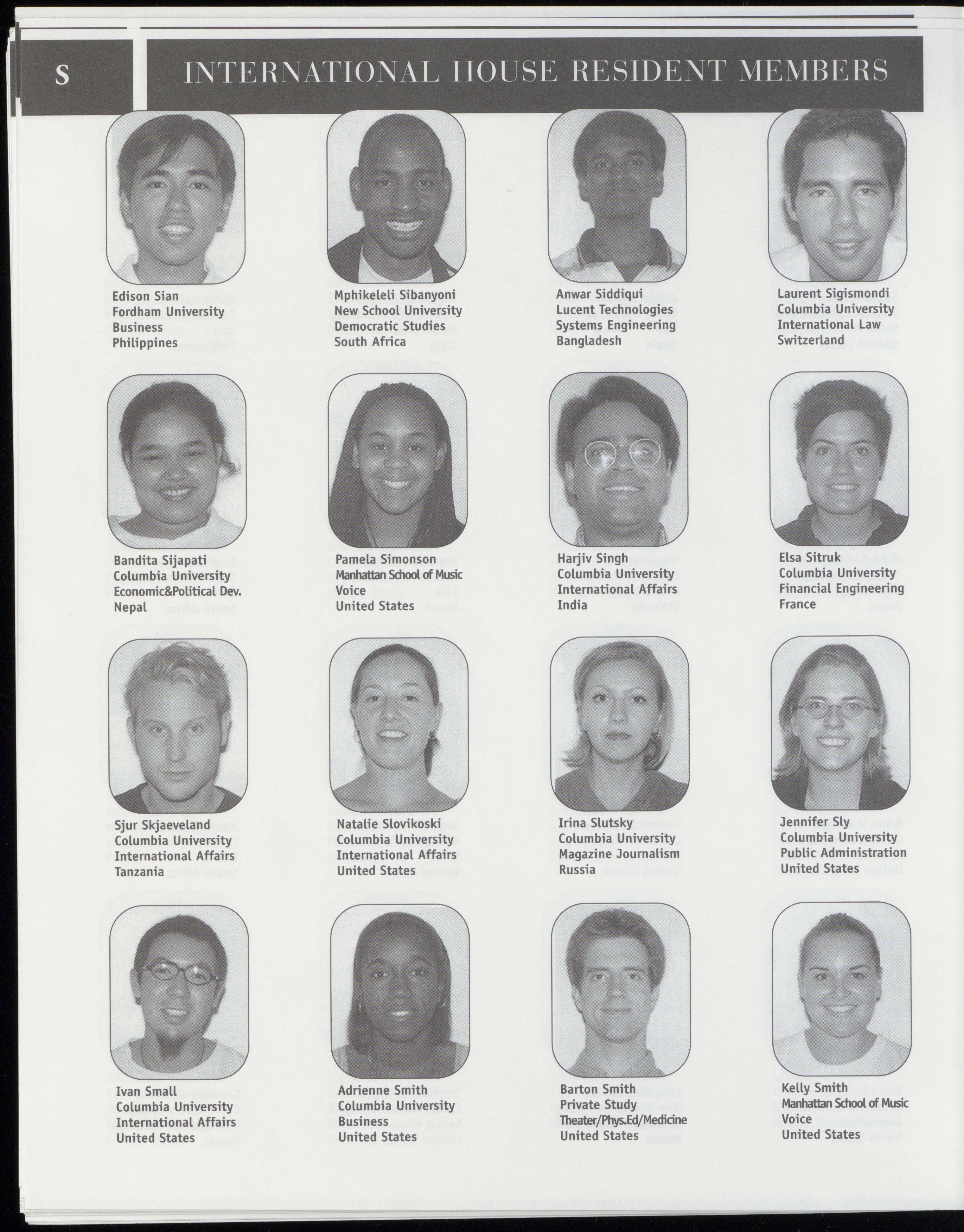 This Directory is not a “year book” nor, since it is published each fall, a reflection of a year gone by. Rather it anticipates a year to come and, significantly, your future lives as I. House alumni and world citizens. We hope that you will find it useful throughout your stay to help knit our community together, and that in the coming years as you peruse its pages you will remember with fondness your stay here, and be prompted to contact an old friend or acquaintance as well as support the House. Lifelong friendships are at the heart of the I. House experience, and this visual record—a “snap shot” of our community in 1999—forever preserves a time and a place in your lives.