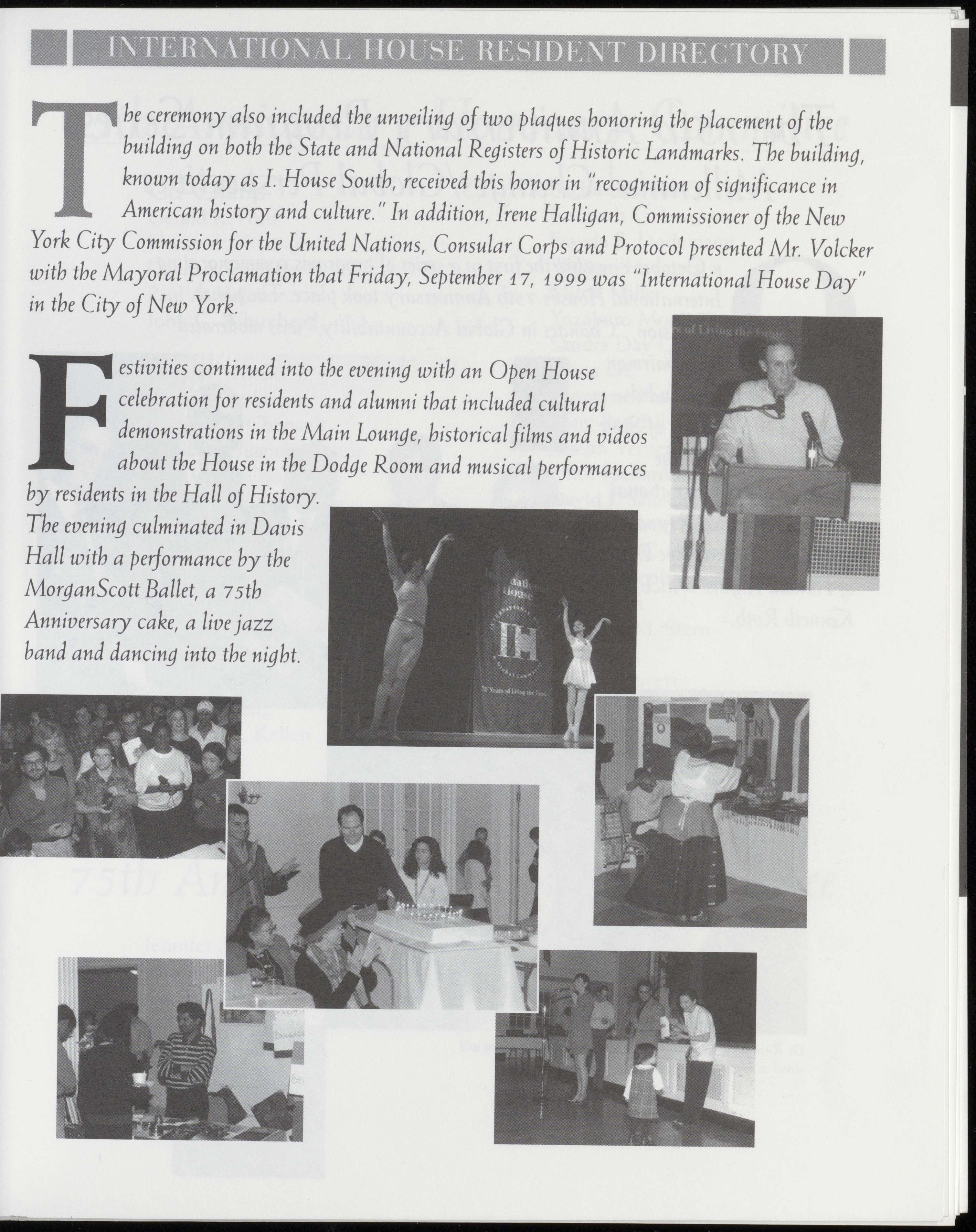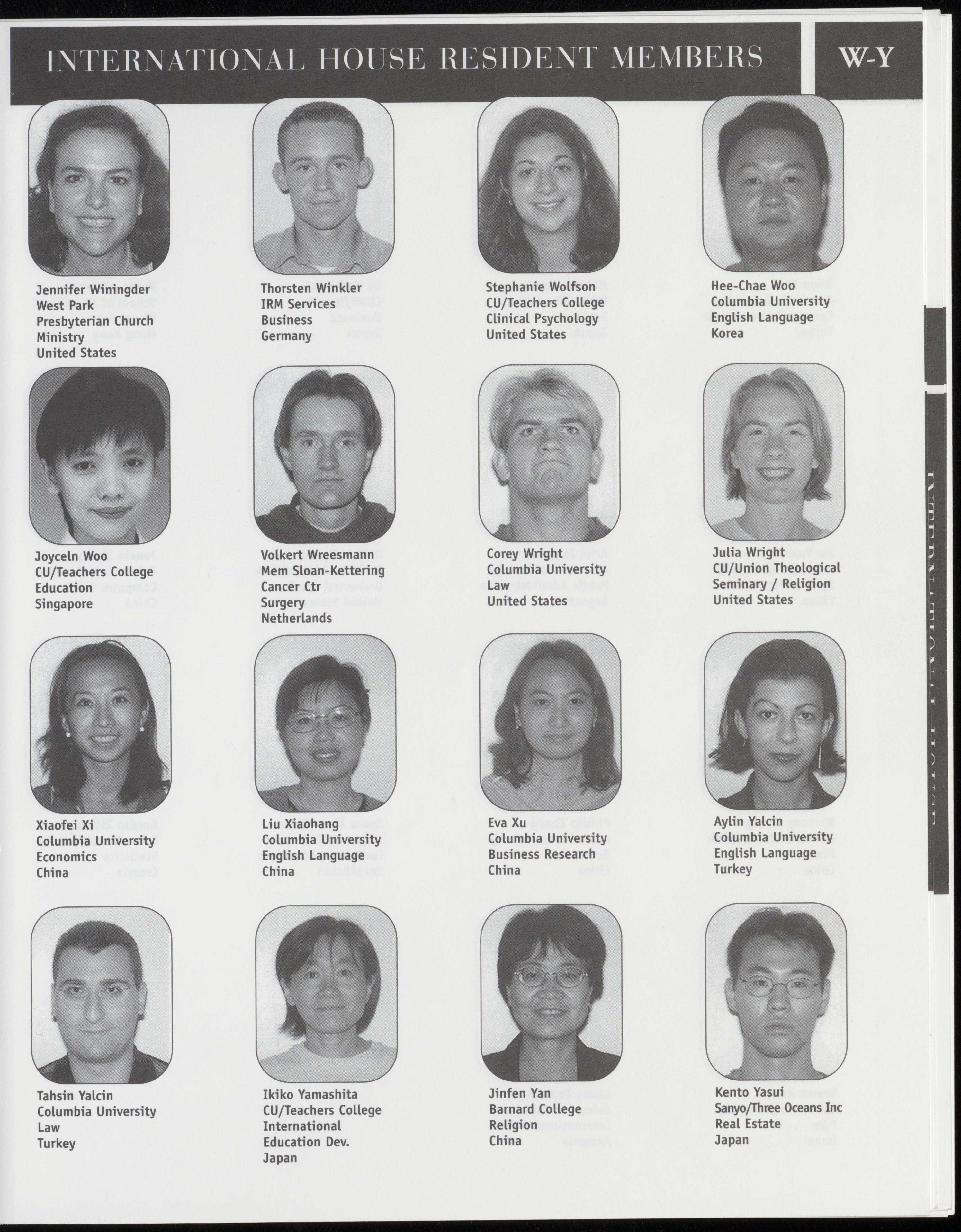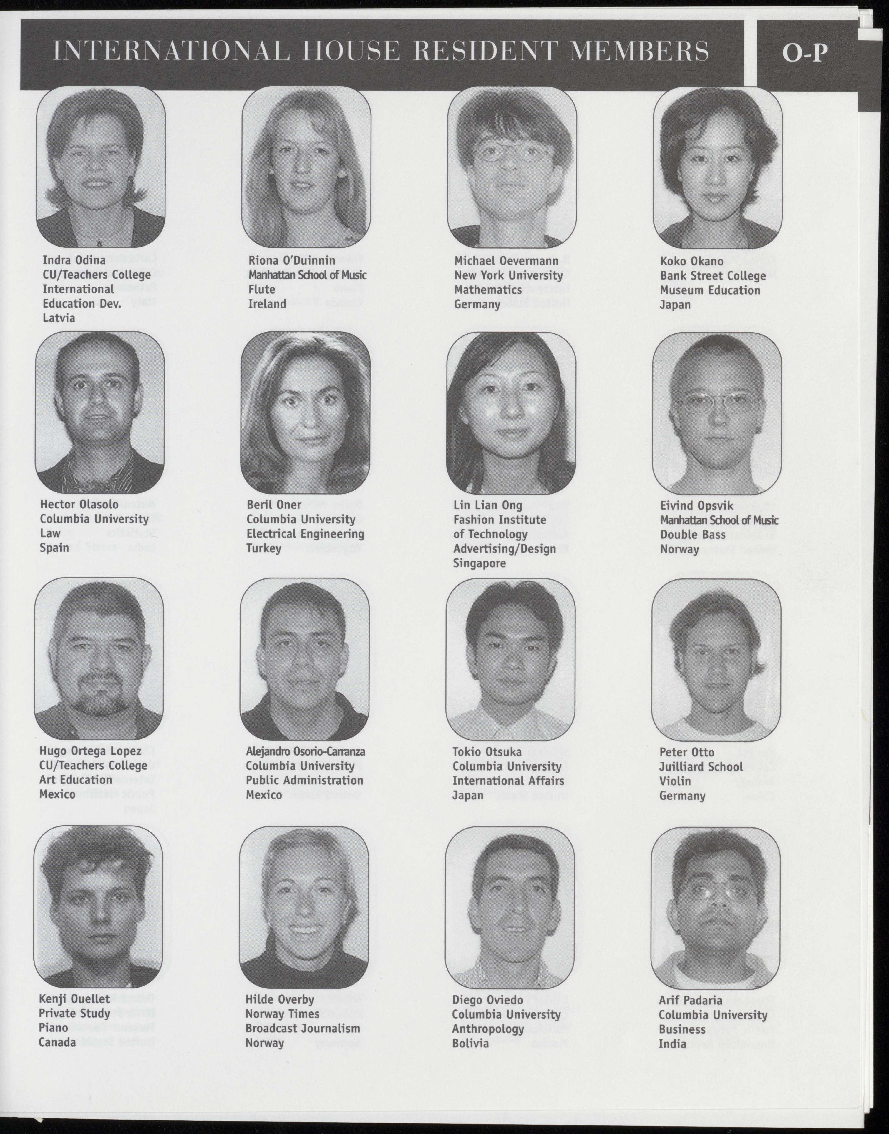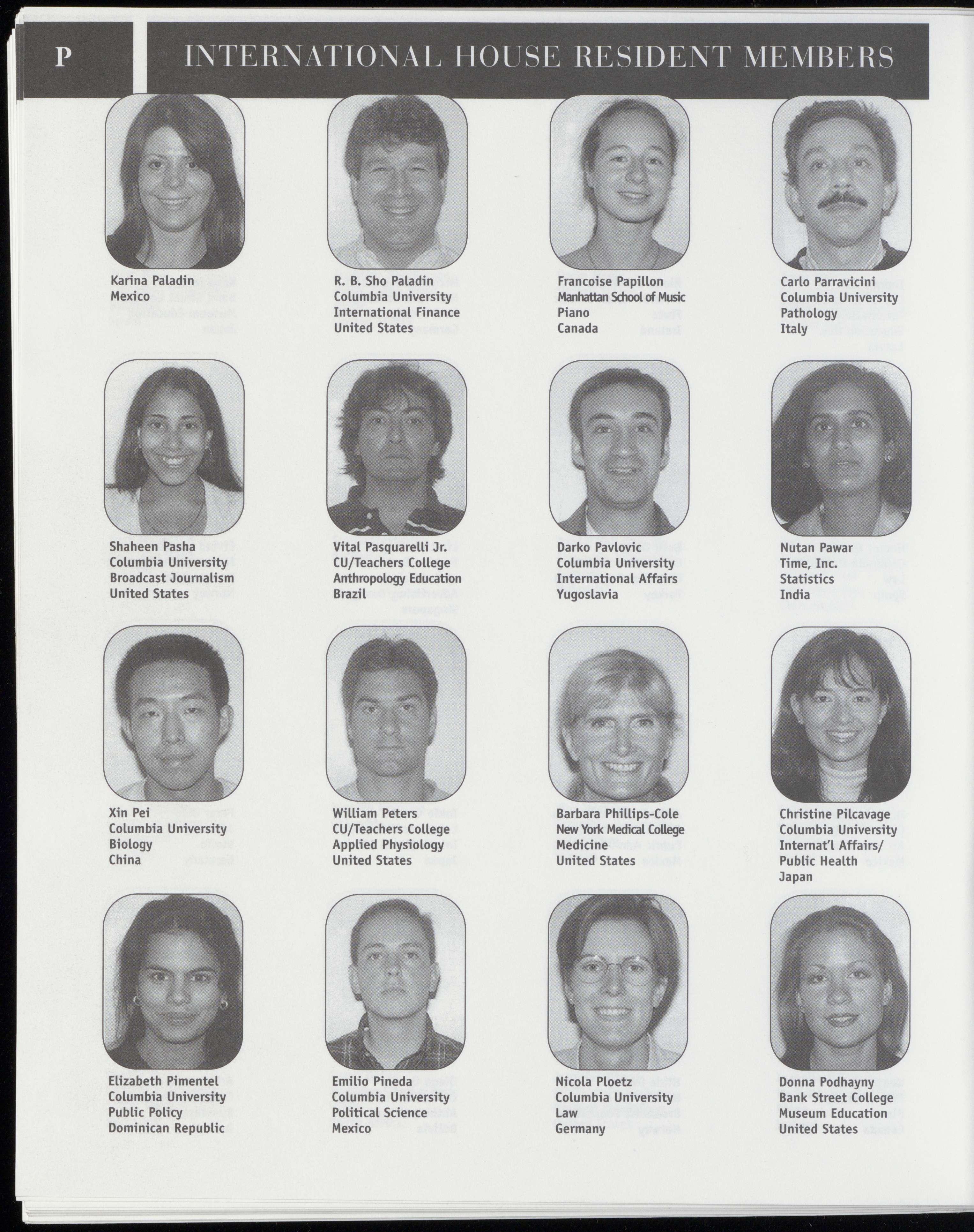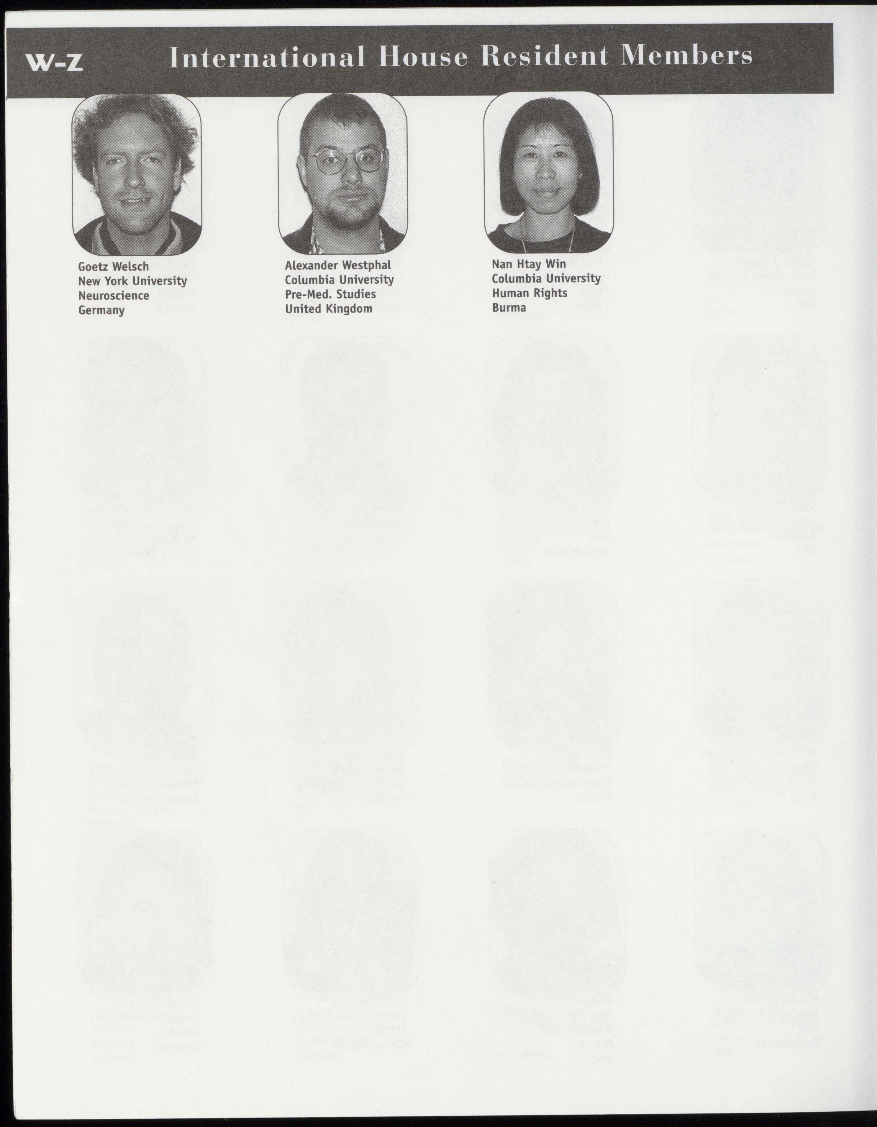 This Directory is not a “year book” nor, since it is published each fall, a reflection of a year gone by. Rather it anticipates a year to come and, significantly, your future lives as I. House alumni and world citizens. We hope that you will find it useful throughout your stay to help knit our community together, and that in the coming years as you peruse its pages you will remember with fondness your stay here, and be prompted to contact an old friend or acquaintance as well as support the House. Lifelong friendships are at the heart of the I. House experience, and this visual record—a “snap shot” of our community in 1999—forever preserves a time and a place in your lives.