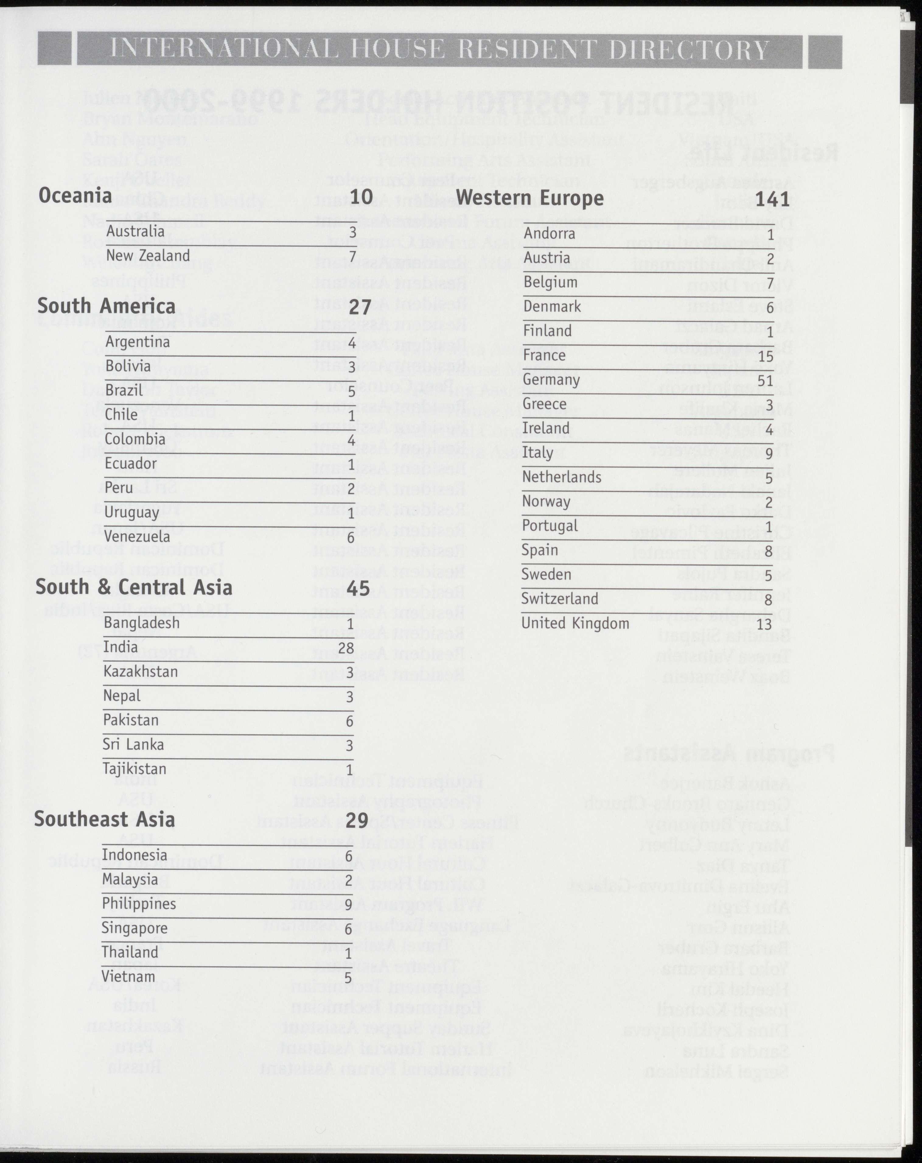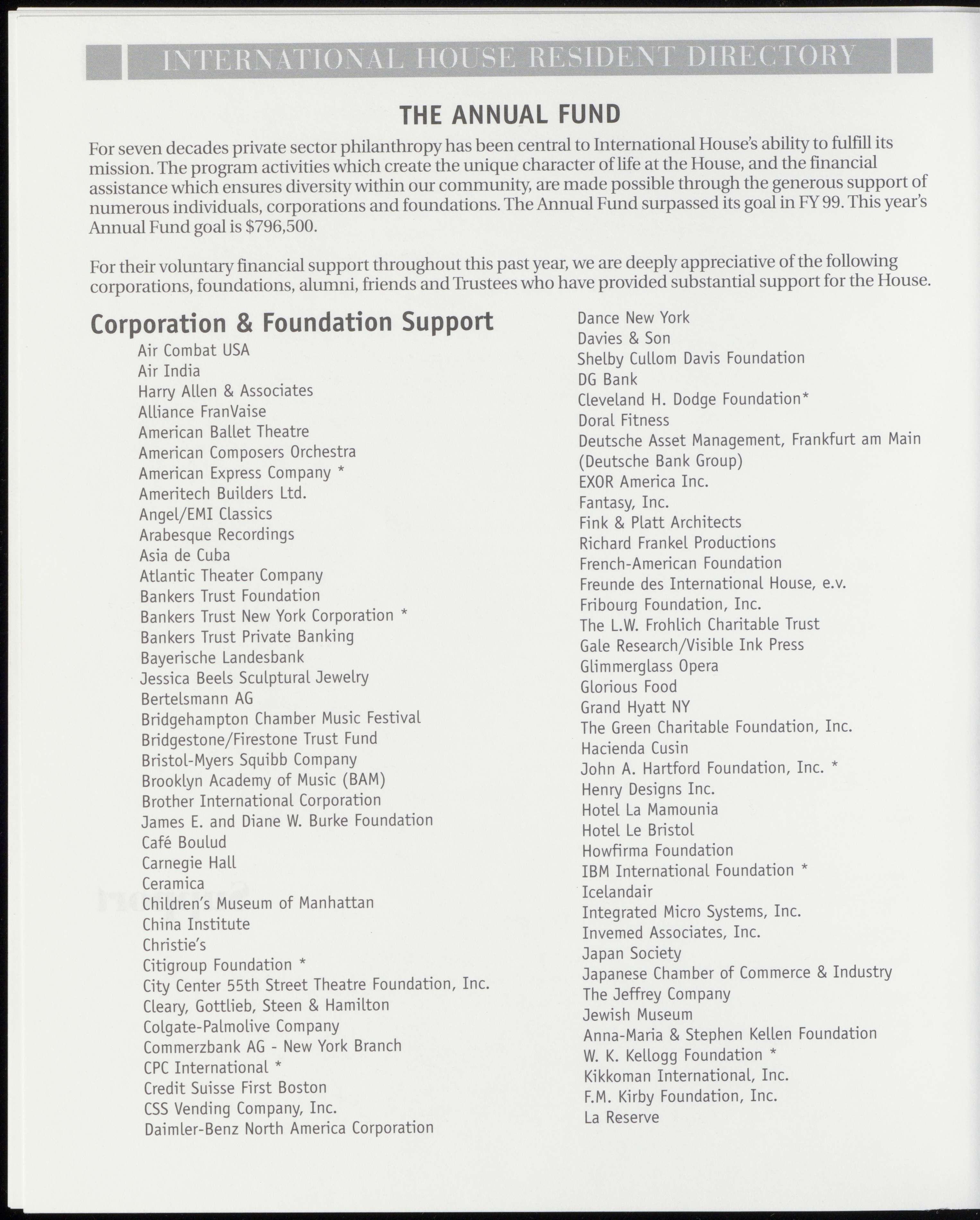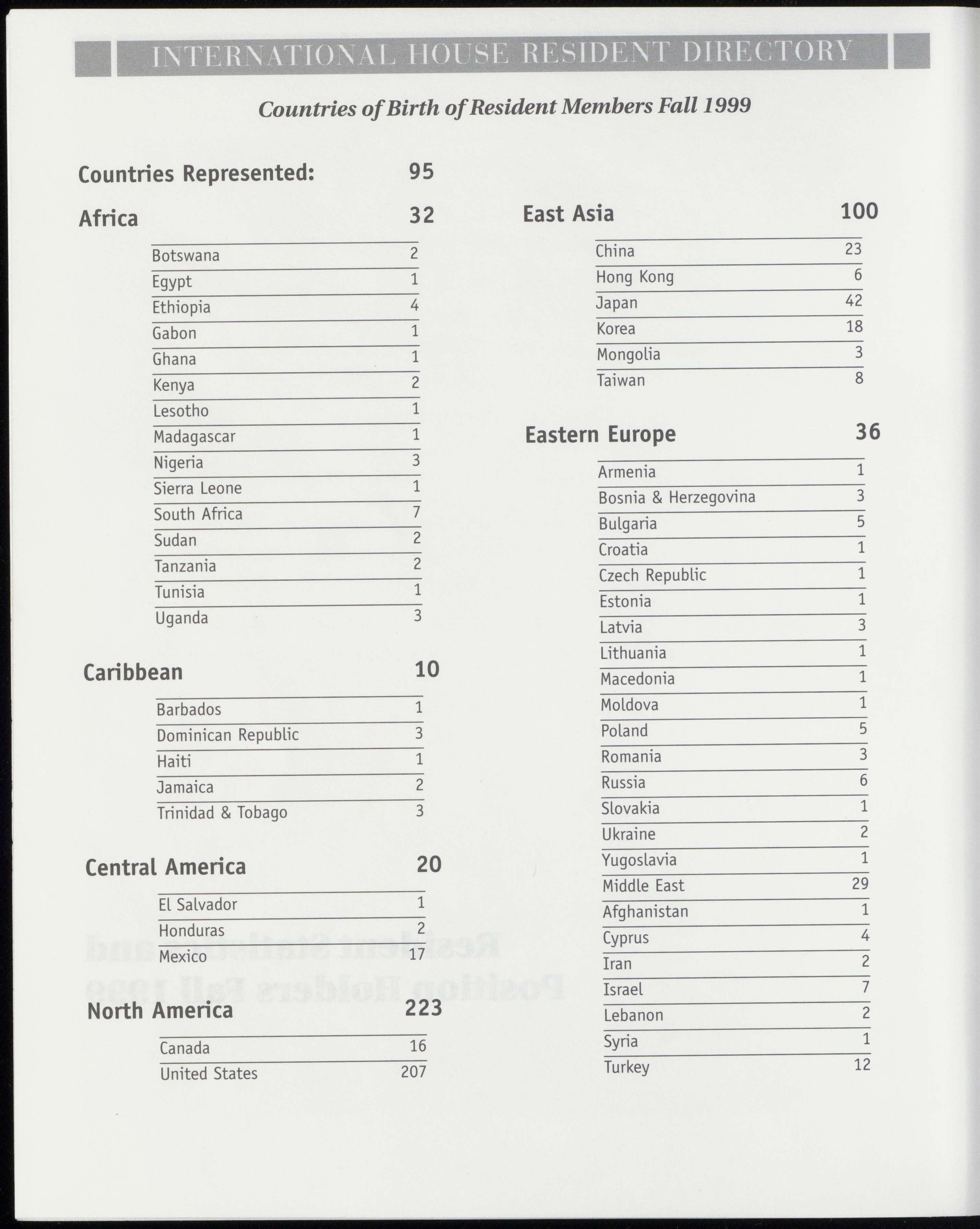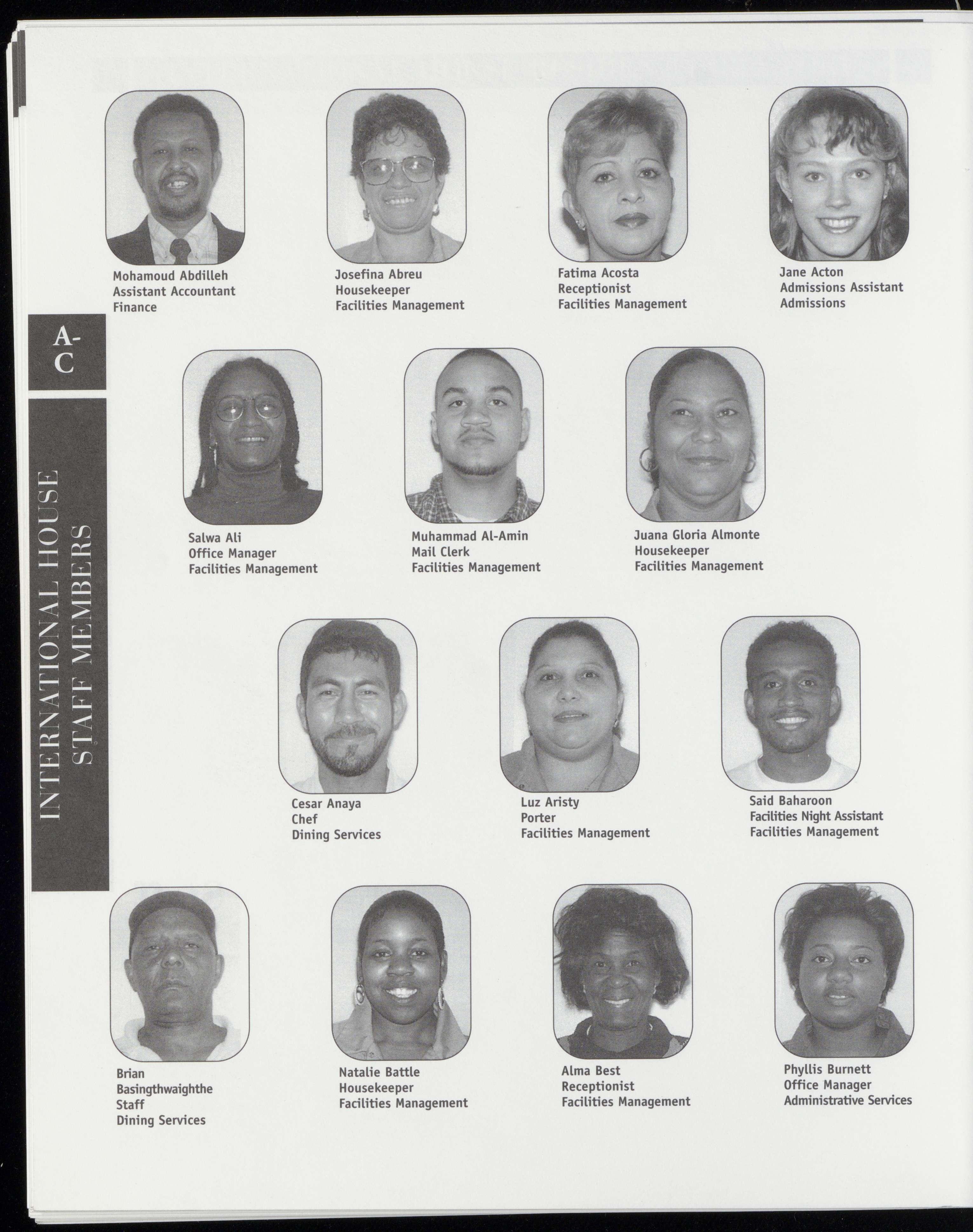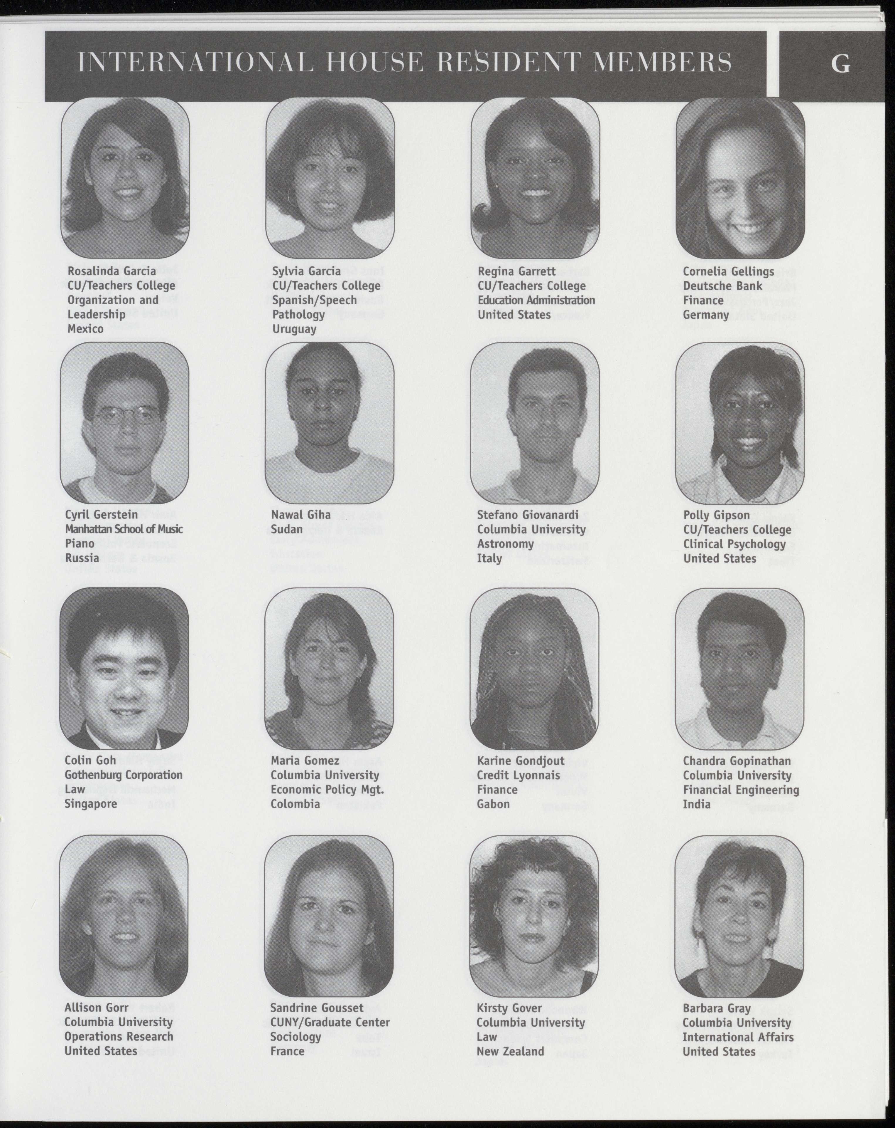 This Directory is not a “year book” nor, since it is published each fall, a reflection of a year gone by. Rather it anticipates a year to come and, significantly, your future lives as I. House alumni and world citizens. We hope that you will find it useful throughout your stay to help knit our community together, and that in the coming years as you peruse its pages you will remember with fondness your stay here, and be prompted to contact an old friend or acquaintance as well as support the House. Lifelong friendships are at the heart of the I. House experience, and this visual record—a “snap shot” of our community in 1999—forever preserves a time and a place in your lives.