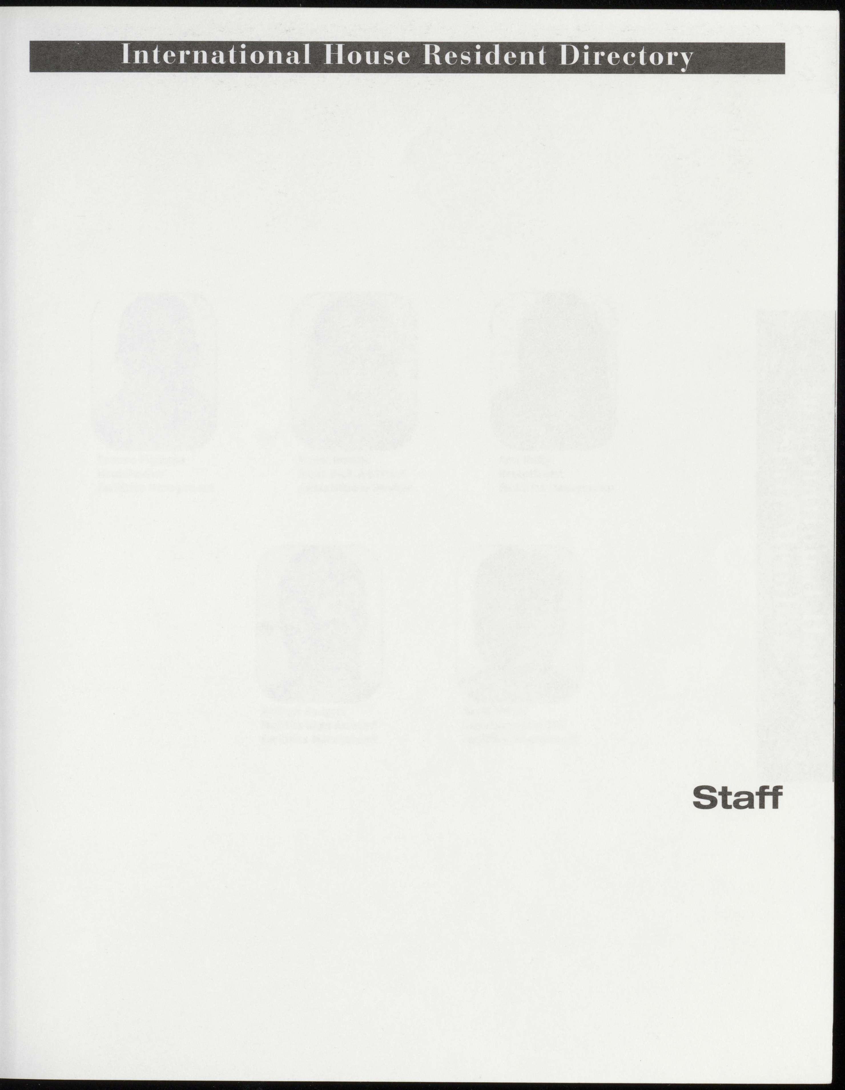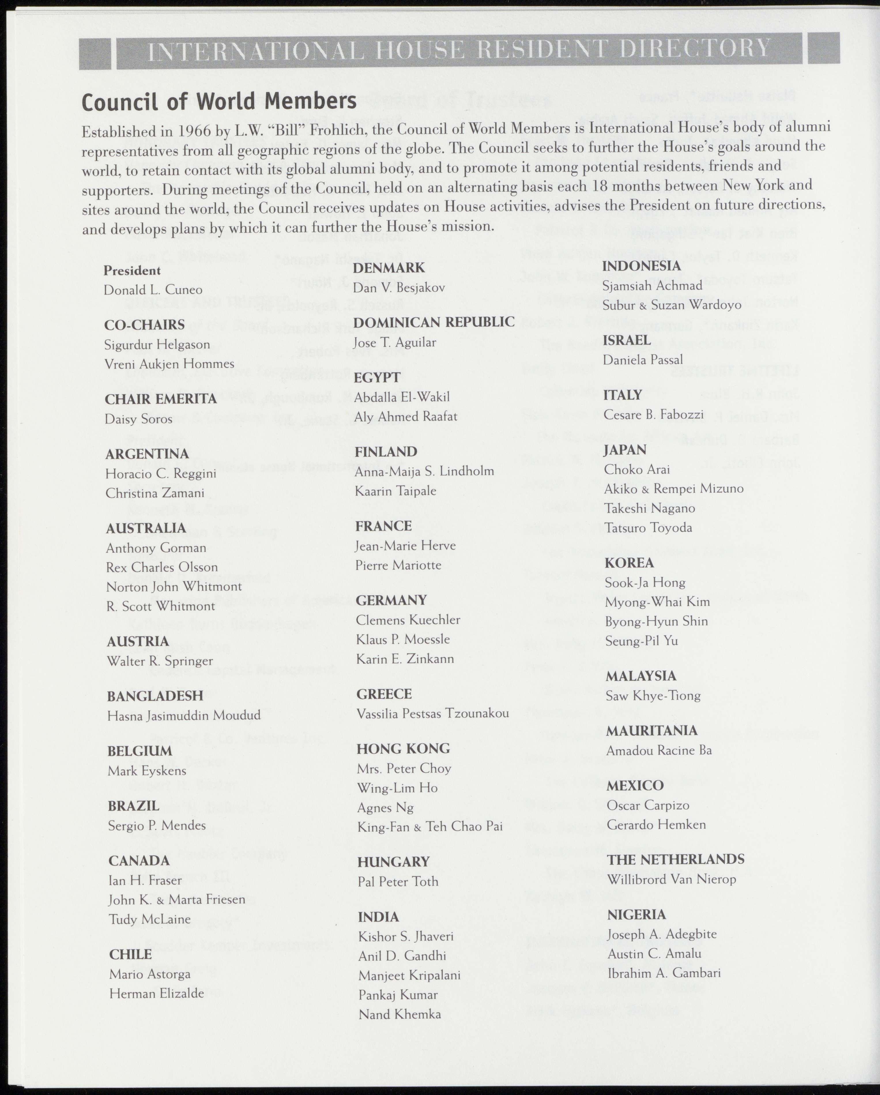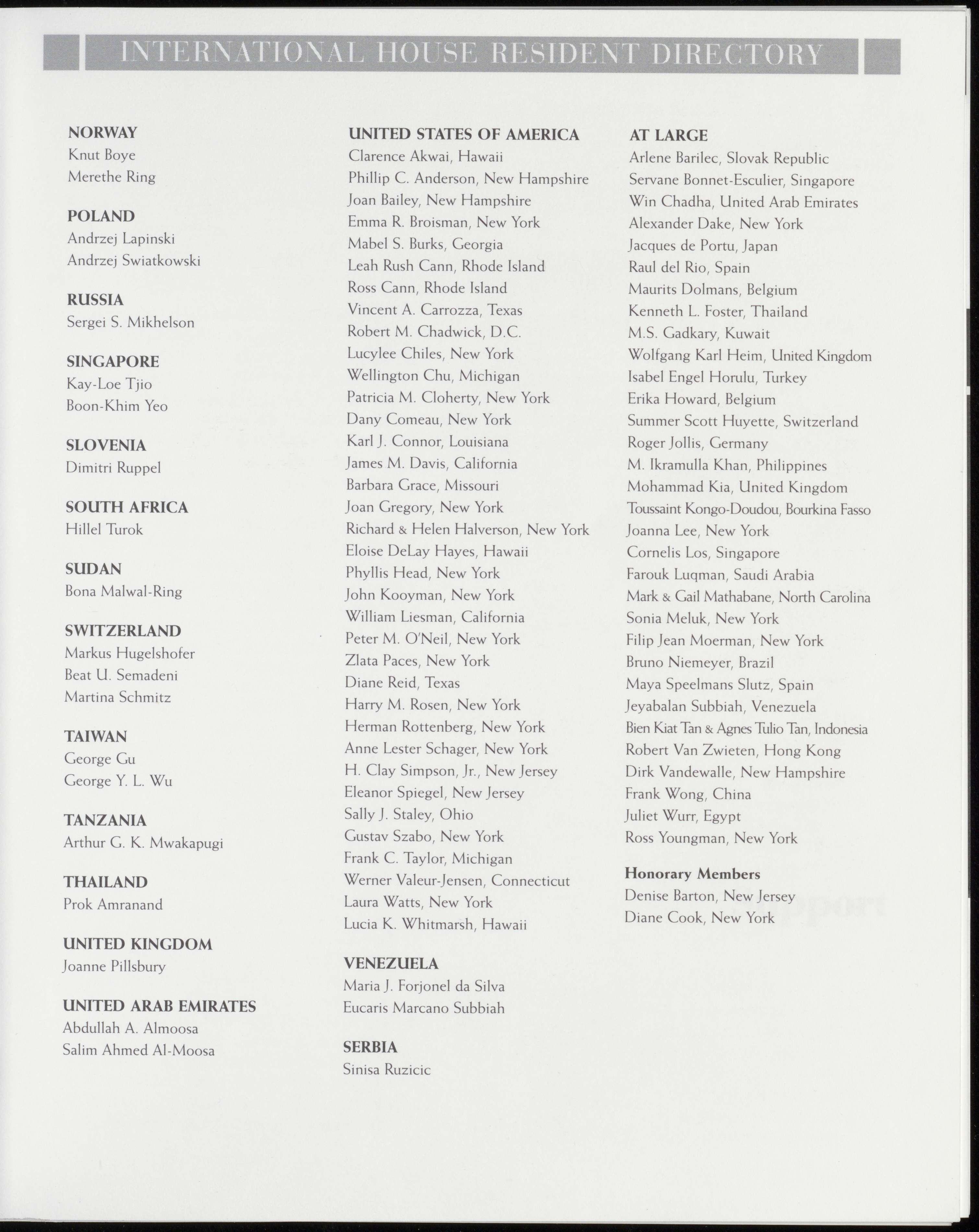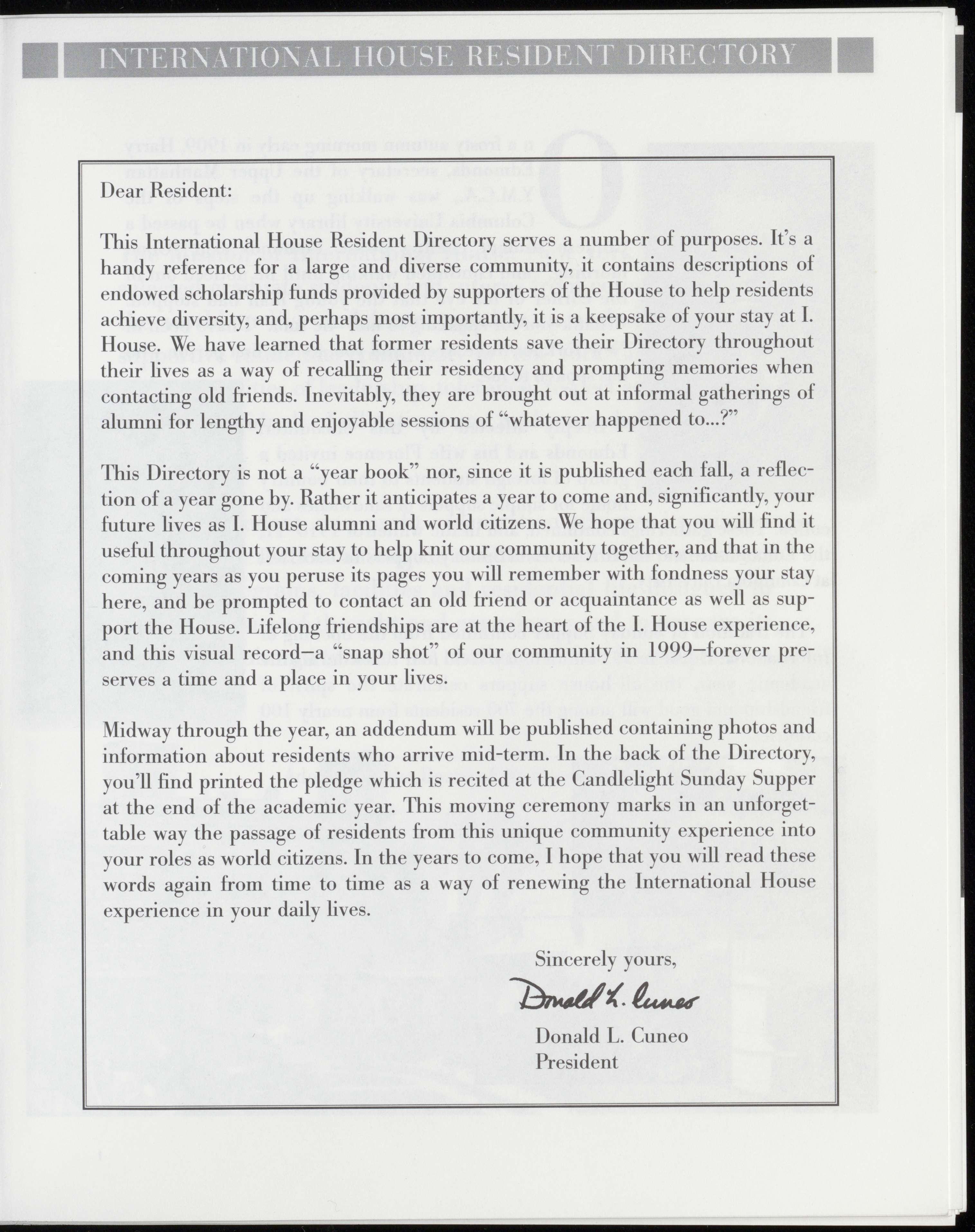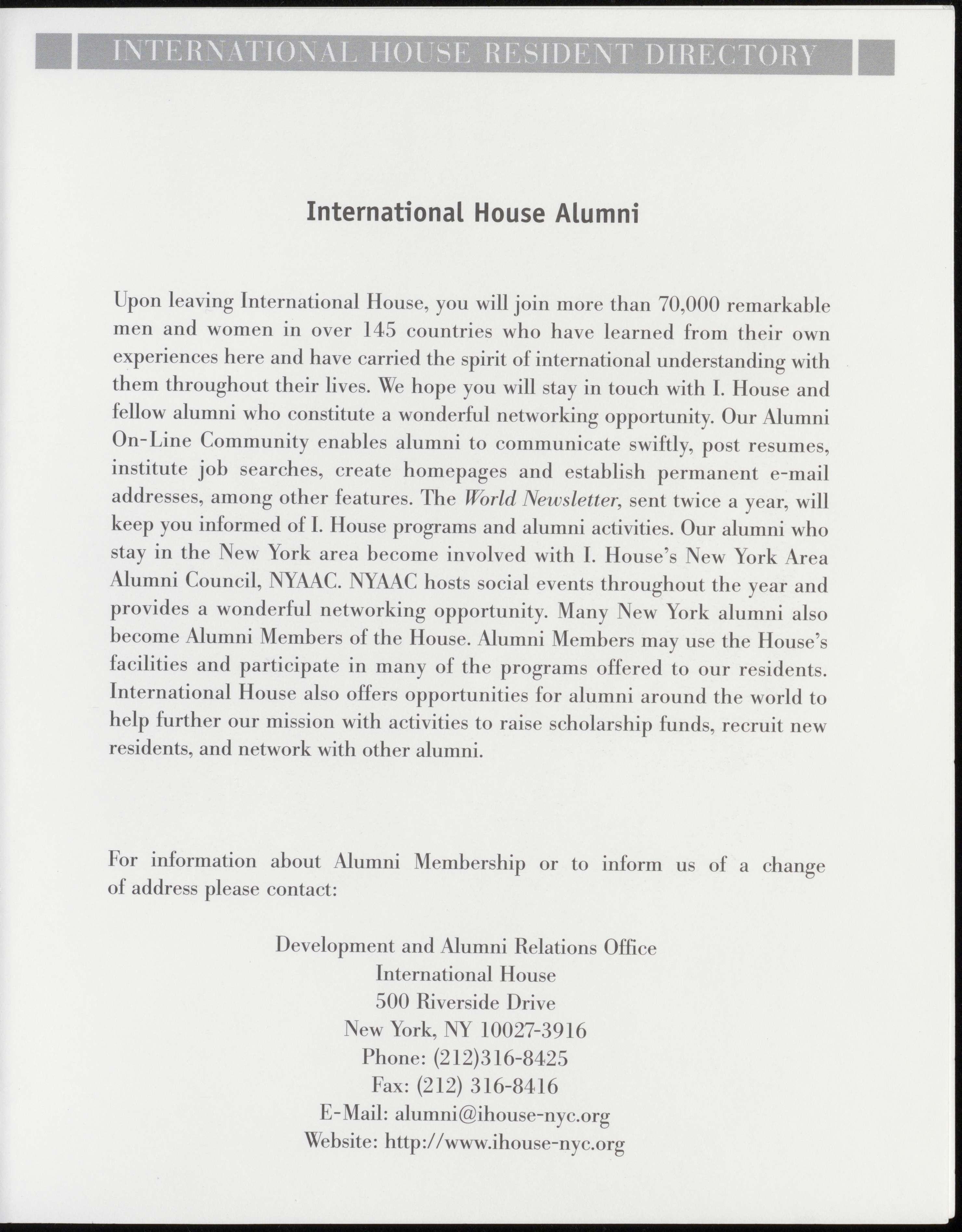 This International House Resident Directory serves a number of purposes. It’s a handy reference for a large and diverse community, it contains descriptions of endowed scholarship funds provided by supporters of the House to help residents achieve diversity, and, perhaps most importantly, it is a keepsake of your stay at I. House. We have learned that former residents save their Directory throughout their lives as a way of recalling their residency and prompting memories when contacting old friends. Inevitably, they are brought out at informal gatherings of alumni for lengthy and enjoyable sessions of “whatever happened to...?”