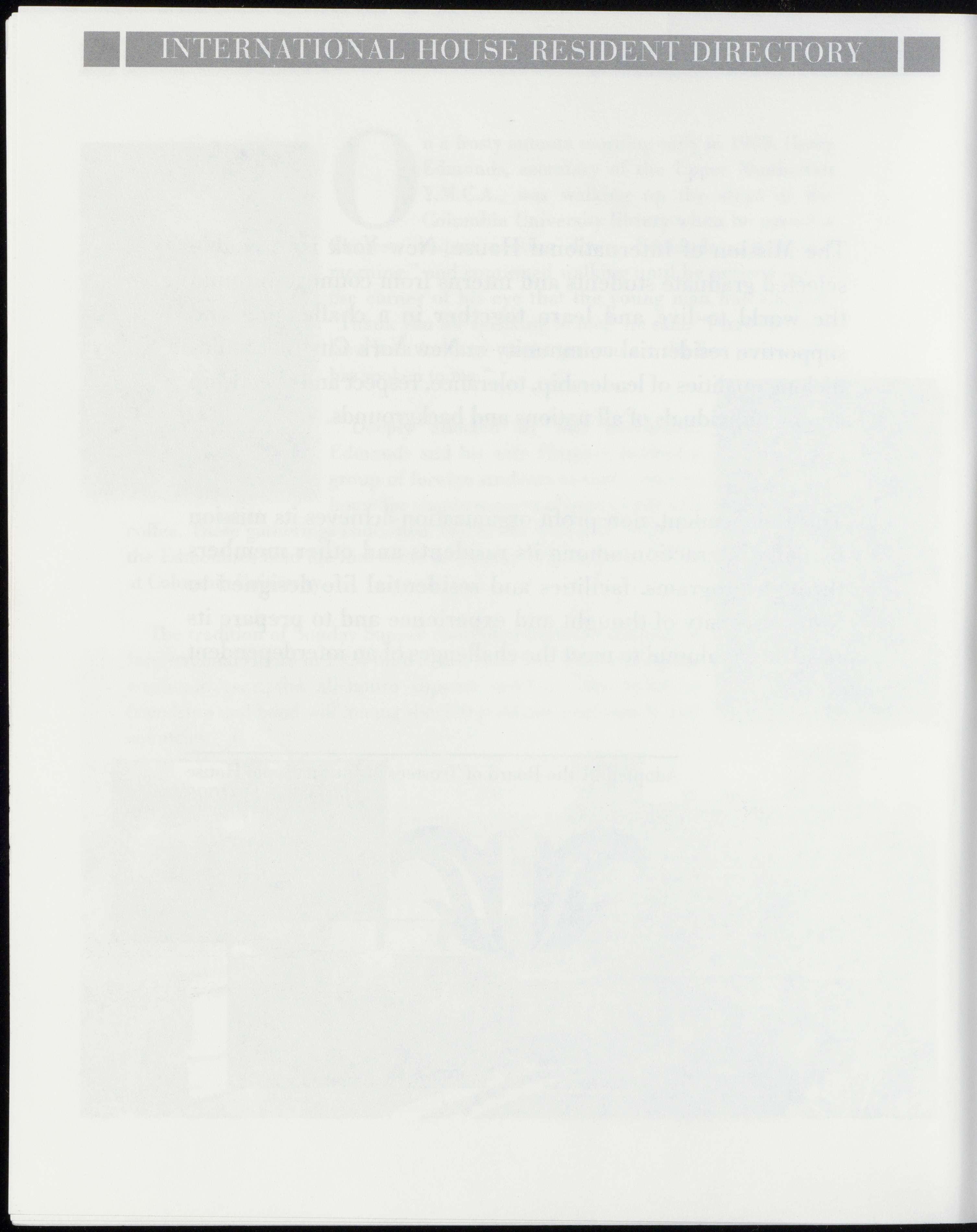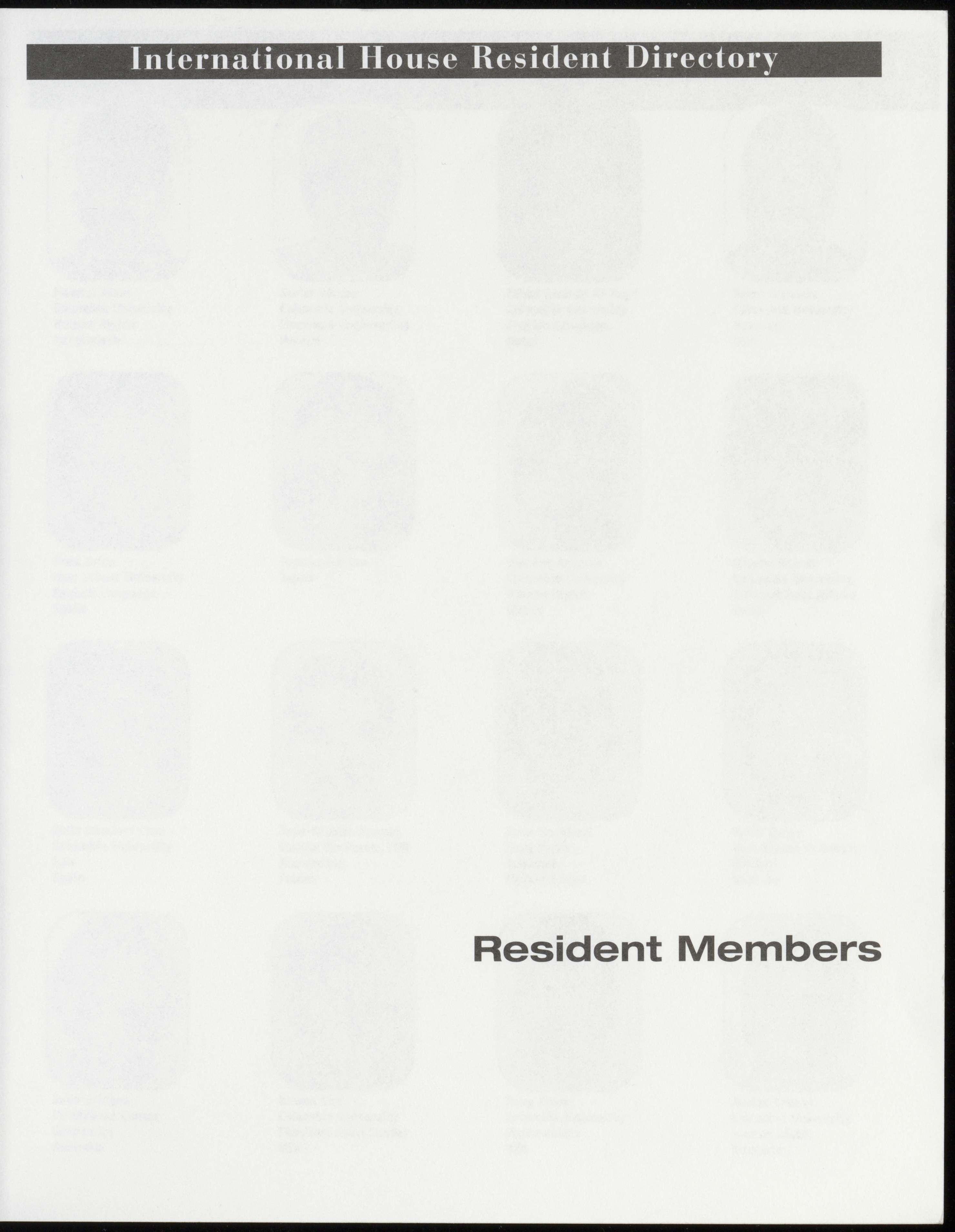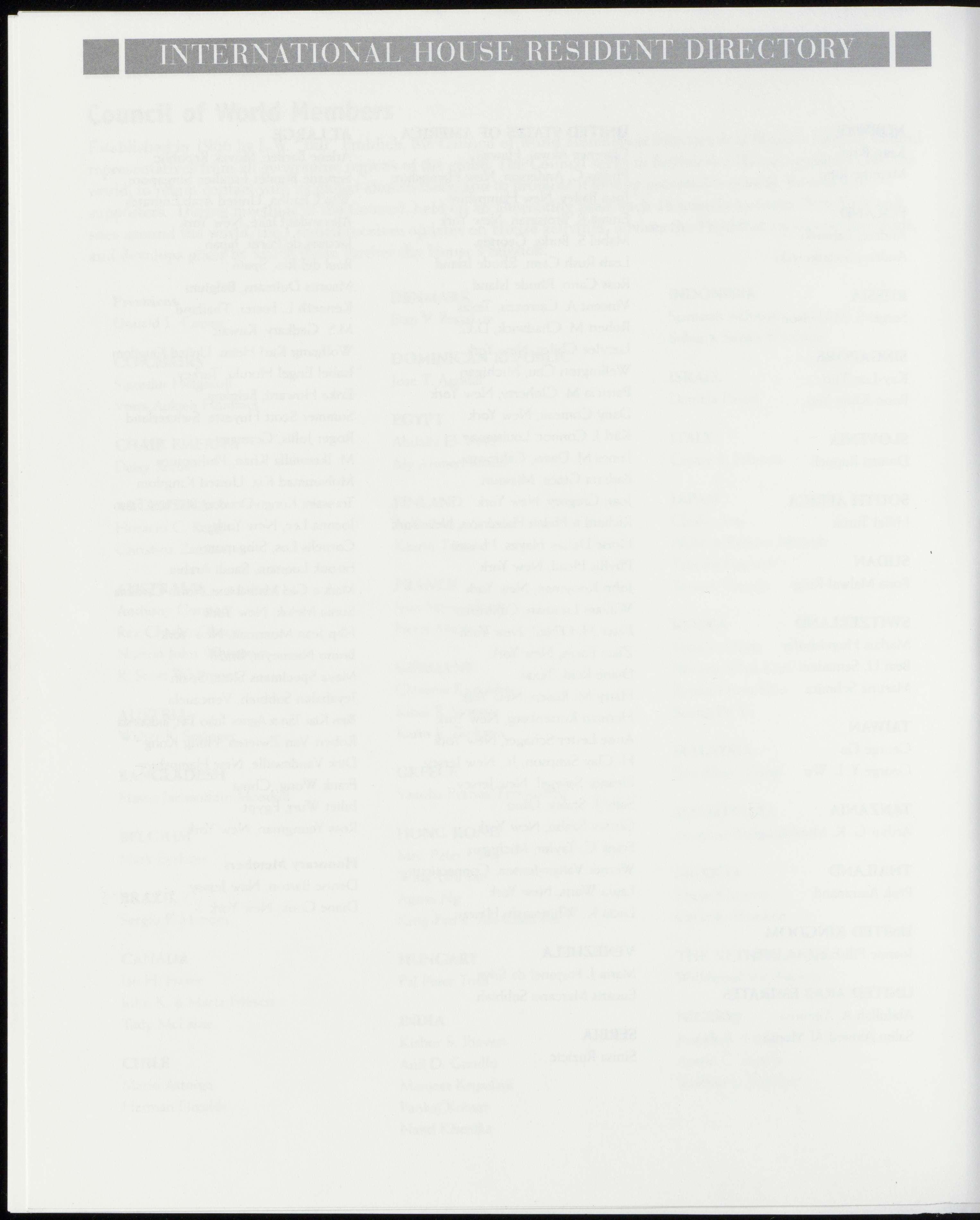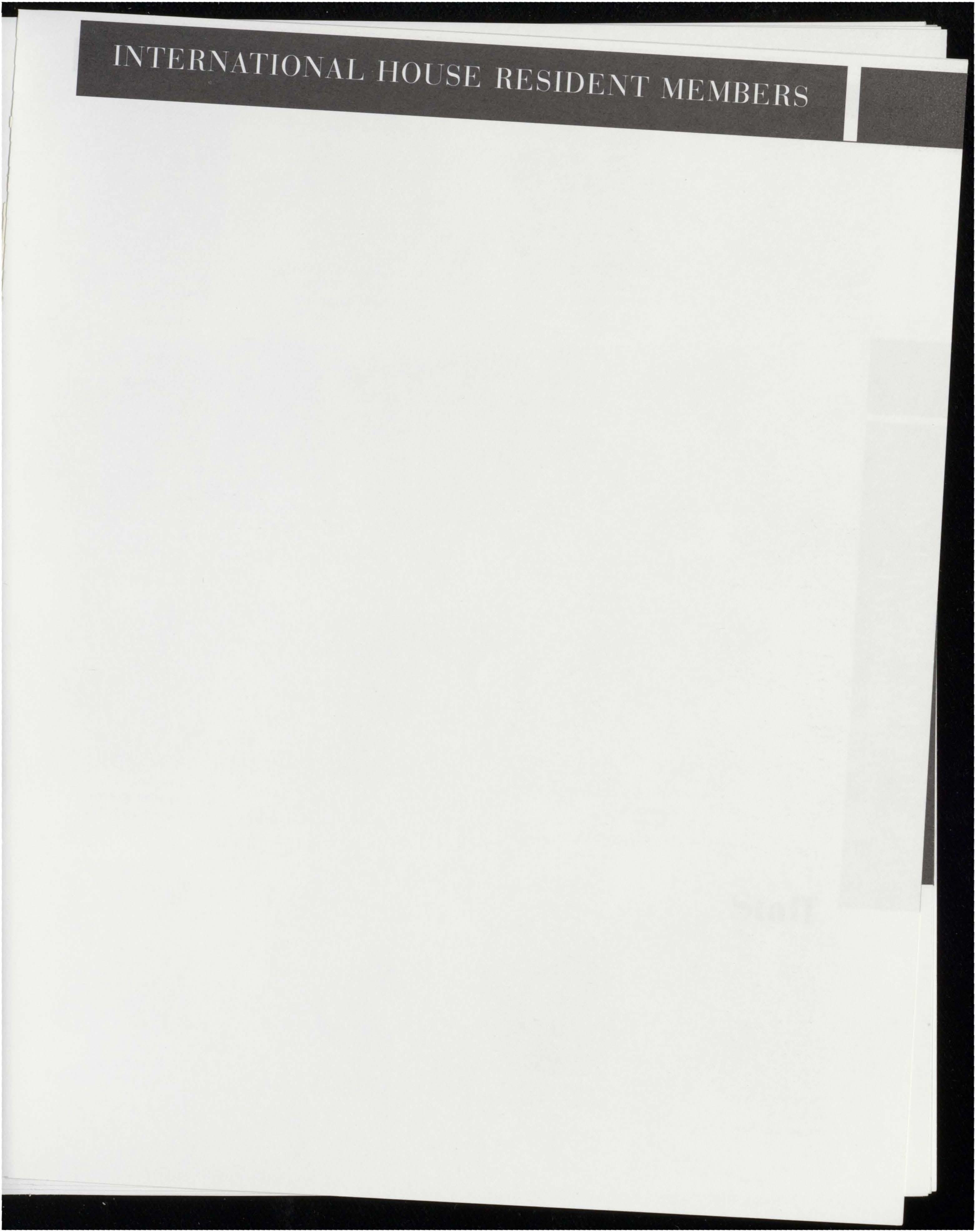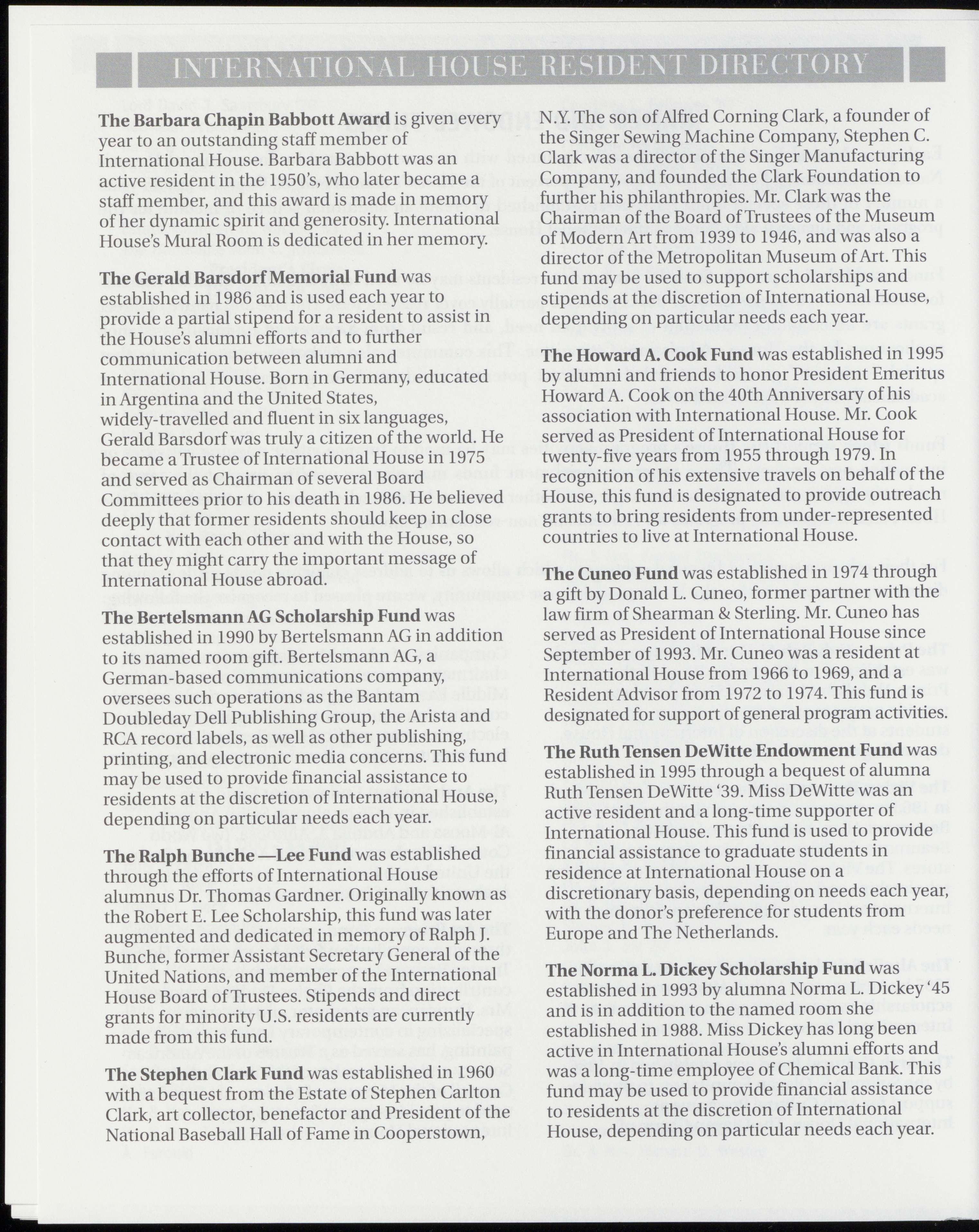 This International House Resident Directory serves a number of purposes. It’s a handy reference for a large and diverse community, it contains descriptions of endowed scholarship funds provided by supporters of the House to help residents achieve diversity, and, perhaps most importantly, it is a keepsake of your stay at I. House. We have learned that former residents save their Directory throughout their lives as a way of recalling their residency and prompting memories when contacting old friends. Inevitably, they are brought out at informal gatherings of alumni for lengthy and enjoyable sessions of “whatever happened to...?”