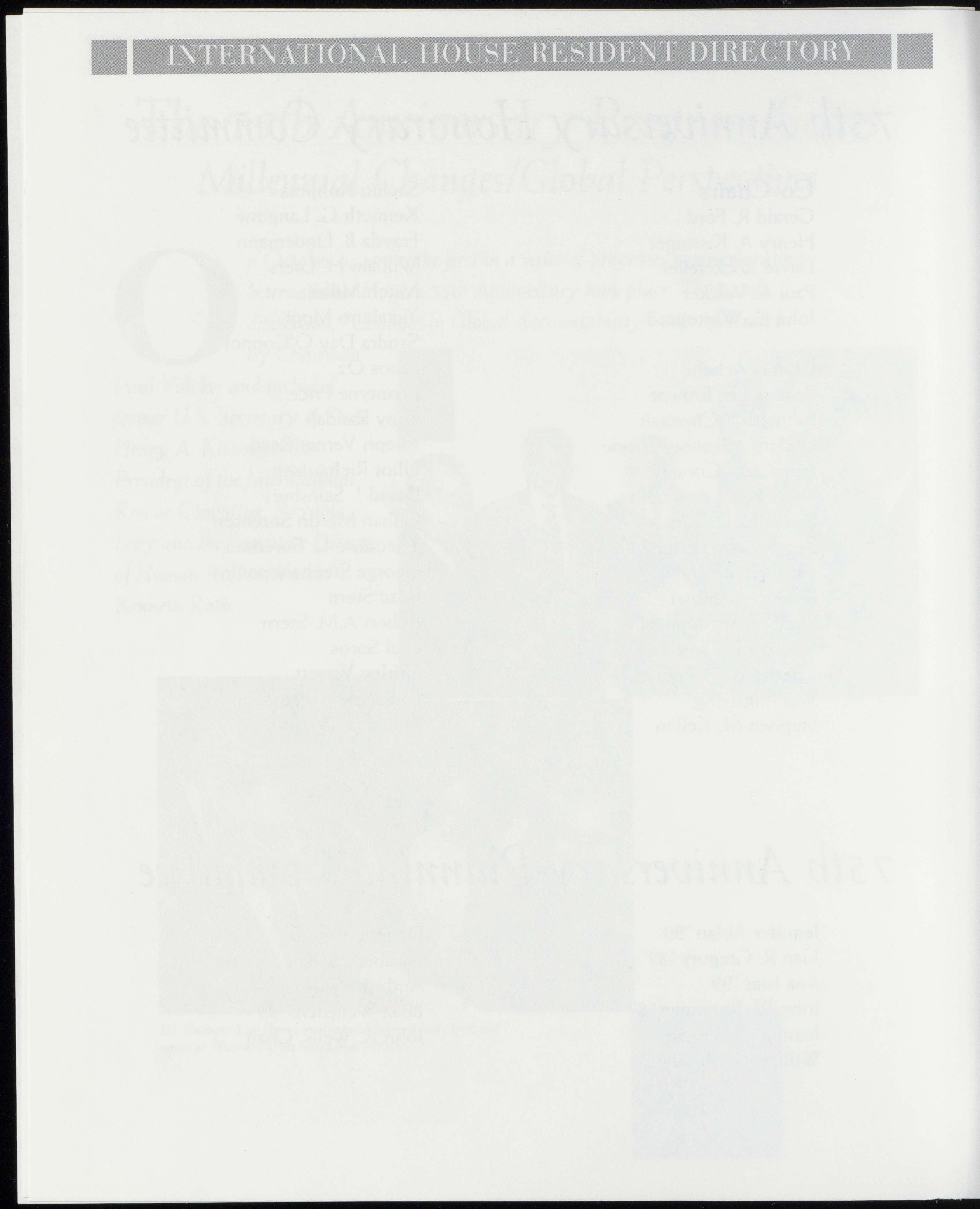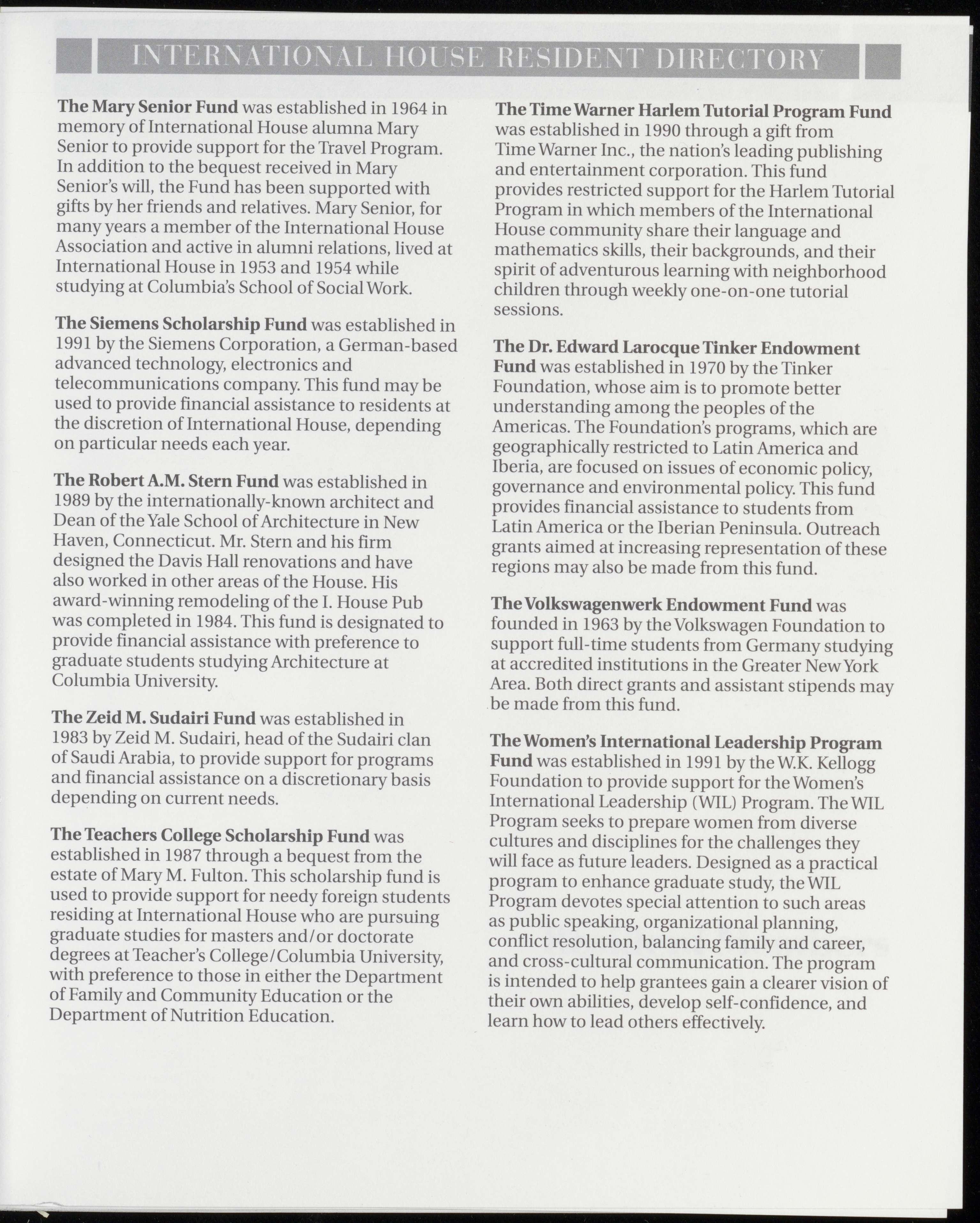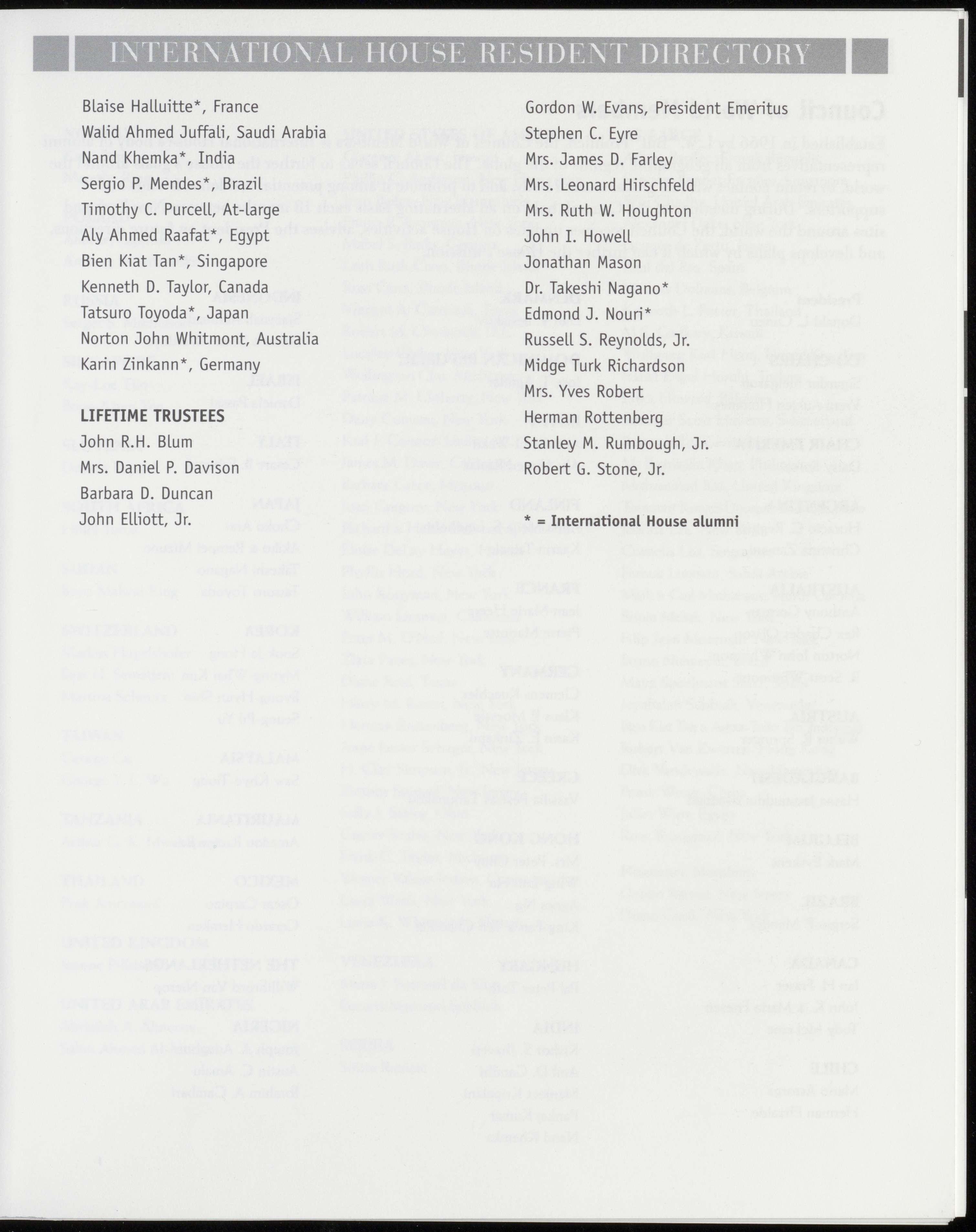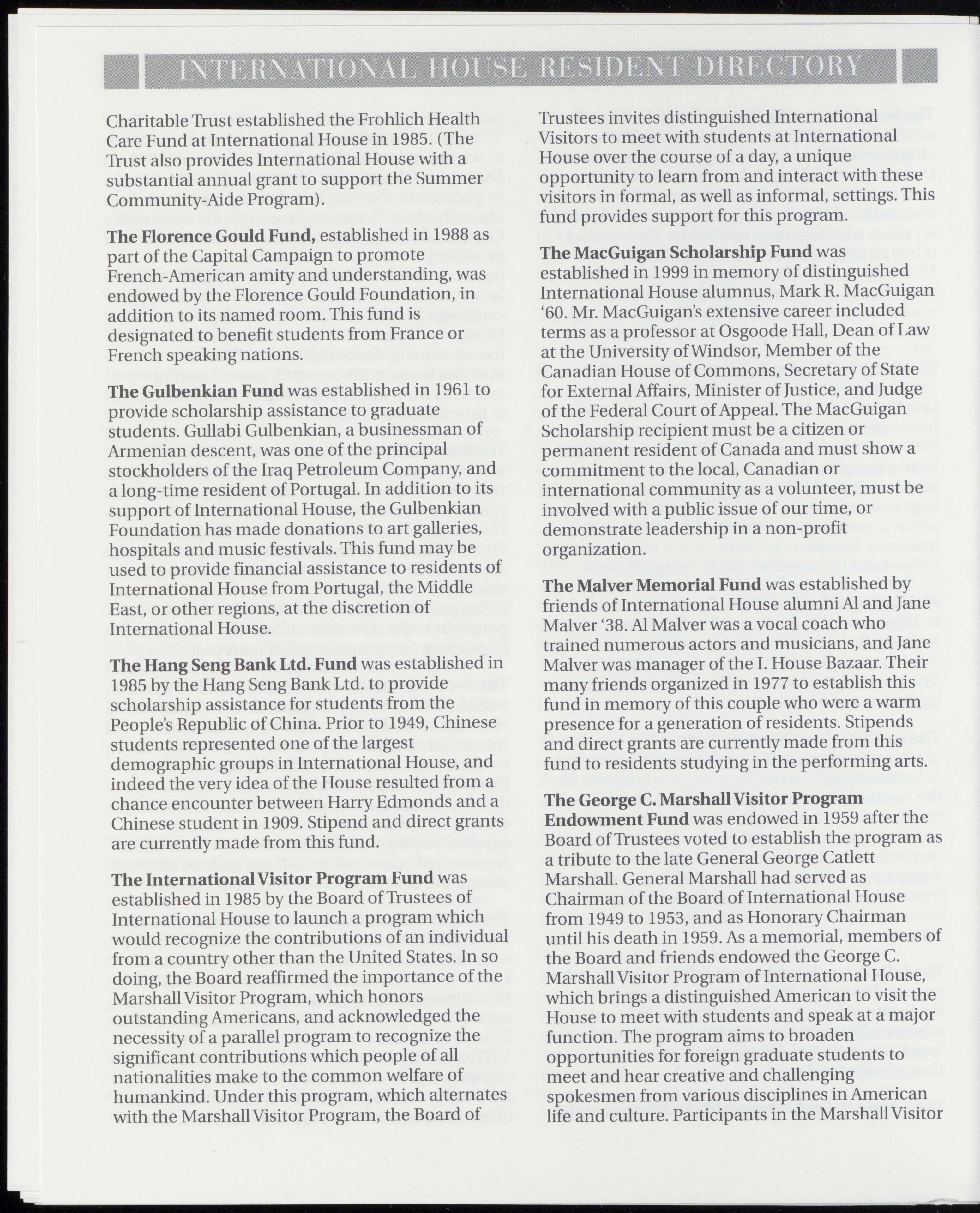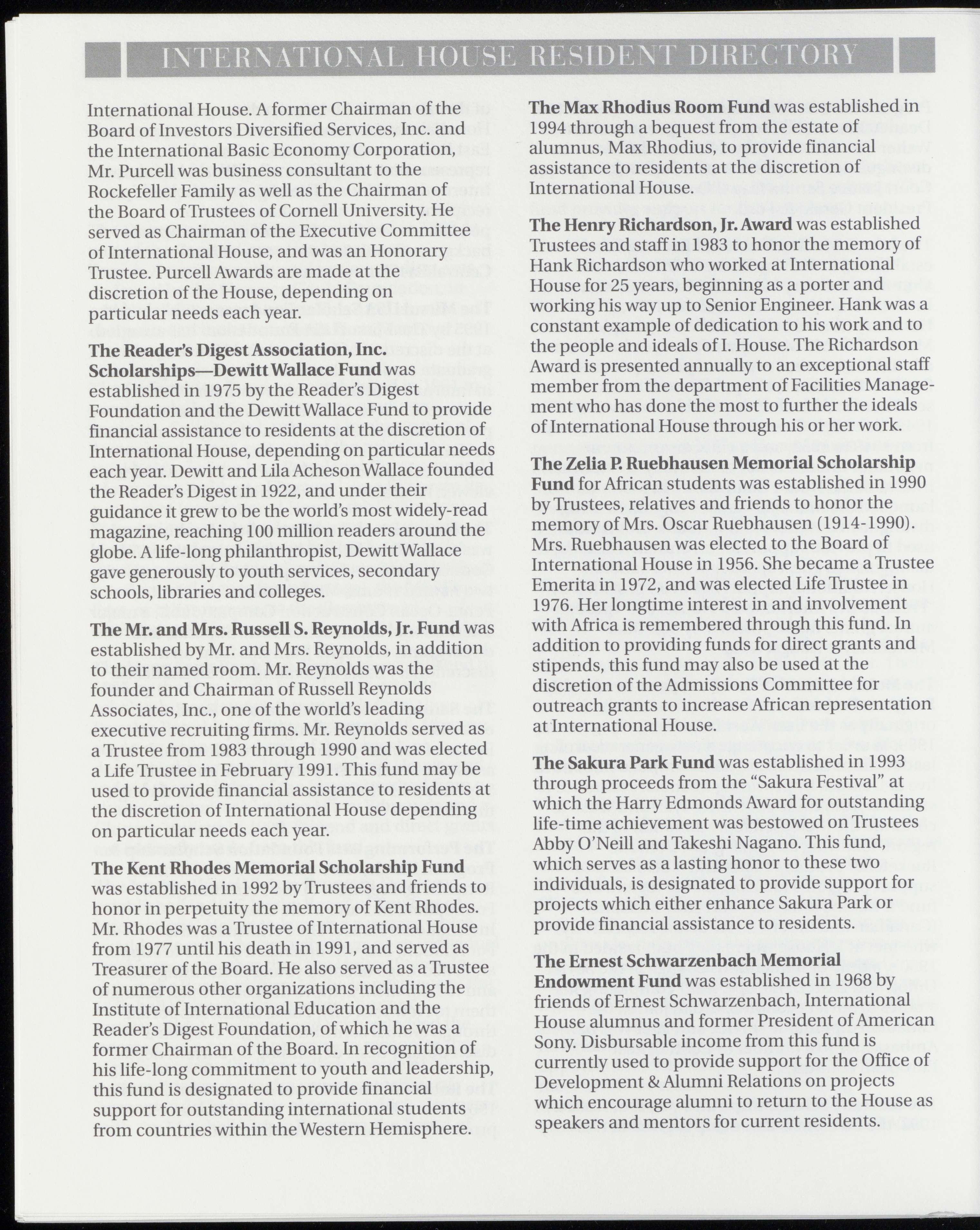 This International House Resident Directory serves a number of purposes. It’s a handy reference for a large and diverse community, it contains descriptions of endowed scholarship funds provided by supporters of the House to help residents achieve diversity, and, perhaps most importantly, it is a keepsake of your stay at I. House. We have learned that former residents save their Directory throughout their lives as a way of recalling their residency and prompting memories when contacting old friends. Inevitably, they are brought out at informal gatherings of alumni for lengthy and enjoyable sessions of “whatever happened to...?”