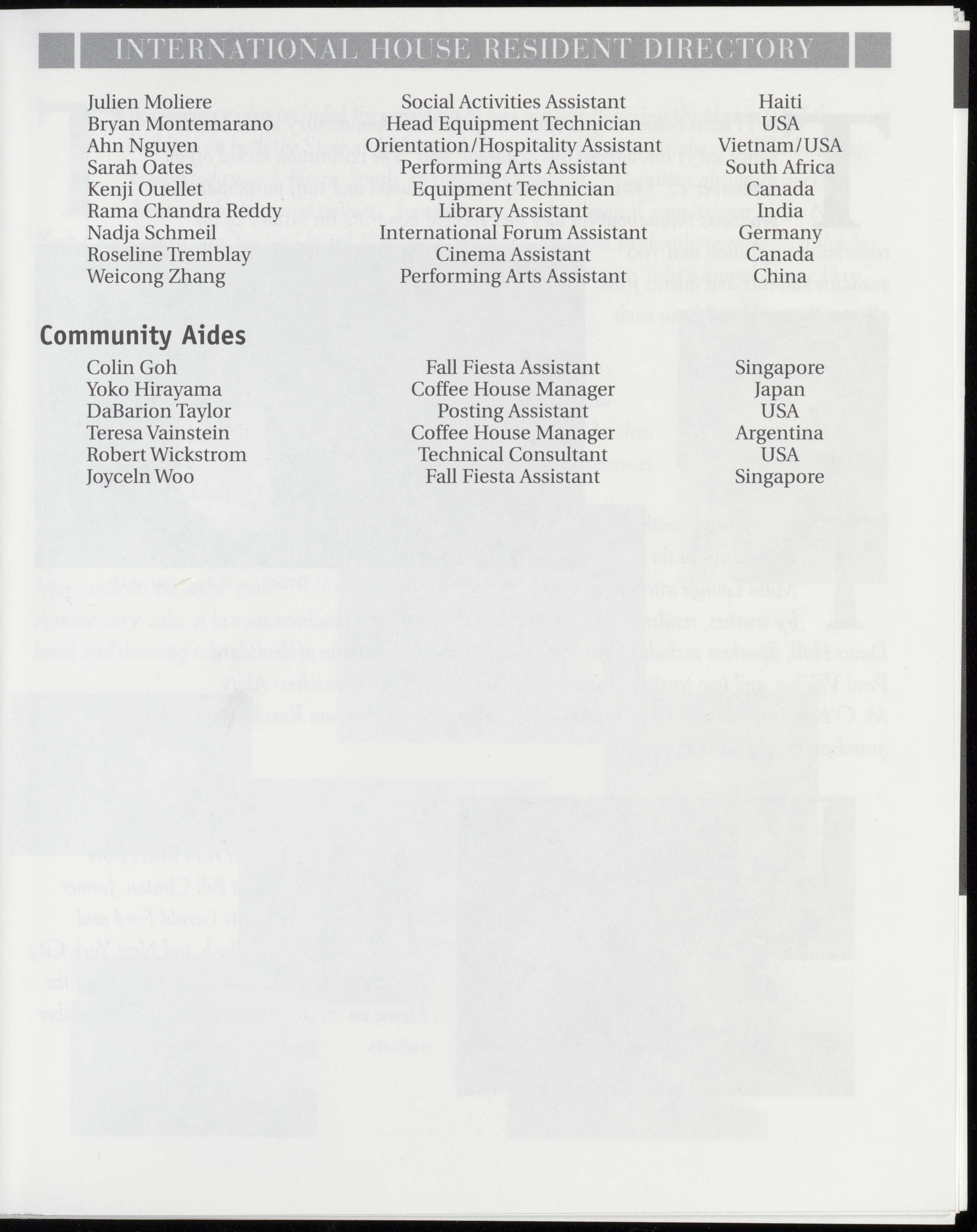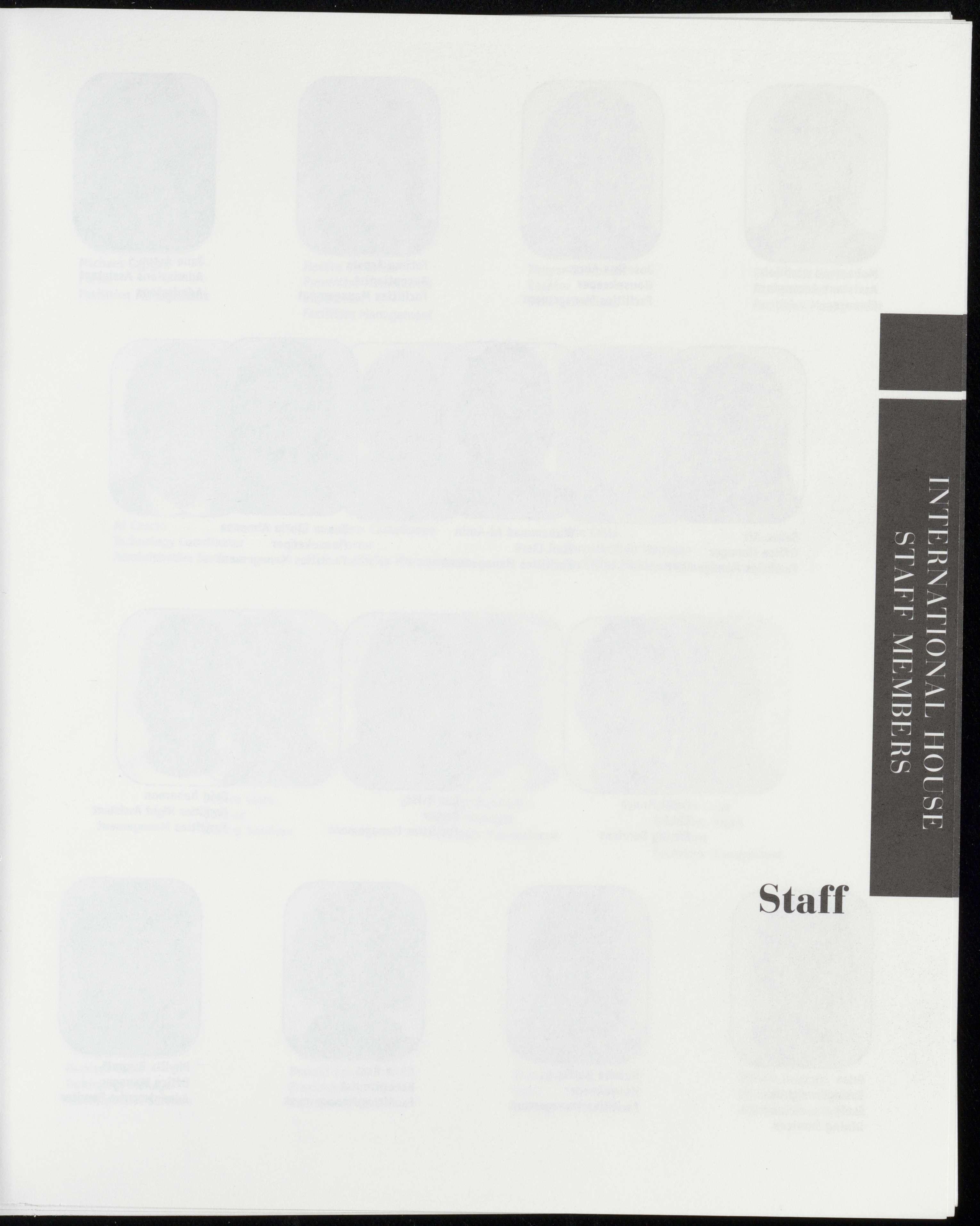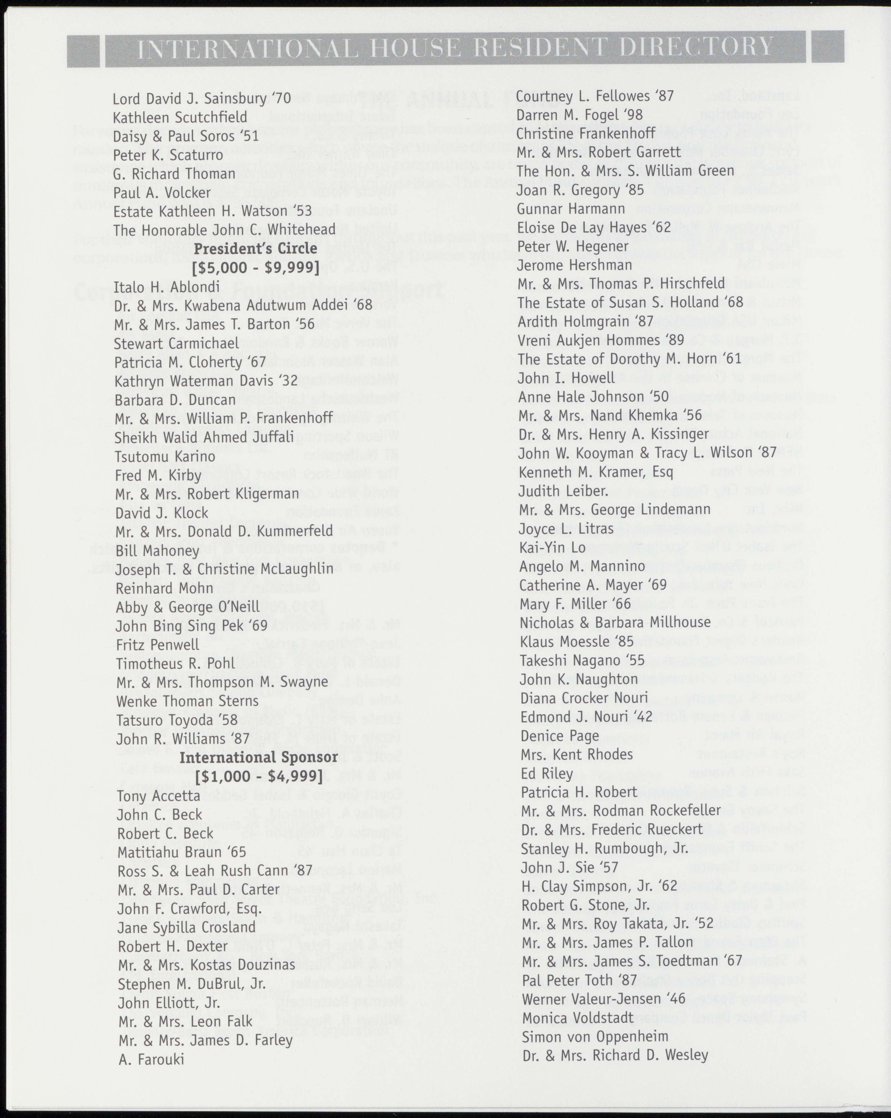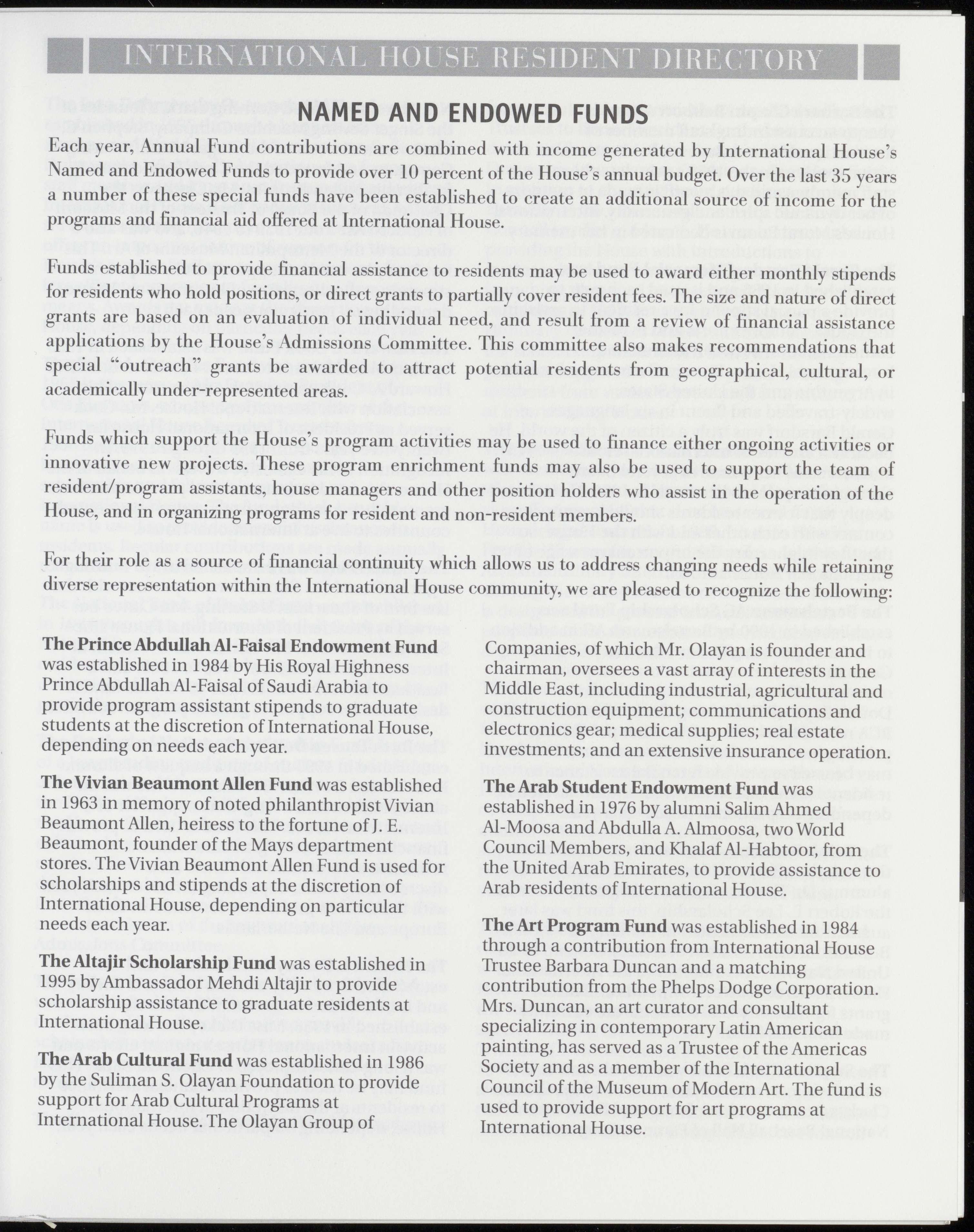 This International House Resident Directory serves a number of purposes. It’s a handy reference for a large and diverse community, it contains descriptions of endowed scholarship funds provided by supporters of the House to help residents achieve diversity, and, perhaps most importantly, it is a keepsake of your stay at I. House. We have learned that former residents save their Directory throughout their lives as a way of recalling their residency and prompting memories when contacting old friends. Inevitably, they are brought out at informal gatherings of alumni for lengthy and enjoyable sessions of “whatever happened to...?”
