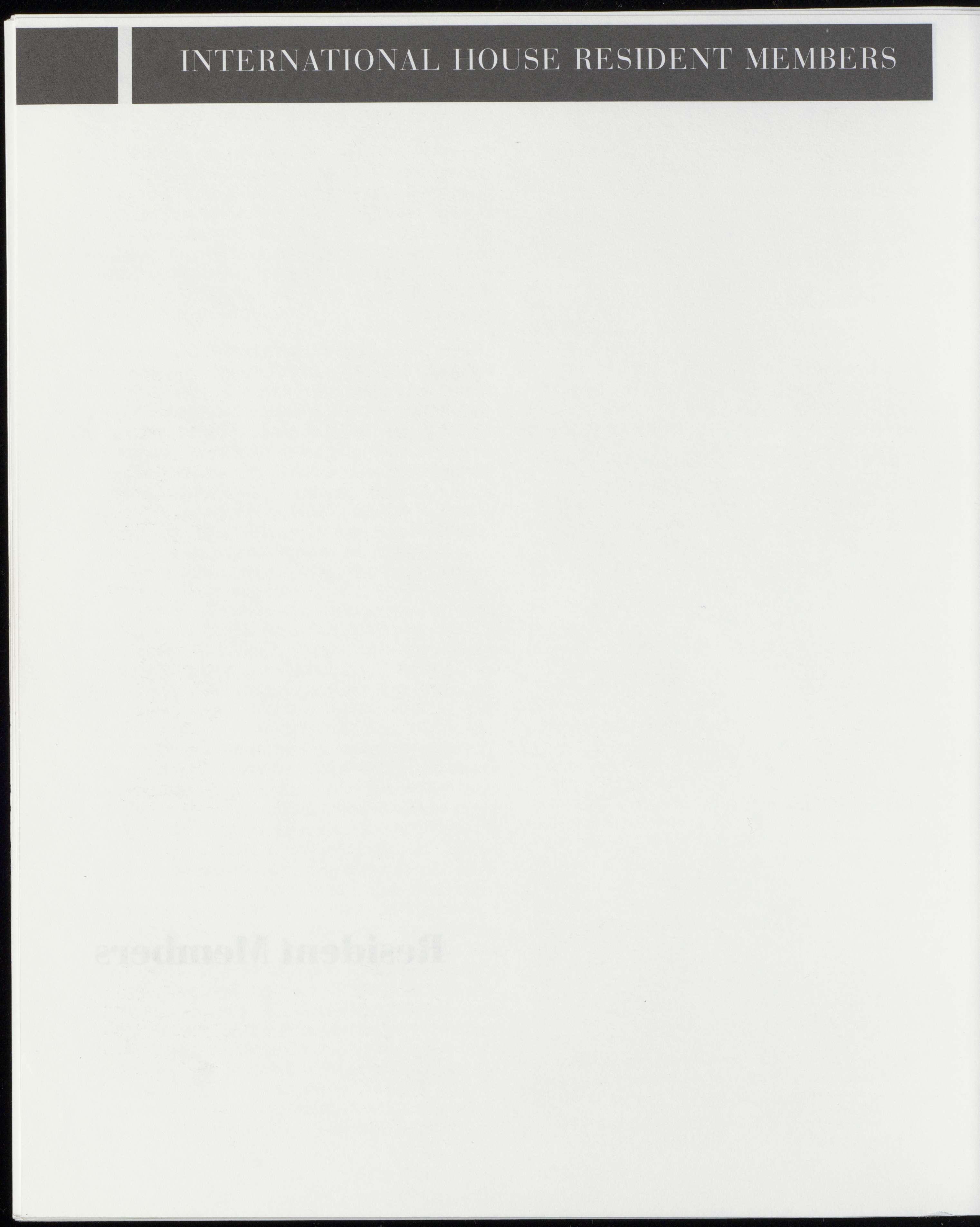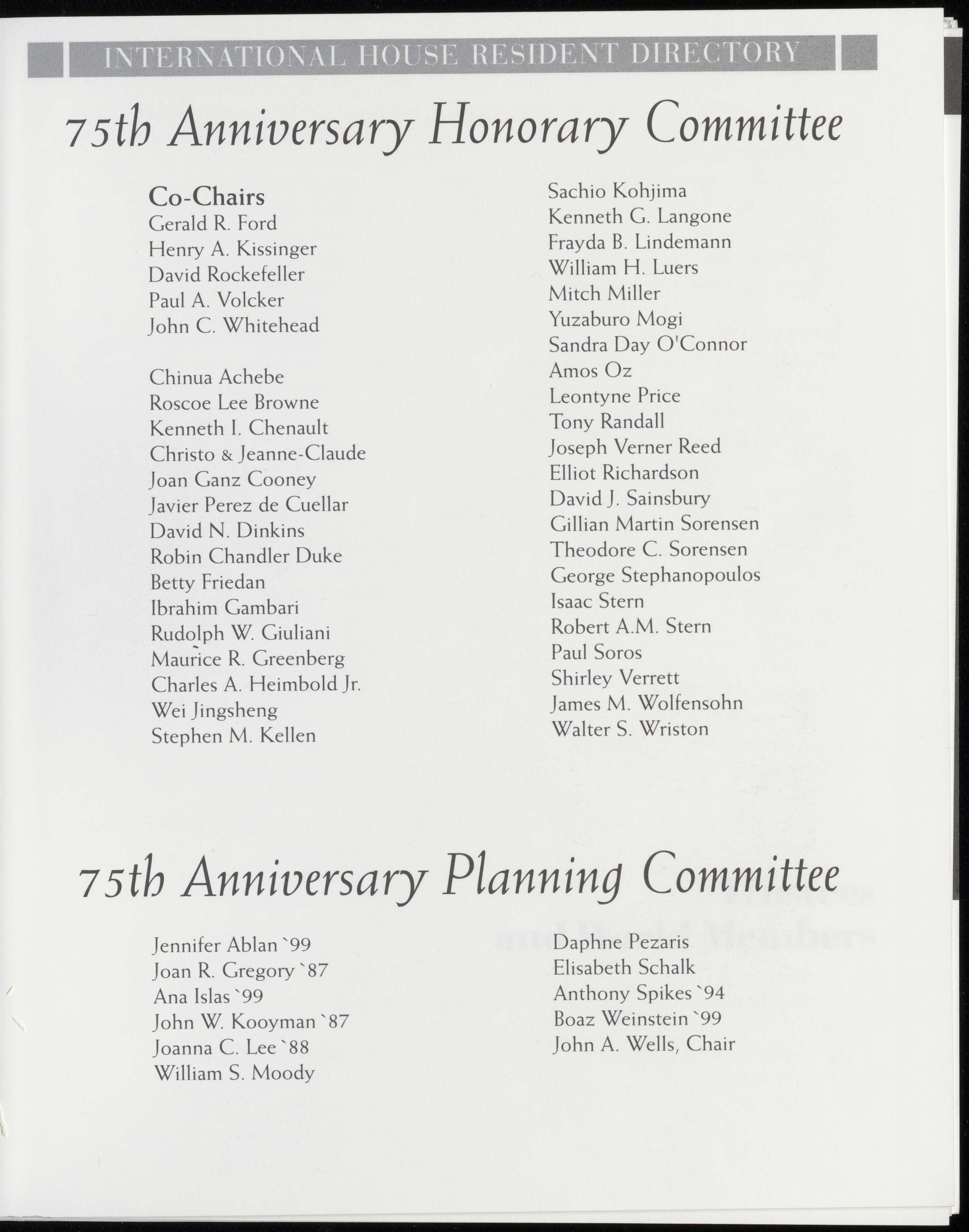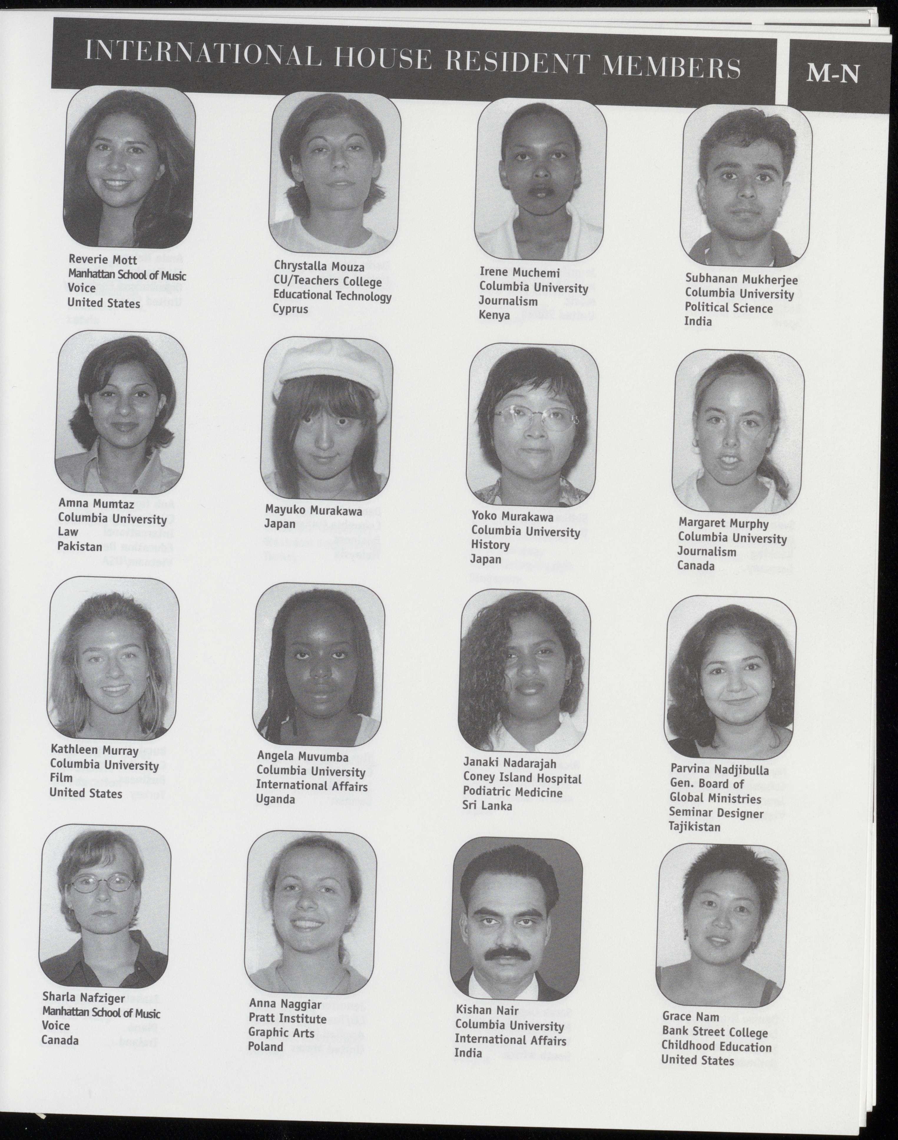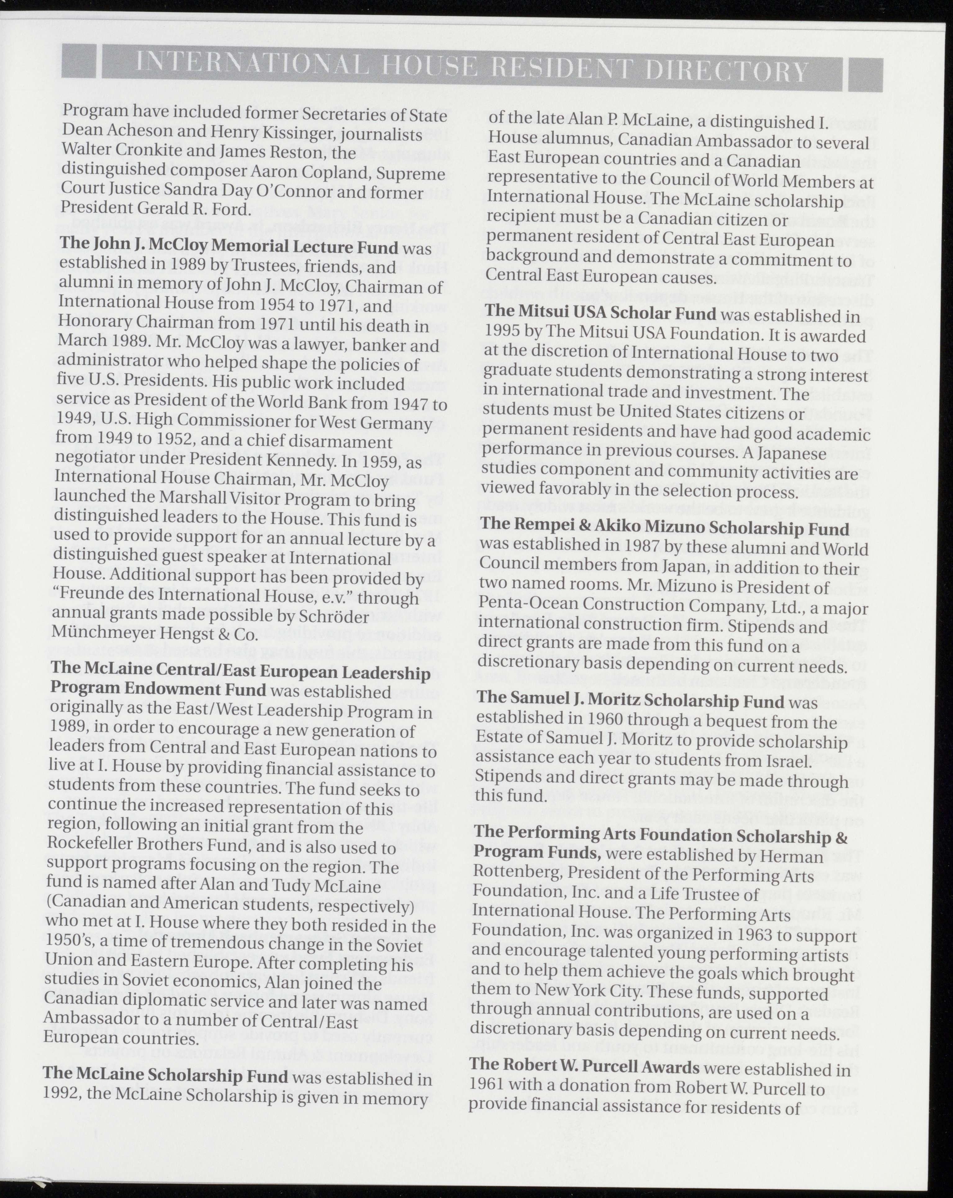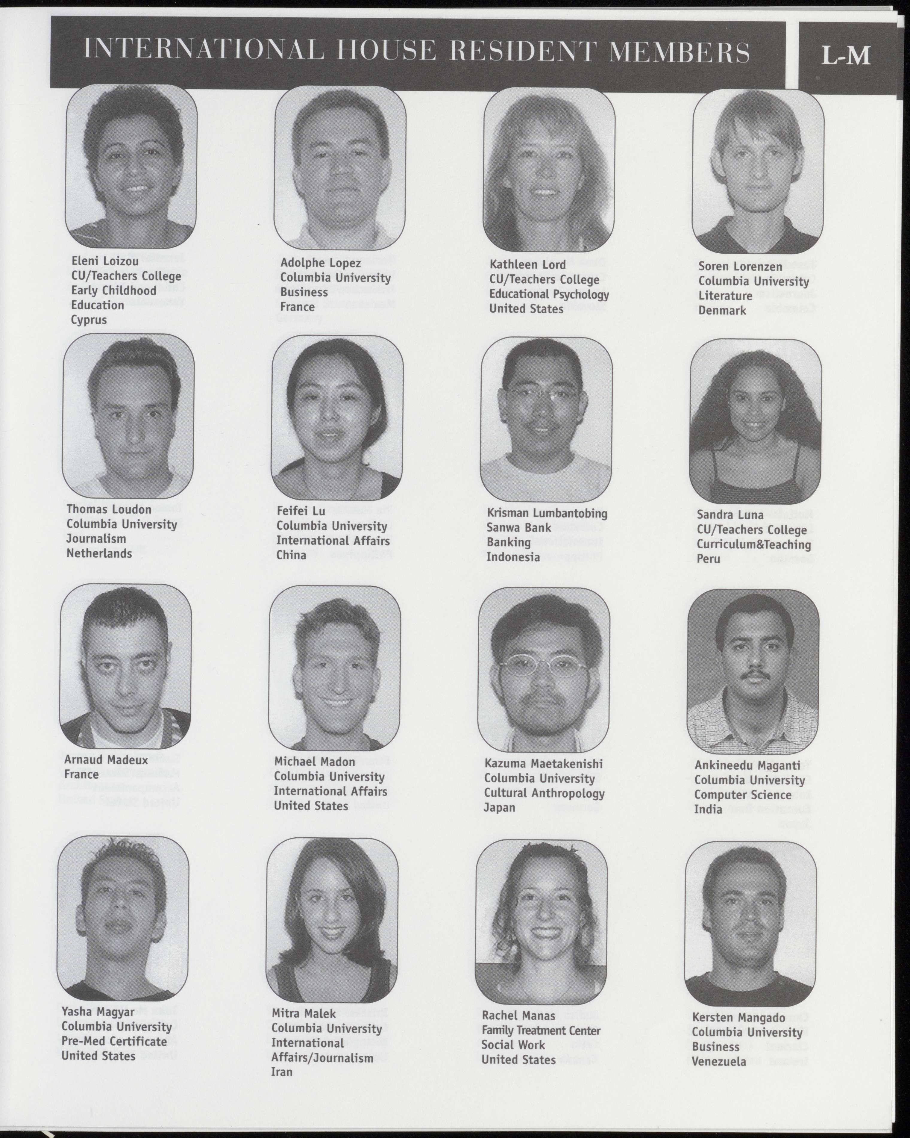This International House Resident Directory serves a number of purposes. It’s a handy reference for a large and diverse community, it contains descriptions of endowed scholarship funds provided by supporters of the House to help residents achieve diversity, and, perhaps most importantly, it is a keepsake of your stay at I. House. We have learned that former residents save their Directory throughout their lives as a way of recalling their residency and prompting memories when contacting old friends. Inevitably, they are brought out at informal gatherings of alumni for lengthy and enjoyable sessions of “whatever happened to...?”