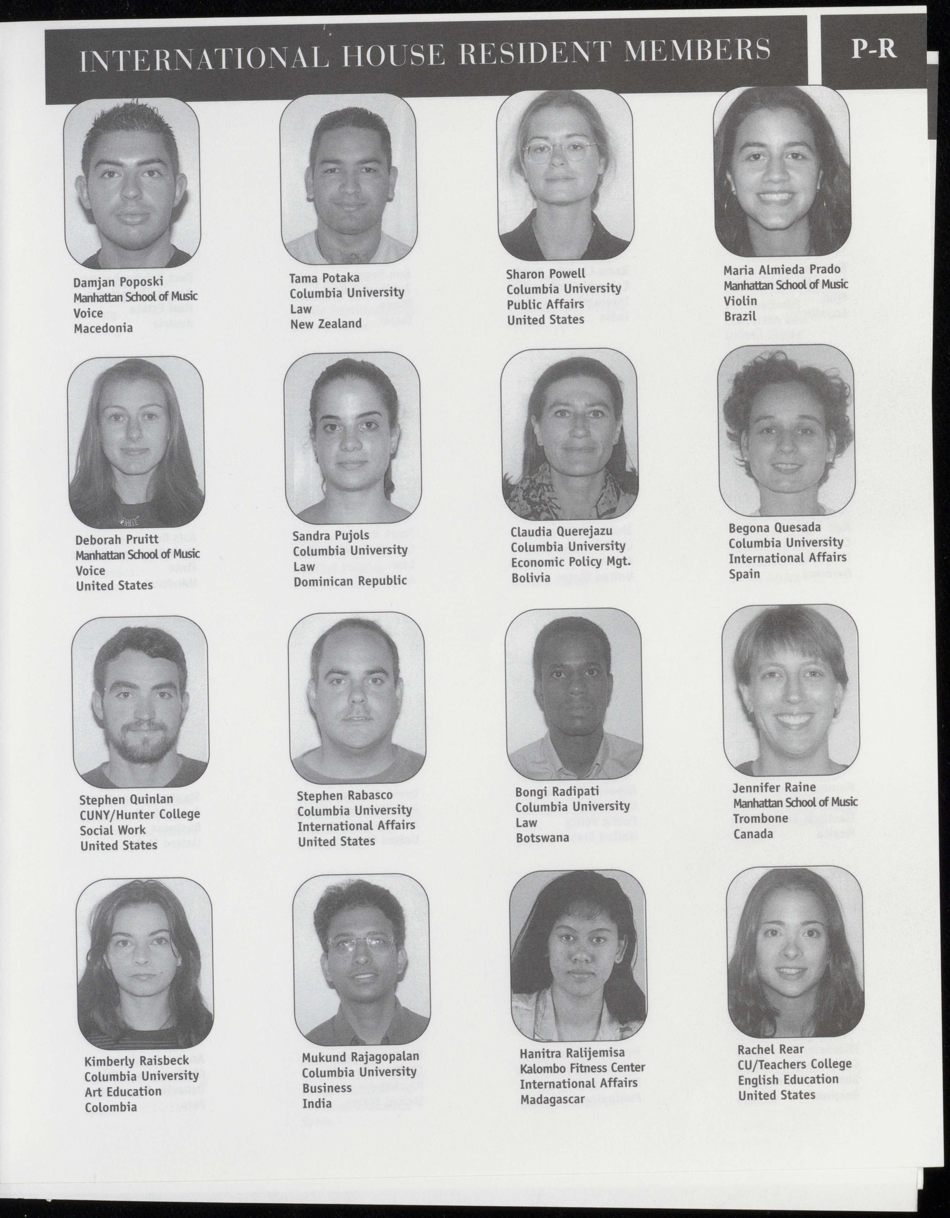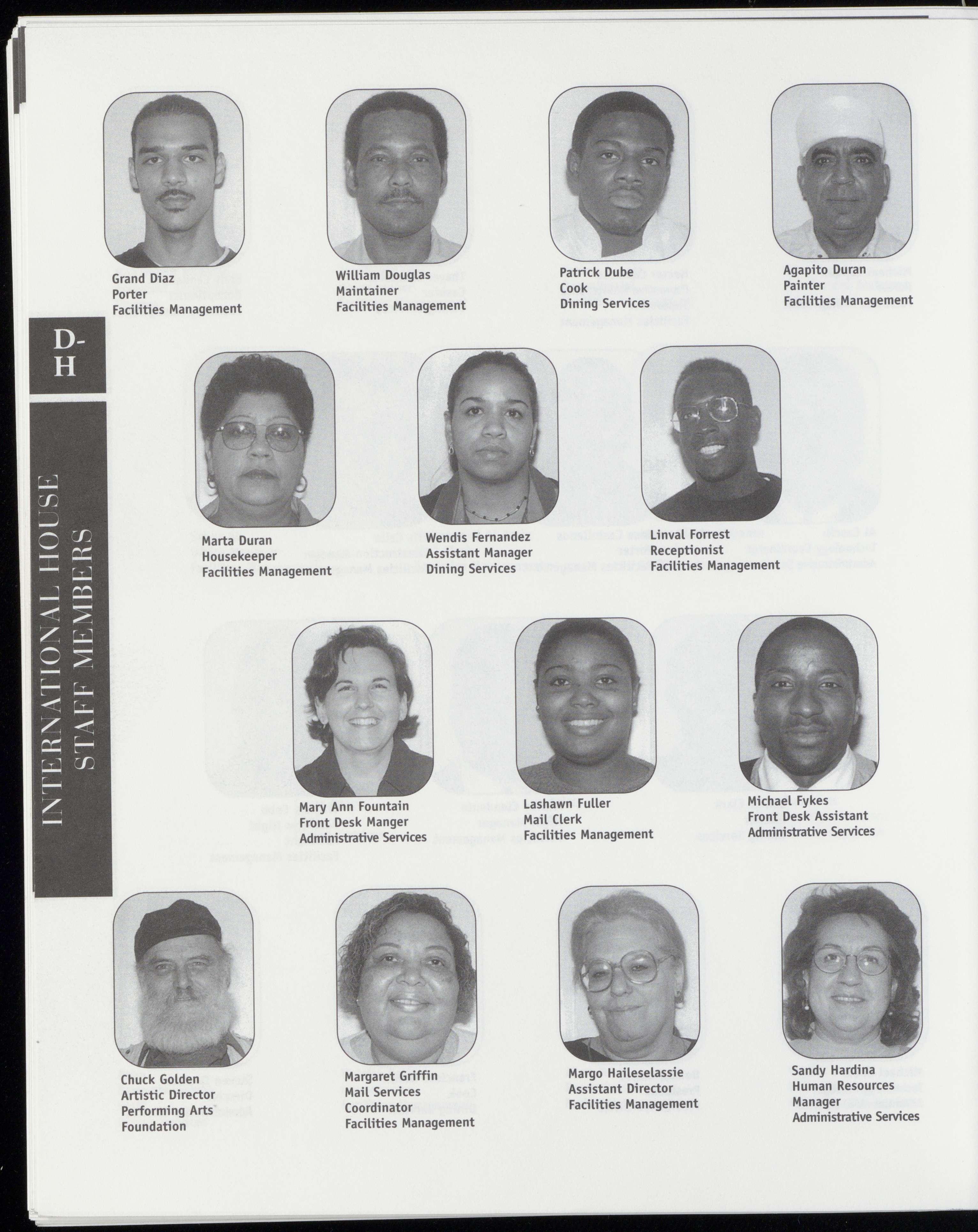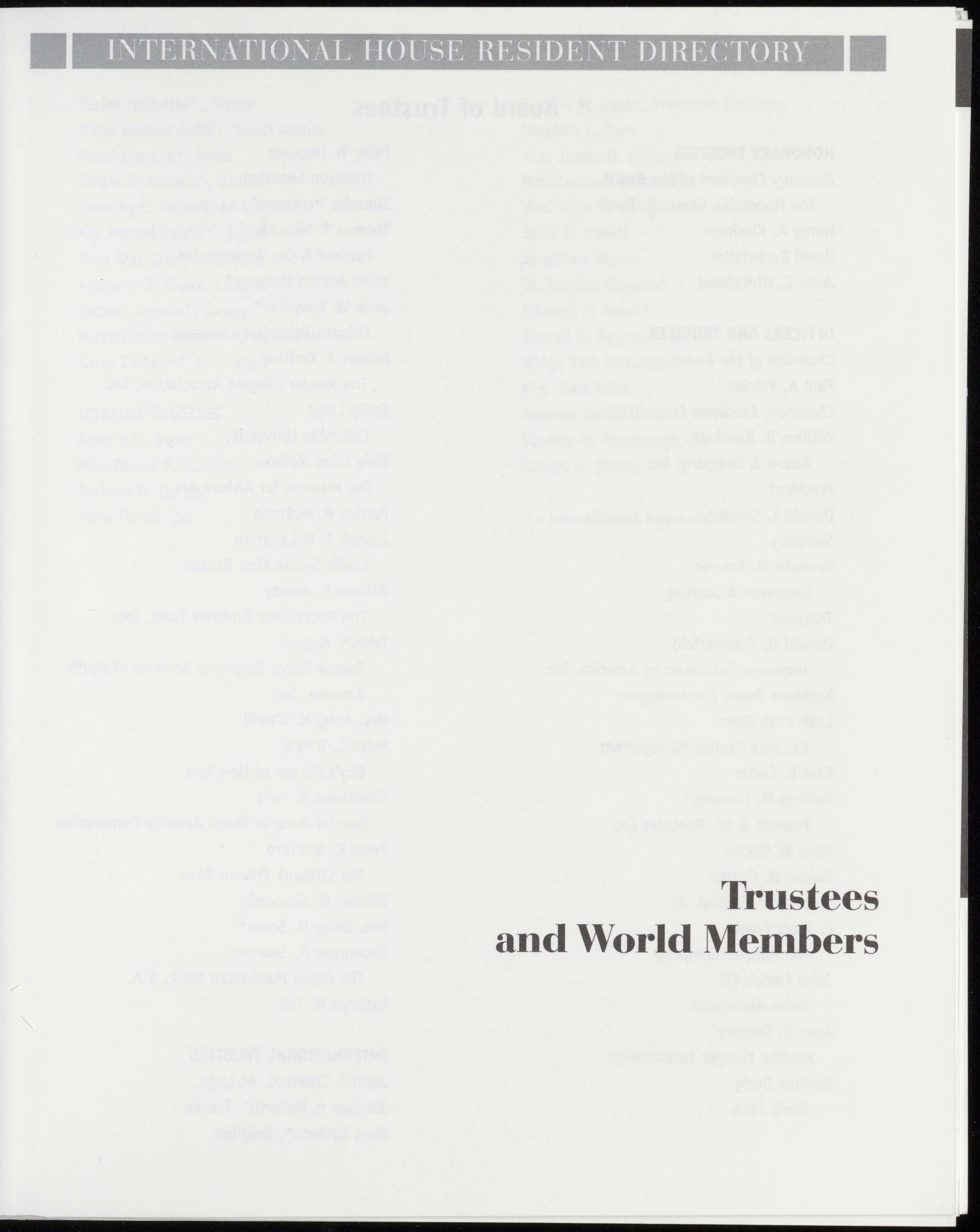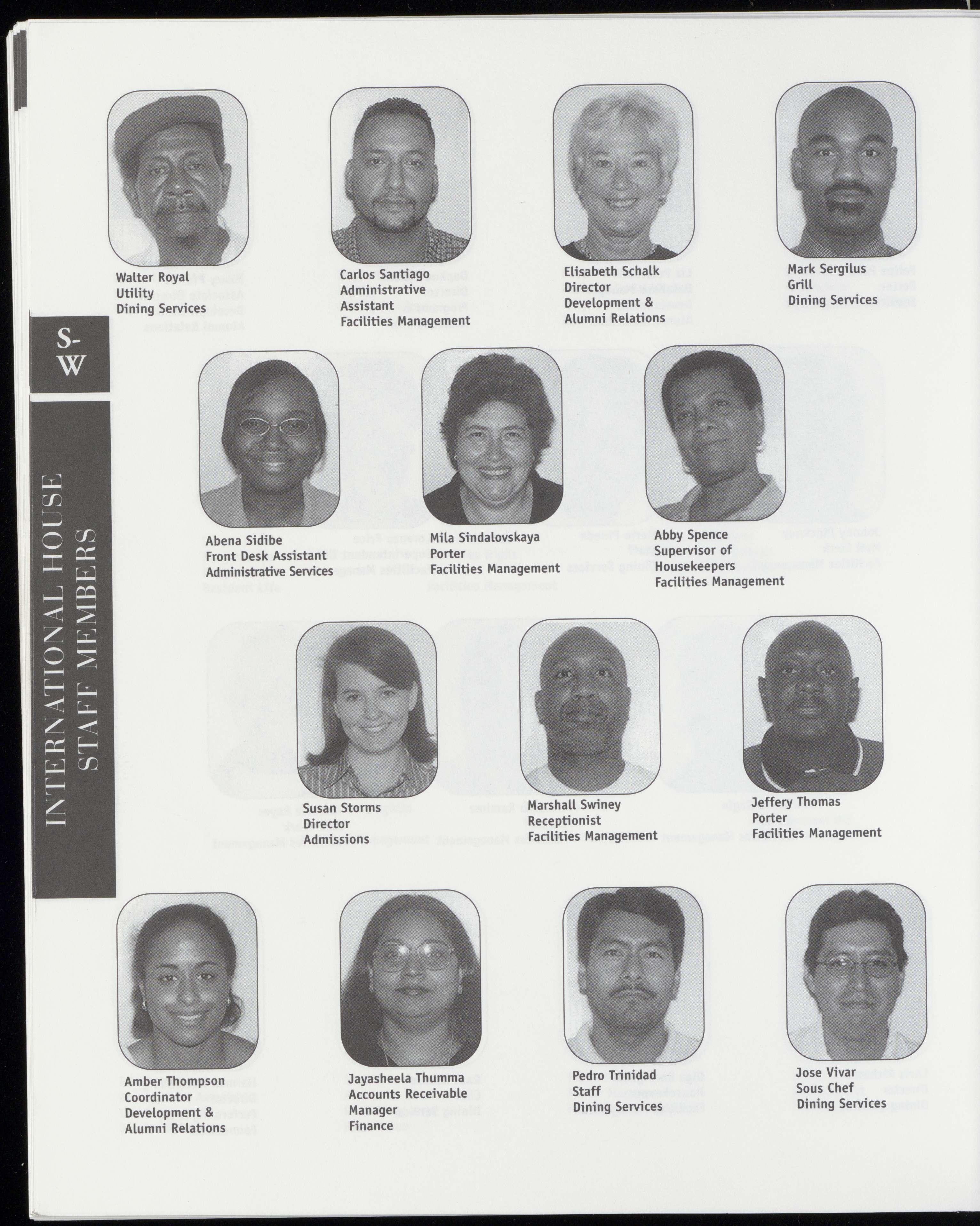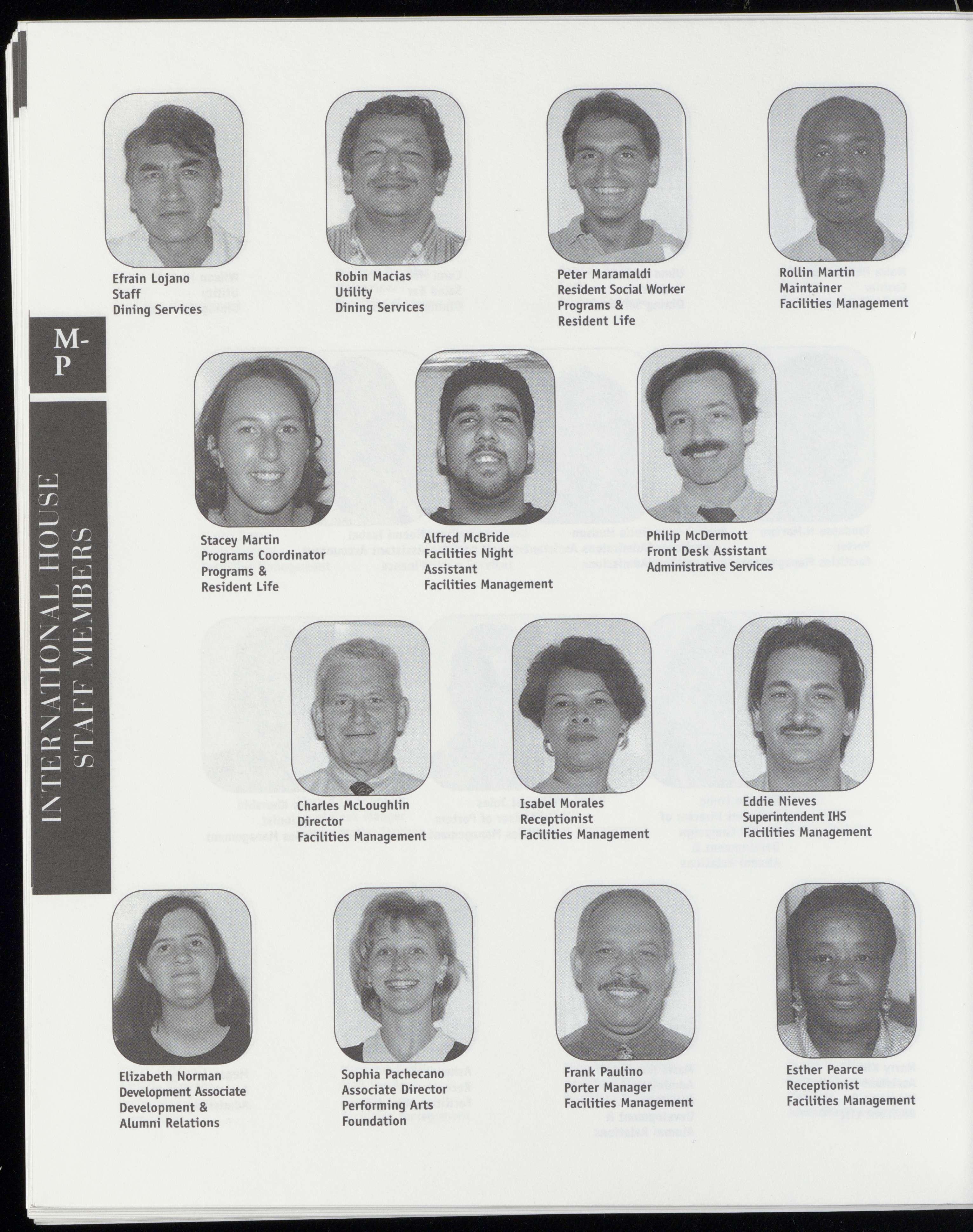 This International House Resident Directory serves a number of purposes. It’s a handy reference for a large and diverse community, it contains descriptions of endowed scholarship funds provided by supporters of the House to help residents achieve diversity, and, perhaps most importantly, it is a keepsake of your stay at I. House. We have learned that former residents save their Directory throughout their lives as a way of recalling their residency and prompting memories when contacting old friends. Inevitably, they are brought out at informal gatherings of alumni for lengthy and enjoyable sessions of “whatever happened to...?”