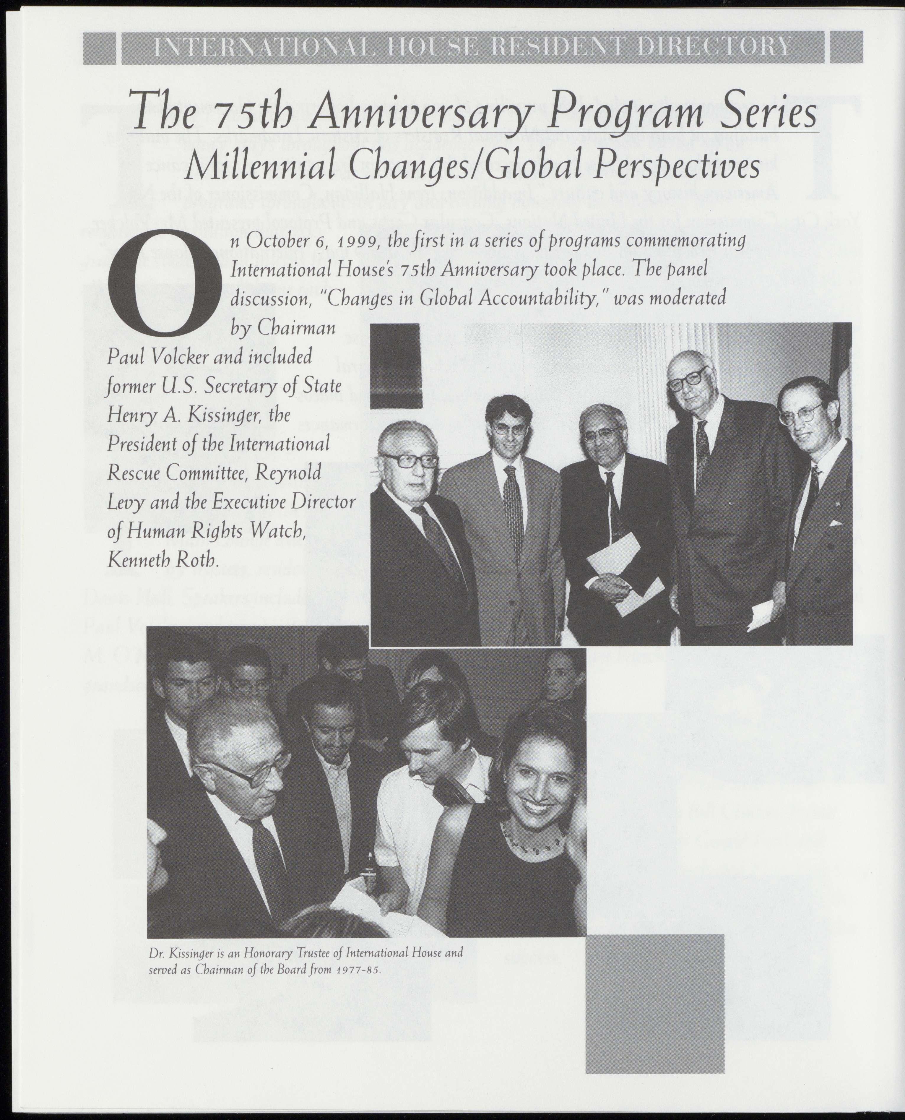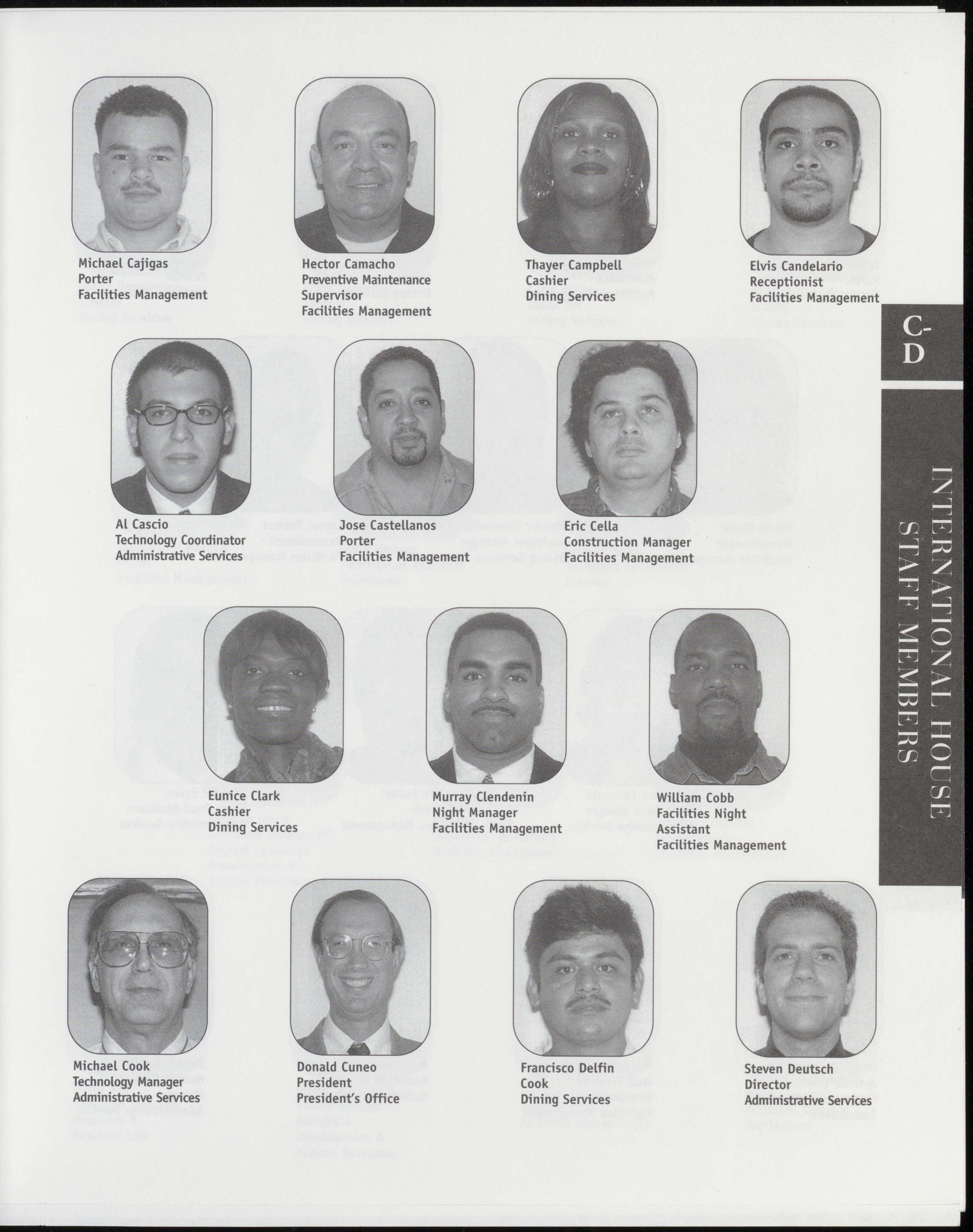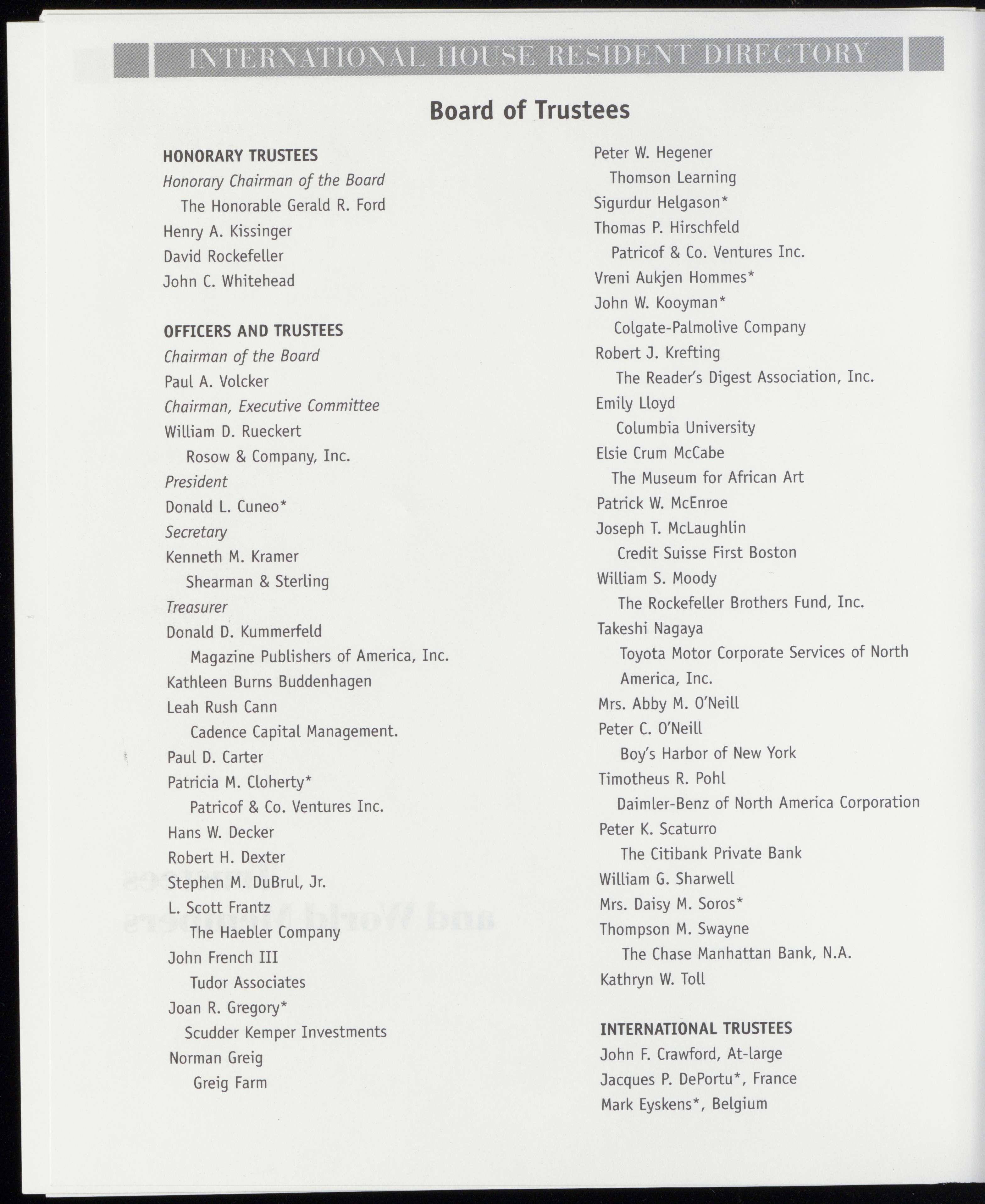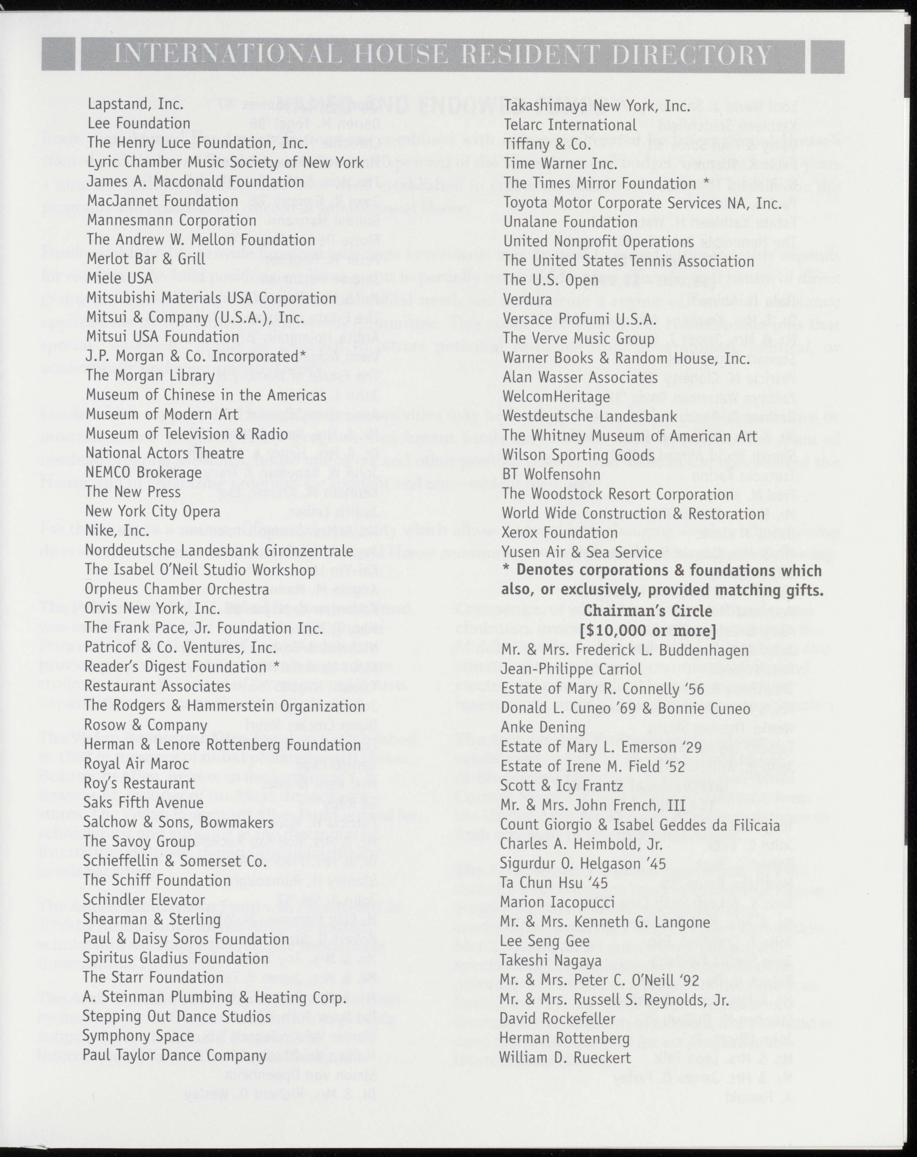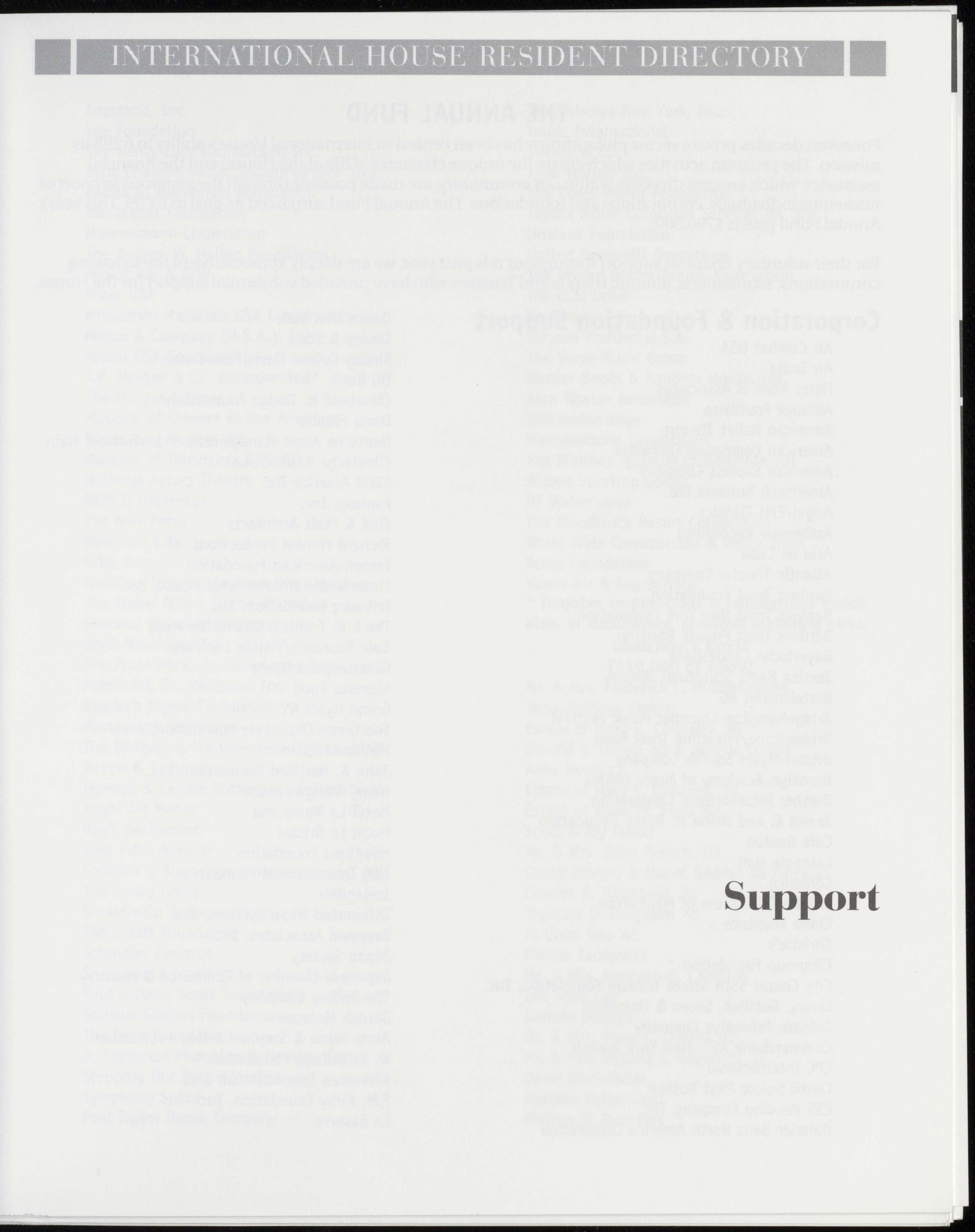 This International House Resident Directory serves a number of purposes. It’s a handy reference for a large and diverse community, it contains descriptions of endowed scholarship funds provided by supporters of the House to help residents achieve diversity, and, perhaps most importantly, it is a keepsake of your stay at I. House. We have learned that former residents save their Directory throughout their lives as a way of recalling their residency and prompting memories when contacting old friends. Inevitably, they are brought out at informal gatherings of alumni for lengthy and enjoyable sessions of “whatever happened to...?”