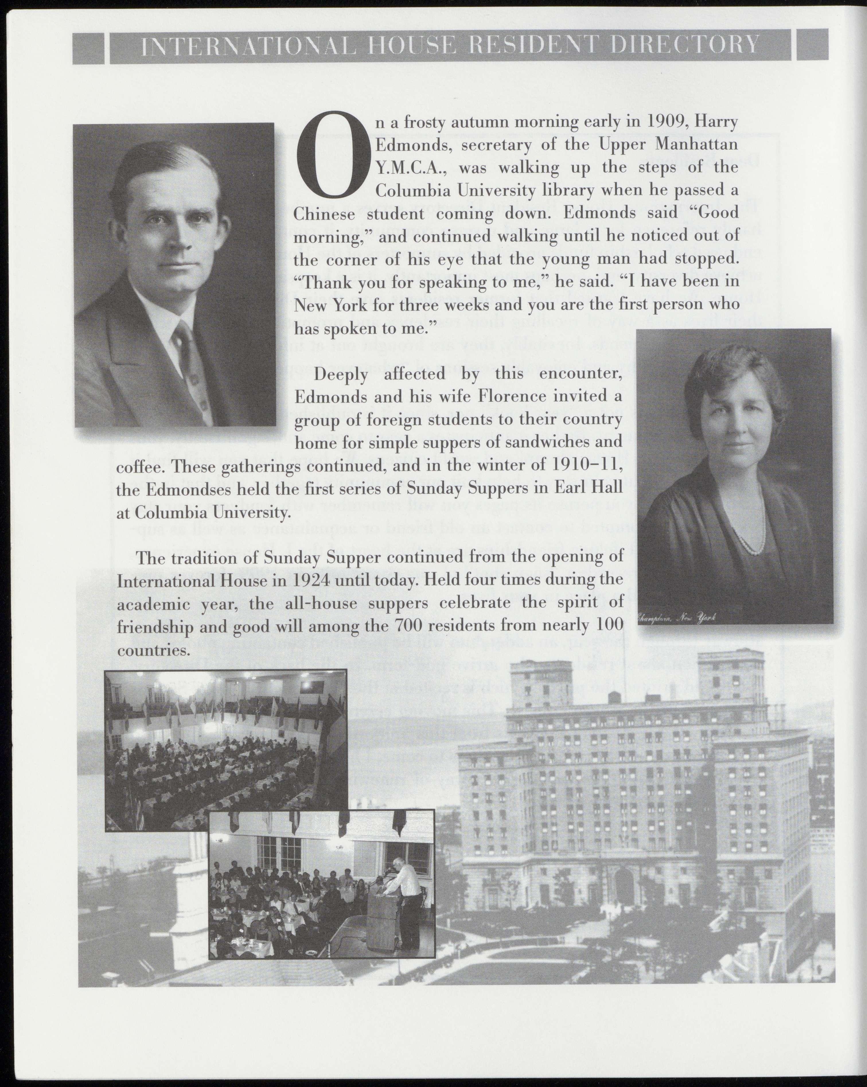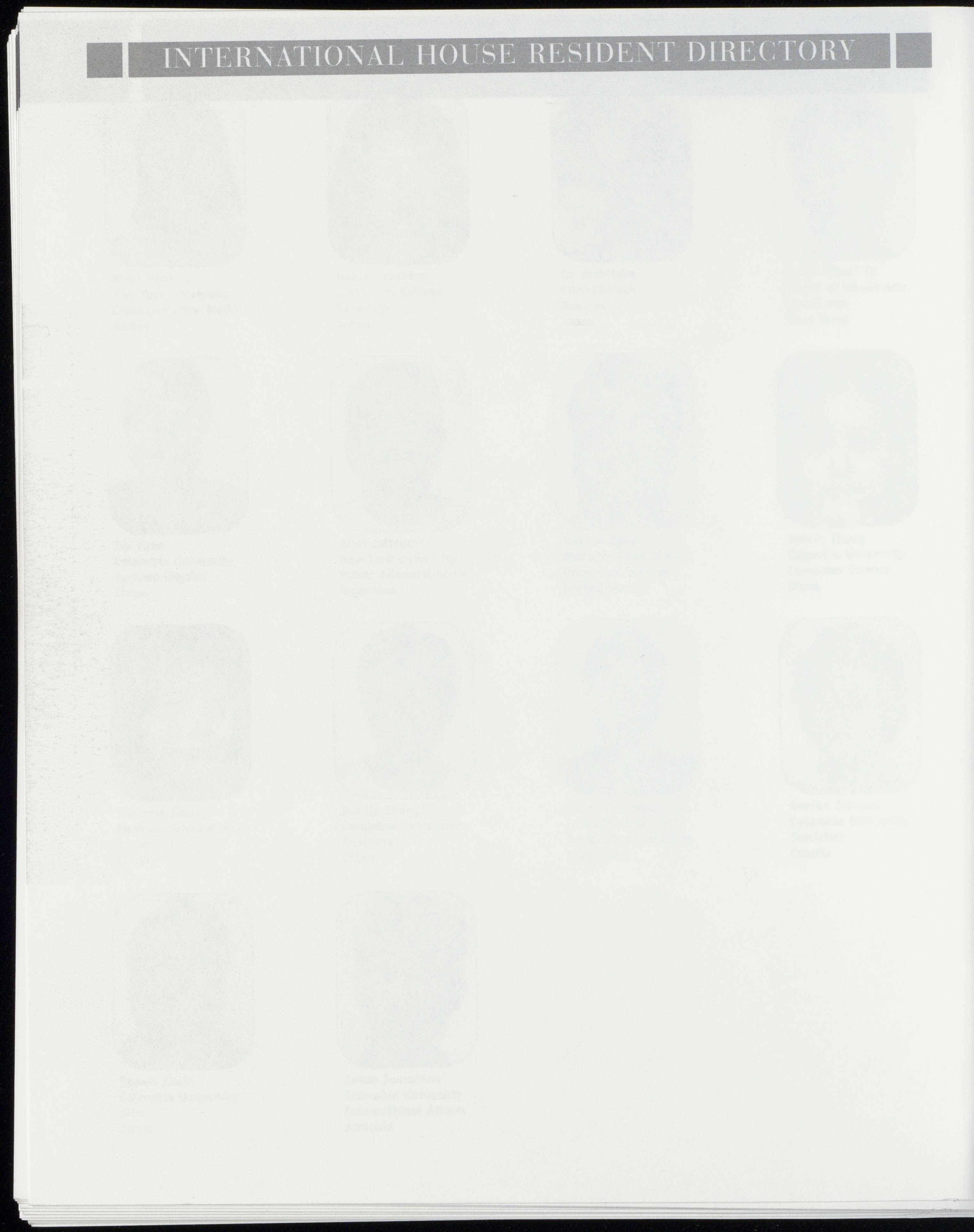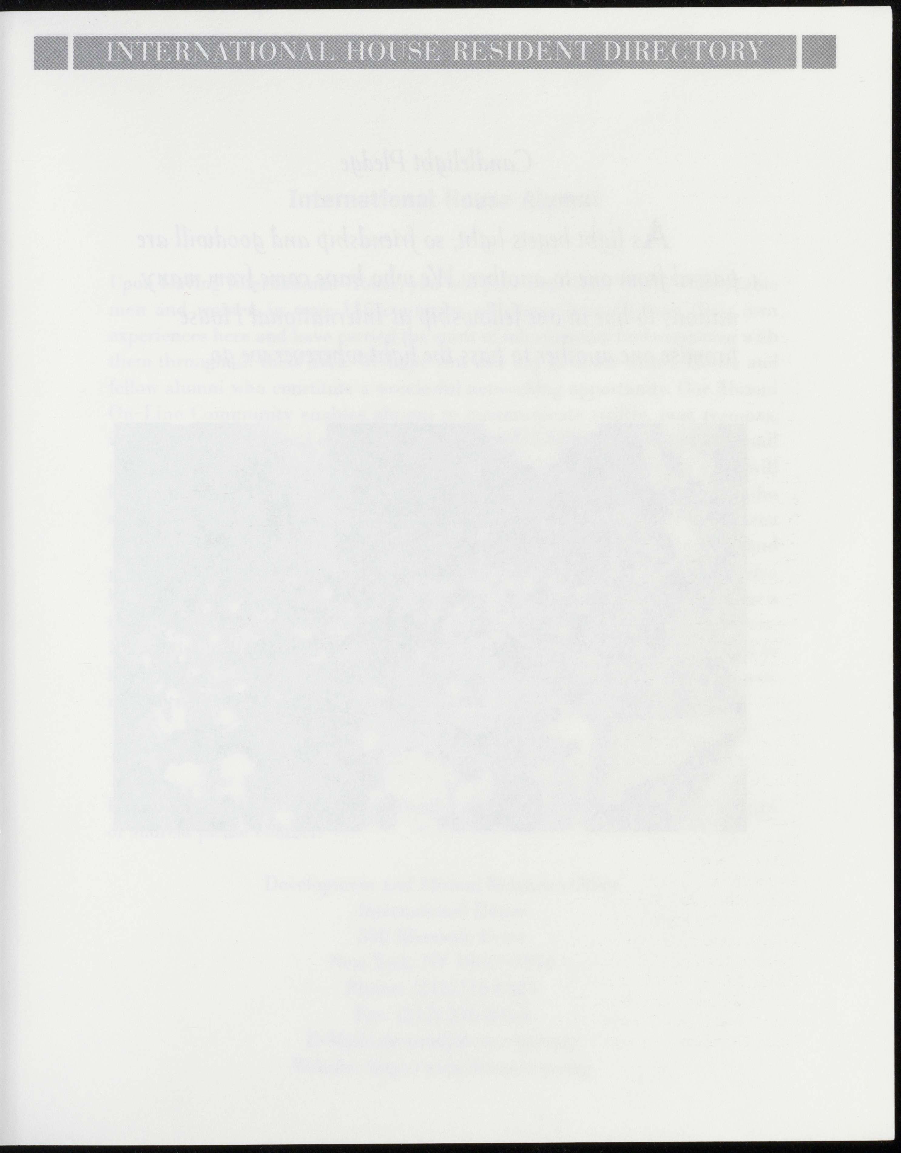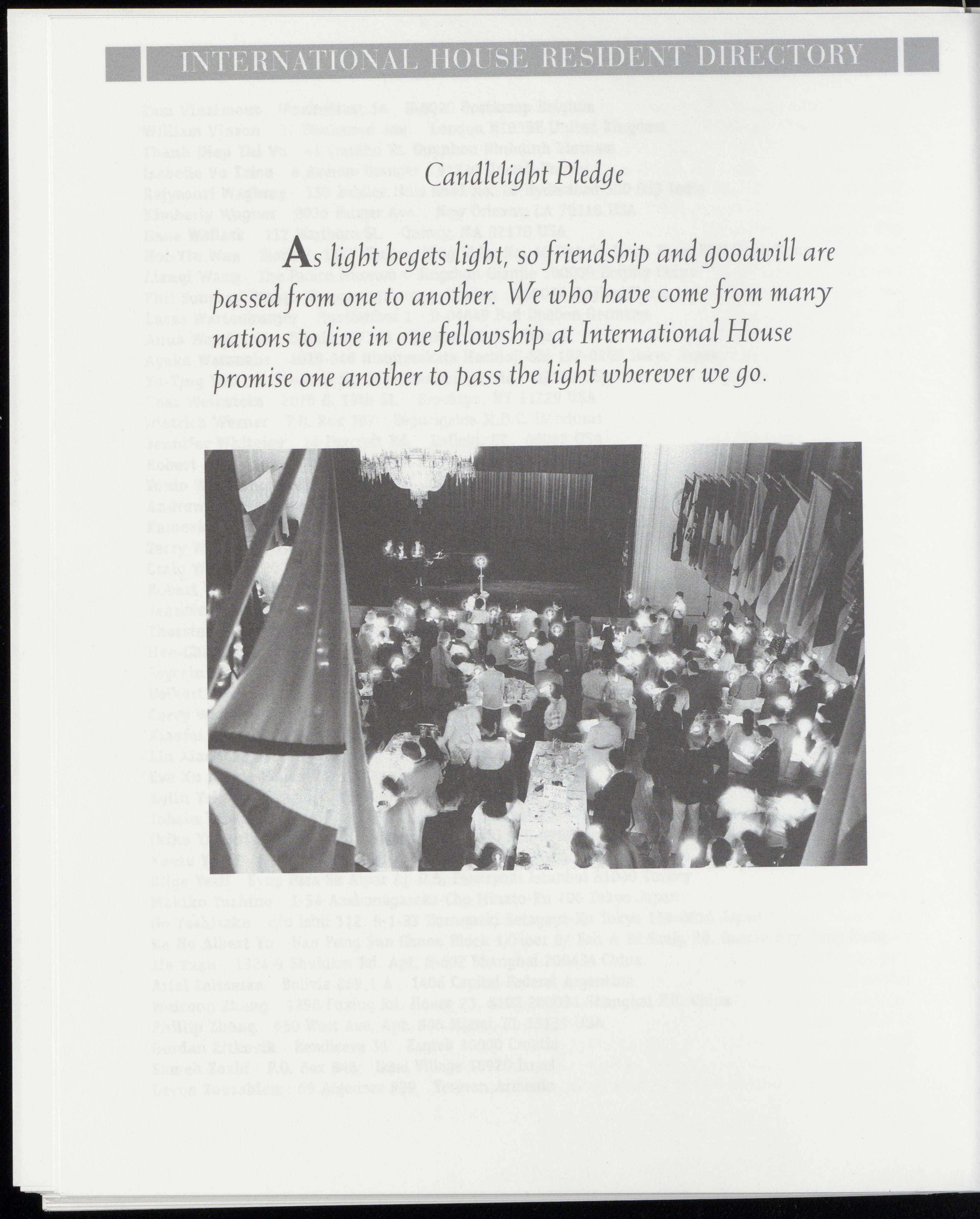 Midway through the year, an addendum will be published containing photos and information about residents who arrive mid-term. In the back of the Directory, you'll find printed the pledge which is recited at the Candlelight Sunday Supper at the end of the academic year. This moving ceremony marks in an unforgettable way the passage of residents from this unique community experience into your roles as world citizens. In the years to come, I hope that you will read these words again from time to time as a way of renewing the International House experience in your daily lives.