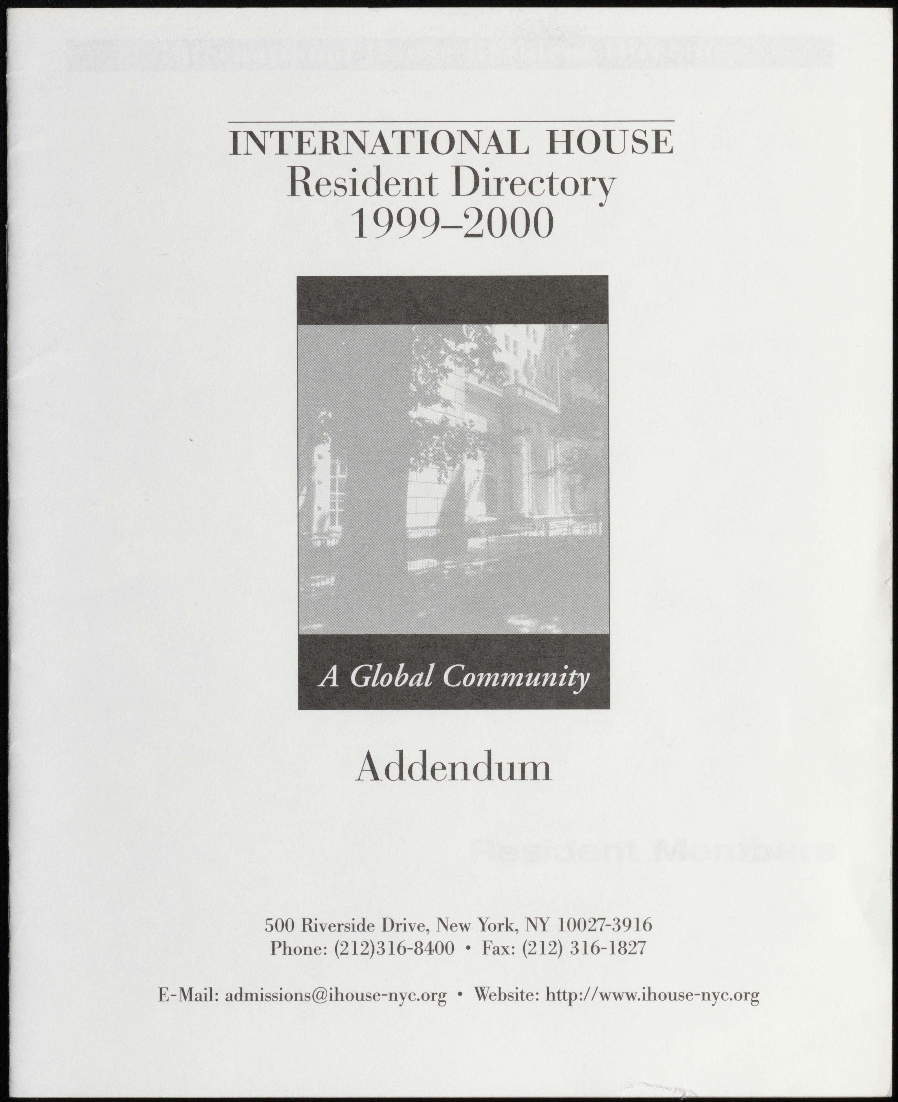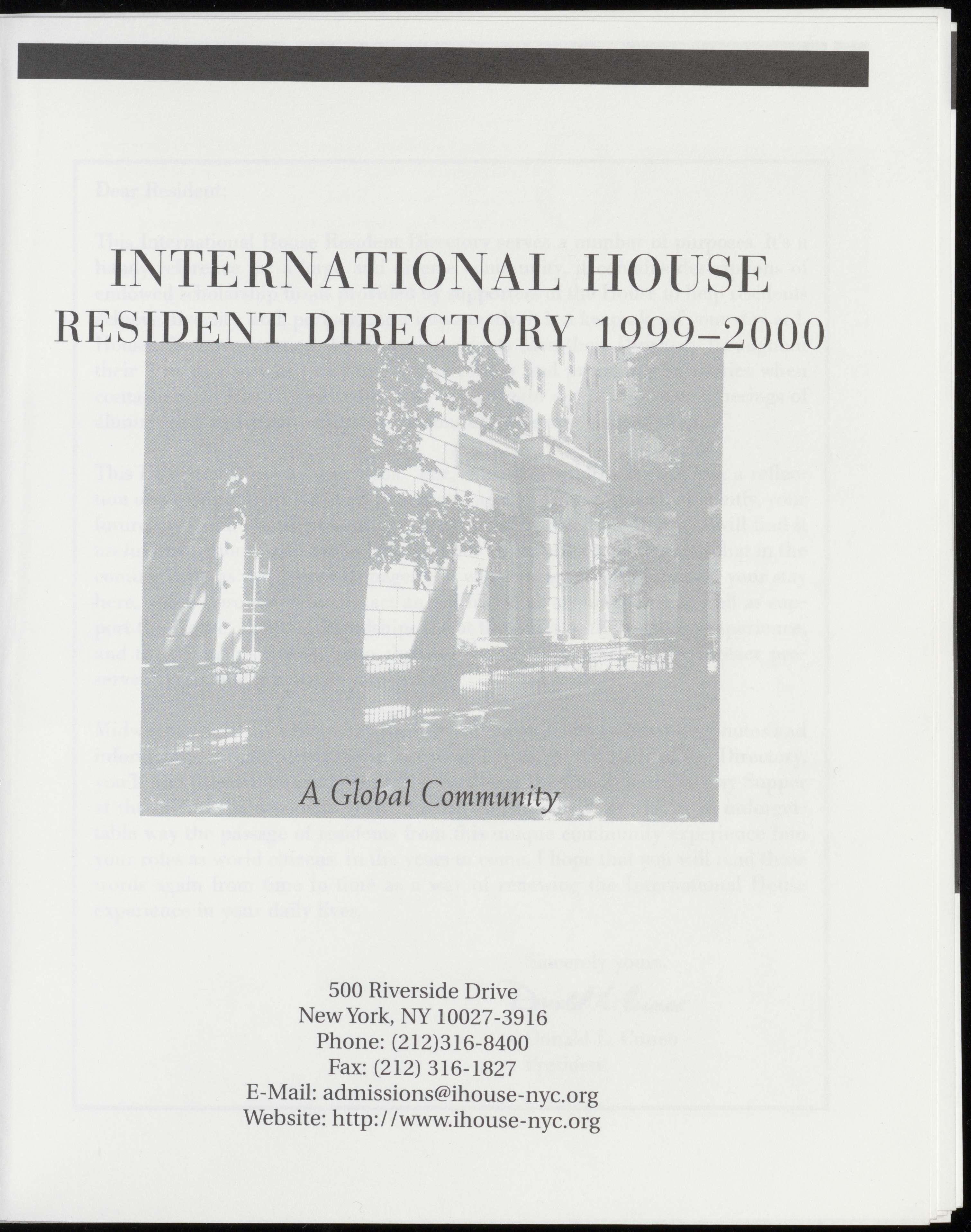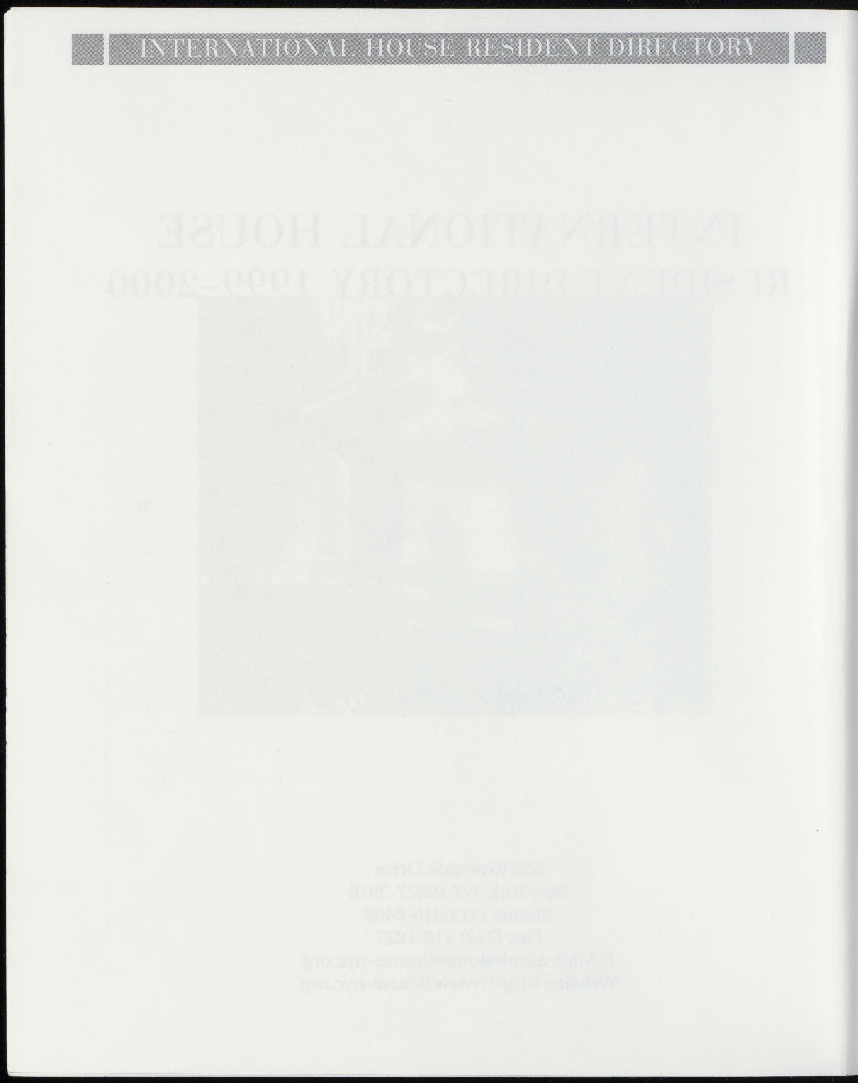 INTERNATIONAL HOUSE RESIDENT DIRECTORY 1999-2000 A Global Community 500 Riverside Drive New York, NY 10027-3916 Phone: (212)316-8400 Fax: (212) 316-1827 E-Mail: admissions@ihouse-nyc.org Website: http://www.ihouse-nyc.org