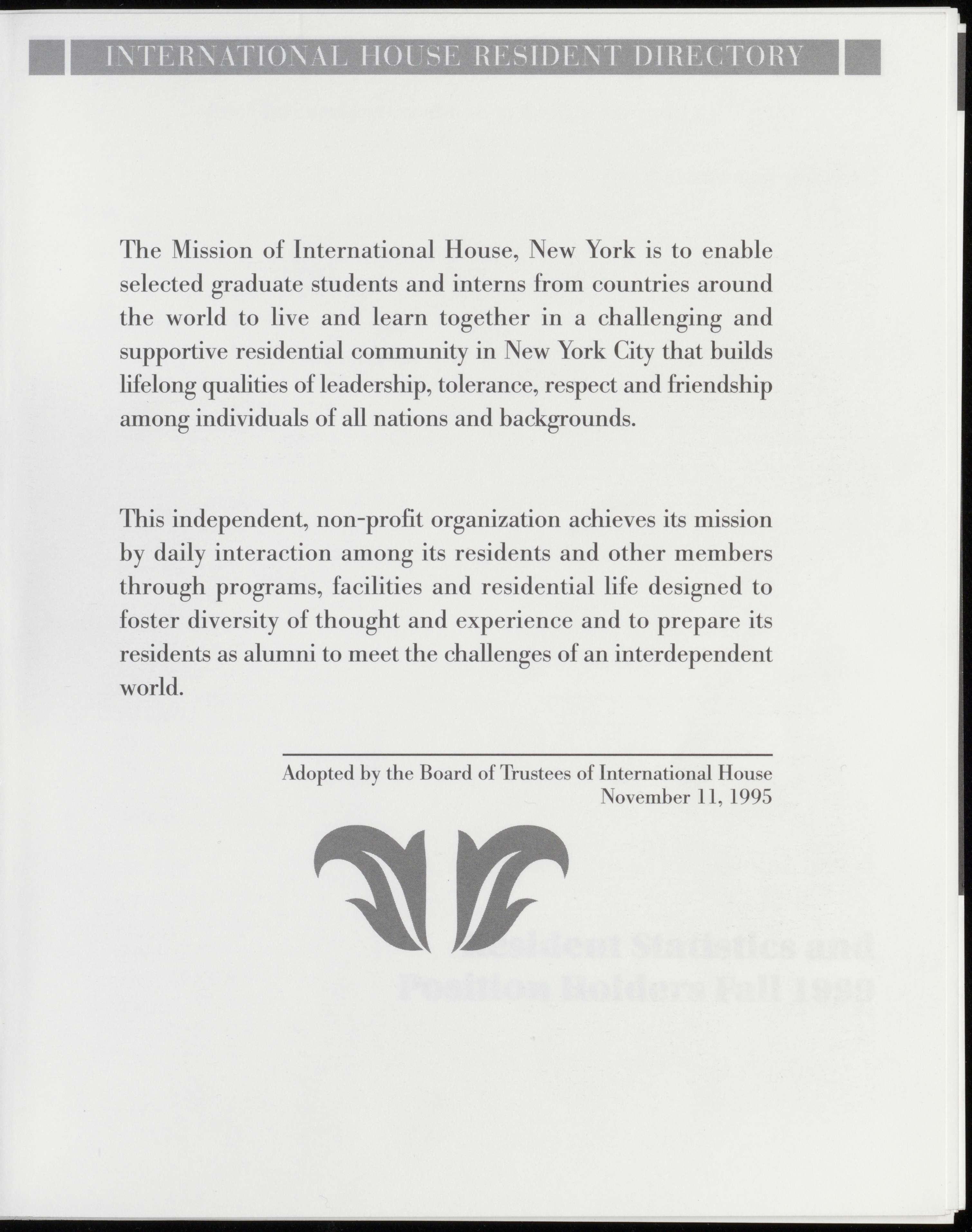 The Mission of International House, New York is to enable selected graduate students and interns from countries around the world to live and learn together in a challenging and supportive residential community in New York City that builds lifelong qualities of leadership, tolerance, respect and friendship among individuals of all nations and backgrounds. This independent, non-profit organization achieves its mission by daily interaction among its residents and other members through programs, facilities and residential life designed to foster diversity of thought and experience and to prepare its residents as alumni to meet the challenges of an interdependent world.