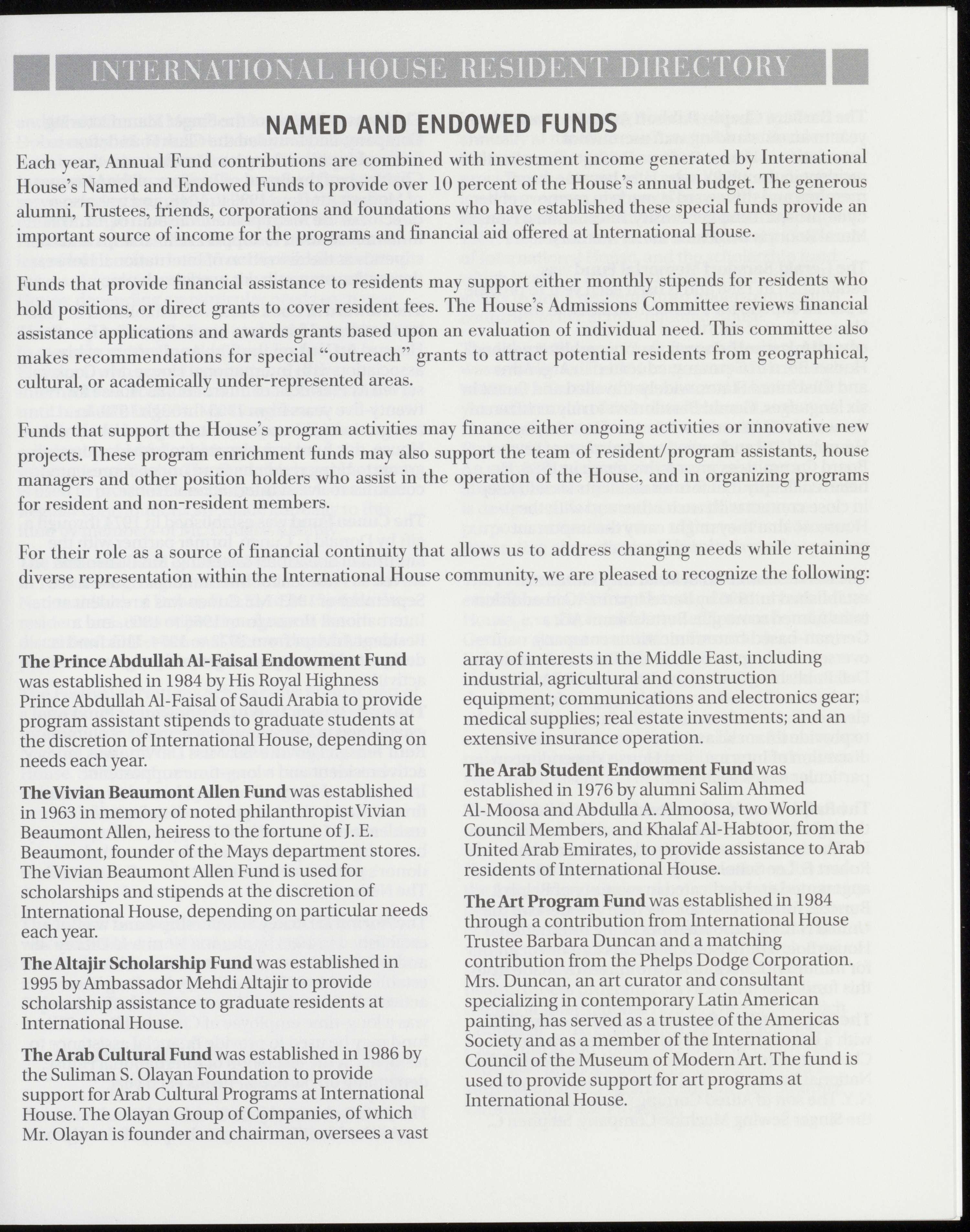This International House Resident Directory serves a number of purposes. It’s a handy reference for a large and diverse community, it contains descriptions of endowed scholarship funds provided by supporters of the House to help residents and achieve diversity, and perhaps most importantly, it is a keepsake of your stay at I. House. We have learned that former residents save their Directory throughout their lives as a way of recalling their residency and prompting memories when contacting old friends. Inevitably, they are brought out at informal gatherings of alumni for lengthy and enjoyable sessions of “whatever happened to...?”