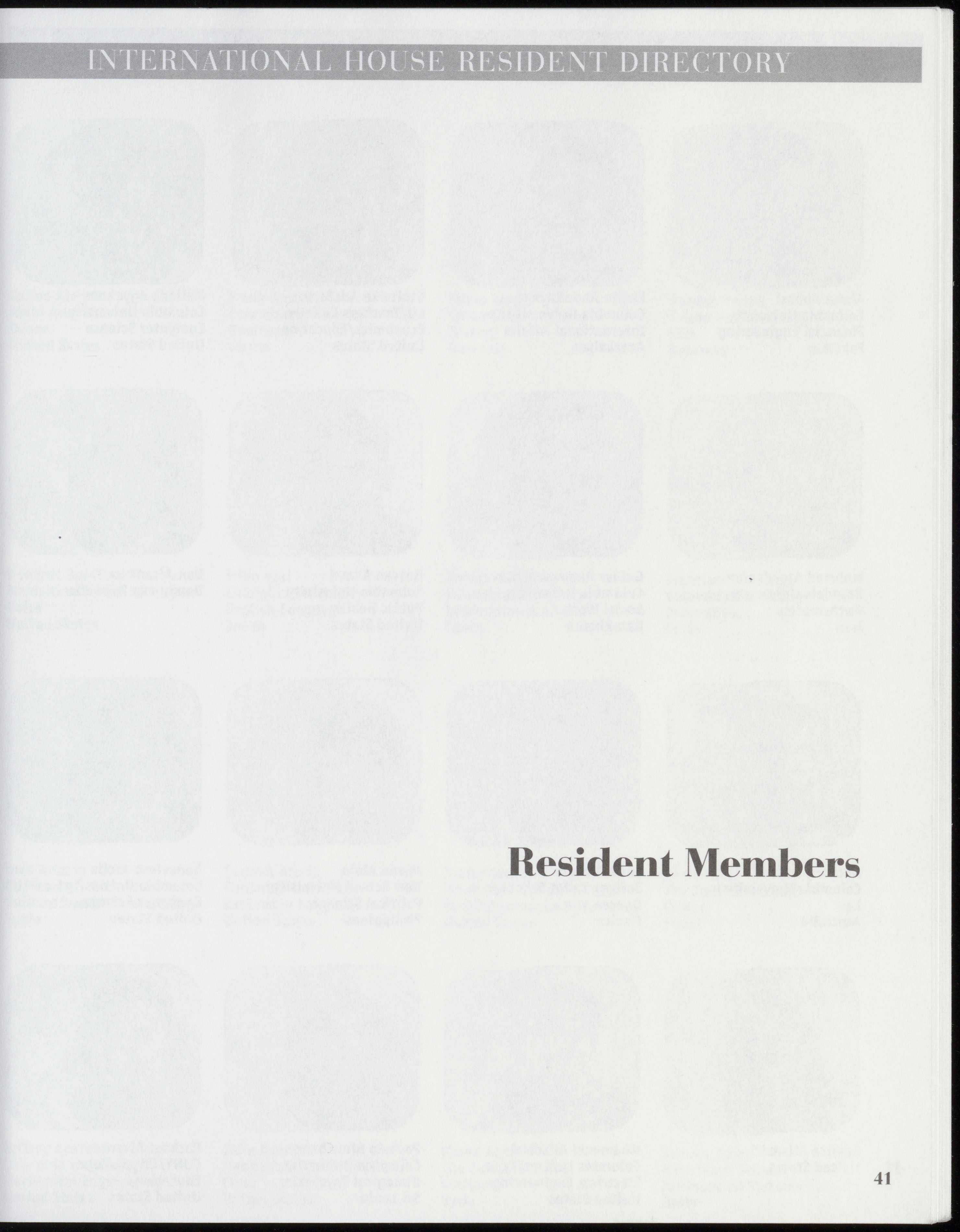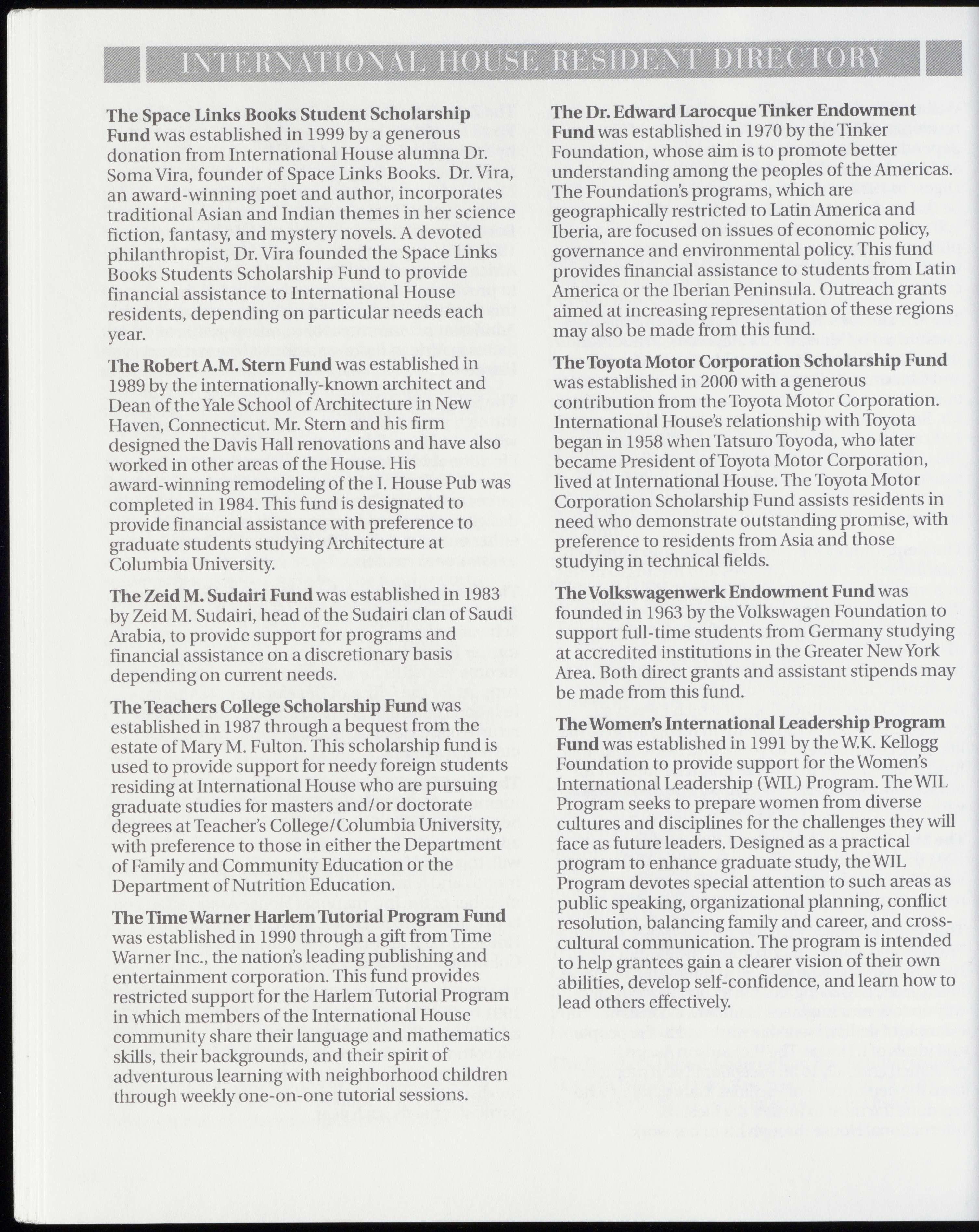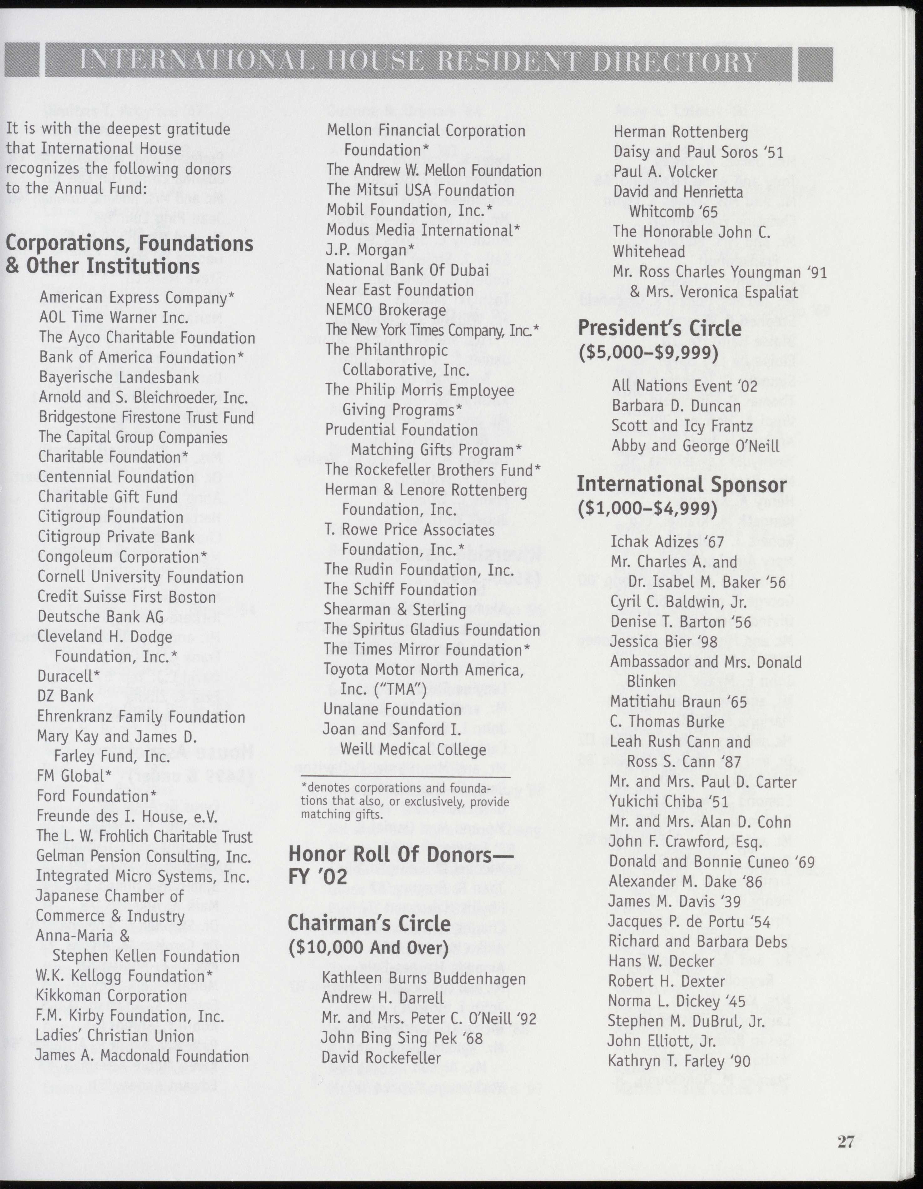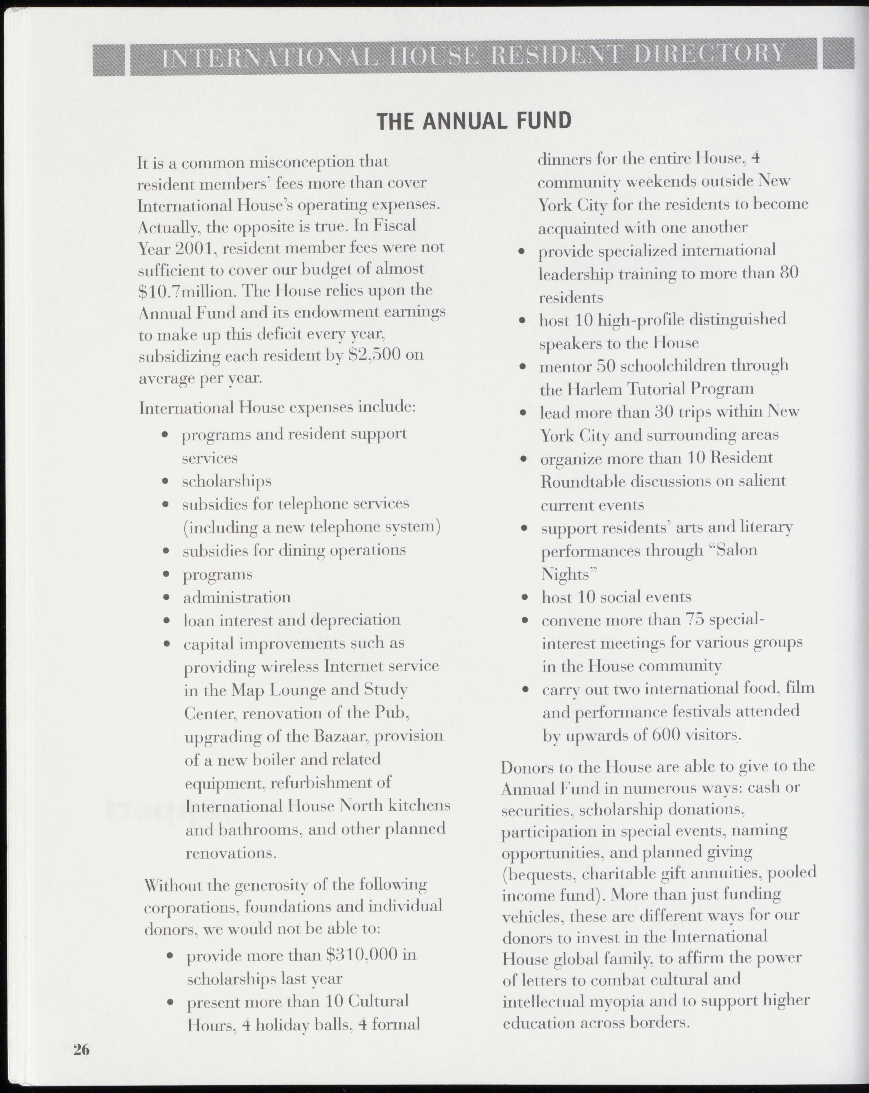 [It is a common misconception that resident members’ fees more than cover InternationalHouse’soperatingexpenses. Actually,theoppositeistrue.InFiscal Year 2001, resident member fees were not sufficient to cover our budget of almost $10.7million. The House relies upon the Annual Fund and its endowment earnings tomake upthisdeficiteveryyear, subsidizing each resident by $2,500 on average per year.