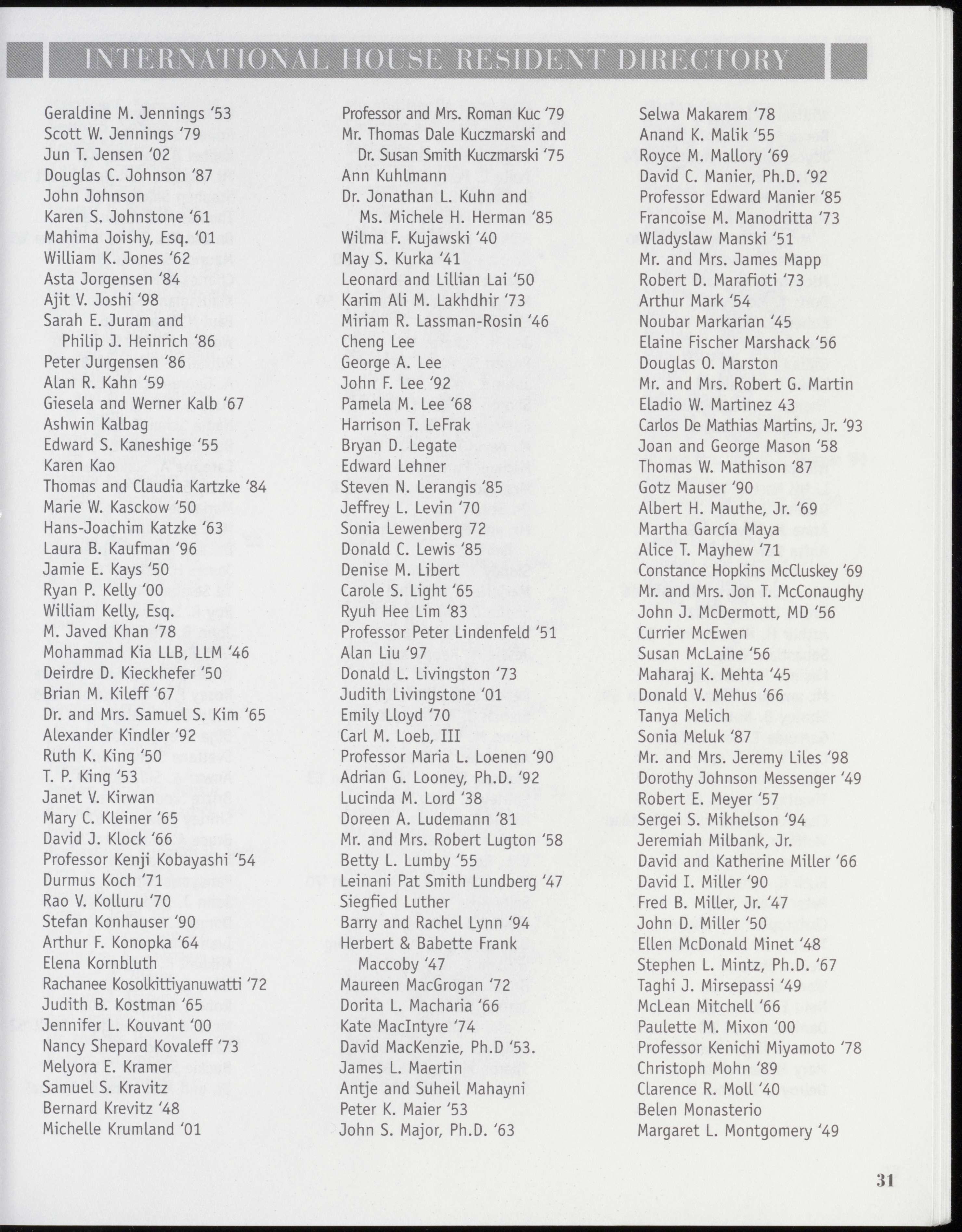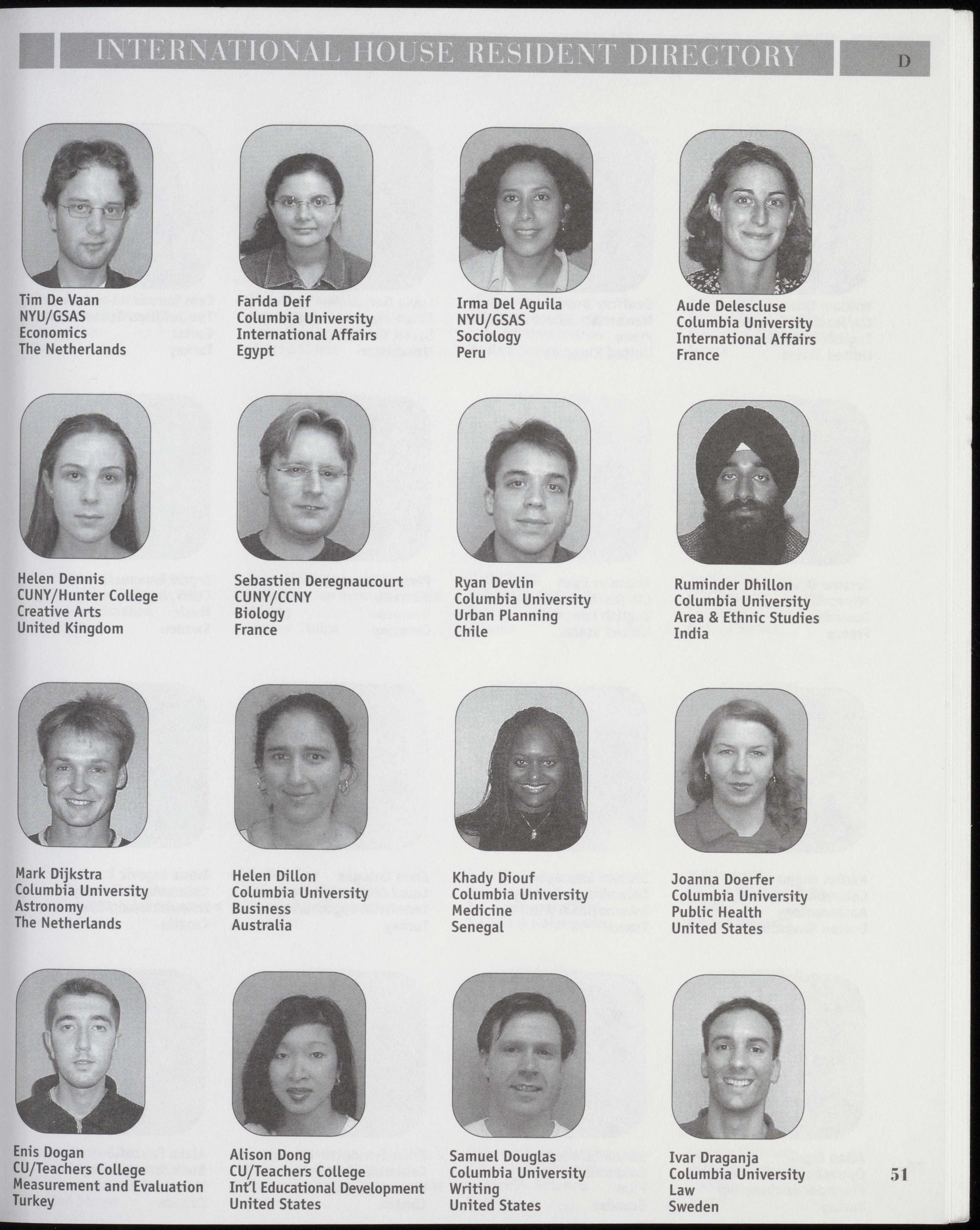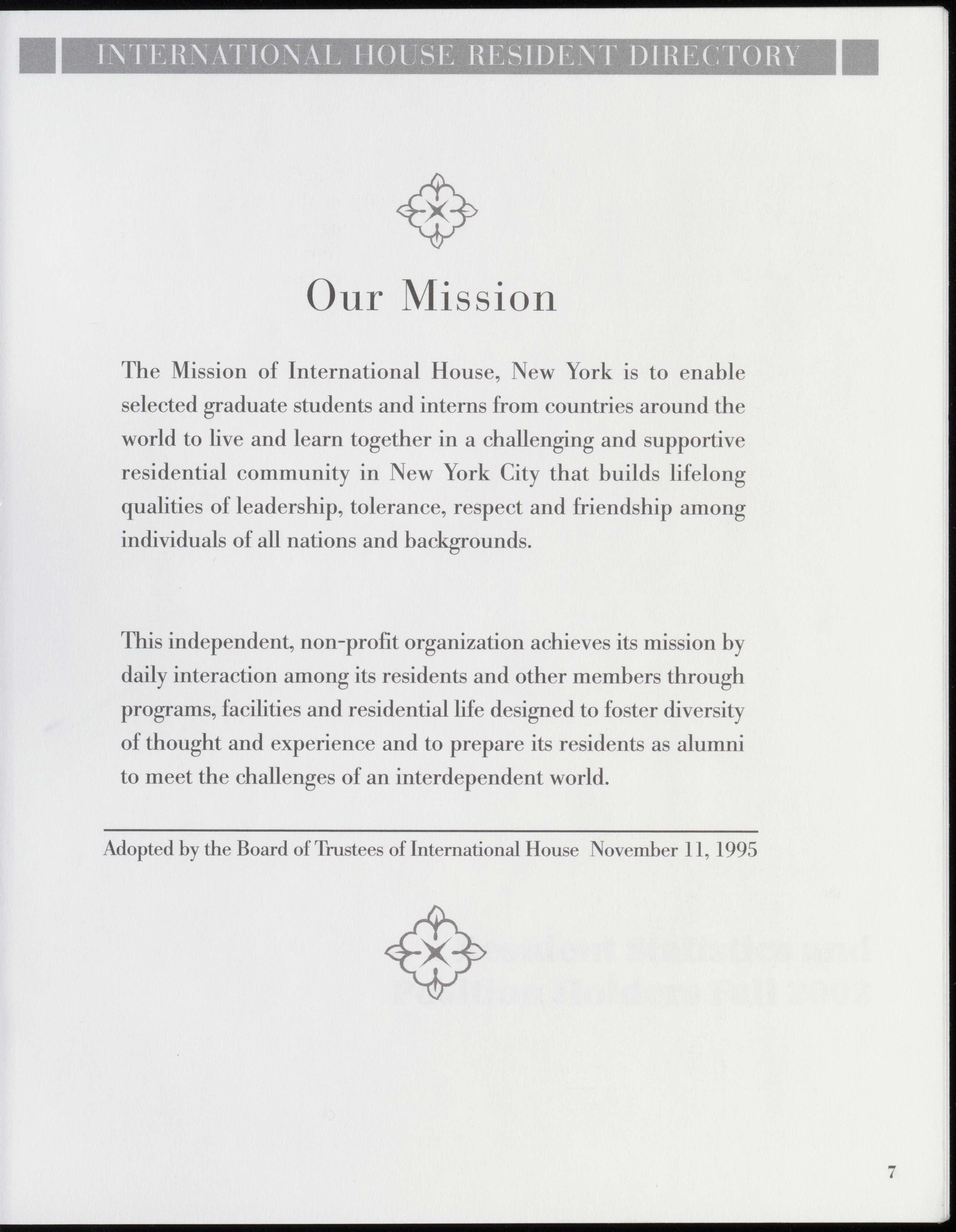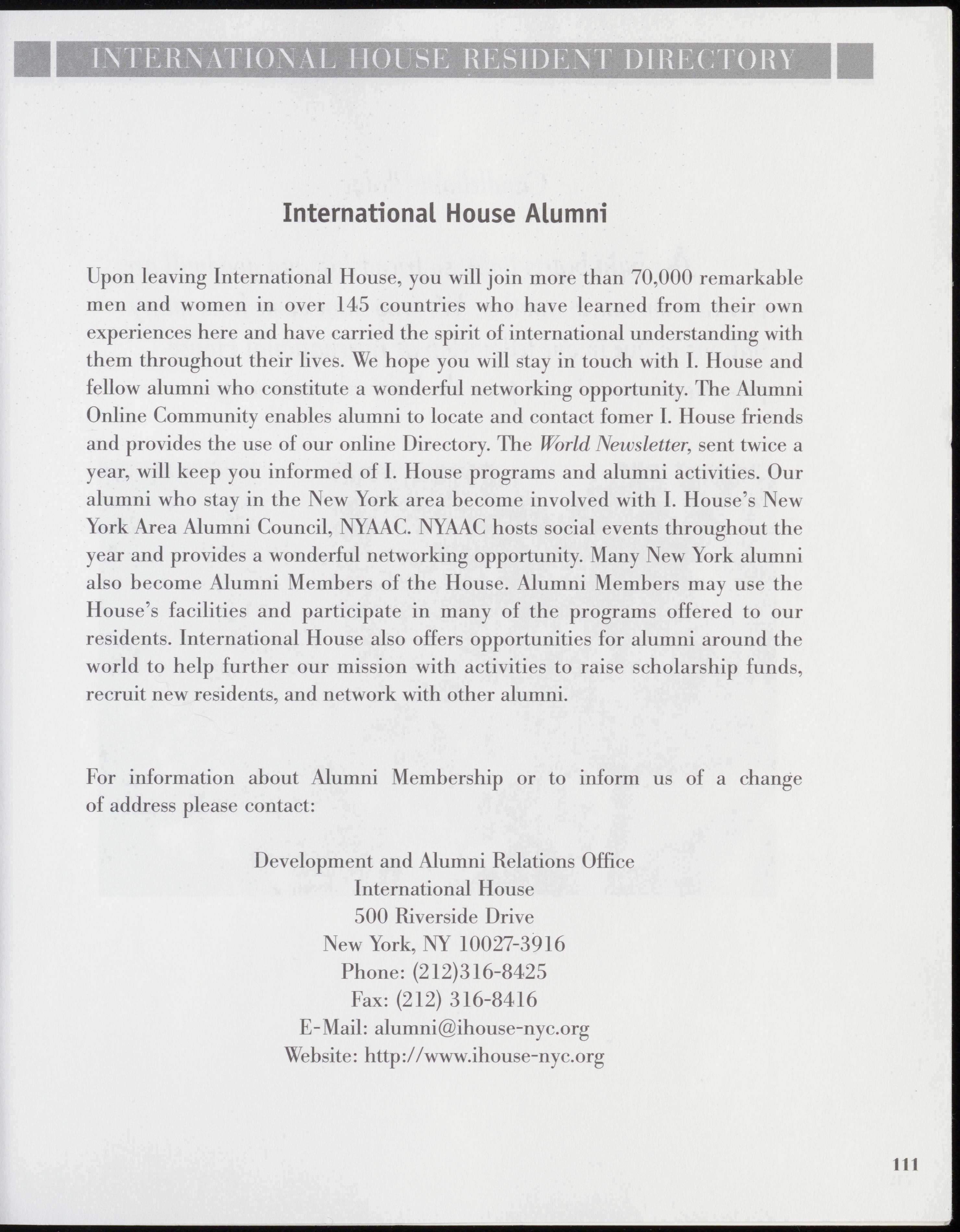 [It is a common misconception that resident members’ fees more than cover InternationalHouse’soperatingexpenses. Actually,theoppositeistrue.InFiscal Year 2001, resident member fees were not sufficient to cover our budget of almost $10.7million. The House relies upon the Annual Fund and its endowment earnings tomake upthisdeficiteveryyear, subsidizing each resident by $2,500 on average per year.