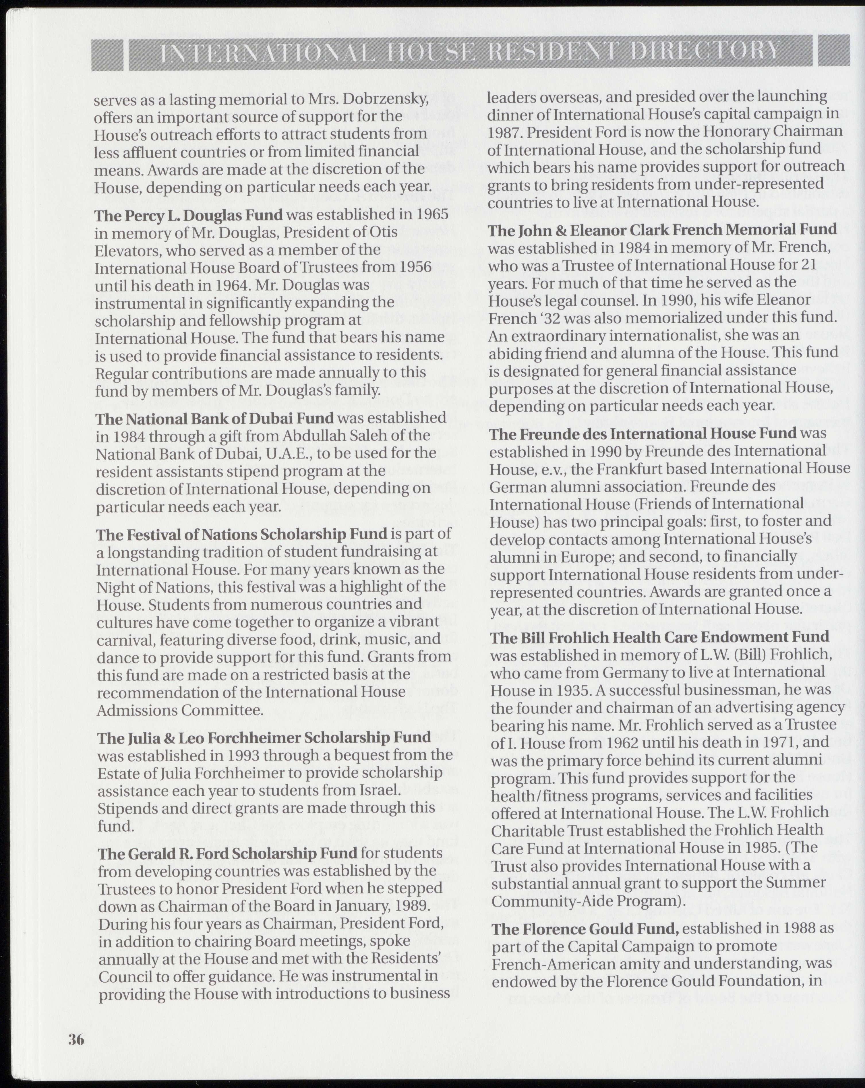 Donors to the House are able to give to the Annual Fund innumerous ways: cashor securities, scholarship donations, participation in special events, naming opportunities, and planned giving (bequests, charitable gift annuities, pooled income fund). More thanjust funding vehicles, thesearedifferentways forour donors to invest in the International House global family, to affirm the power of letters to combat cultural and intellectual myopia and to support higher education across borders.