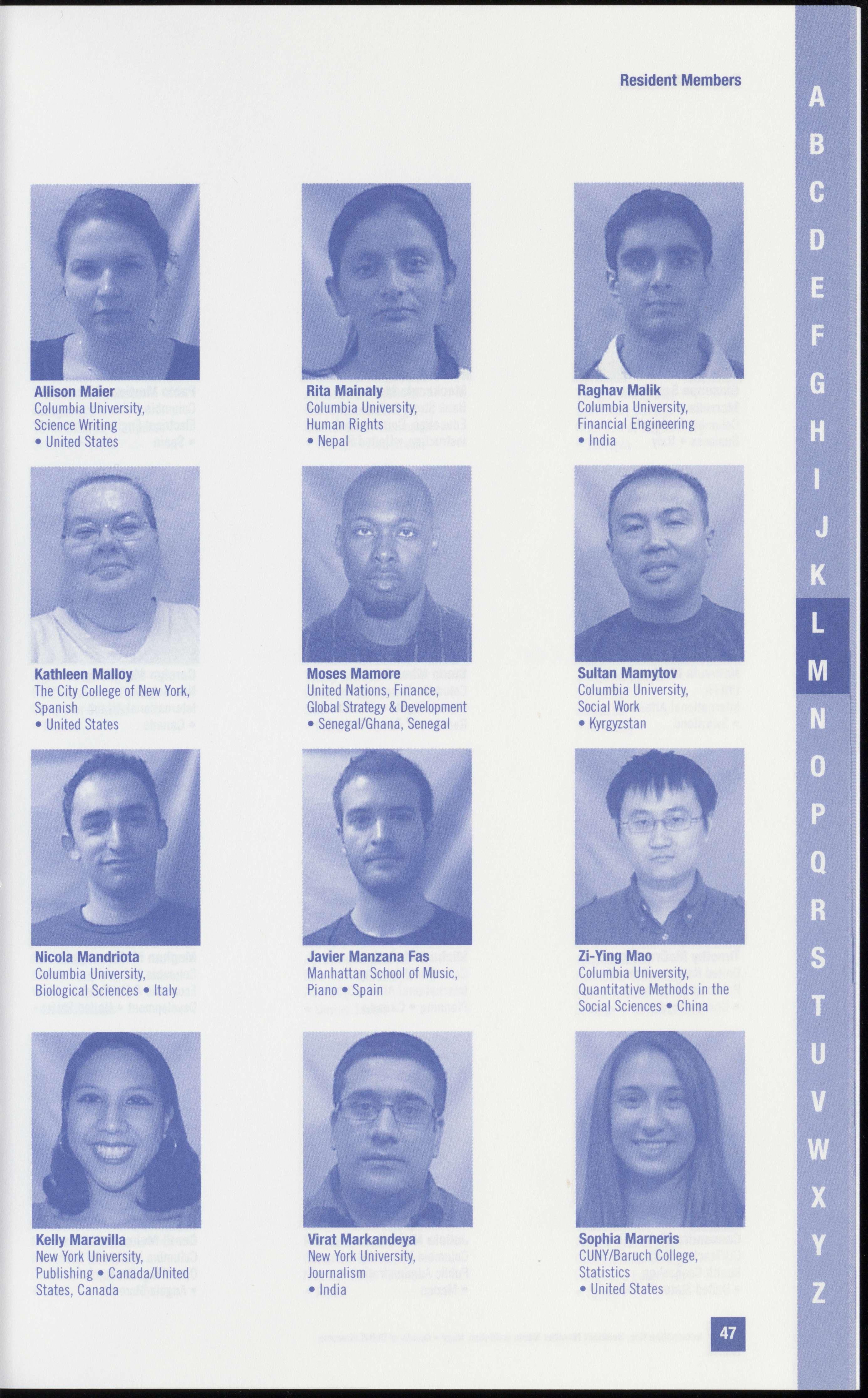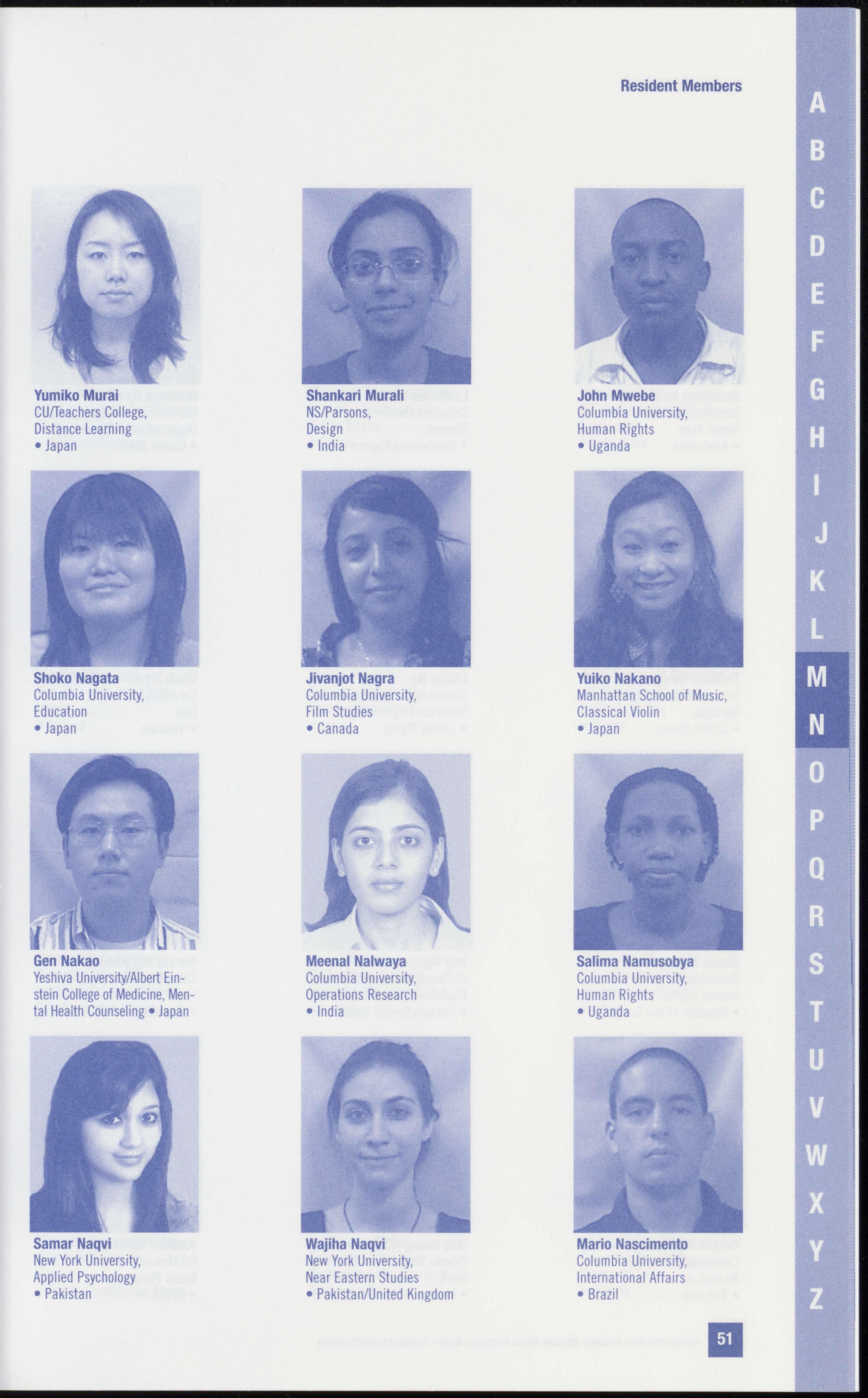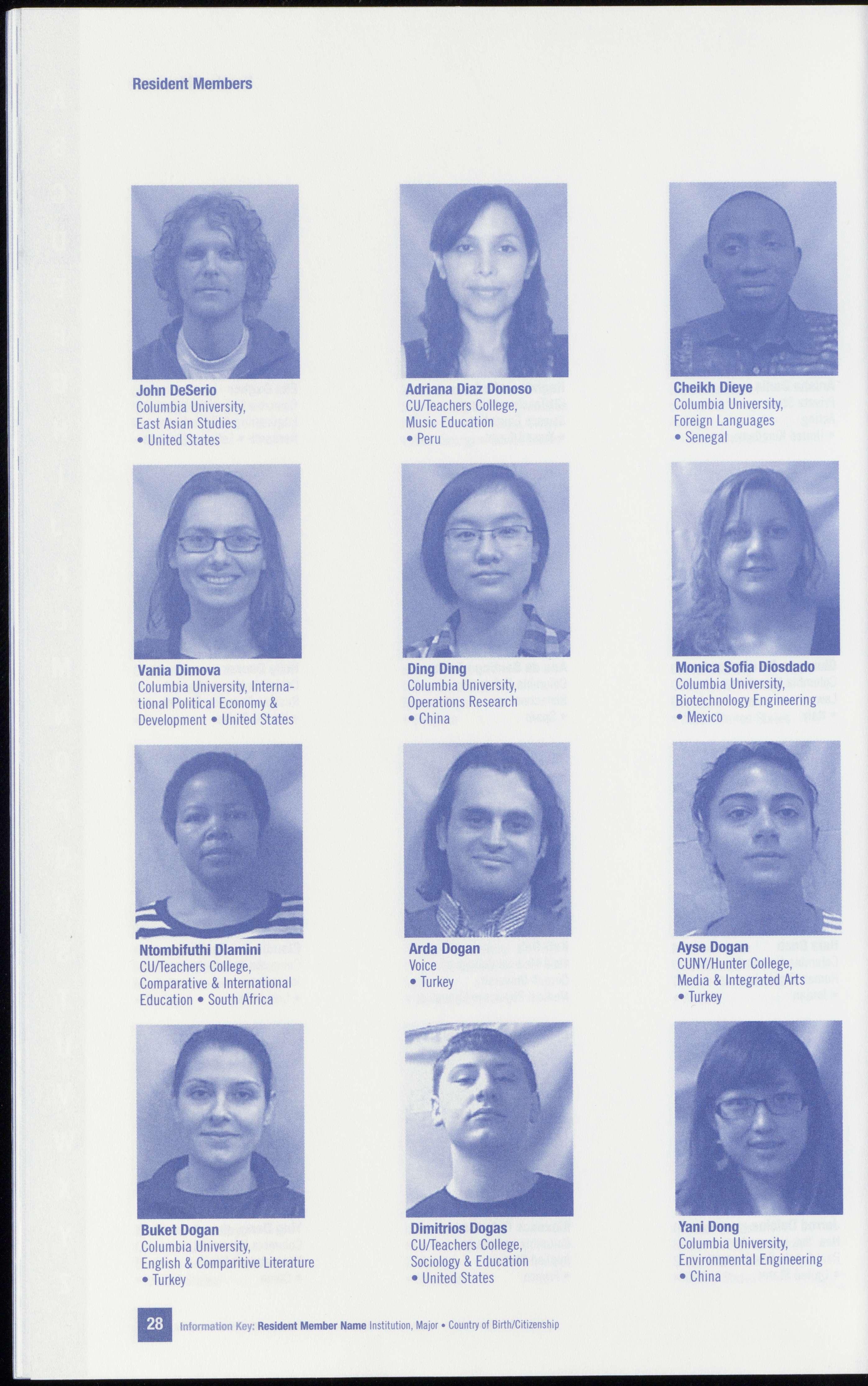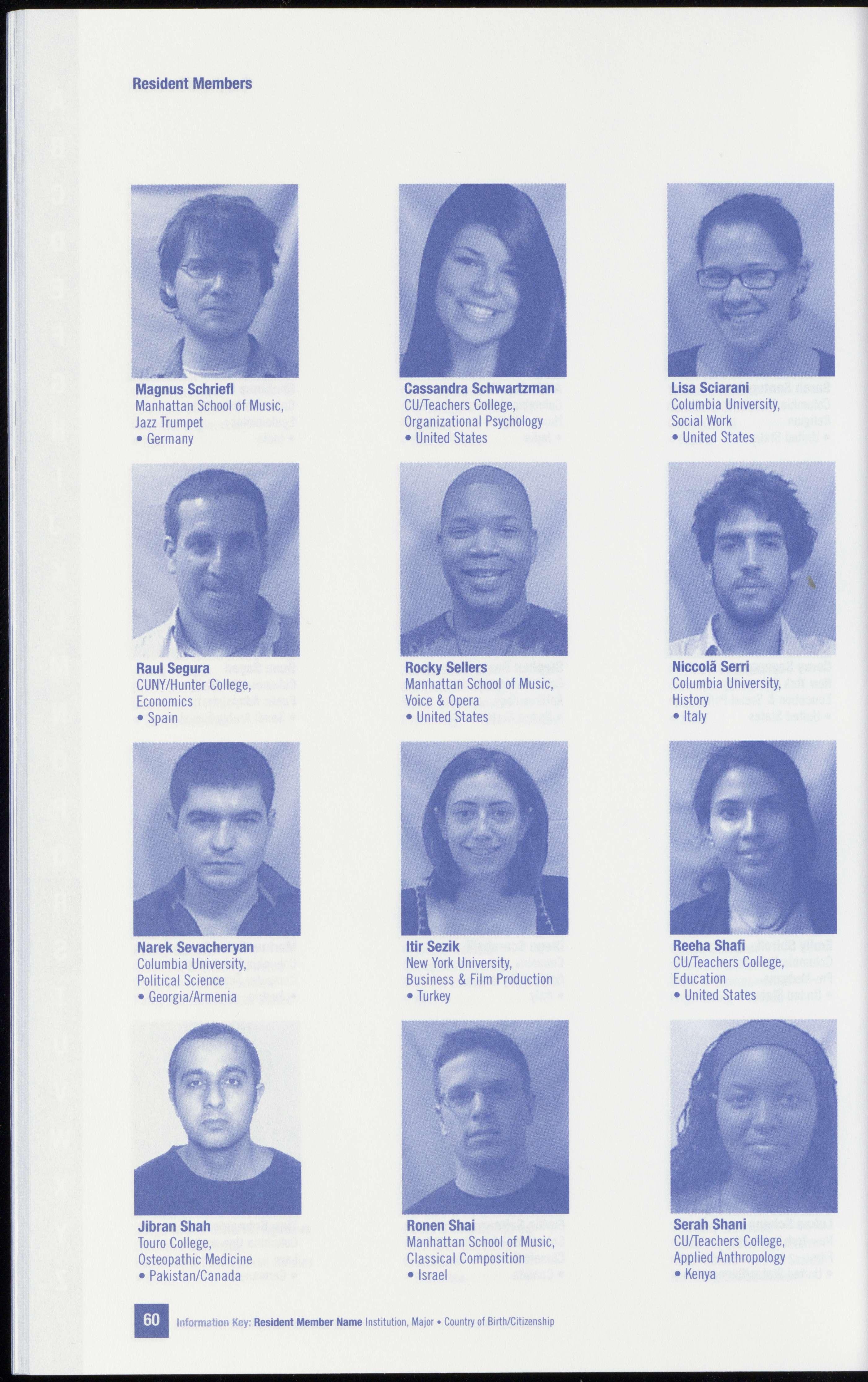 Midway through the year, an addendum will be published containing photos and information about resident members who arrive mid-term. In the back ofthe Directory you'll find printed the pledge, which is recited at the Candlelight Sunday Supper at the end of each academic year. This moving ceremony marks in an unforgettable way the passage of resident members from this unique community experience into your roles as global citizens. In the years to come, hope that you will read these words again from time to time as a way of renewing your International House experience and its mission in your daily lives.