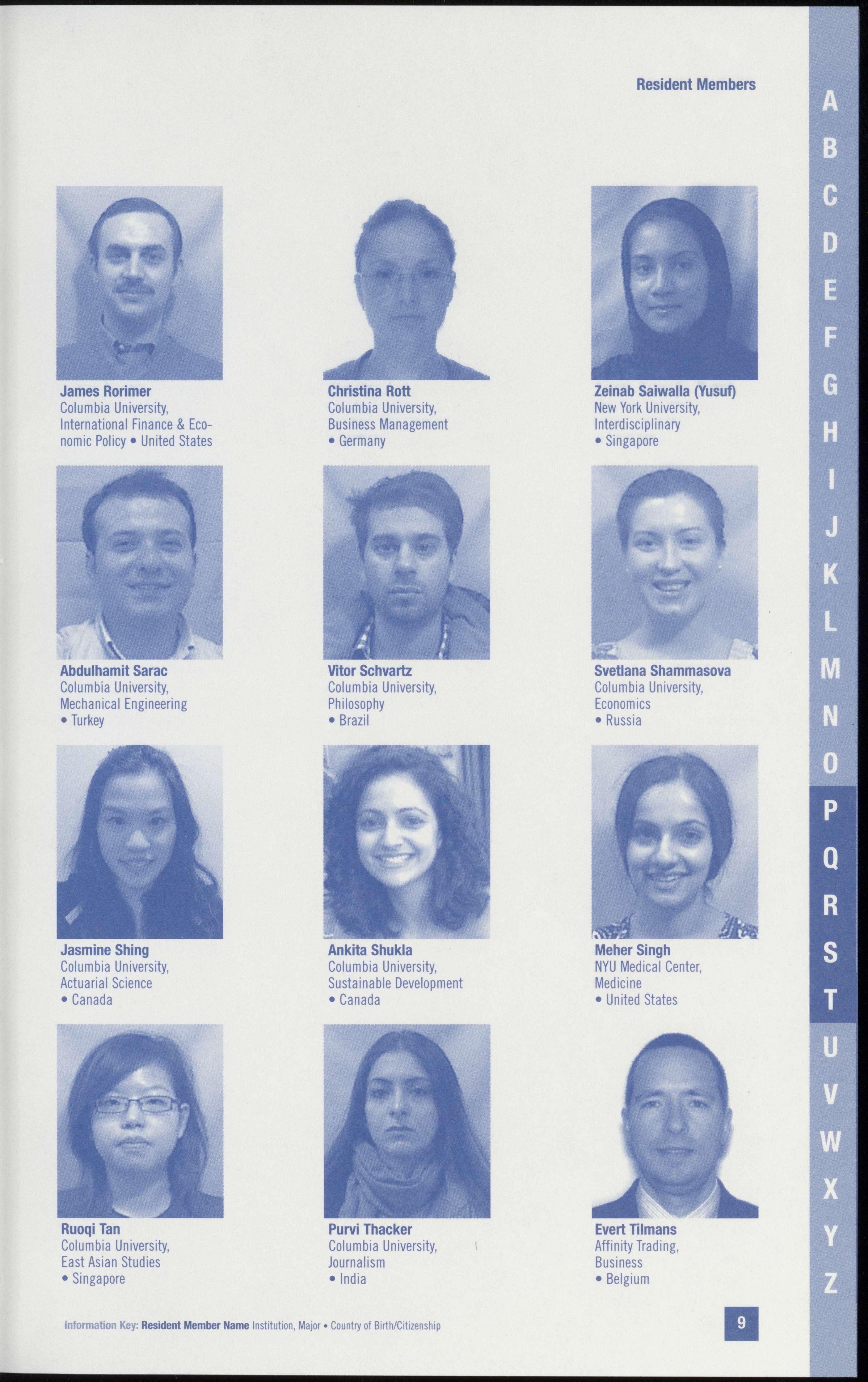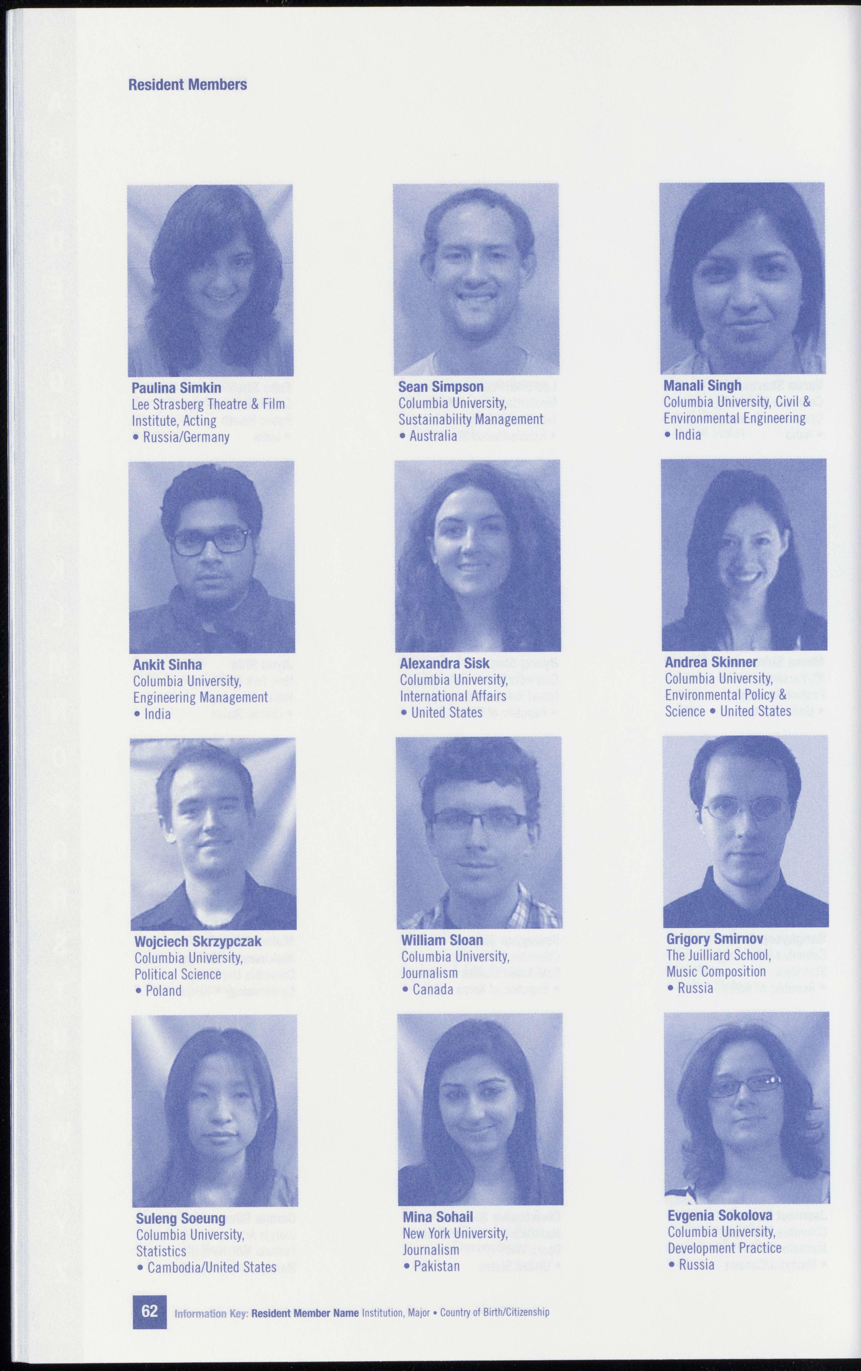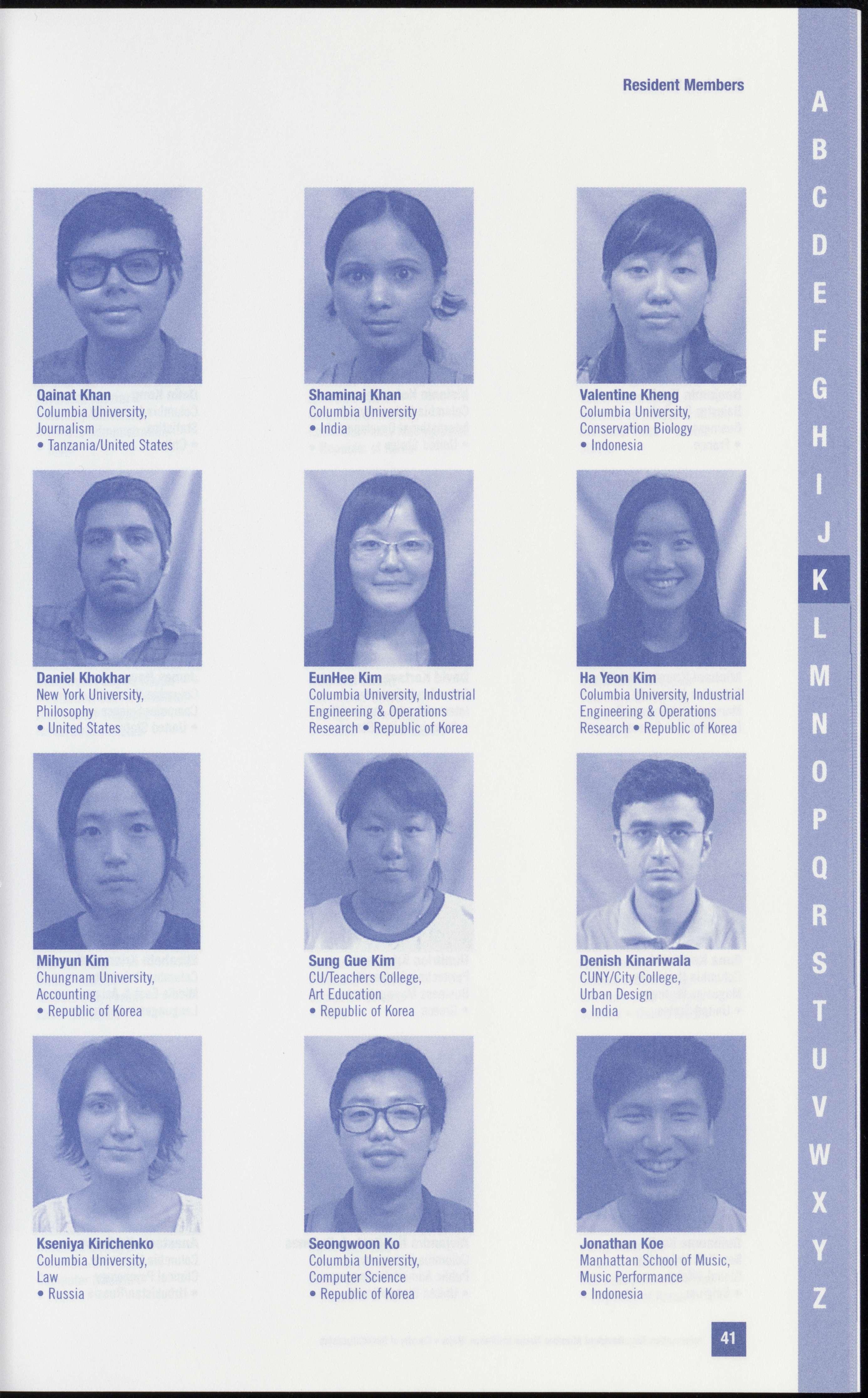 The Directory is not a “year book” nor, since it is published each fall, a reflection of a year gone by. Rather, it anticipates a year to come and, significantly your future lives as |-House alumni and world citizens. We hope that you will find it useful throughout your resident membership to help knit our global community together, and that in the coming years, as you peruse its pages, you will remember with fondness your experience here, and be encouraged to contact an old friend or acquaintance, as well as support the House. Lifelong friendships and cross cultural interaction are at the heart of the |-House community experience, and this visual record —a “snapshot” of our community in 2011-12— forever preserves a time and place in our lives.