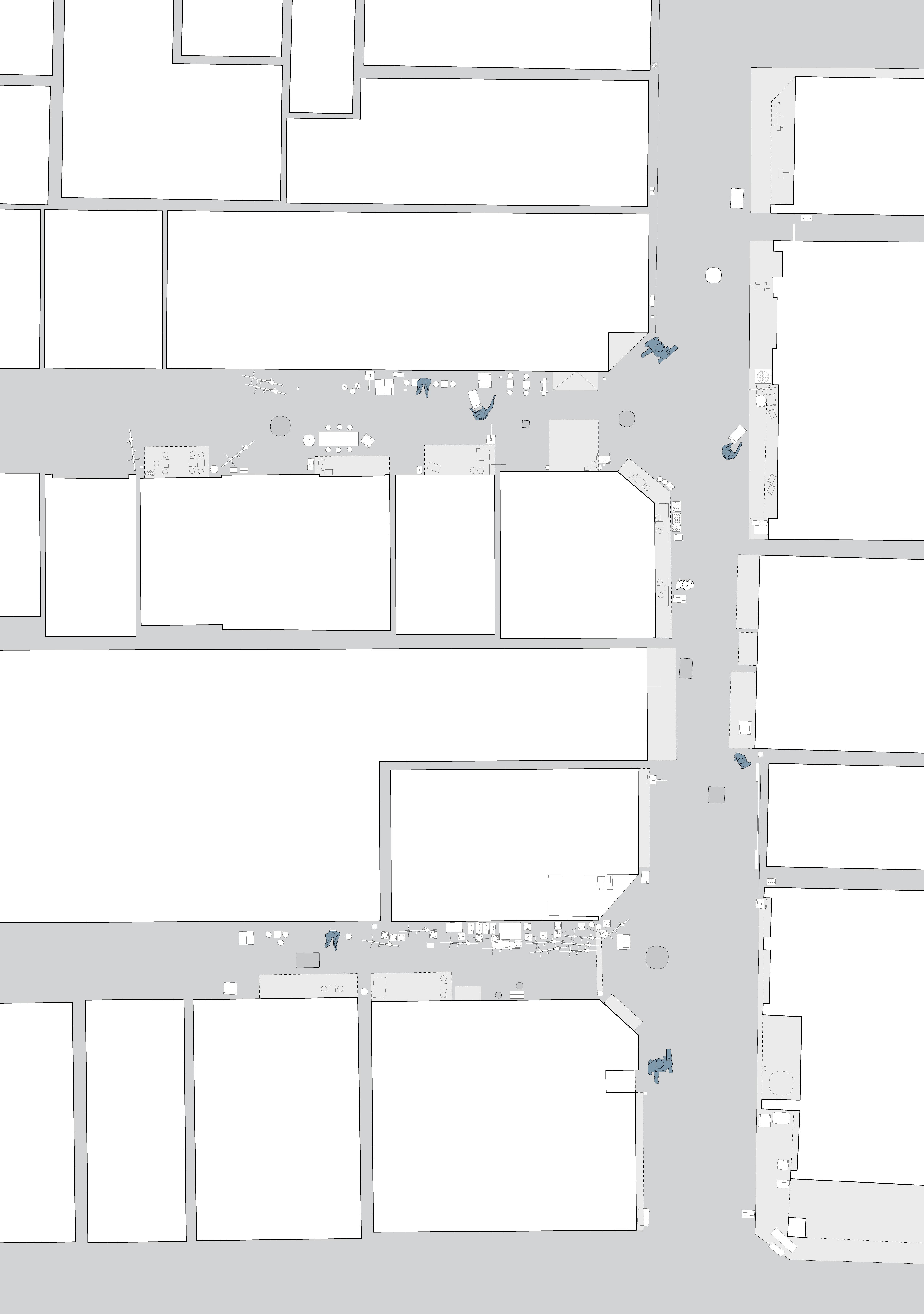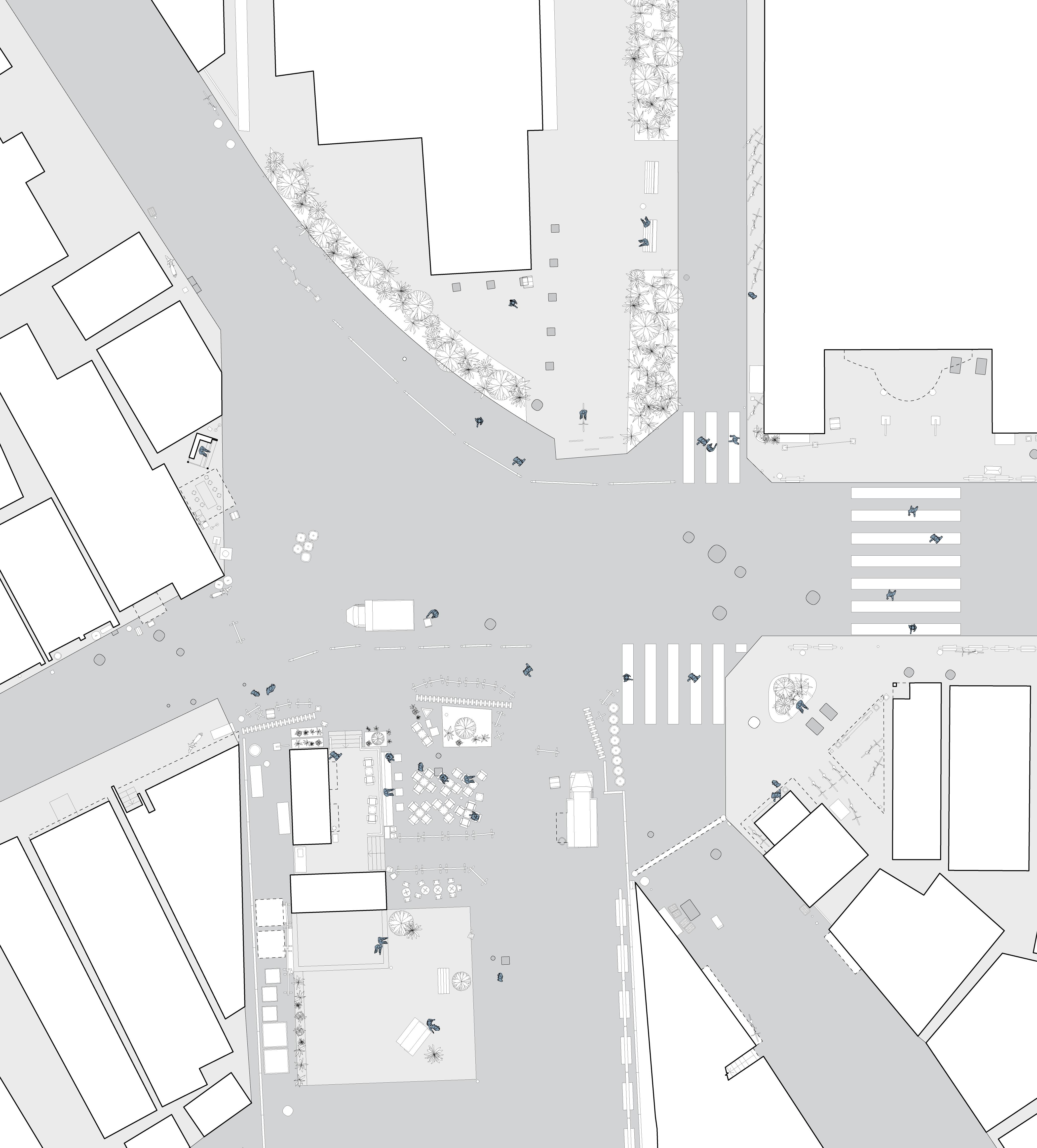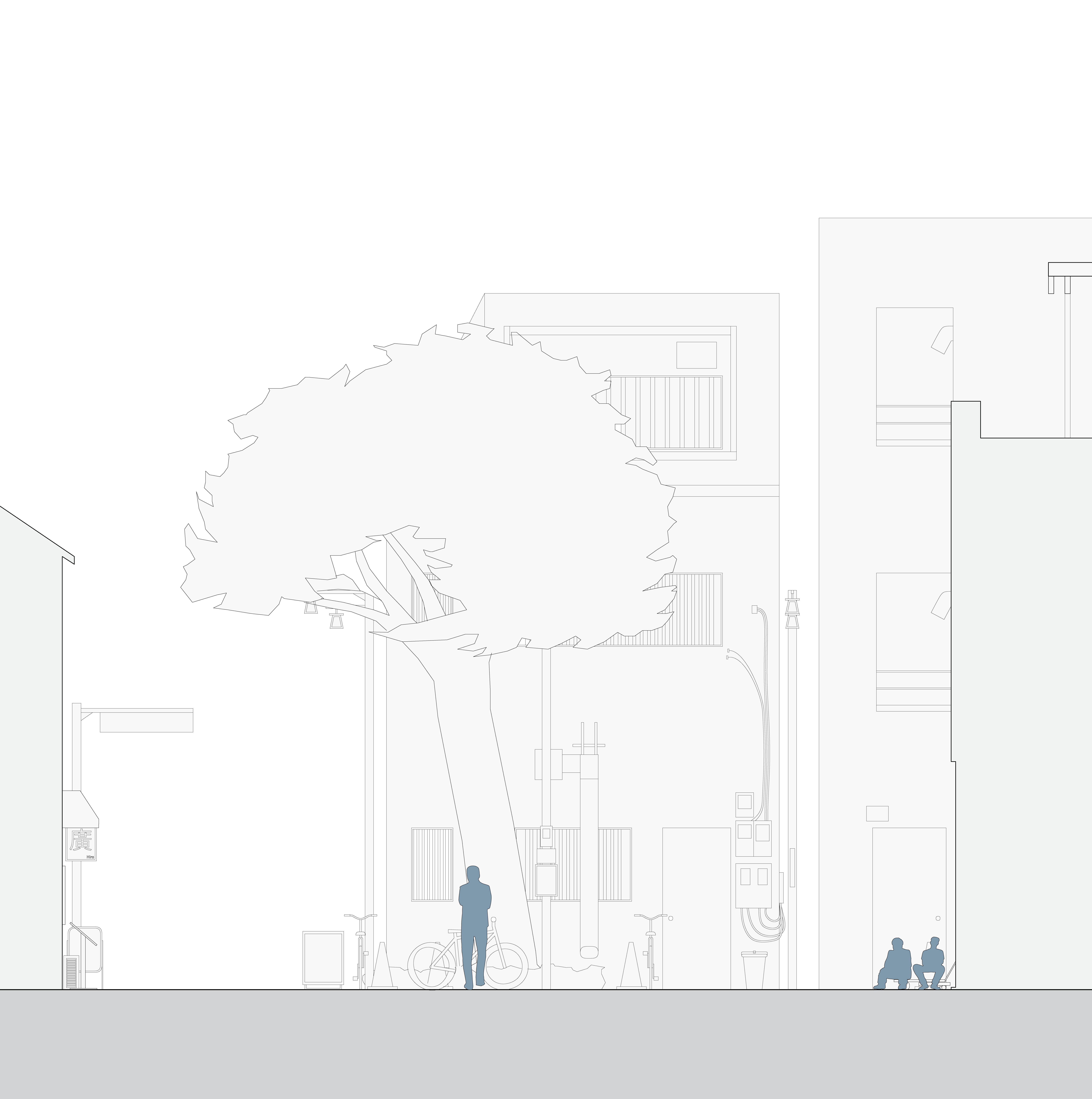 In the book Emergent Tokyo: Designing the Spontaneous City , Almazán and McReynolds note that “micro-scale choices and actions of its residents” shape urban cityscapes. [16] A documentation of street corners, crossroads, and open spaces can be a method to study how human-scale choices and interactions become typical and essential in the way people use the space. We have adapted our knowledge of architectural drawing to hopefully portray the messiness and informality of people utilising these spaces. By mapping out the physical objects in the spaces we investigate, we understand more than the rules and regulations that govern that space, but also the different possibilities that inhabitants can use the space for, whether rule-conforming or not. Through understanding these small to medium-scale spaces, we strive to understand the current “urban norm” within these cities.