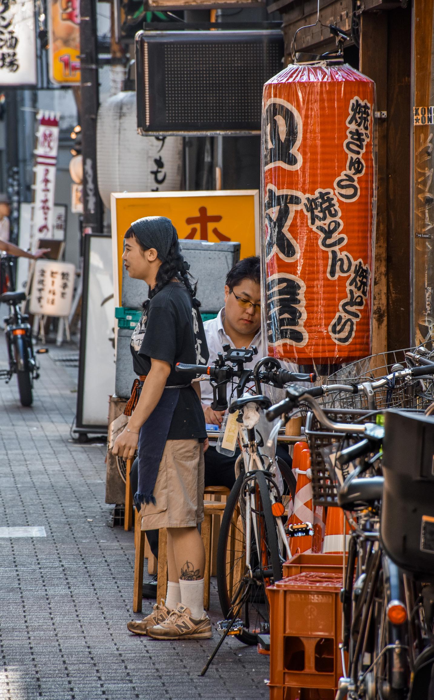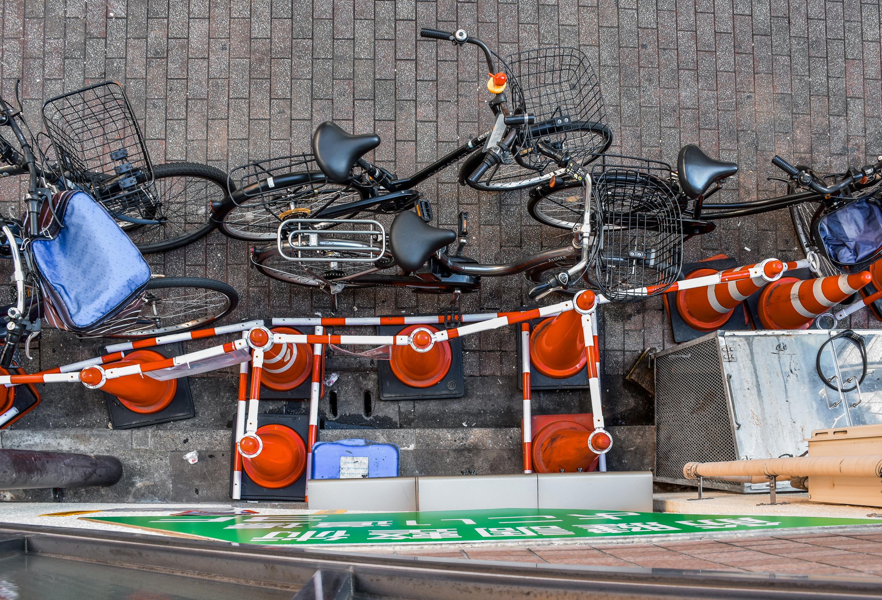 The side alley of Go-ban Gai is less busy than the one to its north, but around 10 bicycles are parked in an area with clear "no parking" signs. Traffic cones attempt and fail to prevent parking along the north side of the alley. Some tables and chairs are set up along the south.