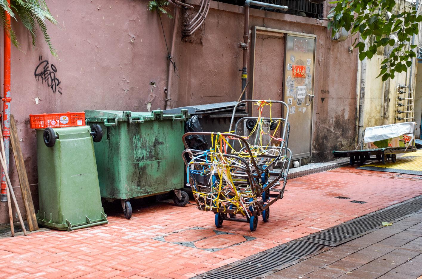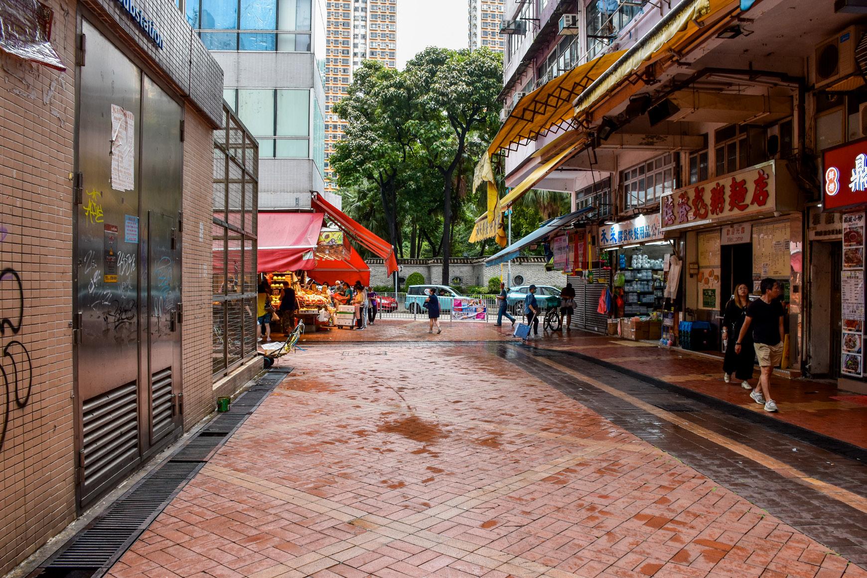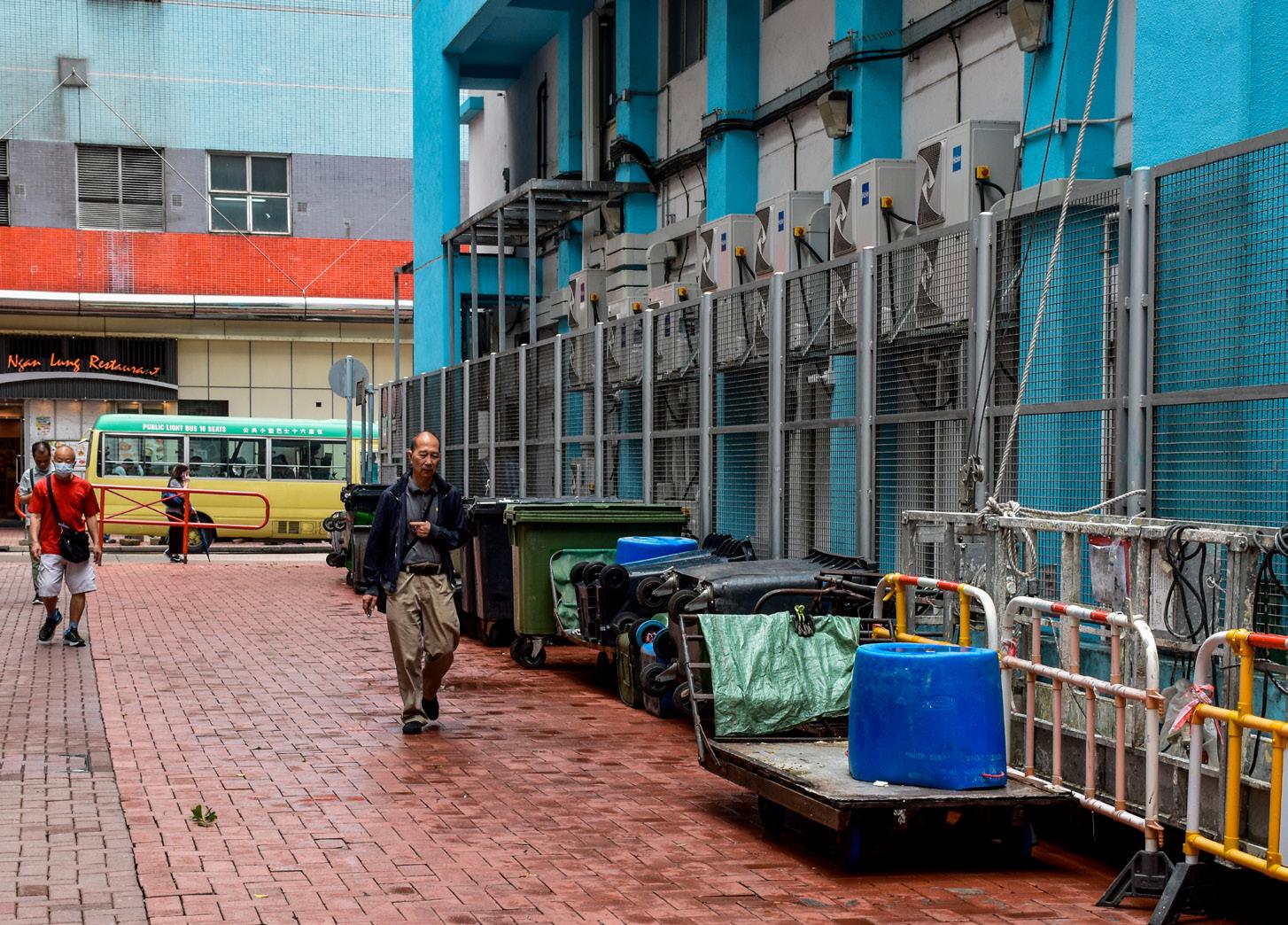 Frequent loading and unloading occur outside valid parking spaces in the car park, servicing shops within the square. Workers sit on the steps in front of shops to the east, while chefs and street cleaners can be seen sitting and napping on benches.The playground to the south is frequented by children, domestic helpers, and the elderly alike. The back alleys are relatively clean, even with construction scaffolding to the wes t.
