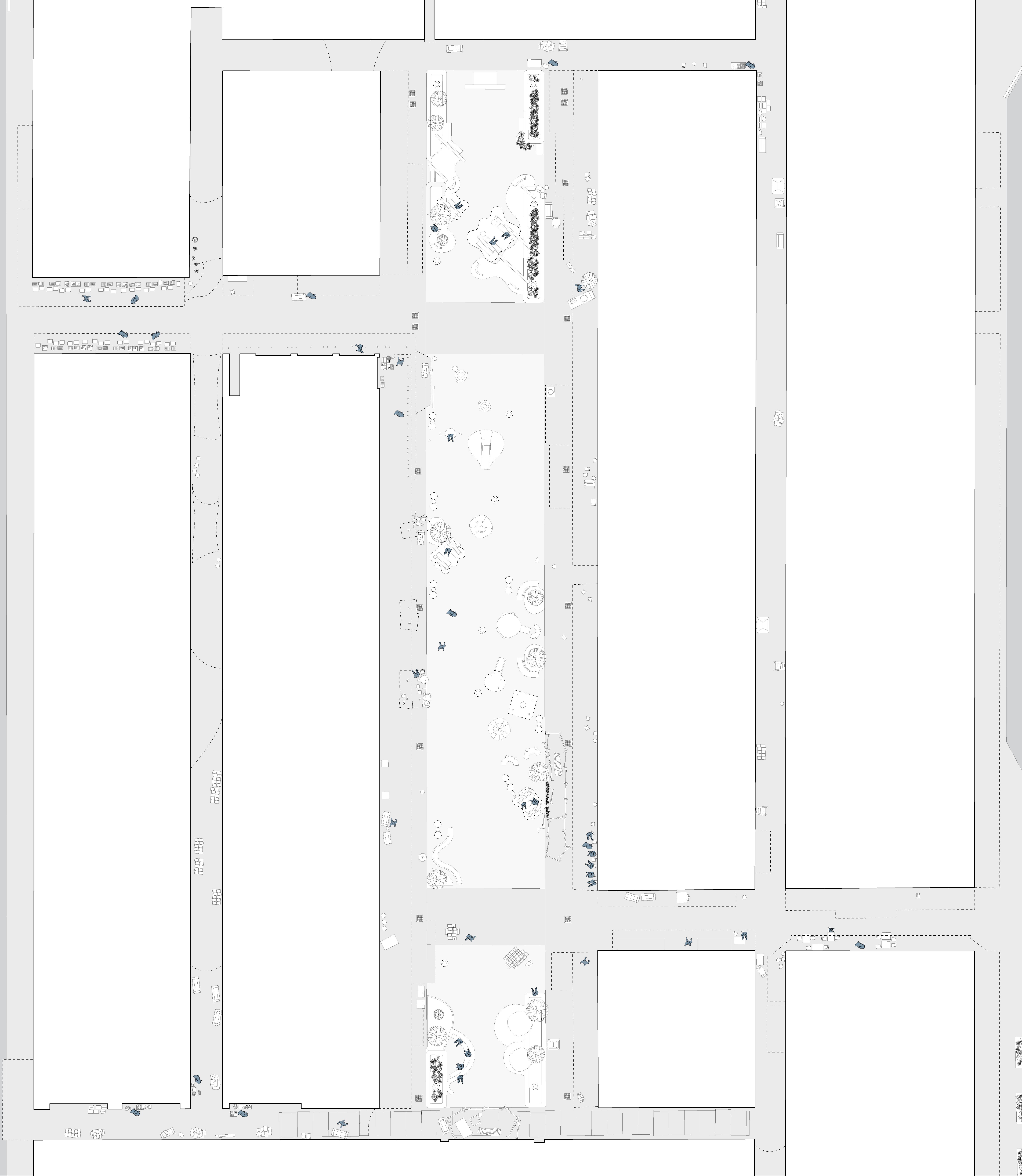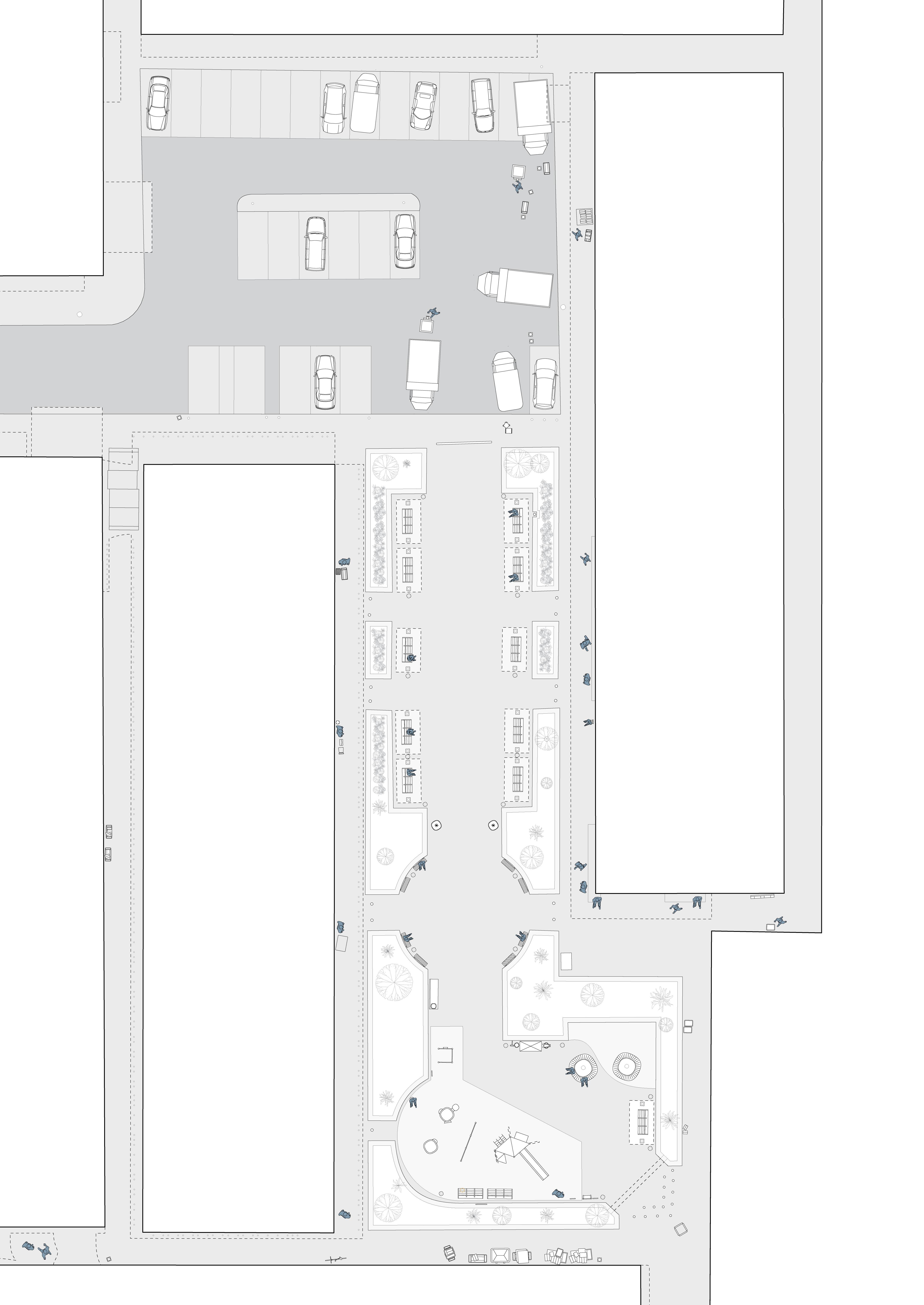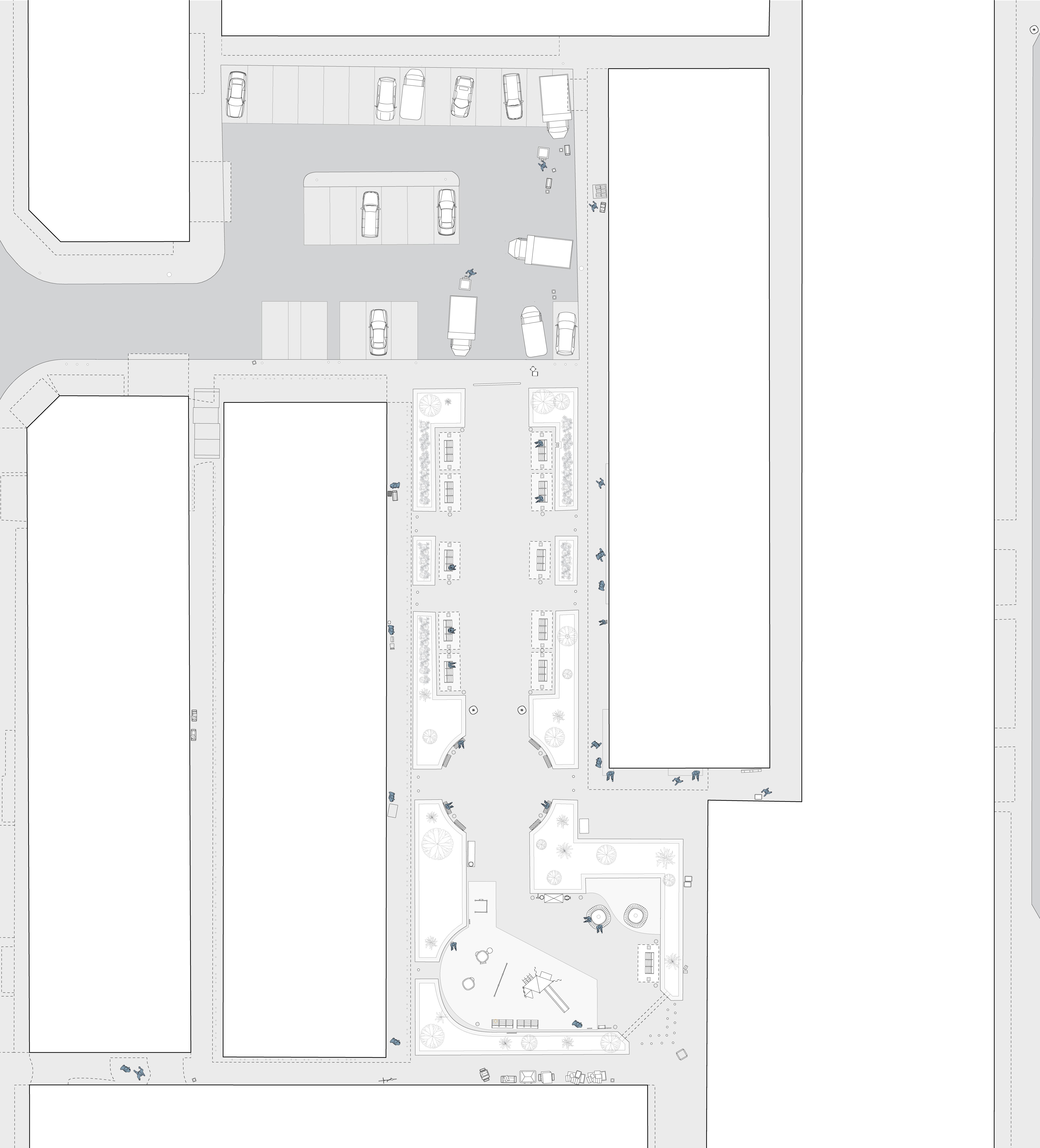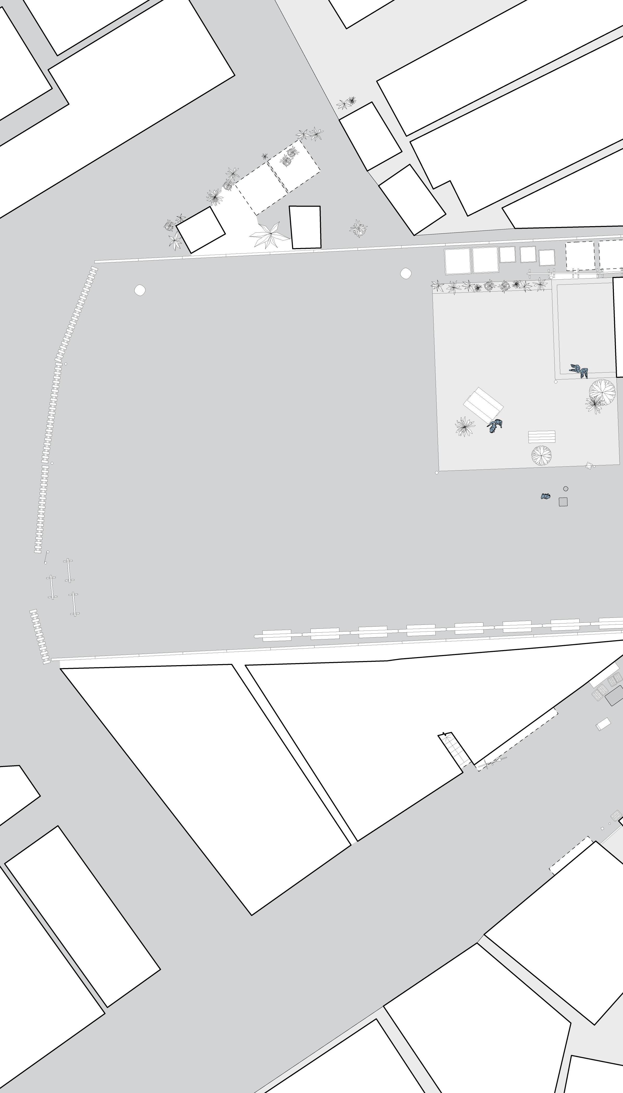 storage. For instance, Tai Pei Square includes a small playground and integrates with an adjacent carpark, serving local residents, store owners transporting goods, and commercial workers seeking rest. Yi Pei Square offers resting benches and a large open playground, particularly used by local children, elderly, and store owners. On the other hand, Sam Pei Square and Sze Pei Square exhibit a more program-specific approach, with little to no designs allowing for informal gatherings. This is evidenced by the fenced-off recreational equipment in Sam Pei Square, separate from the largely vacant corridor of space facing shops. Both Sam Pei Square and Sze Pei Square are often utilised by surrounding businesses for storage and product display, sometimes at the expense of improvised human interaction. Aside from the trash depot in Sze Pei Square, the presence of polystyrene box waste and products from surrounding restaurants and shops spill onto the sides of these squares, creating an even more undesirable social space.