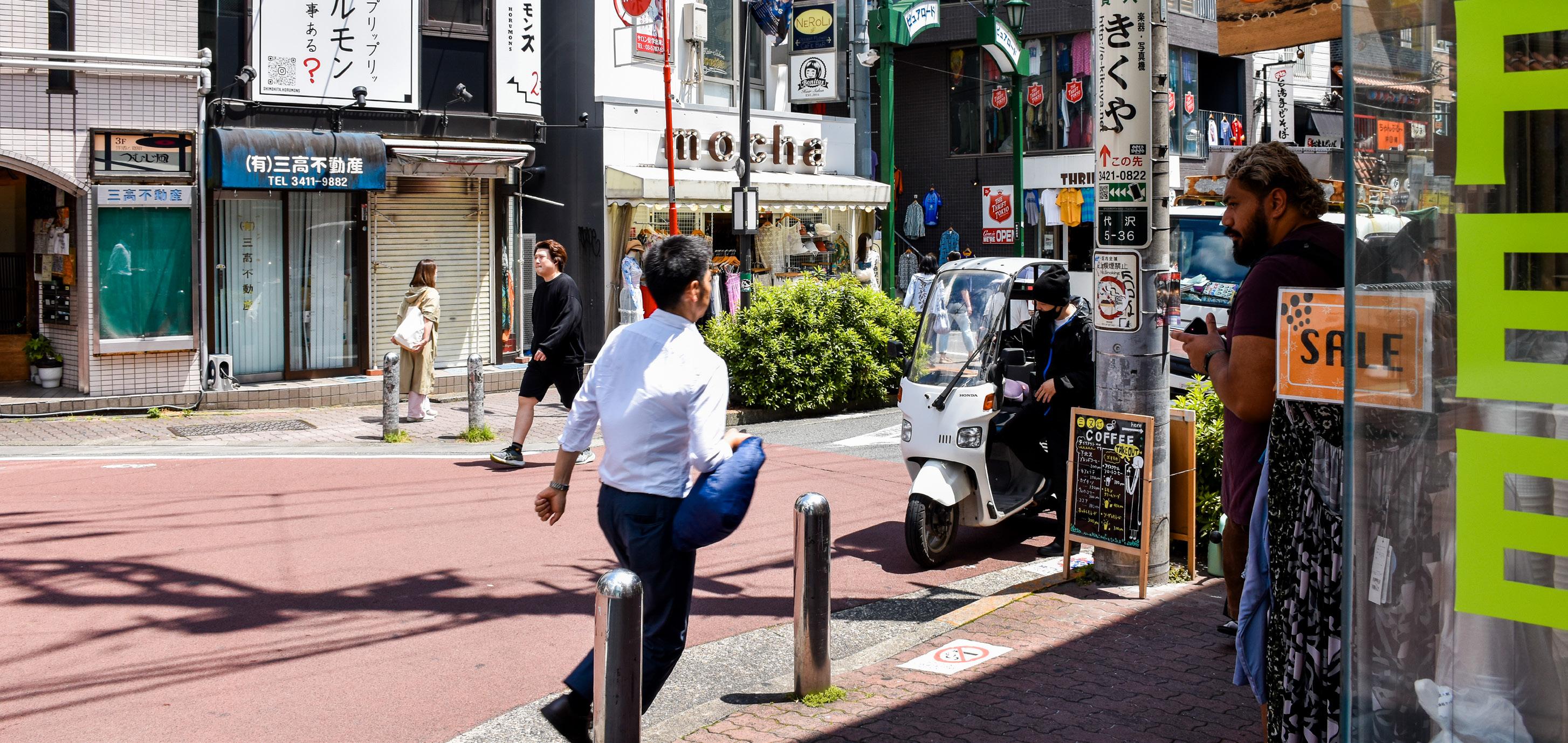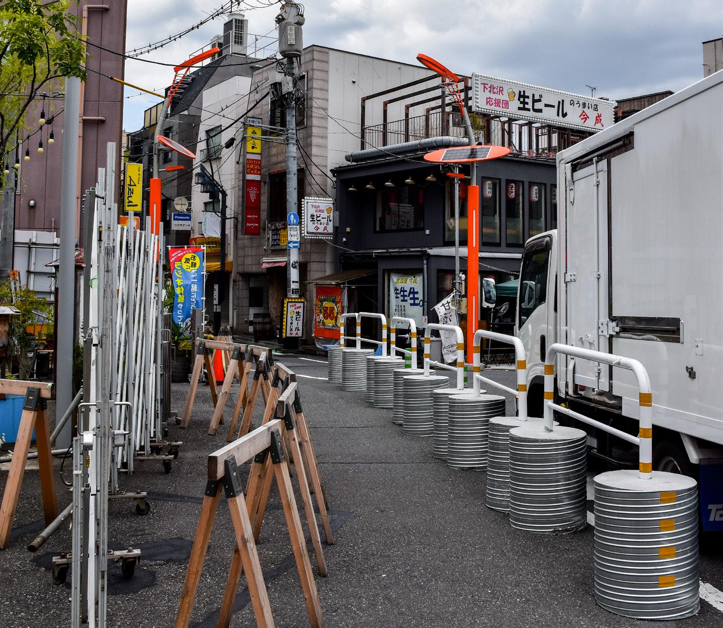 Shimokitazawa today limit vehicular traffic and have no curbs, encouraging pedestrians to spill onto the roads themselves and reclaim public access.
