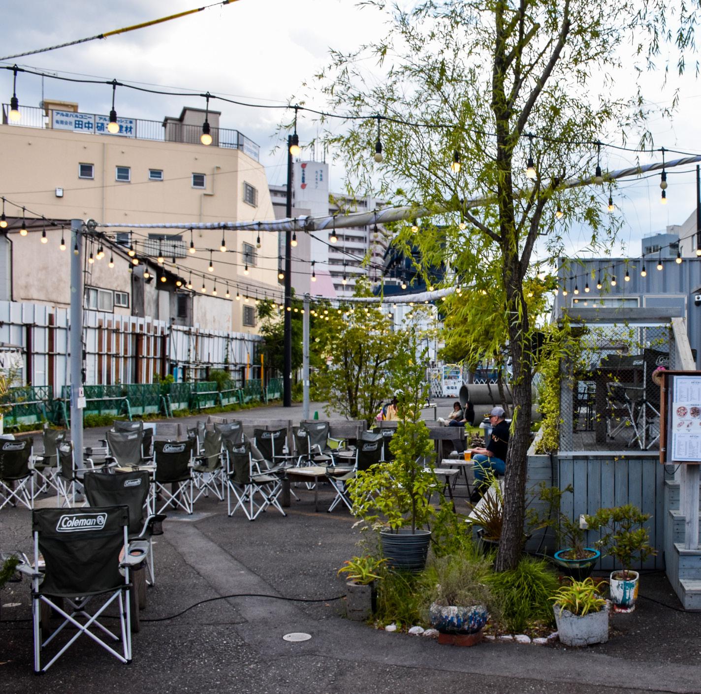 The central open space has seating for those who buy from the cafe and food trucks, but is also open to the public, with makeshift gates acting as barriers to its north and south. Vehicular entrance to the shopping streets in the west are blocked from 16:00 to 18:00 on weekdays, and even longer on holidays. Deliveries by truck happen spontaneously on the side of the road in the junction.