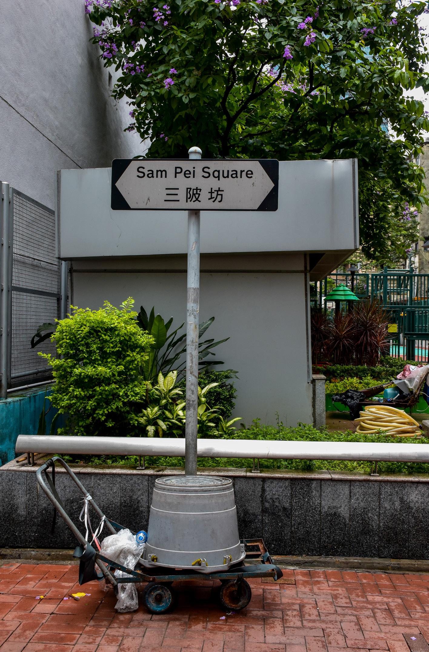 In the early 1960s, with more buildings constructed around the growing Chung On Street and Sha Tsui Road, whole city blocks and squares started to form. [17] The first square to be constructed was Yi Pei Square around 1960, taking its name from Yi Pei Chun, a small hillside village one kilometre away that may have appeared as early as 1902. [18] Pei in Cantonese can mean waterside but also slope, and it is very possible that Yi Pei Chun meant “village on two slopes”, “village near two ponds”, or even “village between two riversides”, referencing its location between the rivers Tai Lek Ho and Kwu Hang. Further land reclamation to the east of Yi Pei Square created Sam Pei Square (literal translation: third waterside square) in 1963, when the construction of the neighbouring Saint Francis Xavier’s School started. [19] Meanwhile, although there were buildings approximately where Tai Pei Square and Sze Pei Square are today, they were lone-standing structures facing open fields, squatter houses, or sandy ditches. It was not until 1970 that most buildings around Sze Pei Square (lit.: fourth waterside square, a chronological nature of naming is established) were finalised, and the name appears in a 1975 map. [20] At roughly the same time, the car park and buildings around Tai Pei Square (lit.: large waterside square) began construction, and were well established by 1982. [21]