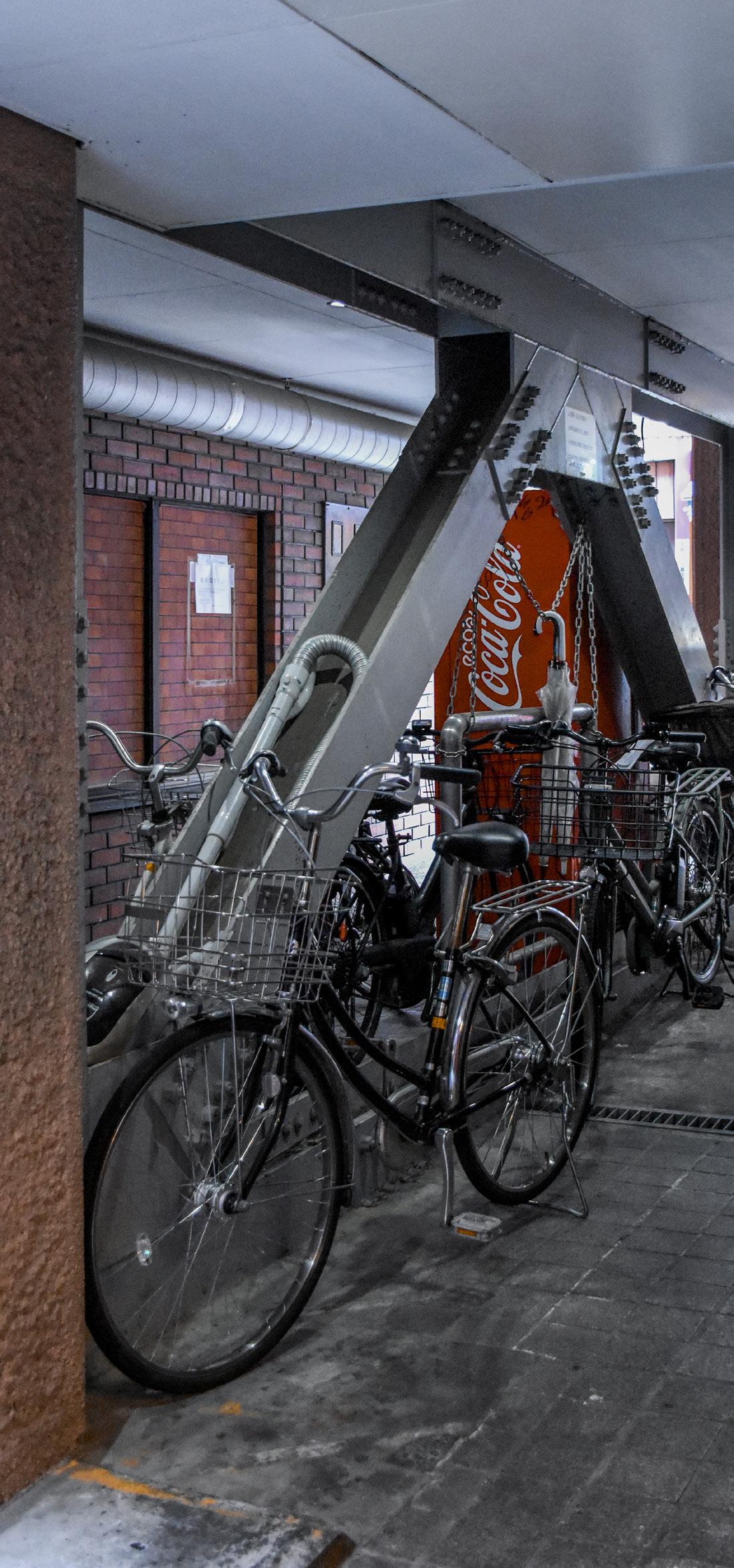 The adaptability and multifunctionality of small and narrow intersections show how yokochō can accommodate a variety of daily activities and informal uses. The two intersections on Fureai Road exemplify how narrow junctions become extensions of surrounding businesses, with eatery seating spilling out onto the streets. They also separately serve as an impromptu public smoking area and an informal bicycle parking space within a non-parking zone, highlighting the rulebending use of limited space. The Shin-Nakamise Shotengai alleys further illustrate this versatility, featuring a central block with multiple eatery stalls, surrounded by cafes and restaurants. This space not only serves as a dining area but also provides both legal and improvised parking for bicycles and a resting space for renovation workers, demonstrating its adaptability to various needs. In contrast, the courtyard of Lions Court, while designed as a formal semi-public space with a pond and benches, sees less public use due to its secluded nature. However, it still finds purpose as a storage area for shop owners, scattered bicycle parking throughout afternoons and evenings, and even as a photoshoot booth for products, showcasing how even intentionally designed spaces can be repurposed to meet practical needs. These examples highlight how daily activities, from dining and smoking to bicycle parking and informal storage, shape and redefine urban spaces, carrying the informality of squatter areas into a formalised setting.