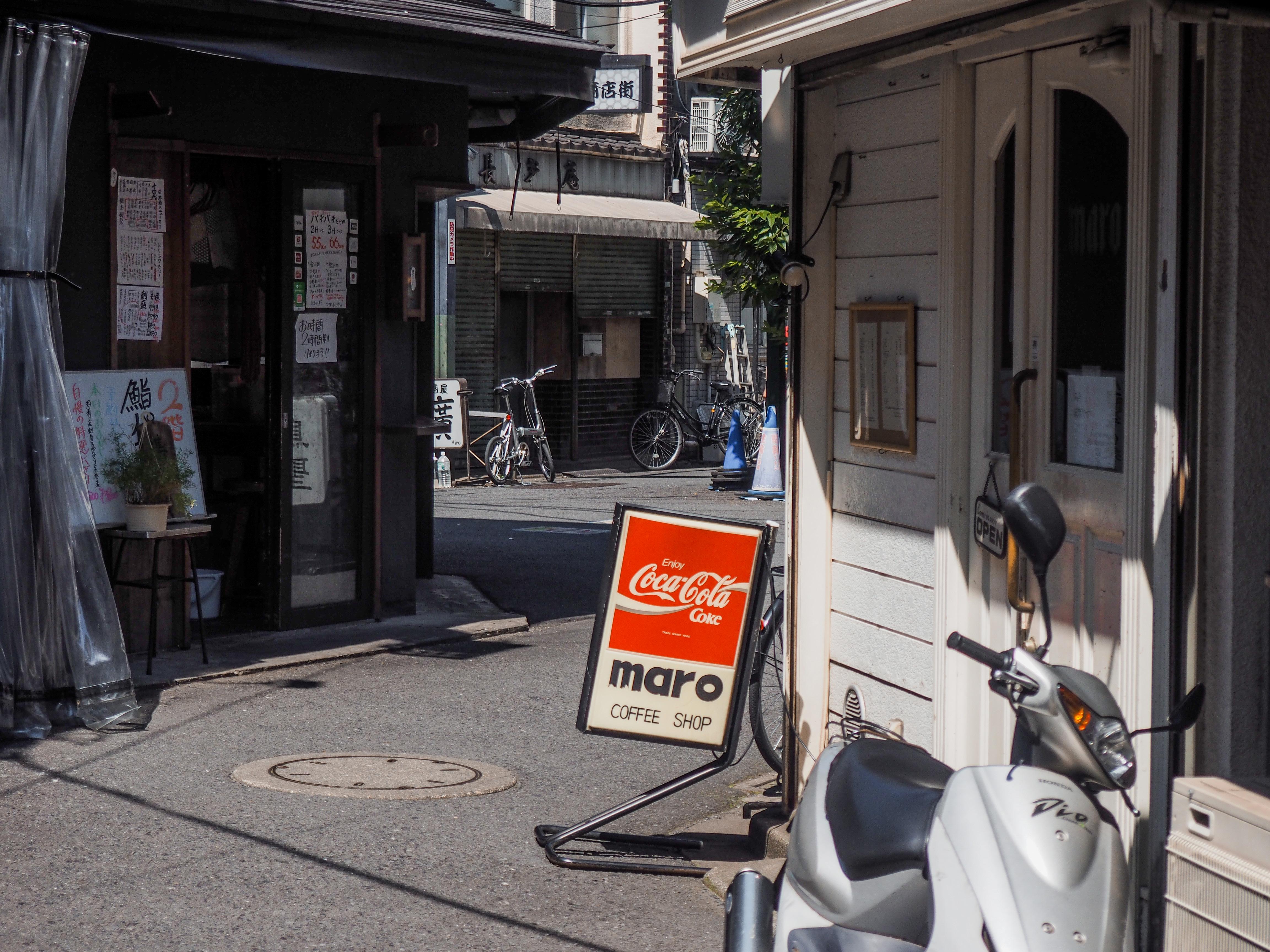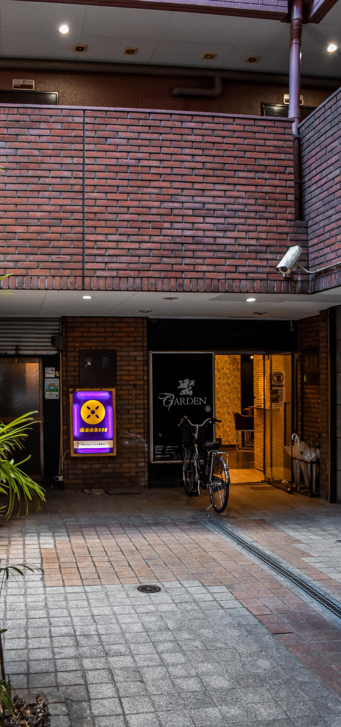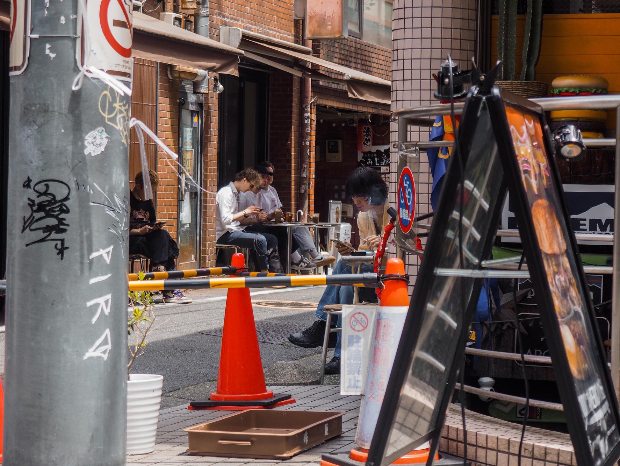 The seating of the smoking cafe at the centre of this junction takes up both sides of the alleyway. 6-8 tables are set up, some under canvas coverage and some not, but mostly filled. The pathway is frequented by shoppers and commuters alike as a shortcut. Bicycle parking occurs further away from the junction on all sides, and an empty lot is overgrown with plants. The main road continuing north of this junction is also closed to vehicles from 16:00 to 18:00 on weekdays.