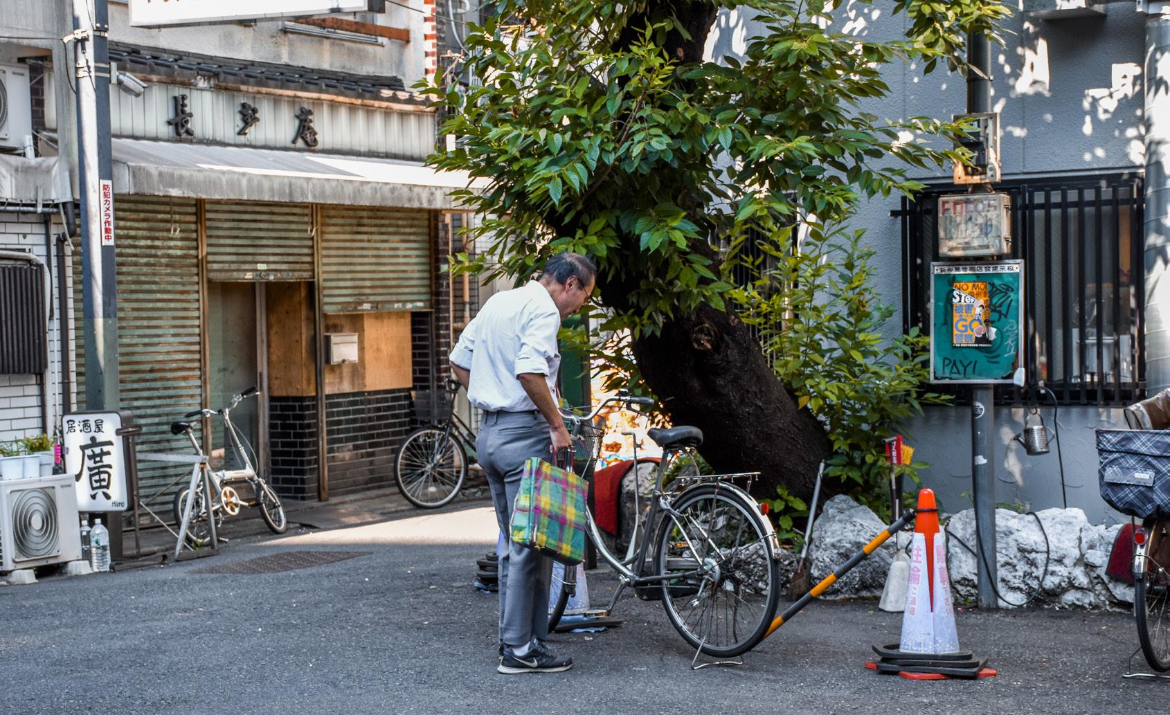 This shotengai is a courtyard condition with access to the main alleys through paths to its northeast and southeast. Bicycle parking occurs along fenced off areas that do not allow parking, notably around the tree in the east. Shop owners arrive in the day by bicycle and on foot and set up their shops by nighttime. Construction workers sit on trolleys to rest around the area, with construction in the west and east.