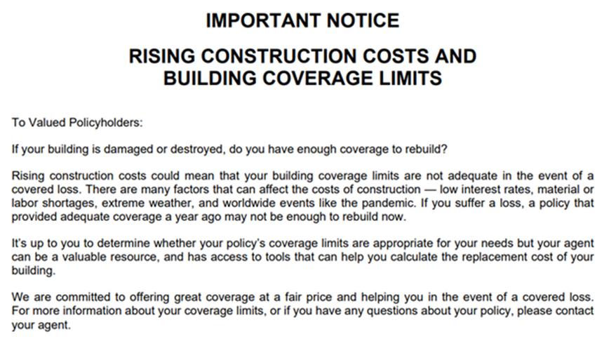 Inflation can create exposure risks for insurance agency clients. Rising construction costs could mean that a building that was adequately insured a year ago may now be underinsured. Though agencies are not responsible for determining the appropriate limits, you should recommend that your customers reconsider the limits on their policies in light of inflation. Some carriers have sent out notices to policyholders similar to the following.
