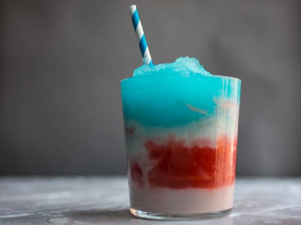 For the white layer: Rinse out the blender and add the coconut sorbet, rum, lime juice and ice. Blend until thick and smooth. Transfer to another large measuring cup or small bowl and place in the freezer while you make the final layer.