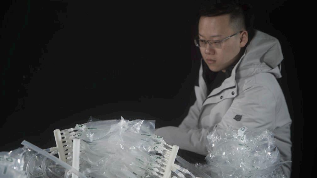 This installation uses programmed pneumatic air pack sets to interact with audience and show their cycle. During the process, everyone of them is driven by 8 pneumatic air packs with unpredicted fallibility of air tightness and exhuasts CO2 from the top at a changing flow.