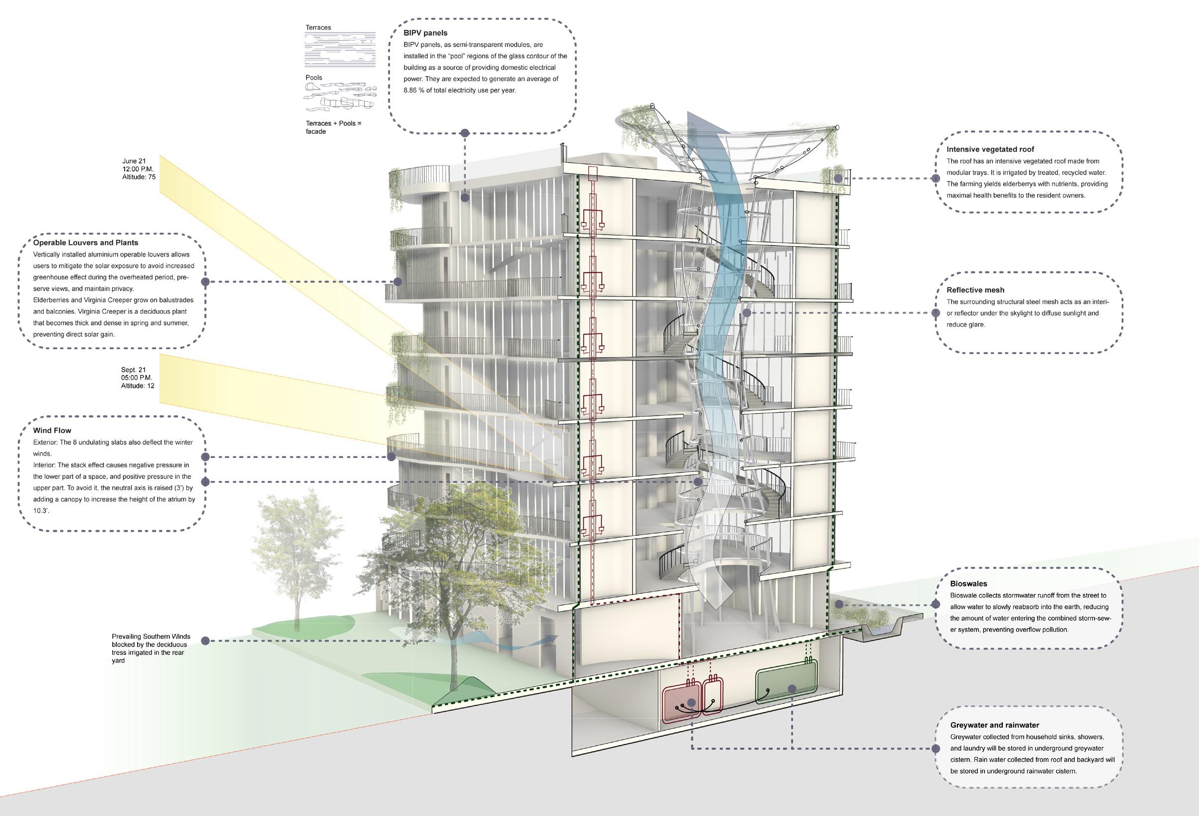 The undulating balconies deviate the wind currents, and it also helps form a visual dialogue between the floor-tofloor users. It also avoids the collision of the non-human species - migratory birds - from the buiilding. Windows on the south facade help to create a stack effect to ventilate the central atrium, releasing any pent up hot air and drawing wind into the roof garden.