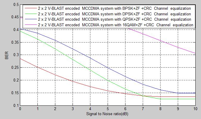 and CRC channel coding with Zero-Forcing (ZF) signal detection scheme. It is obvious that the system outperforms in BPSK and shows worst performance in 16-QAM modulation. The difference in BER values is very clear in lower SNR regions; the BER values decreases with increasing SNR and vice-versa. For BPSK and 16-QAM modulation, the BER values in Fig. 1 are 0.1931 and 0.4641, respectively for a SNR value of 3 dB which implied the simulated VBLAST MIMO-MCCDMA wireless communication system achieves improved performance gain of 11.91 dB with the employment of BPSK modulated.