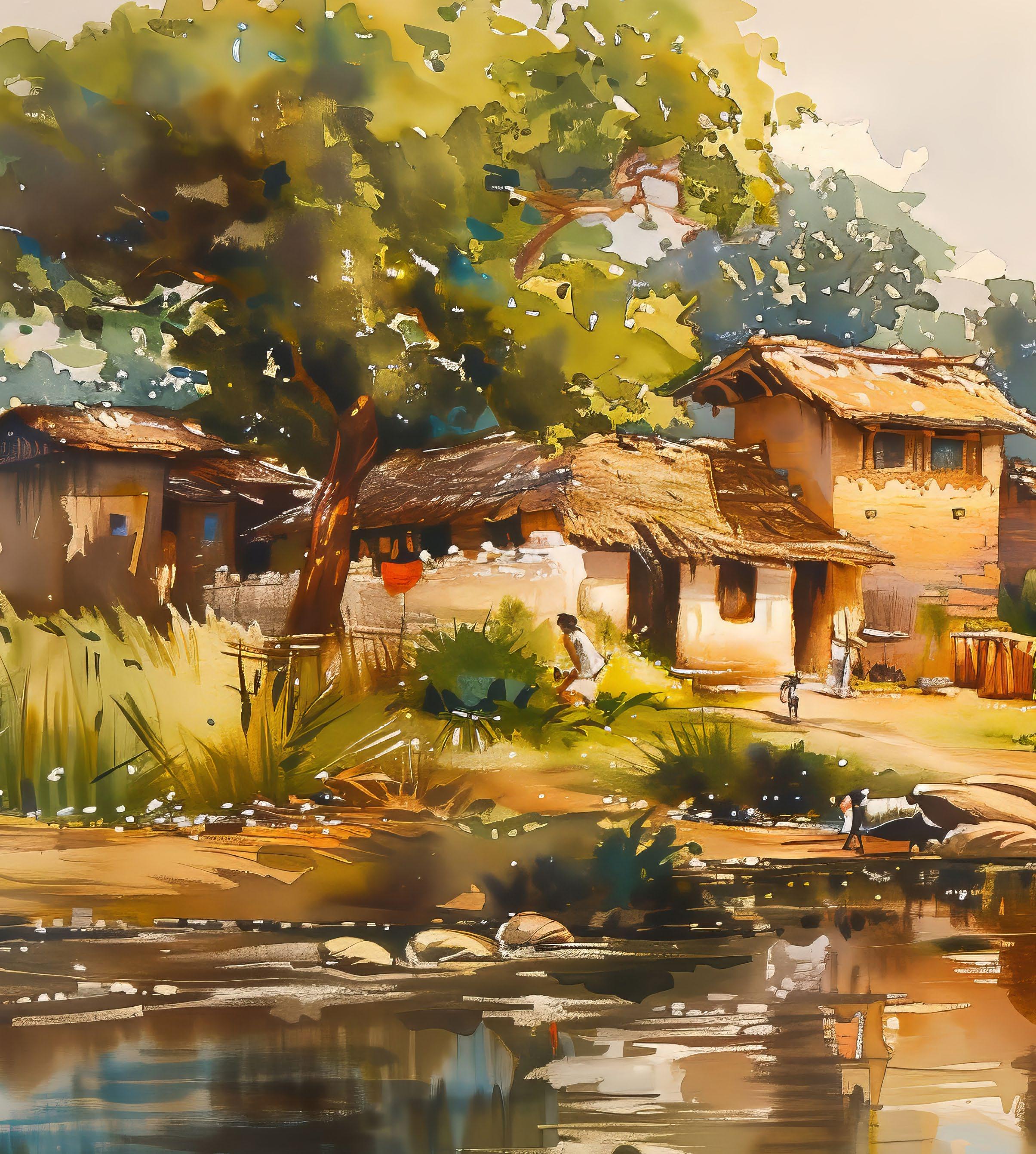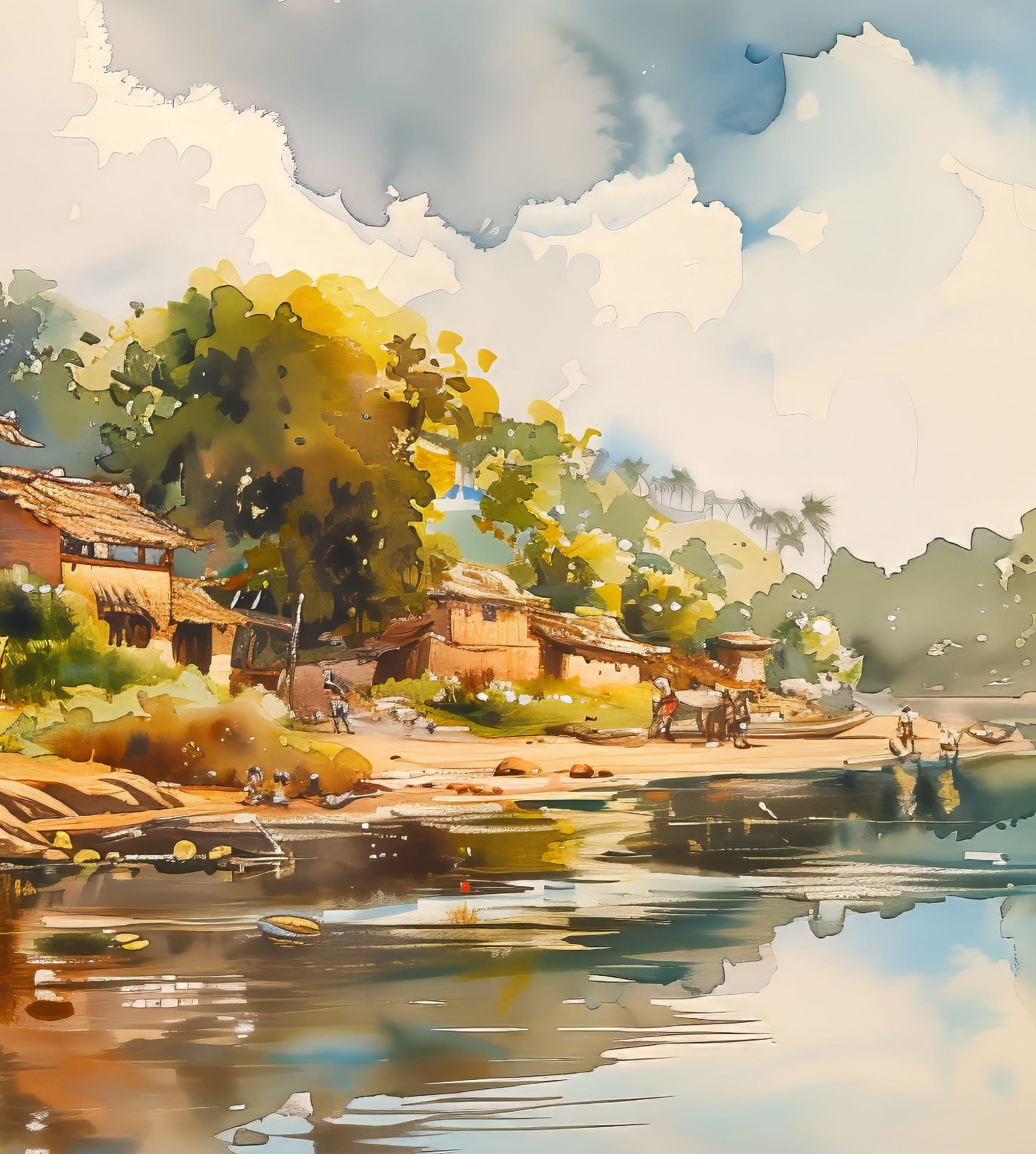 Colorful thatched-roof homes line sunbaked paths. The smell of wood smoke wafts in the morning air as families cook breakfast on open hearths. Fish nets hang to dry in the breeze next to overturned boats. A river teeming with fish weaves alongside the village between lush, green hills.