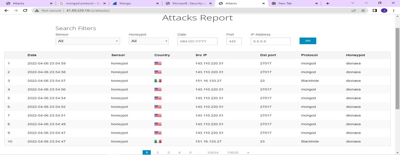 The output from the attack report indicated the source IP, destination port, the protocol, the sensors, date and time of attack and the country of origin as shown in Figure 3.The alerts collected were mapped on a vulnerability database in relation to the response from the