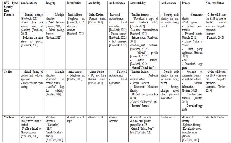 A few Social Networks are studied carefully and the gap of current trust social networks is investigated. The comparison among the Social Networks in terms security and privacy aspects have been studied and compared and the result is tabulated in Table 2. It shows that in all of the social networking sites, the profile settings by default are public to all and it has to be manually set by the user. This can lead to a confidential problem where the private data can be leaked unintentional. Since an email address is used to identify the user‟s identity in the virtual world, multiple identities are always inevitable. This can indirectly affect the Integrity and Identification. In Pixnet.net, strangers are allowed to be the readers of the bloggers; while in YouTube, even strangers can subscribe to ones channels and be updated with his shared videos. All these can affect data integrity too. Moreover, Facebook and Twitter has affected the data privacy because of the photo tagging features.