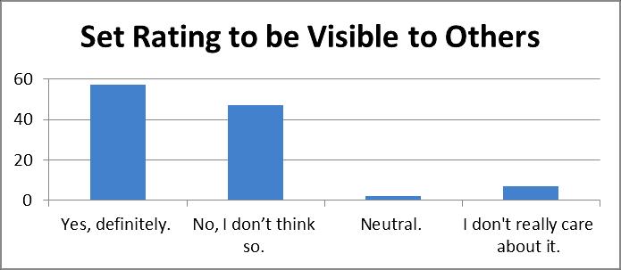 In the third part of the questionnaire, we found that when asked whether participants felt that rating is an ideal way to preset trust between human, most of the candidates felt that this is indeed the case. Although there are also 38 of them who felt that rating is not a good way to express trust and 20 people remains neutral in this case. However, we found that there is a contradictive view as shown in Figure 7, regarding whether to set the rating to be visible to others or just the user. Surprisingly, among 57 of the participants felt that, rating should be made visible to others while 45 of them think in the other ways and a few of them remains neutral or doesn‟t pose any concern on it.