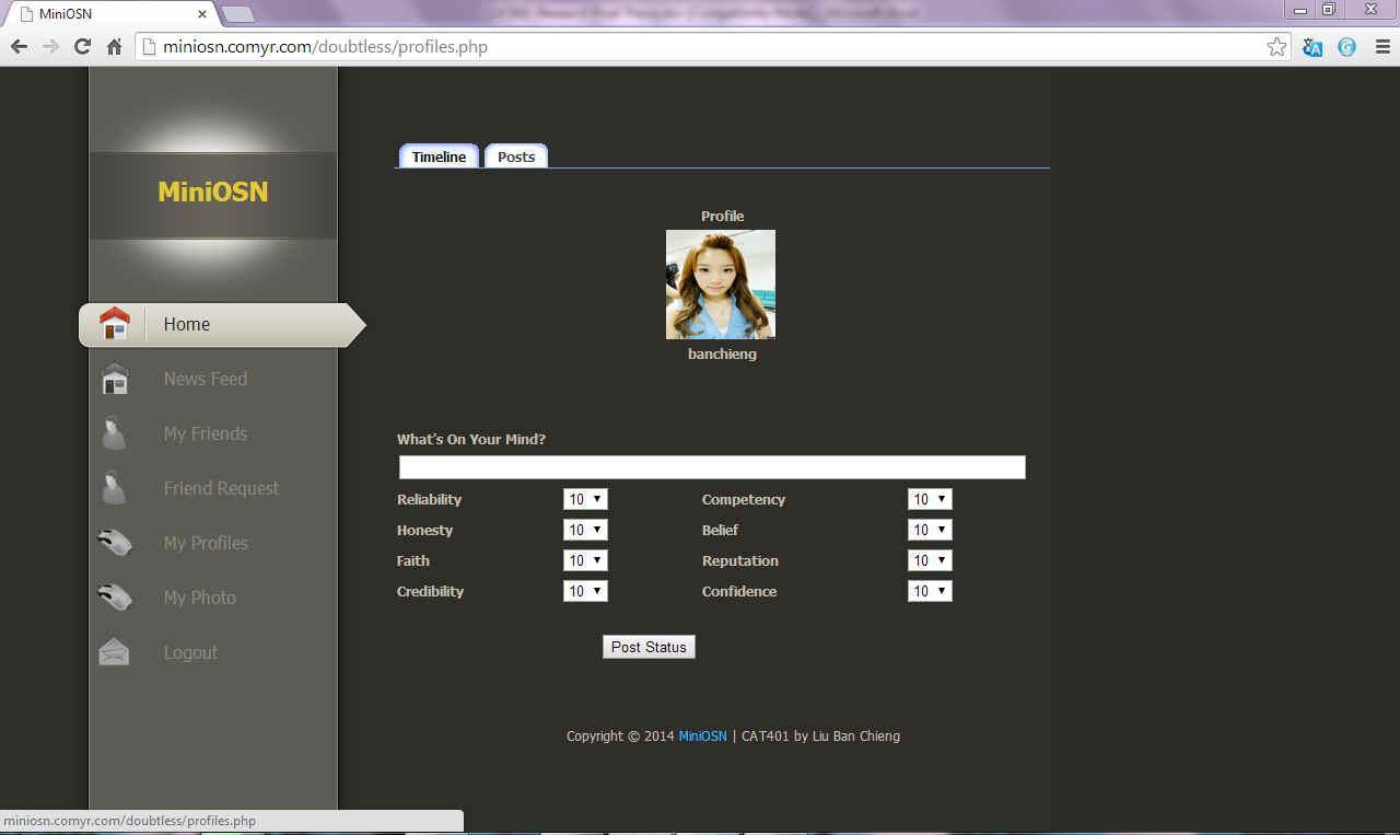 MiniOSN enables users to post a status and a photo. Figure 5 shows the timeline of the user profile if the user clicks “My Profile”. User is able to post a status under “What‟s On Your Mind?” At the same time, the user can set the weight of each trust traits accordingly in order to adjust the accessibility of the post he/ she want to share.
